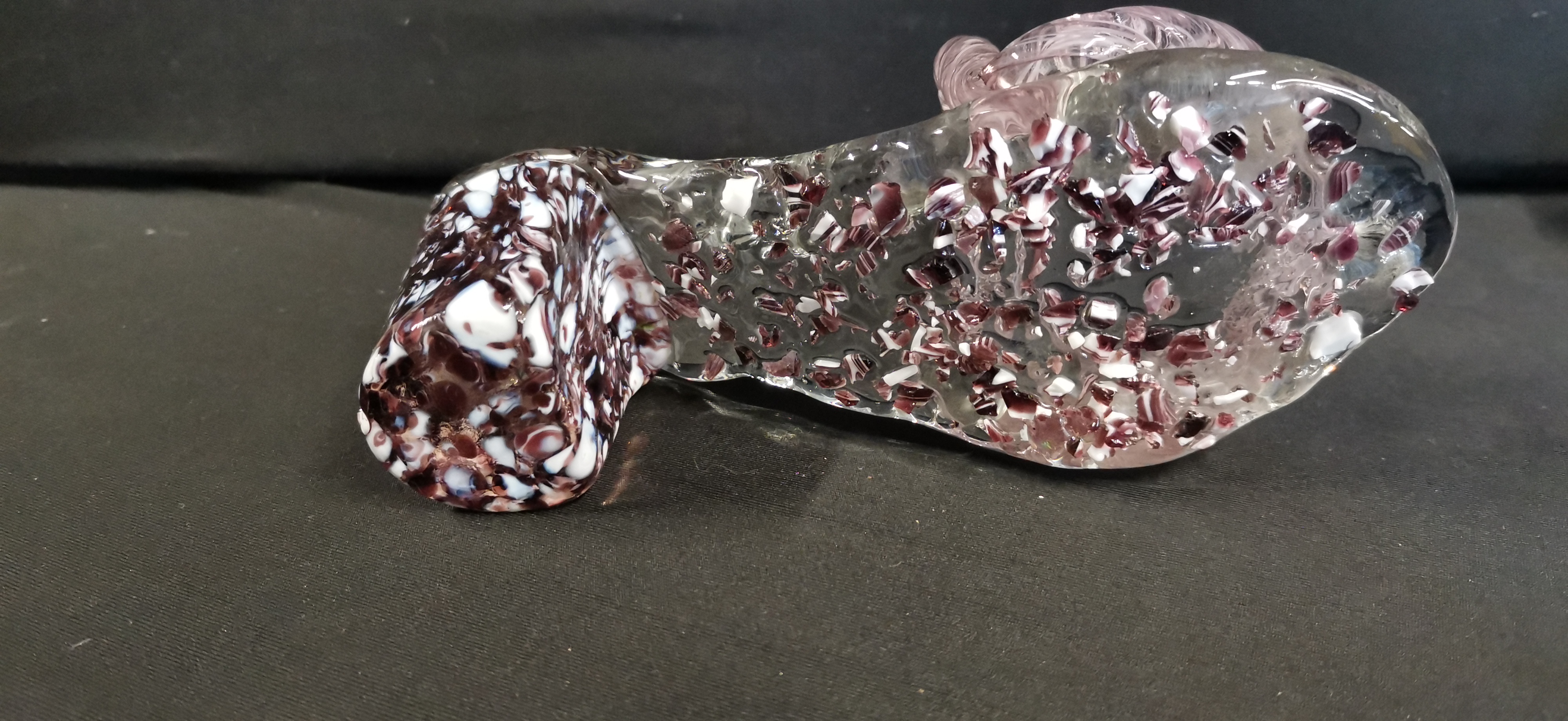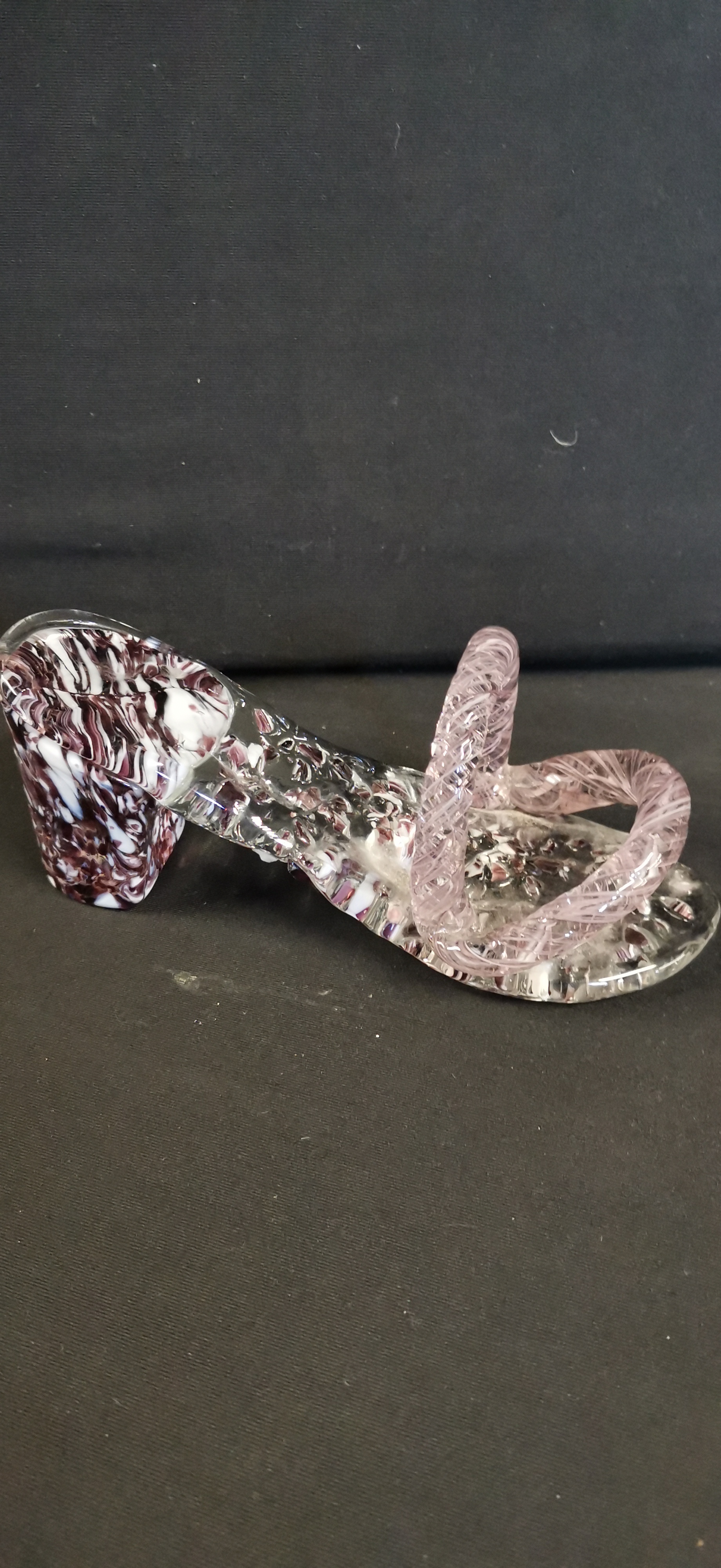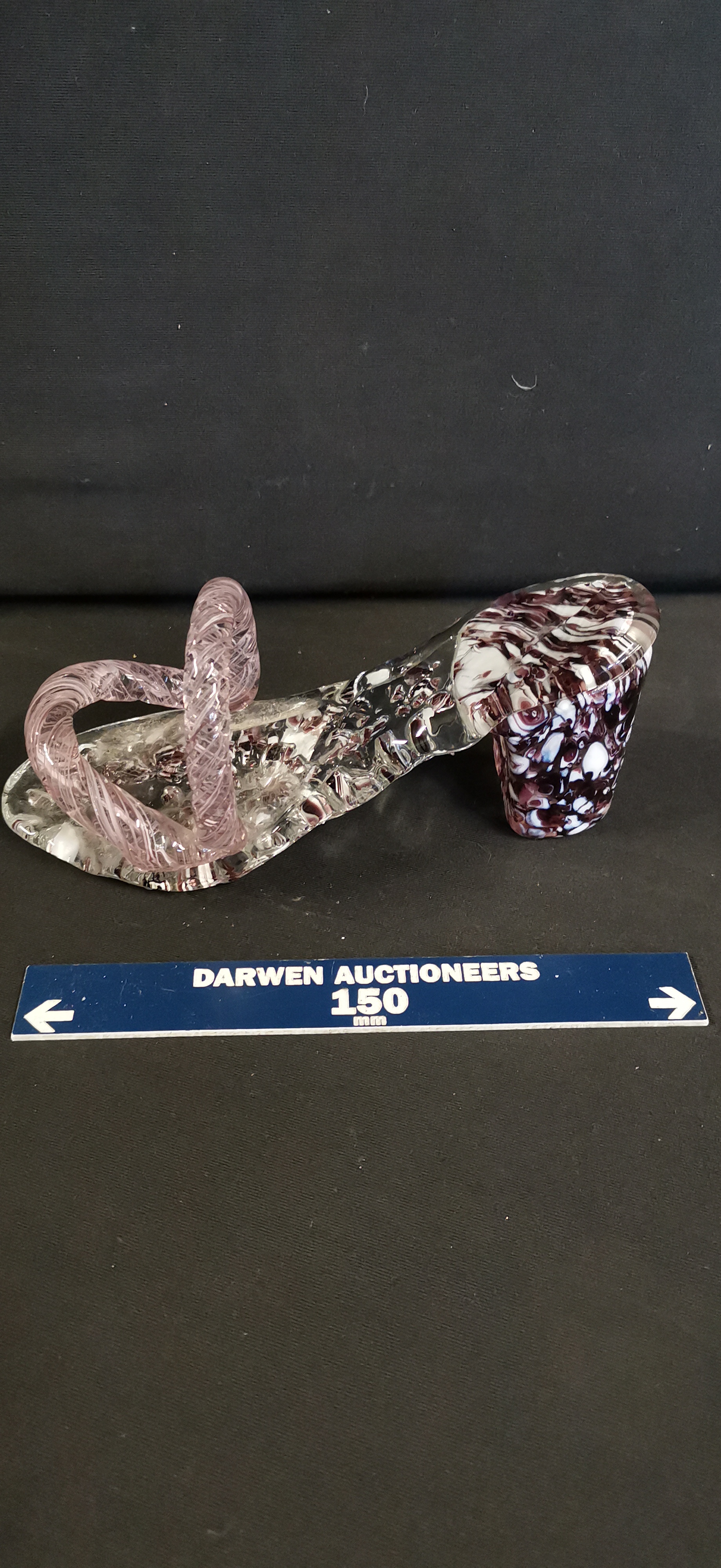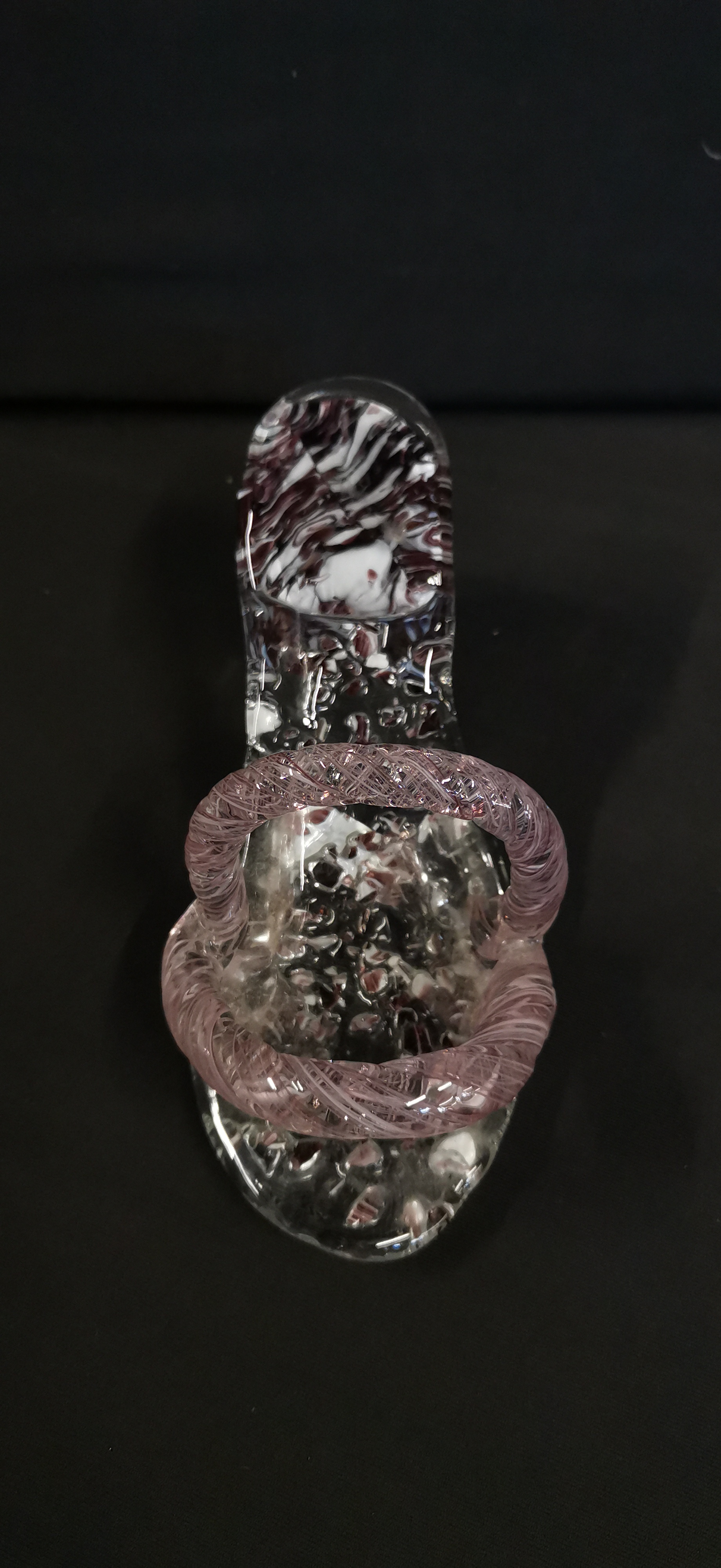 A decorative glass ornament in the form of a high-heeled sandal or mule. The piece is constructed from clear hand-blown glass featuring heavy internal inclusions of crushed glass frit in shades of maroon, purple, and opaque white, creating a speckled and marbled effect throughout the body and solid heel. The sandal is finished with two decorative straps fashioned from twisted pink latticinio glass canes. The base of the heel features a circular ground-out pontil mark containing faint, illegible markings. This piece is characteristic of mid-to-late 20th-century Italian glass giftware.