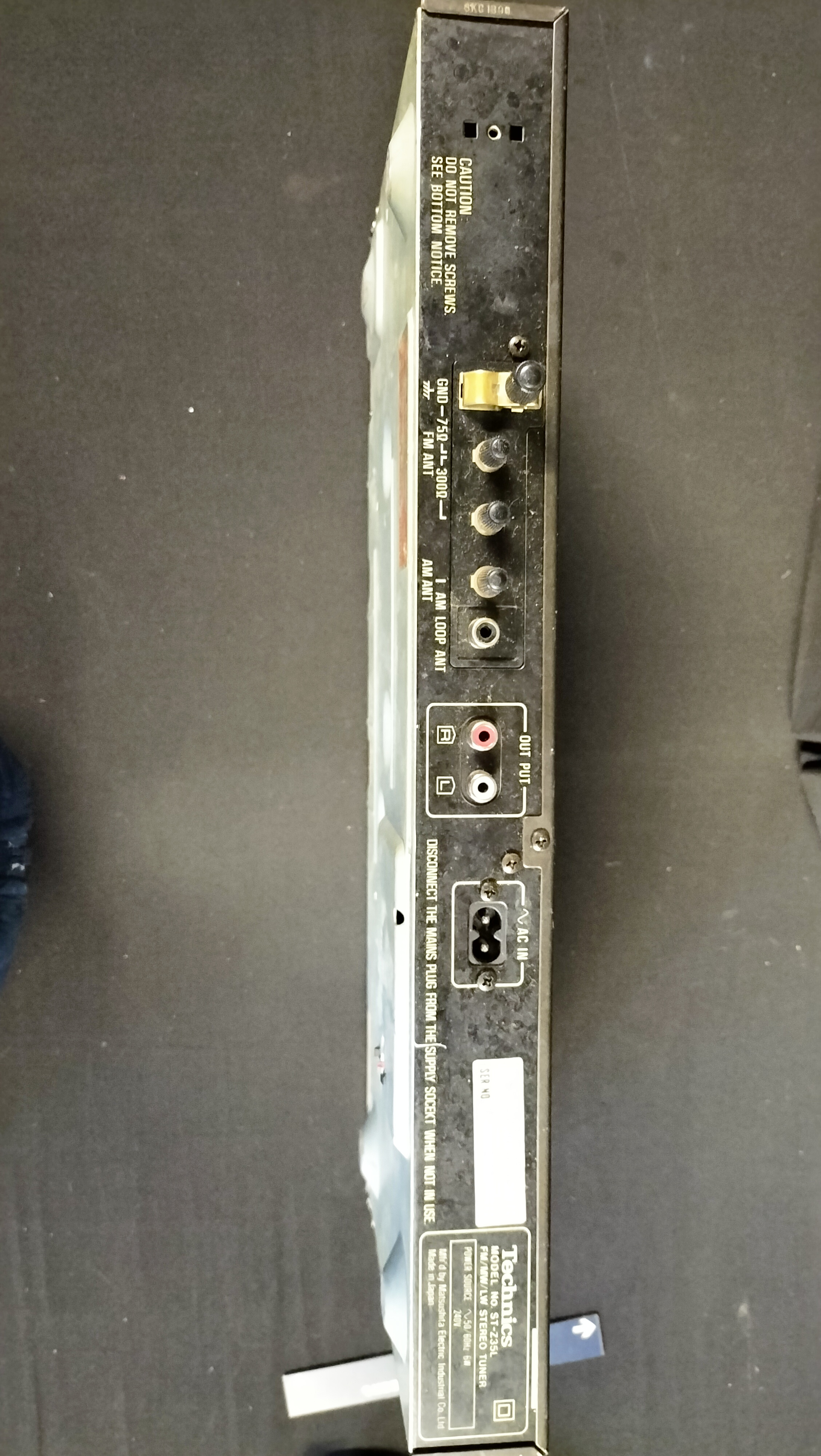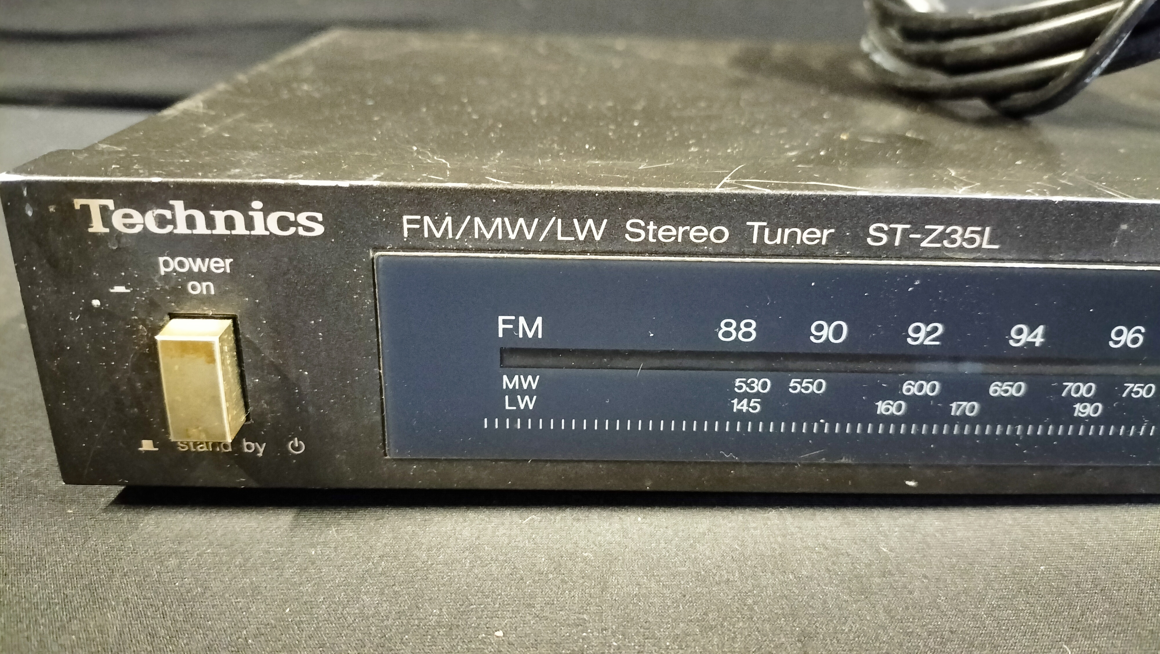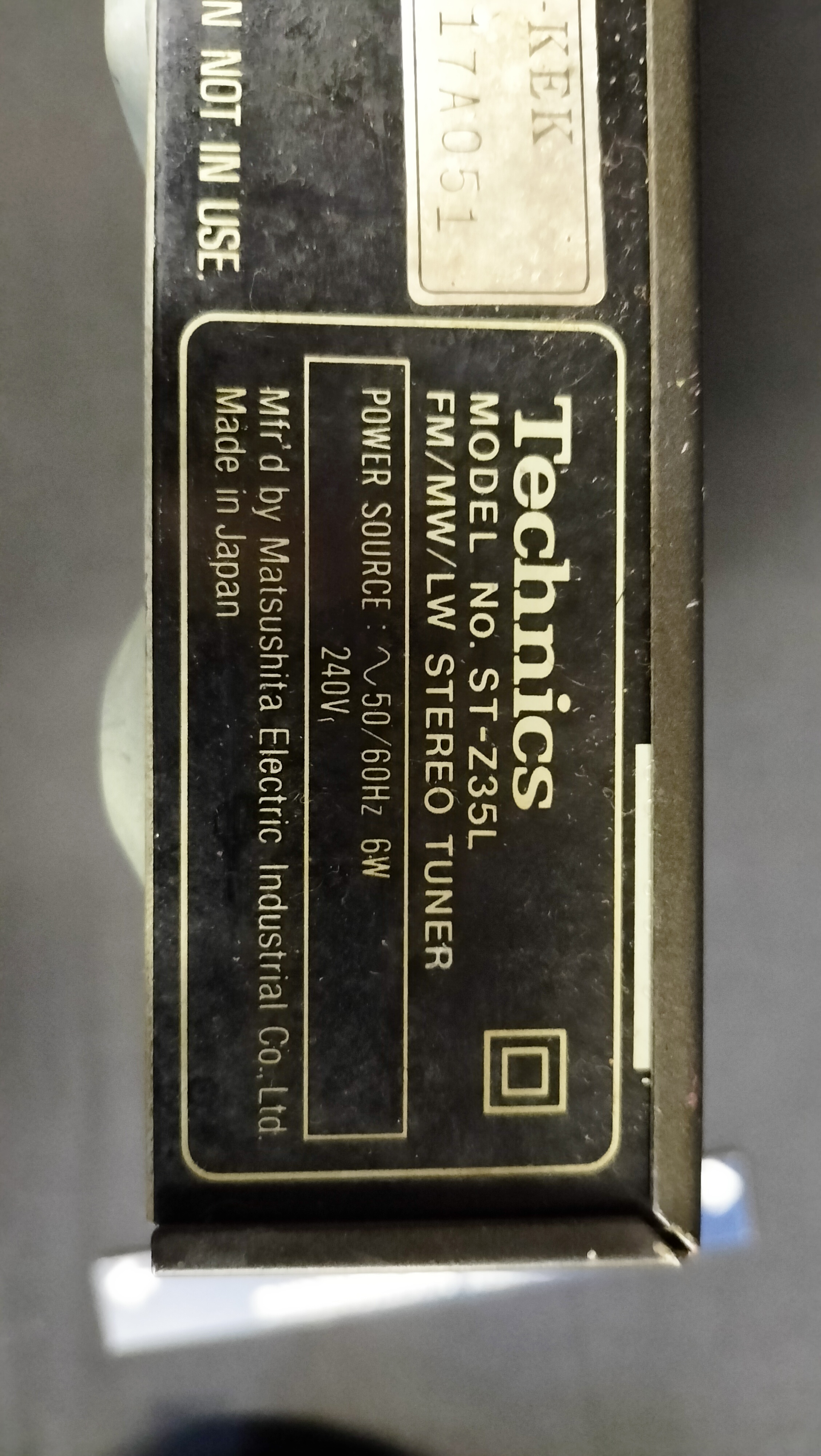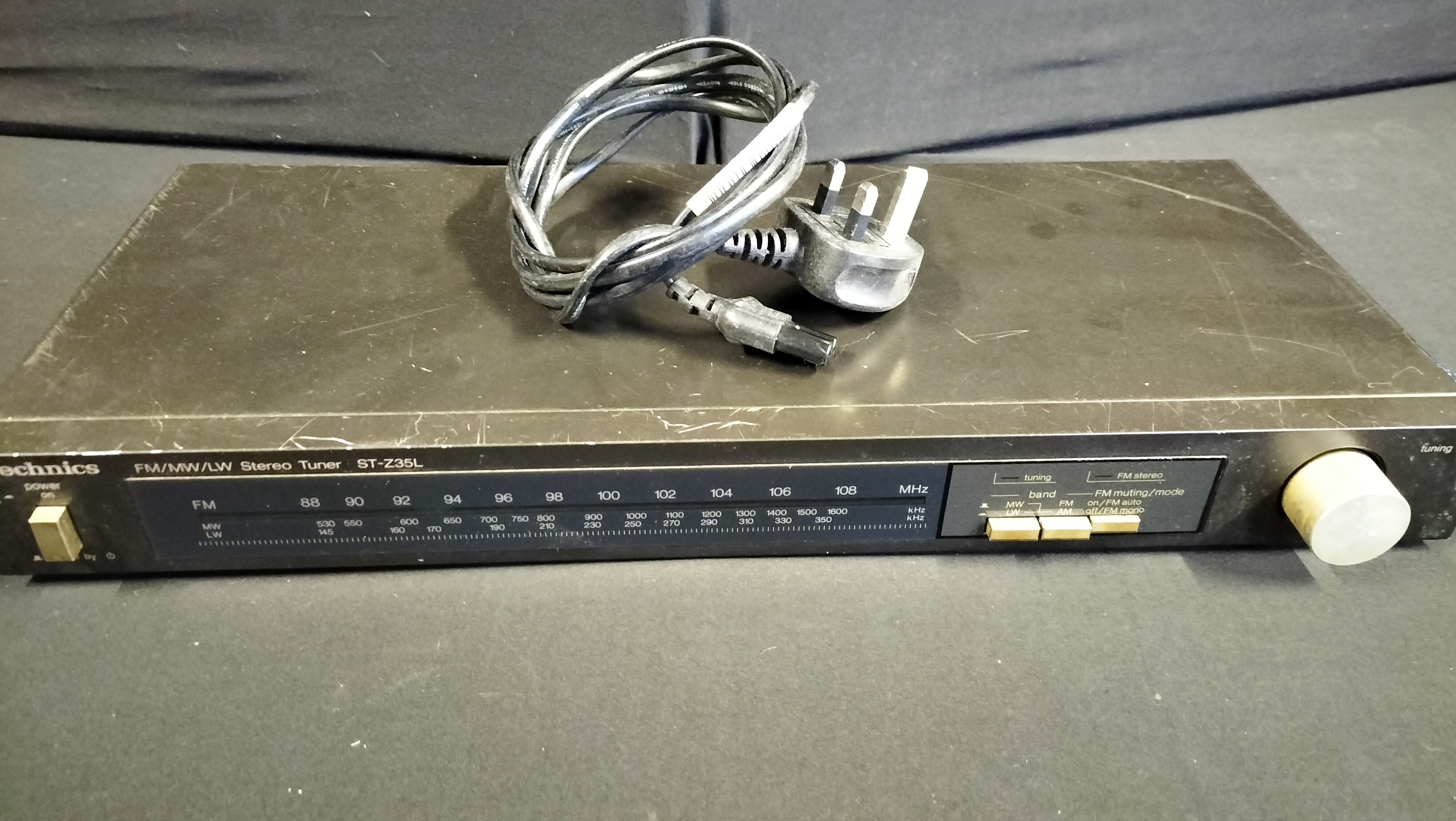 A Technics ST-Z35L stereo tuner manufactured in Japan by Matsushita Electric Industrial Co., Ltd. The unit features a metal chassis with a black finish and a plastic front fascia. It is equipped with an analog slide-rule tuning dial for FM, Medium Wave (MW), and Long Wave (LW) radio bands. The front panel includes controls for power, band selection, and FM muting/mode, alongside a manual tuning knob. The rear panel contains RCA output terminals, antenna connection points for FM and AM, and a manufacturer’s label specifying a 240V power source. This unit is configured for the UK market and is accompanied by a detached UK three-pin power cable.