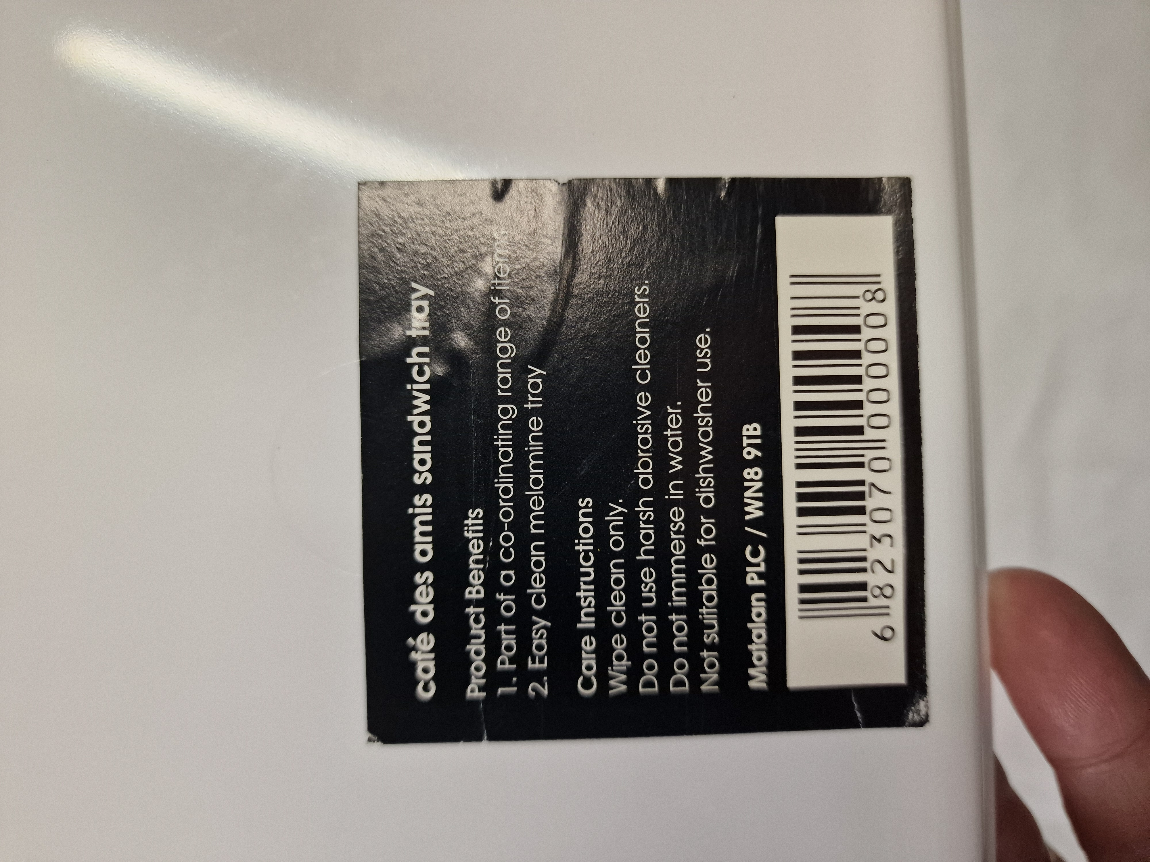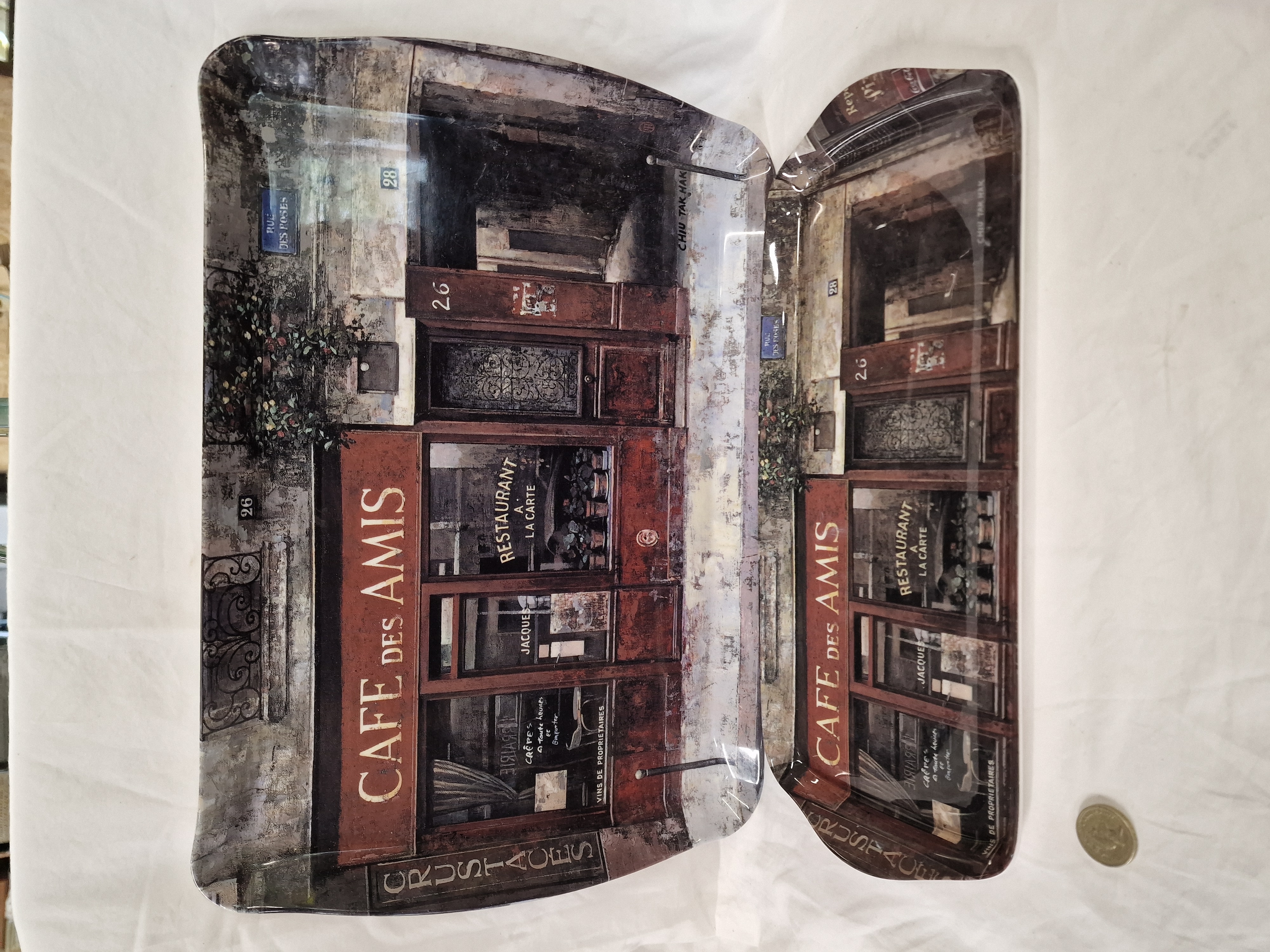 A pair of contemporary rectangular sandwich trays of moulded melamine construction, manufactured for the British retailer Matalan PLC. Each tray features a printed decorative scene depicting a traditional French shopfront titled Cafe des Amis, with additional signage including Restaurant a la Carte, Jacques, and Crustaces. The artwork bears the printed signature of Chiu Tak Hak in the upper right corner. The reverse of one tray retains an original adhesive label identifying the product as a Cafe des amis sandwich tray and providing care instructions, noting the maker as Matalan PLC, WN8 9TB.