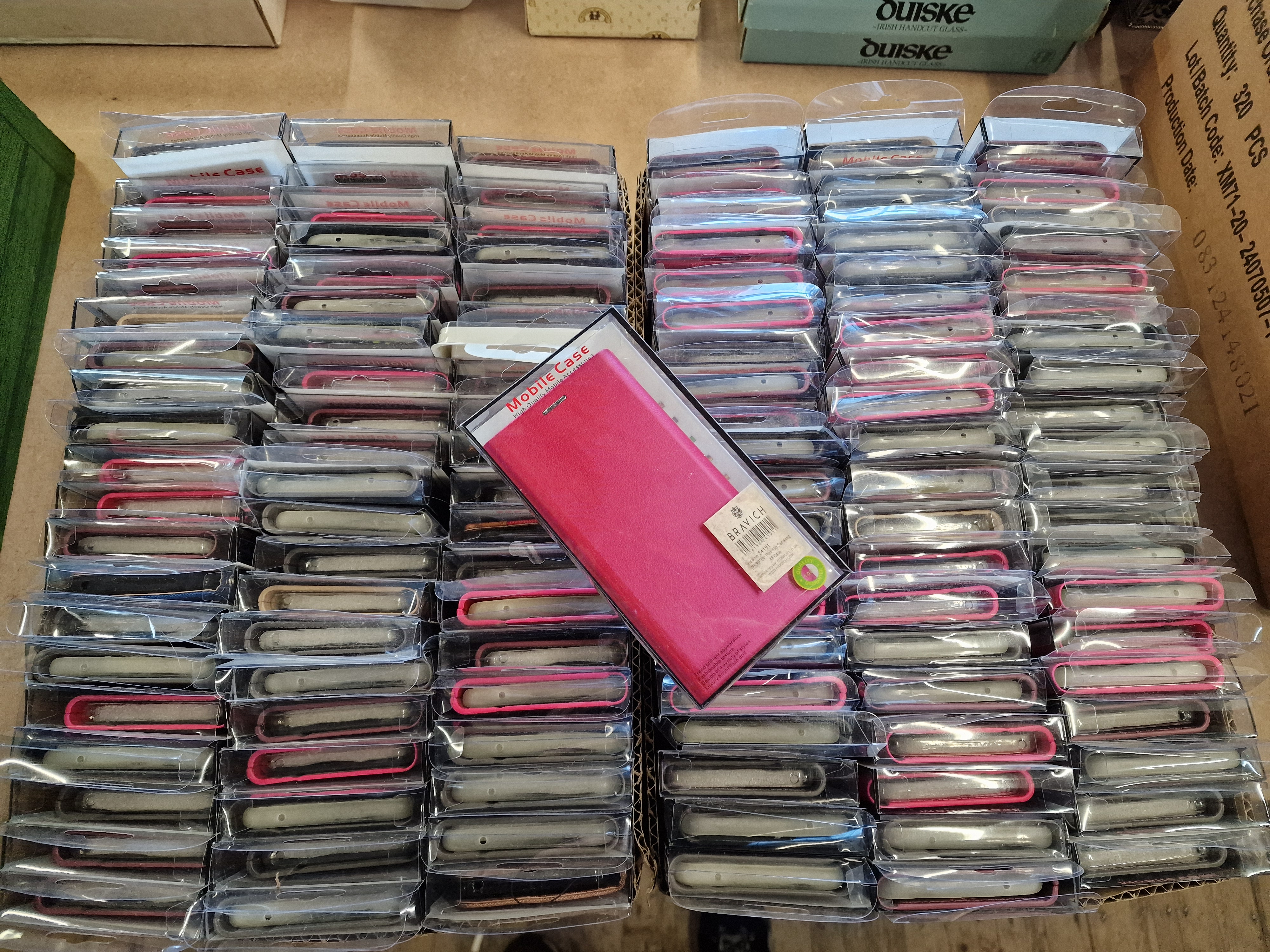 A wholesale lot comprising 122 mobile phone folio cases. The items are individually contained within clear plastic retail hanging packaging featuring the printed text Mobile Case. One unit displays a white adhesive retail label for the brand Bravich with barcode 5060447241011. The assortment includes various colours such as pink, grey, black, and brown. These slim folio cases are designed in the style of a long leather wallet or card holder with a textured exterior finish. The items are organised in cardboard tray dividers and appear to be retail overstock or liquidation goods.