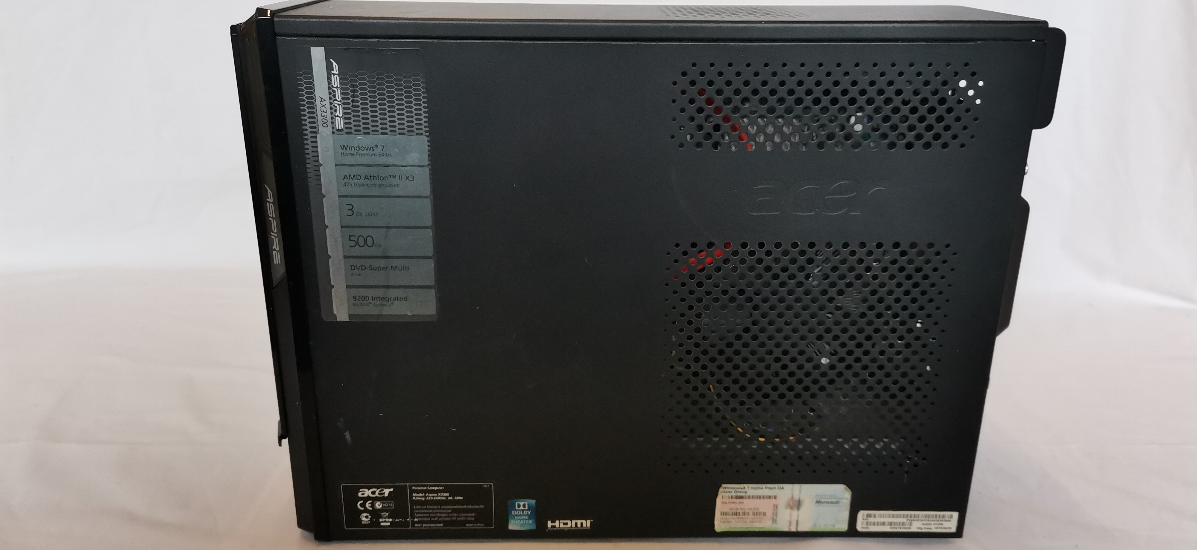 An Acer Aspire X3300 (AX3300) small form factor desktop computer. This unit is equipped with an AMD Athlon II X3 425 Triple-Core processor, 3GB of DDR3 RAM, and a 500GB hard disk drive. Graphics are handled by an integrated NVIDIA GeForce 9200 chipset. The front fascia features a DVD-Super Multi optical drive and a multi-format card reader compatible with SD, XD, MS/PRO, and MMC media. Front-facing connectivity includes four USB 2.0 ports alongside headphone and microphone sockets. The rear interface provides HDMI and VGA outputs, an eSATA port, four additional USB ports, an Ethernet port, an optical SPDIF output, and six analogue audio jacks. The unit is rated for 220-240Vac power input. An original licence sticker for Windows 7 Home Premium 64-bit is present on the chassis. This lot consists of the desktop tower only; no power leads, monitors, keyboards, or mice are included. The hard drive has not been wiped by the auctioneer and remains the responsibility of the buyer.