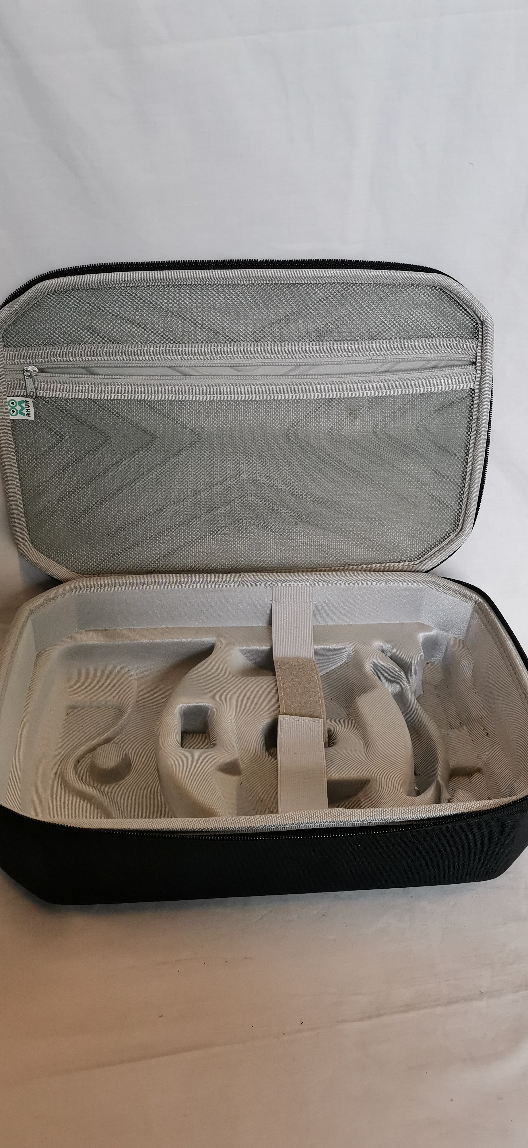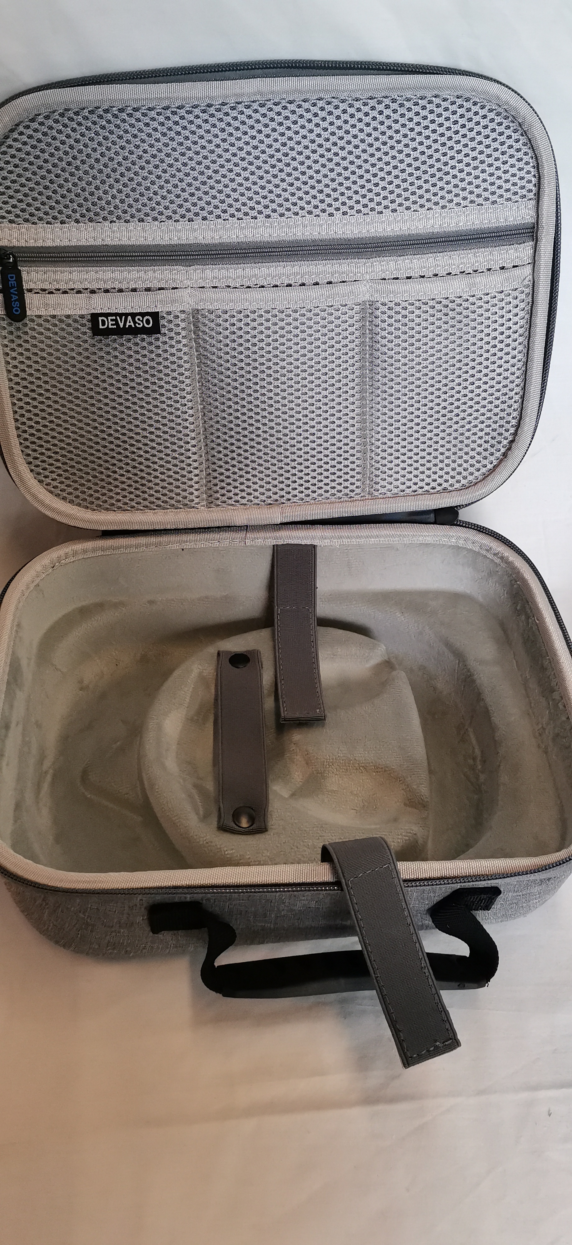 Two modern protective carrying cases designed for electronic equipment, such as drones or headsets. The first case is finished in a grey marl fabric and features a grey moulded interior with elasticated security straps. The lid contains multiple mesh storage compartments. This case bears the DEVASO mark on an interior fabric tag and the zipper pull. The second case is finished in black and contains a custom-moulded interior with a hook-and-loop security strap and a zippered mesh pocket within the lid. This case bears the AMUR mark on a small green interior tag. Both items are equipped with integrated carrying handles and zip-around closures.