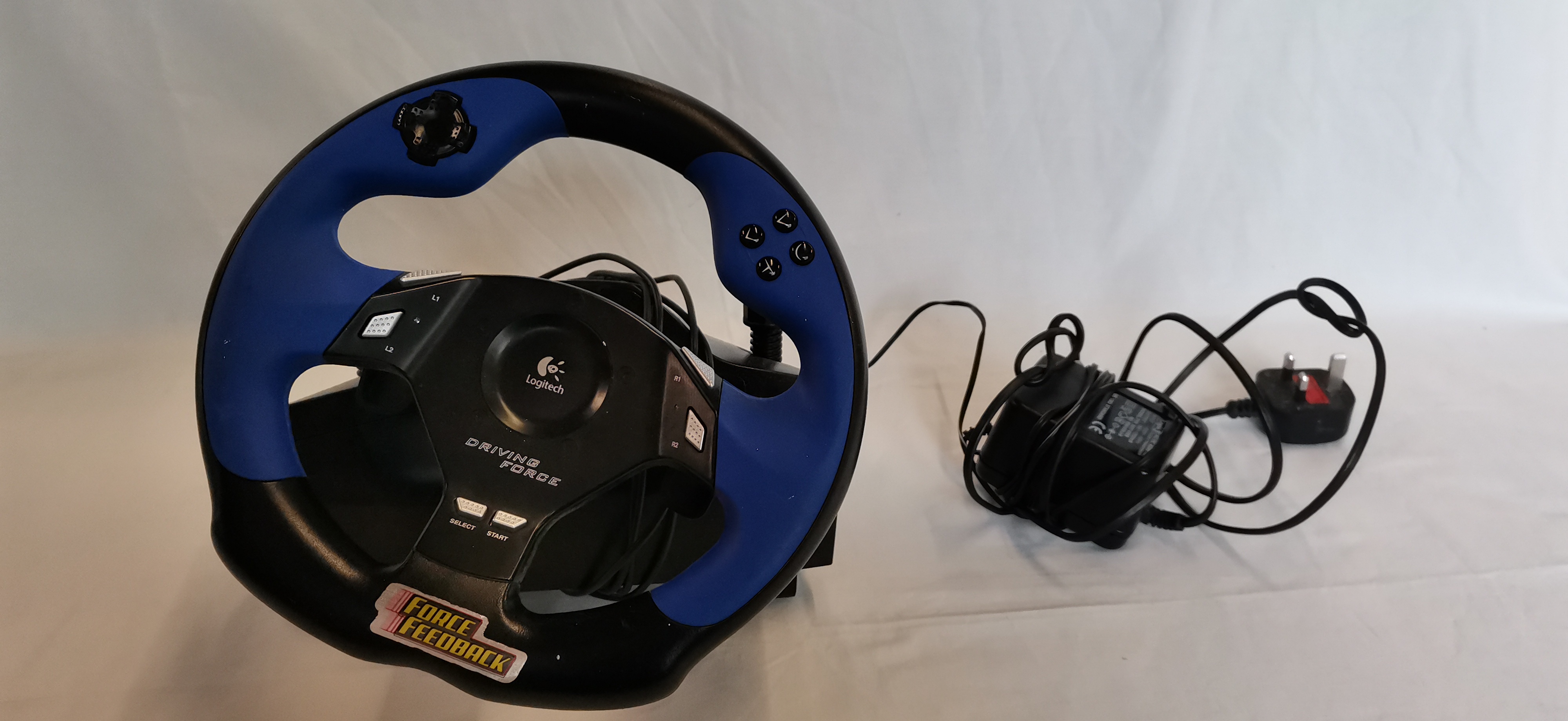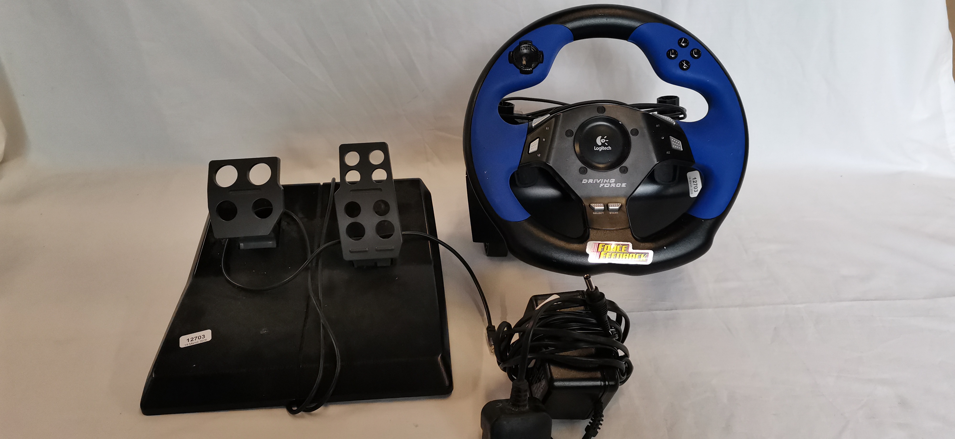 A trio of gaming peripherals comprising a Logitech Driving Force steering wheel, a two-pedal floor unit, and a power supply. The set features a black and blue force feedback steering wheel with an integrated directional pad, action buttons, and rear-mounted gear shift paddles. The accompanying floor unit contains two pedals. A compatible UK 24V DC power supply is included. The components are marked with the Logitech brand name and Driving Force model designation. Technical specifications on the underside label include model number E-UC2, P/N: 863191-0909, and S/N: YED42702324. The label also notes Touch Sense Technology licensed from Immersion Corporation. This model is compatible with the PlayStation 2 console.A/F