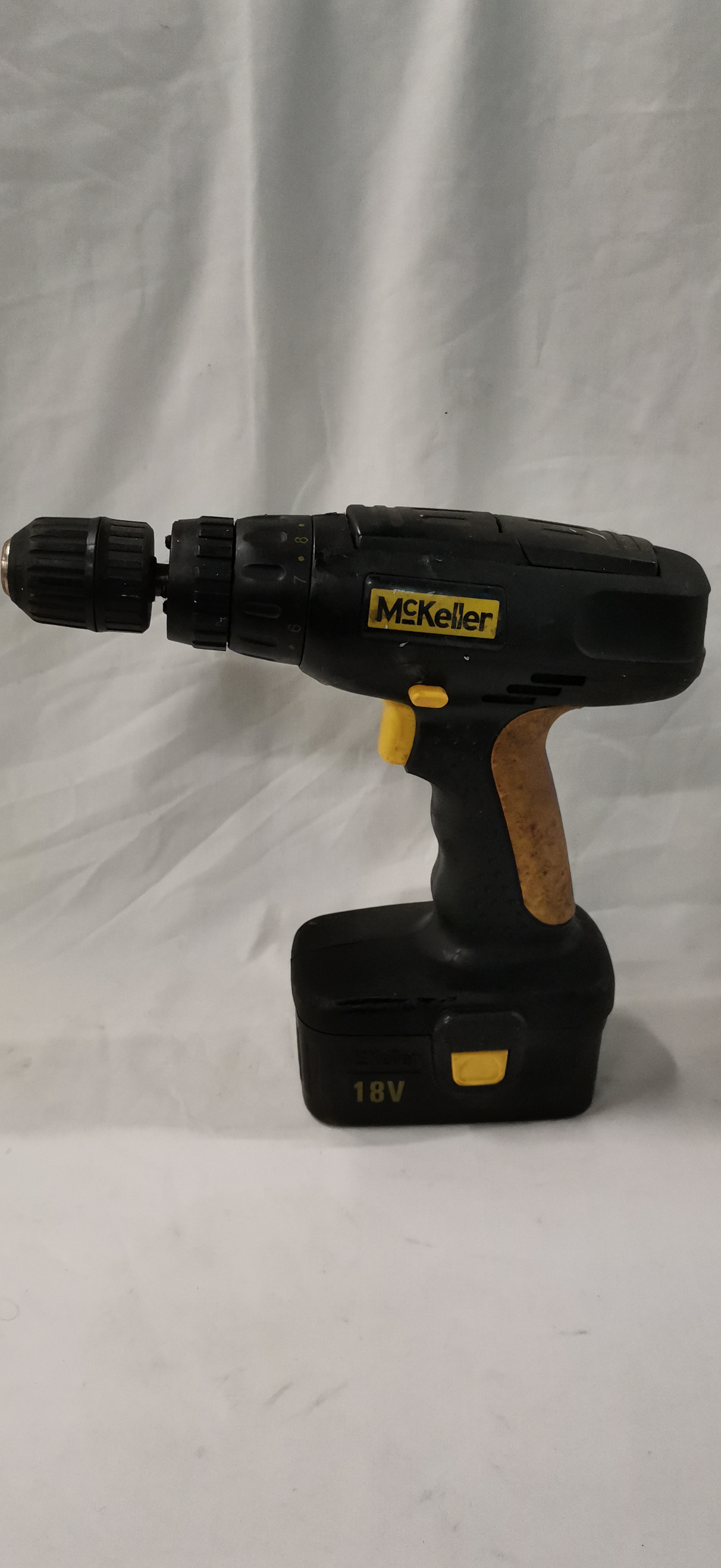 A McKeller model MCKM10 cordless hammer drill featuring a black plastic housing and a tan rubberised ergonomic grip. The tool is fitted with a 10mm keyless chuck and an adjustable torque selection ring with a hammer function. A manufacturer label on the side displays the McKeller brand name. The technical specification plate provides the following details: Voltage 18V d.c., No load speed 0-900min-1, Chuck size 10mm, Drilling capacity in steel 8mm, and an Impact rate of 14,400bpm. The plate further identifies the item as being produced for Focus DIY, U.K. CW1 6XB, Made in China, with SKU 21797 and Batch 06V. The lot comprises the drill body and one 18V battery pack. A/F