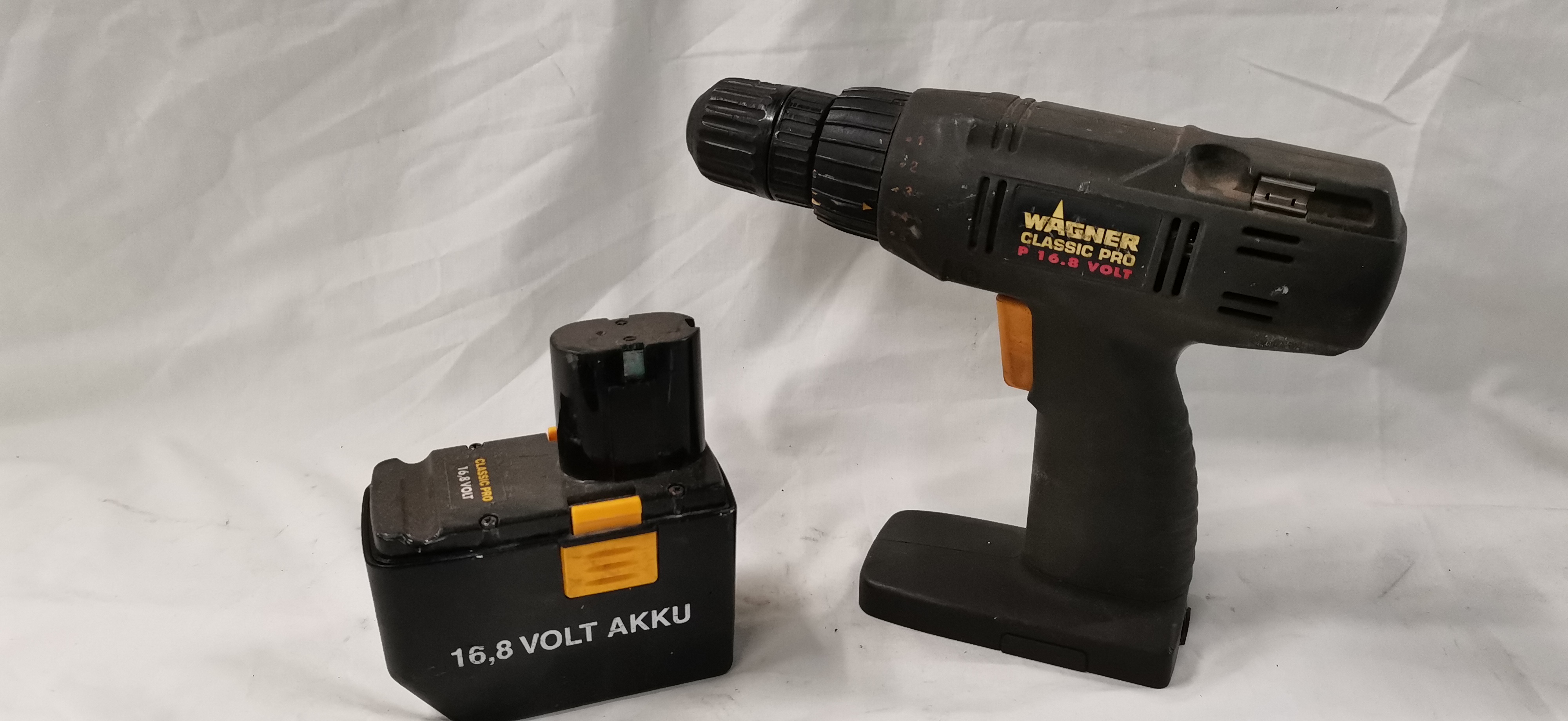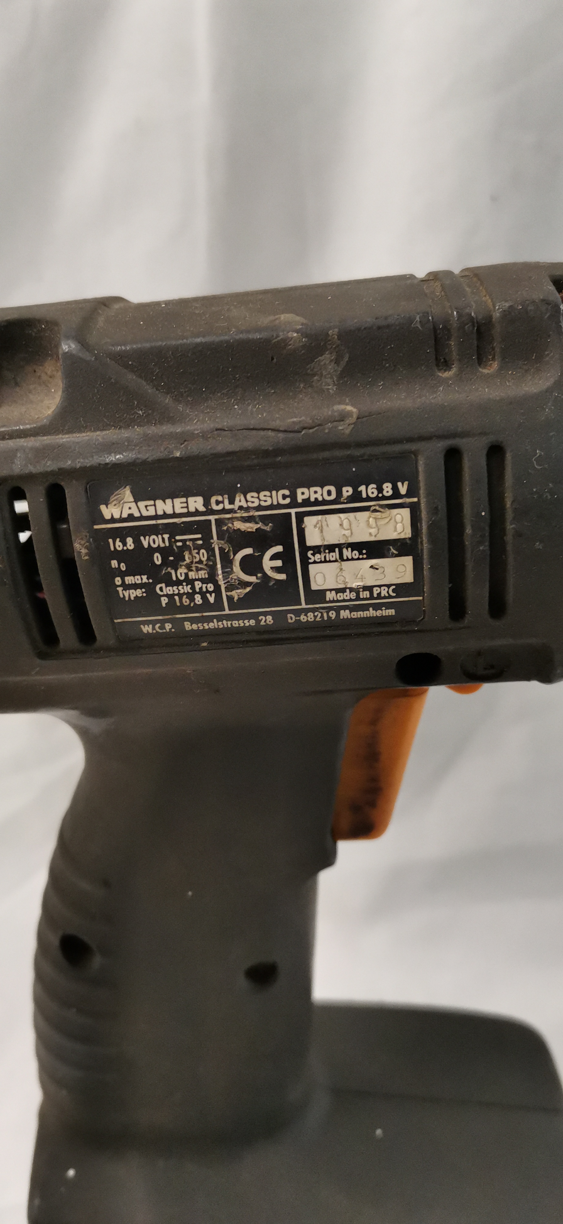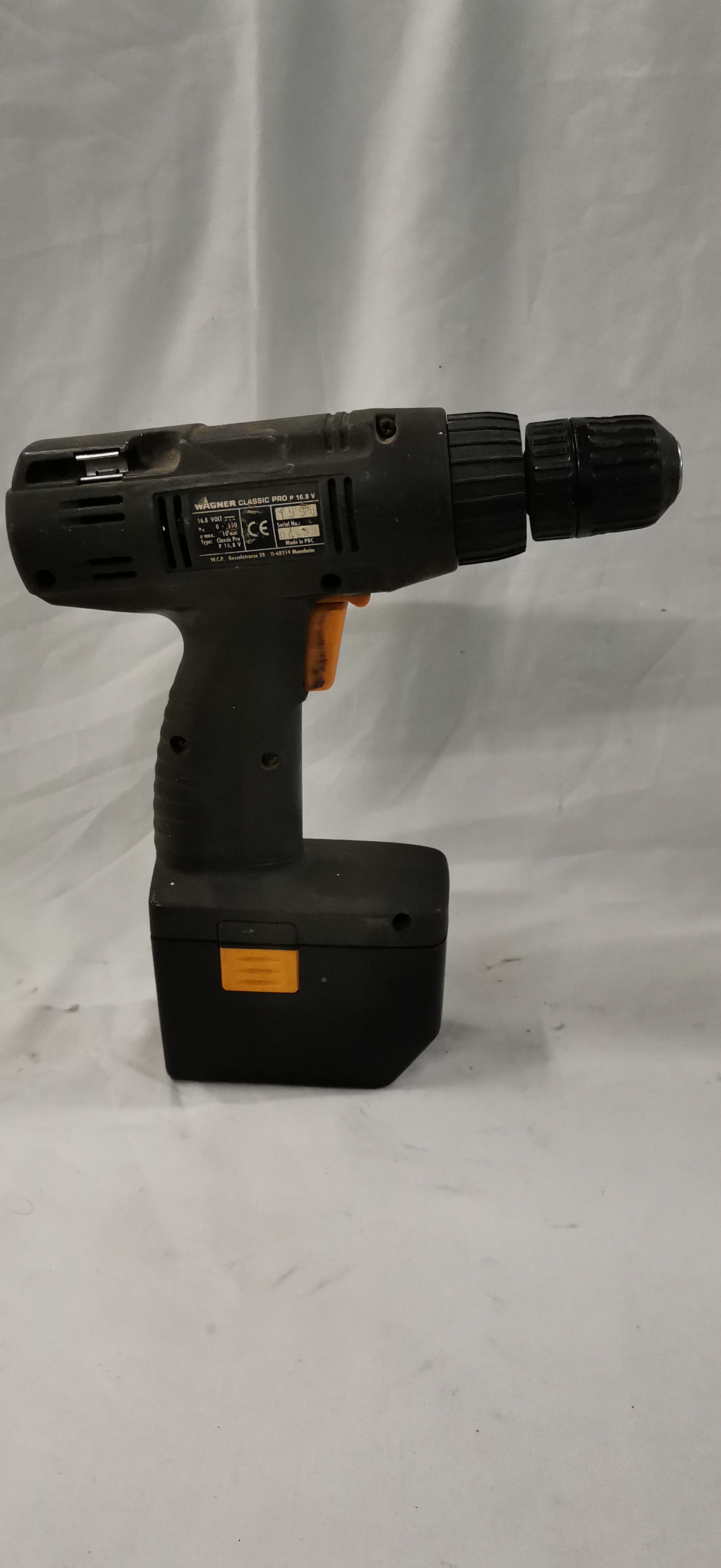 A Wagner Classic Pro model P 16.8V cordless drill and driver. The tool is constructed with a moulded black plastic housing featuring an orange plastic trigger and battery release buttons, and a metal keyless chuck. The side of the tool bears the logo WAGNER CLASSIC PRO P 16.8 VOLT. A specification label on the reverse includes the CE mark, serial number 06439, and the production year 1998. The label identifies the manufacturer as W.C.P. with an address in Mannheim, Germany, and states the item was Made in PRC. The tool is fitted with a single detachable 16.8V battery pack which includes a Power Control charge level indicator. No battery charger, carrying case, or accessories are present.