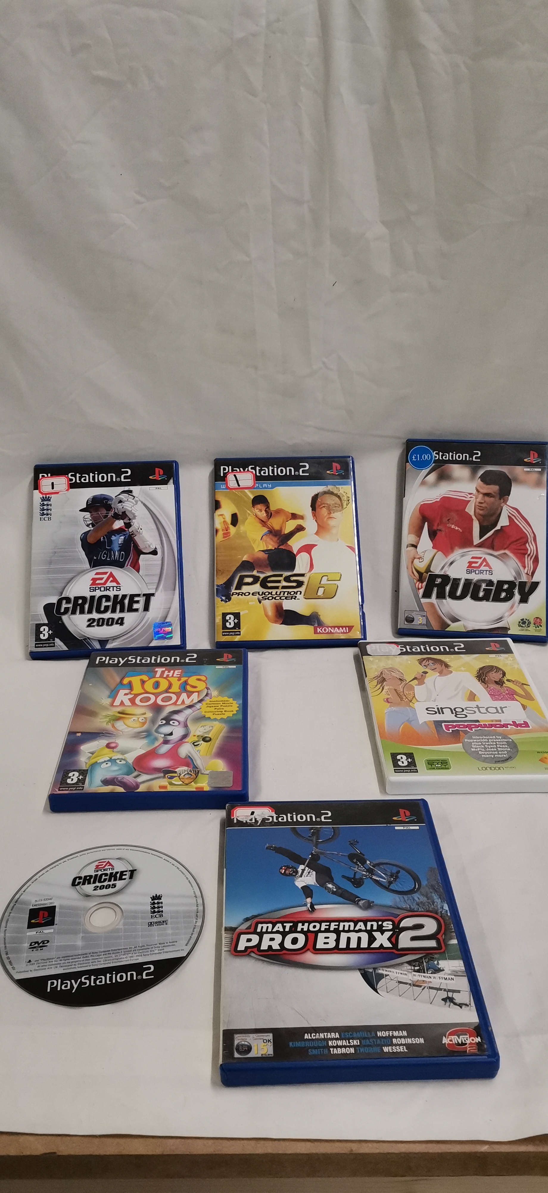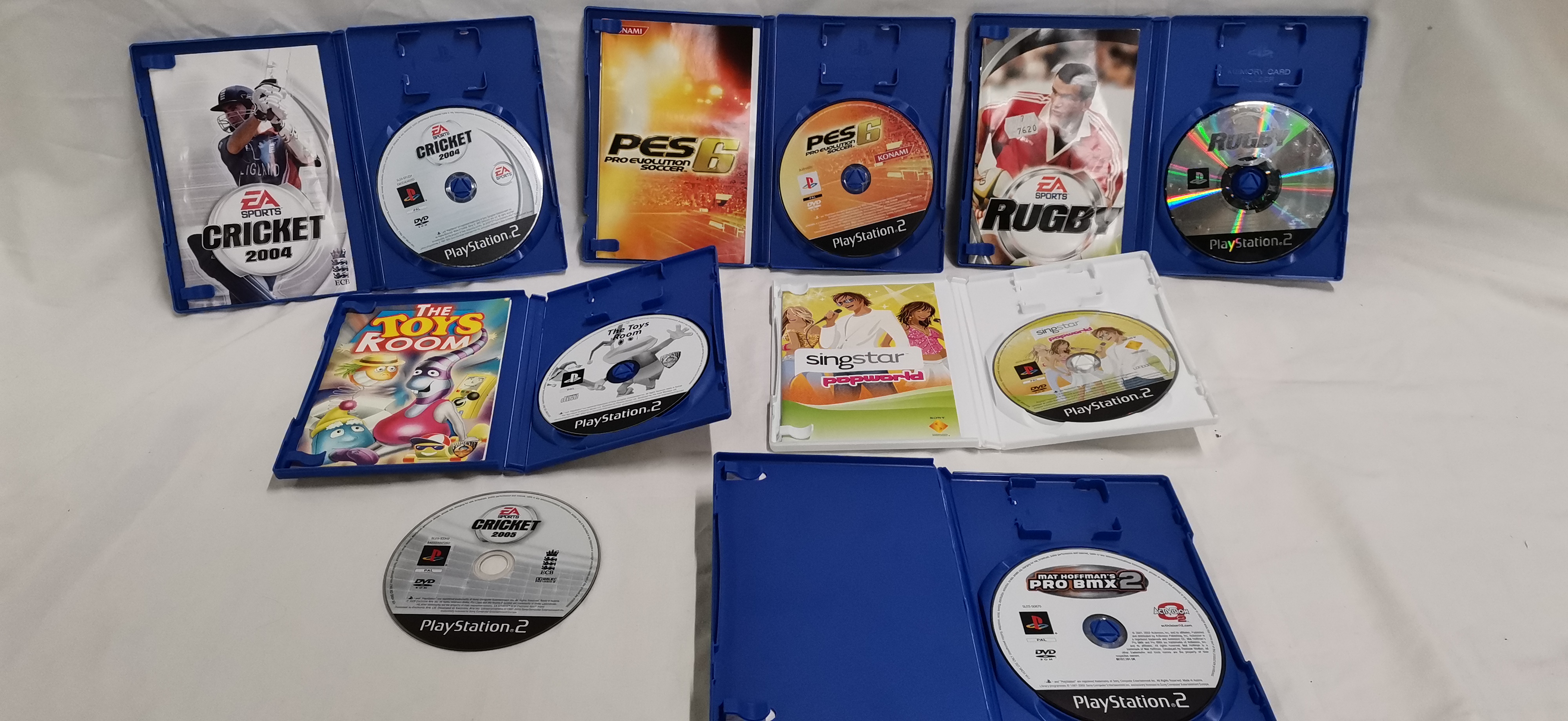 This collection comprises seven software titles for the Sony PlayStation 2 console, all in the PAL regional format. The group includes various genres such as sports and family entertainment. The titles included are Cricket 2004 (EA Sports), PES 6: Pro Evolution Soccer (Konami), Rugby (EA Sports), The Toys Room (Phoenix Games), Singstar Popworld (Sony Computer Entertainment), Mat Hoffman’s Pro BMX 2 (Activision), and a loose disc for Cricket 2005 (EA Sports). Four of the games (Cricket 2004, PES 6, The Toys Room, and Singstar Popworld) are housed in their original plastic cases with manuals and discs. Two games (Rugby and Mat Hoffman’s Pro BMX 2) are cased with discs but lack manuals. One title (Cricket 2005) is present as a loose disc only. The Singstar Popworld title is contained within a white Sony branded case, while the others are in standard blue PlayStation 2 cases. All items feature official publisher markings and PlayStation 2 branding.