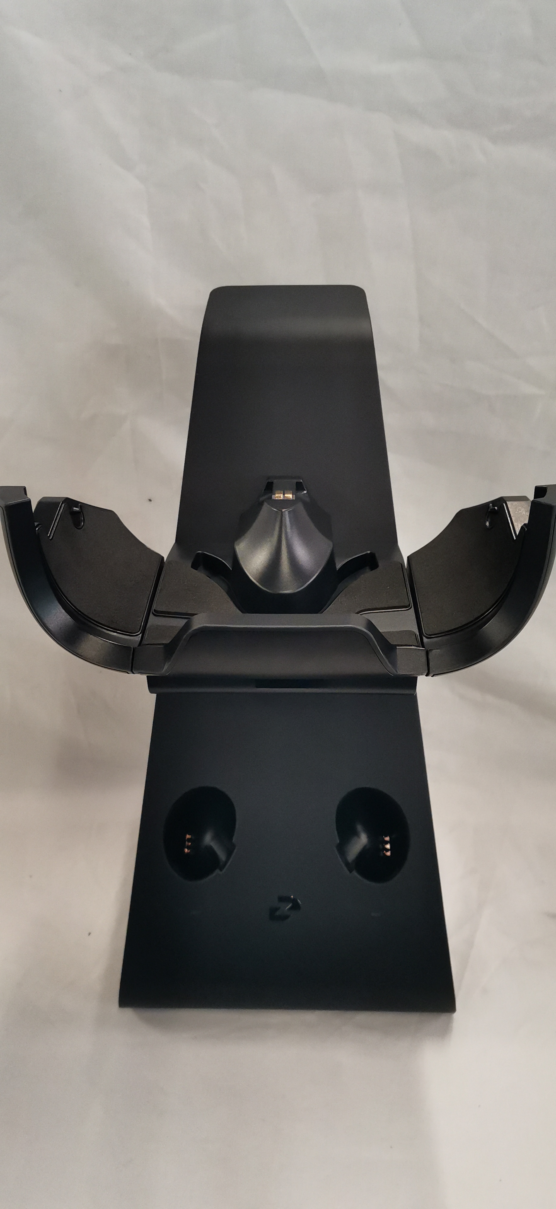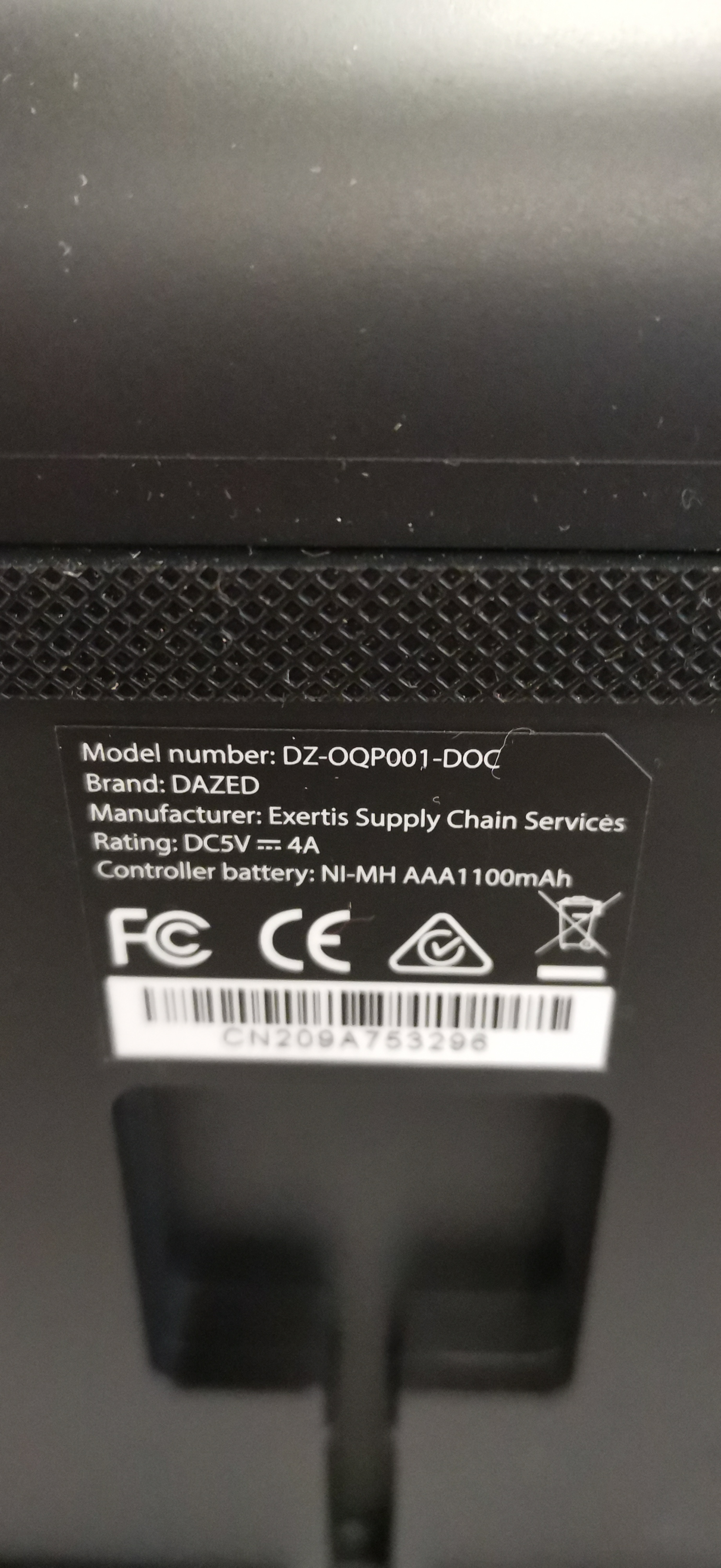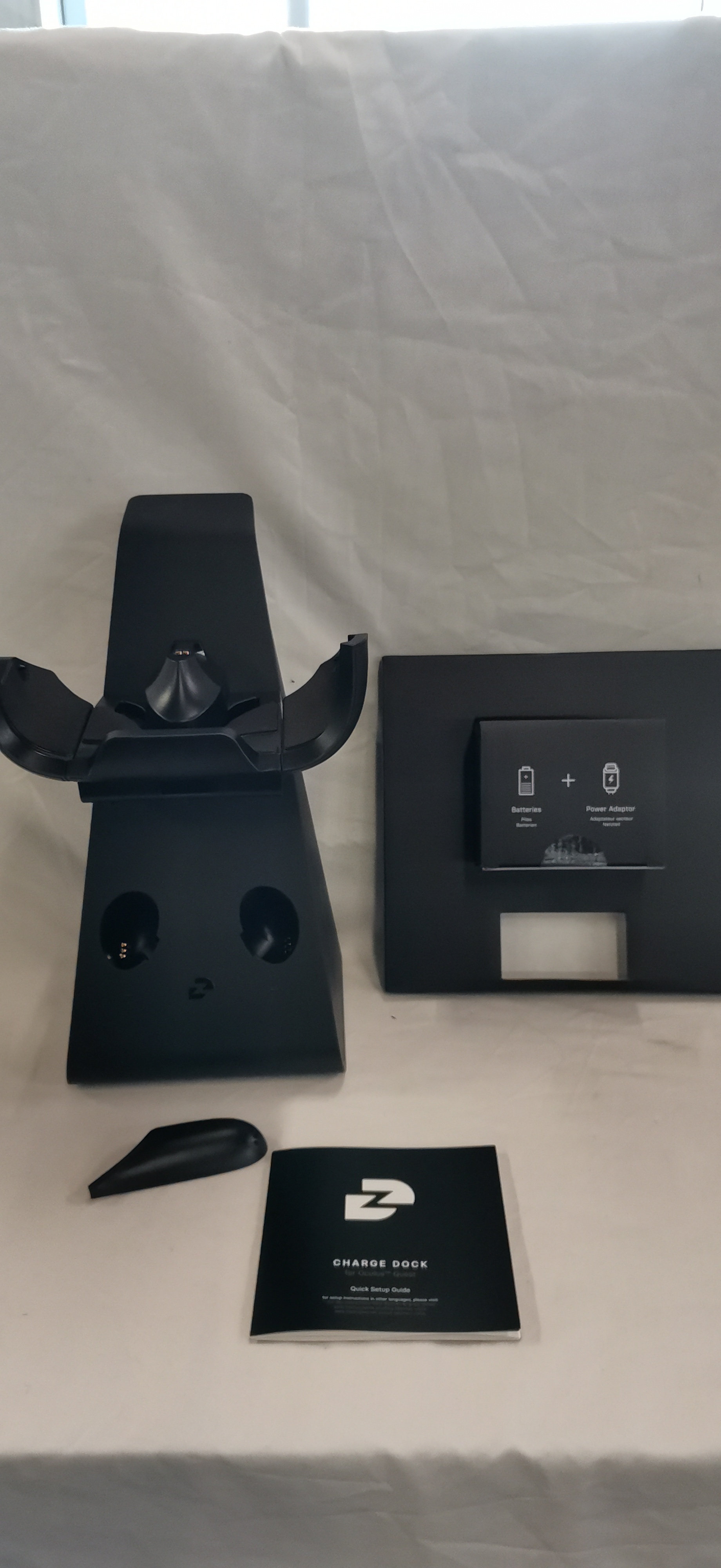 A Dazed Charge Dock for the Oculus Quest virtual reality headset, model number DZ-OQP001-DOC. Manufactured by Exertis Supply Chain Services, the unit is finished in matte black and has a power rating of DC5V 4A. The set comprises the charging dock, a quick setup guide, two NI-MH AAA 1100mAh rechargeable batteries for controllers, a USB headset dongle, and a worldwide USB Type-C power adaptor. The item is presented in its original retail packaging. Markings on the unit include the brand name Dazed and serial number CN209A753298.