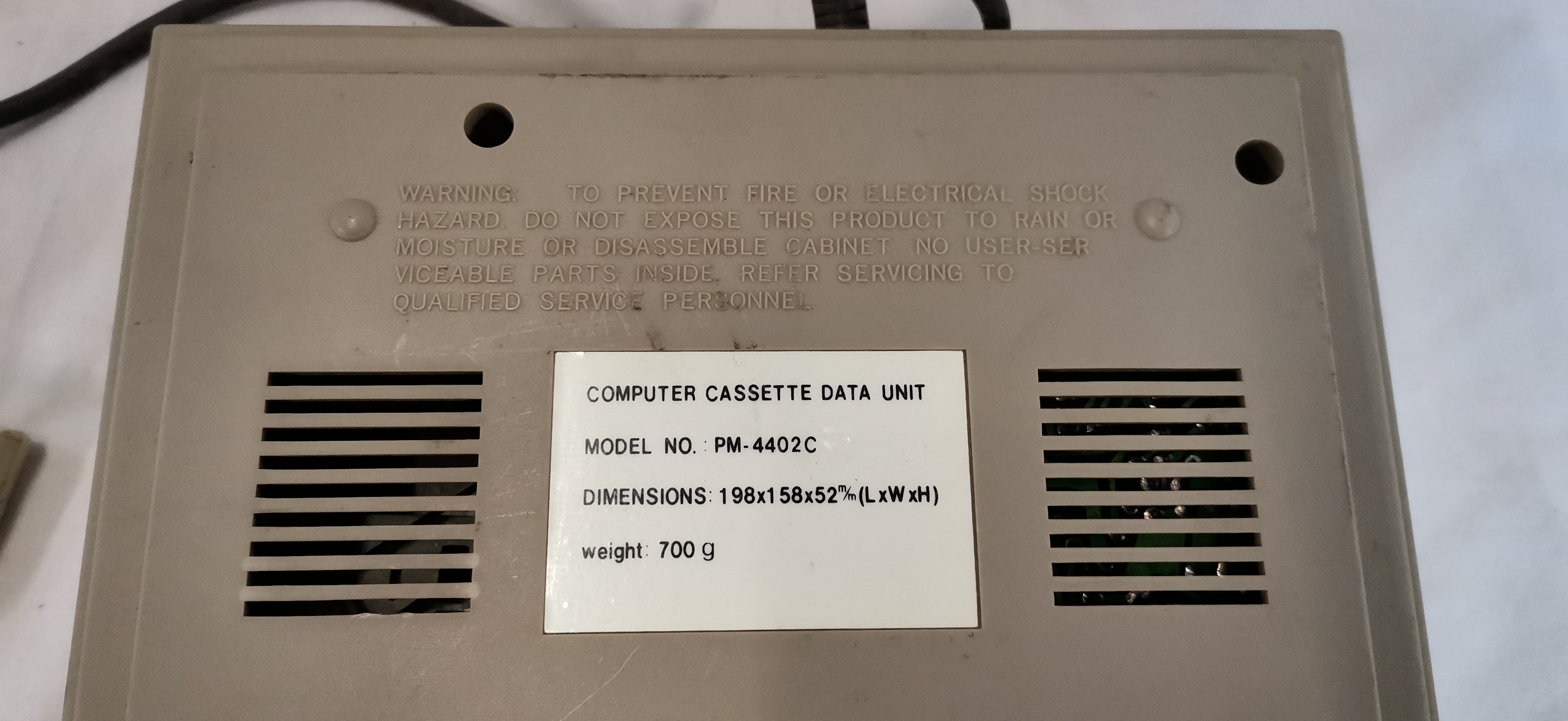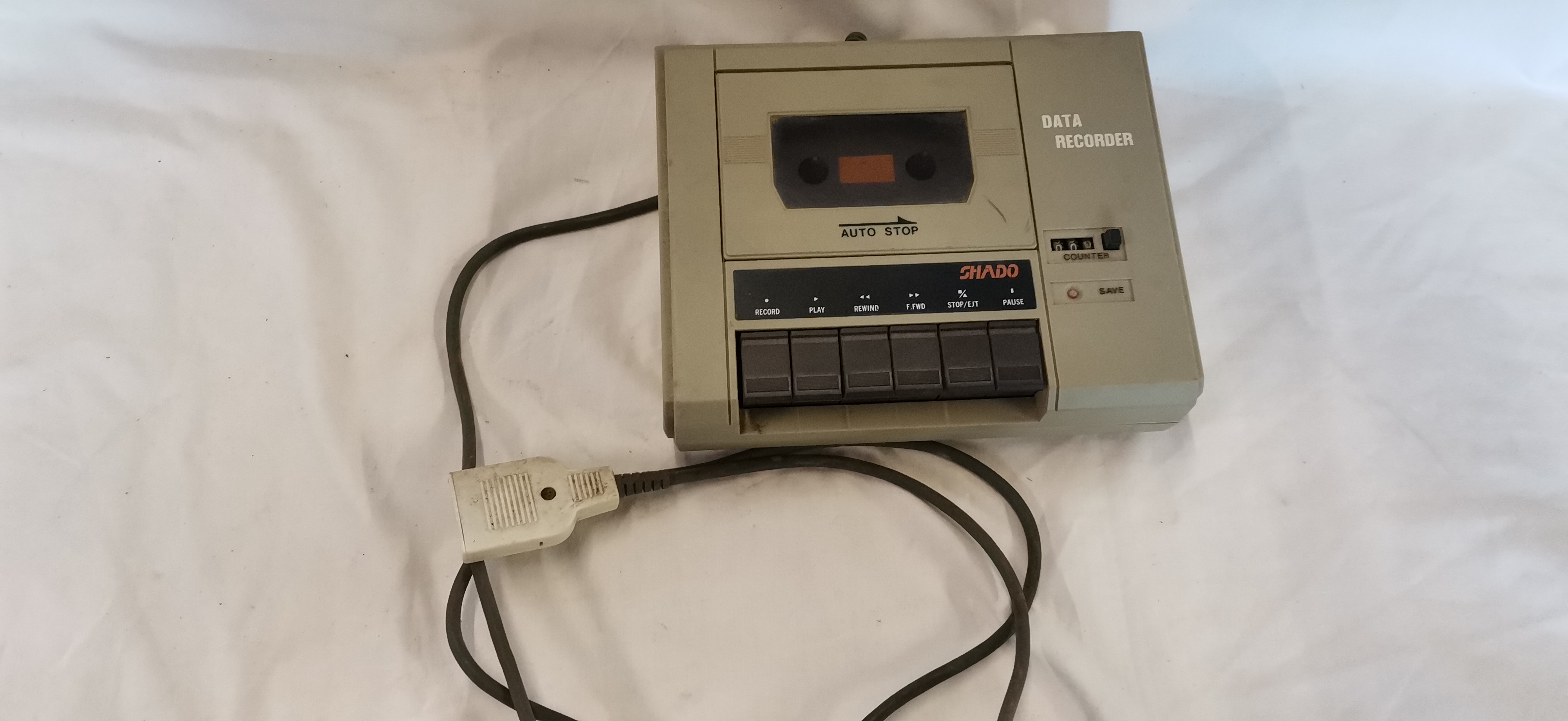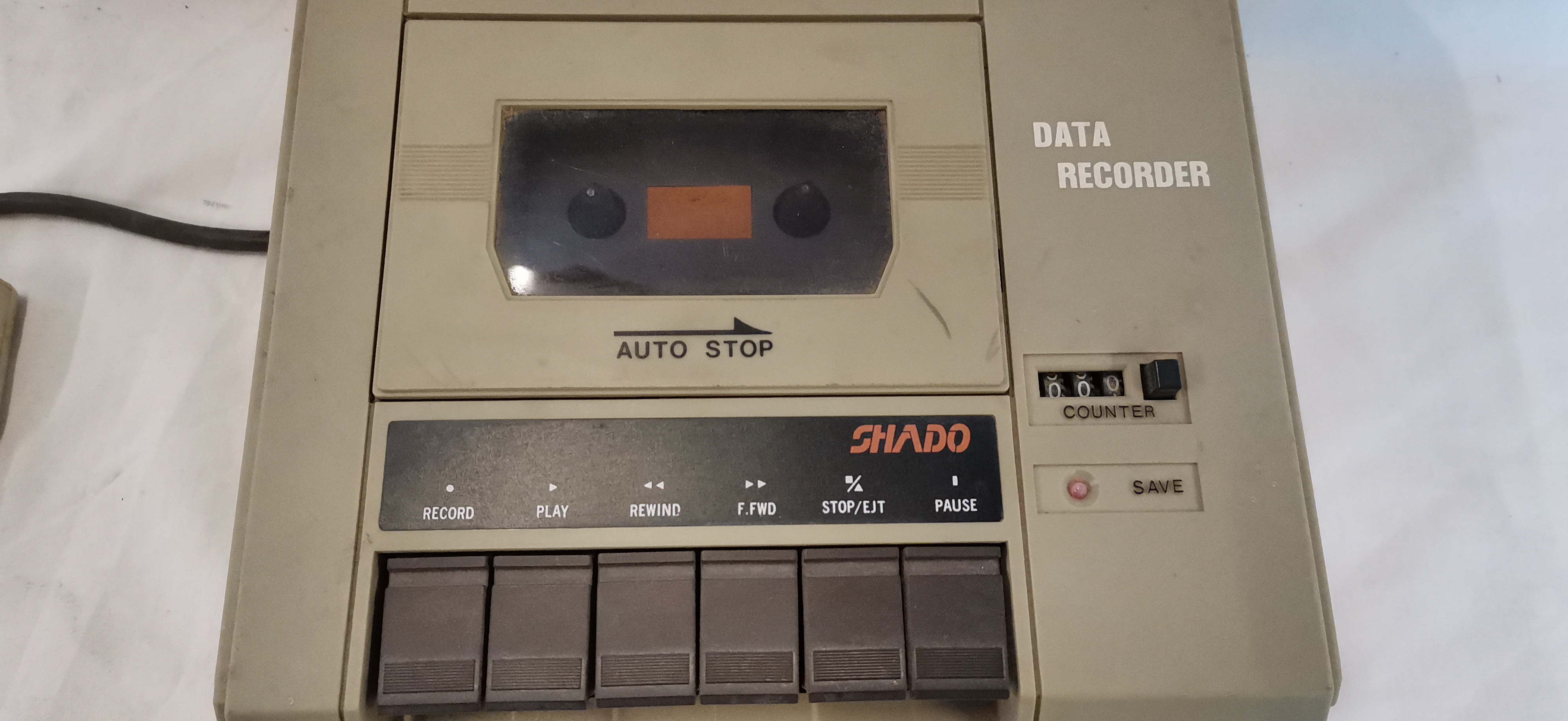 A vintage Shado model PM-4402C computer cassette data unit, designed for use as a peripheral for early home computers. The device is housed in a matte grey and beige moulded plastic cabinet. The interface consists of a six-button mechanical transport system with functions for Record, Play, Rewind, Fast Forward, Stop/Eject, and Pause. The front panel also features a three-digit mechanical tape counter with a manual reset button and a red LED indicator labelled Save. The unit incorporates an Auto Stop function and is of solid-state construction. A permanent data and power lead is attached, terminating in a white multi-pin connector. The underside features a printed white identification label and embossed safety warnings.