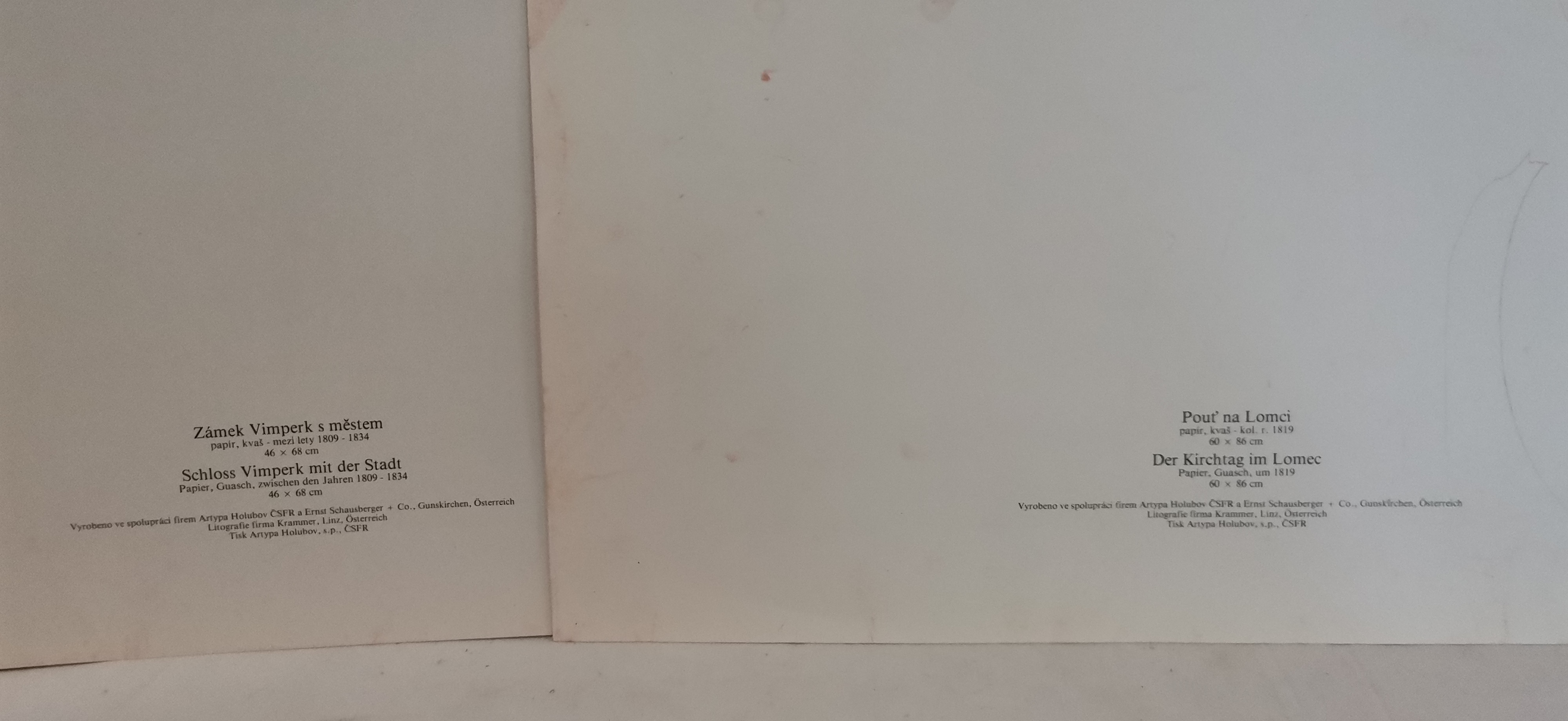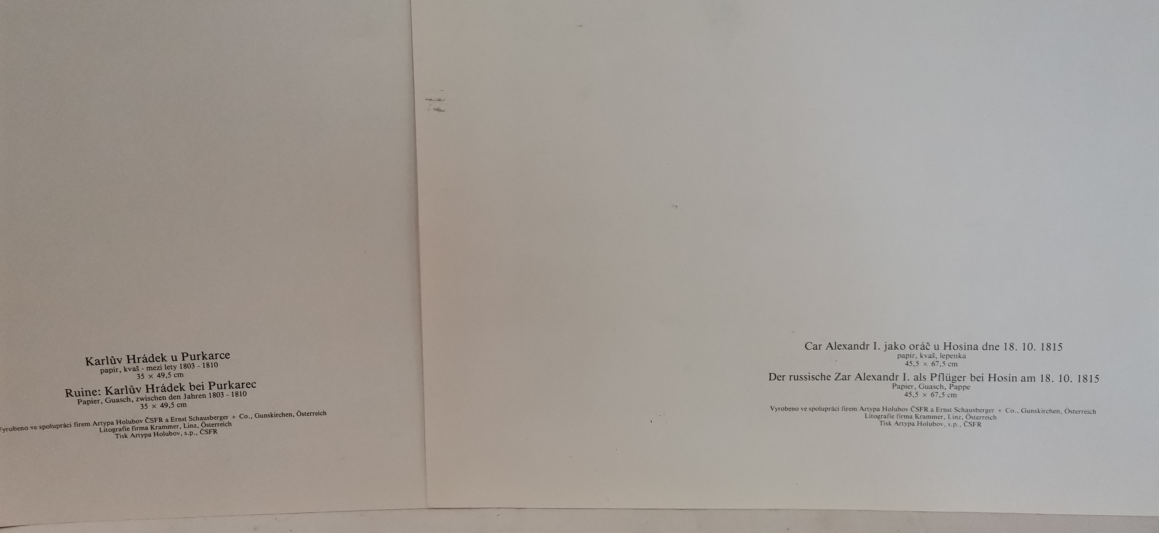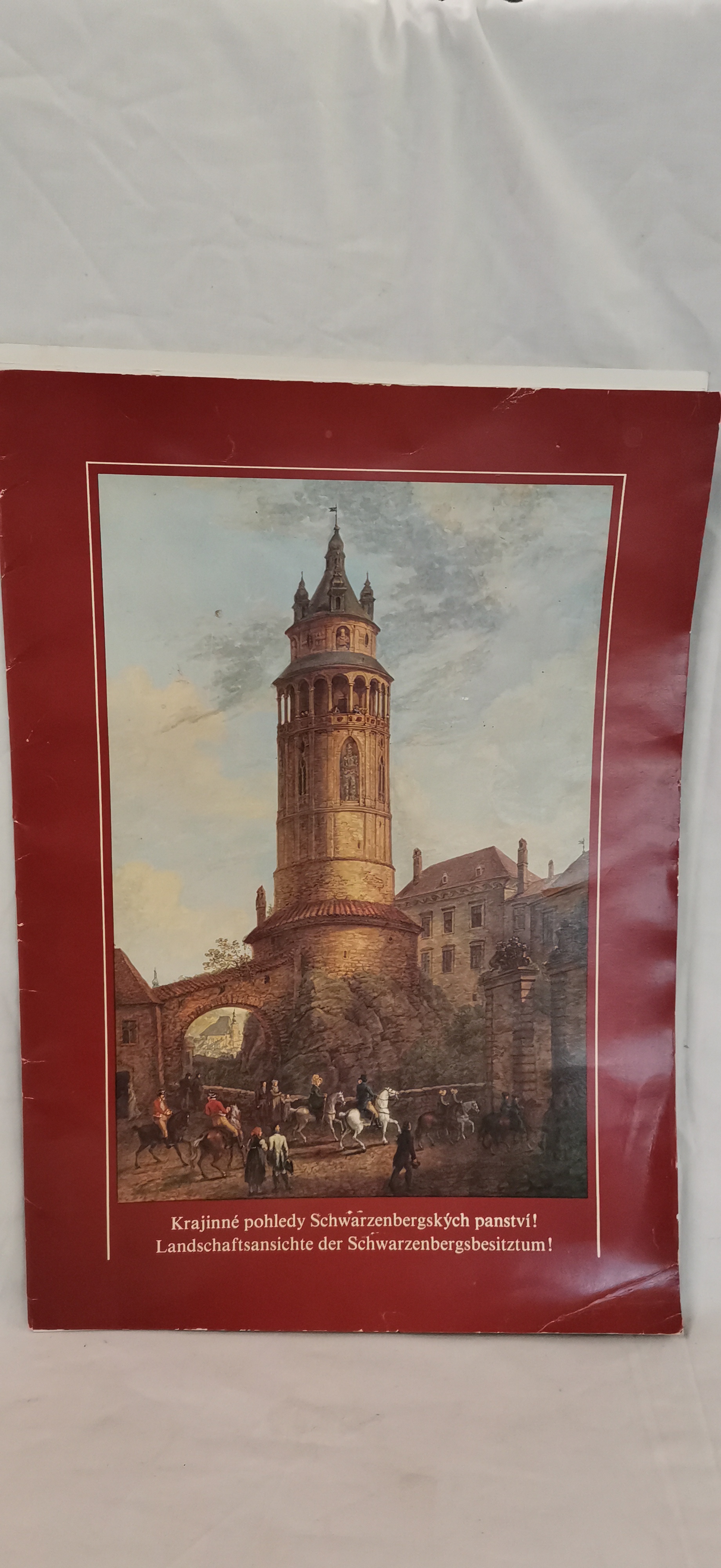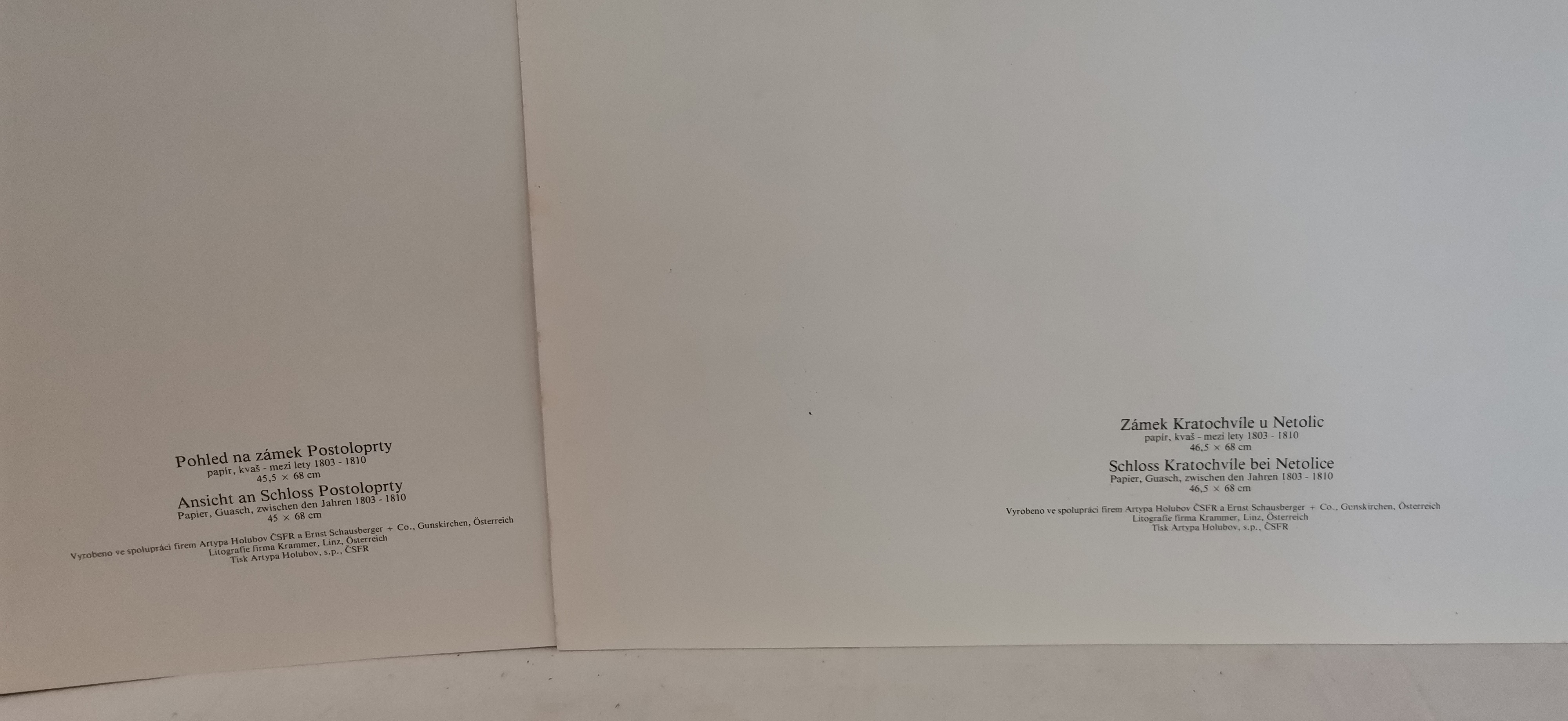 This lot comprises a collection of large-format landscape art prints titled Krajinne pohledy Schwarzenbergskych panstvi / Landschaftsansichte der Schwarzenbergsbesitztum. The portfolio was produced as a joint venture between Artypa Holubov (CSFR) and Ernst Schausberger + Co. of Gunskirchen, Austria, with lithography by Firma Krammer of Linz, Austria. The collection contains modern reproductions of early 19th-century gouache paintings depicting various estates and historical scenes associated with the Schwarzenberg family. Included subjects are Schloss Orlik nad Vltavou, Ruine Madchenstein (Zricenina Divci Kamen), Schloss Vimperk (Zamek Vimperk), Der Kirchtag im Lomec (Pout na Lomci), Schloss Postoloprty (Zamek Postoloprty), Schloss Kratochvile (Zamek Kratochvile), Ruine Karluv Hradek (Karluv Hradek u Purkarce), Tsar Alexander I as a Plowman at Hosin (Car Alexandr I. jako orac u Hosina), and Haselburgsruine (Zricenina Haselburgu). The plates are housed in a large red card folder with a stapled binding. Each plate features descriptive text on the reverse in Czech and German, including the original painting dates which range from 1803 to 1834.