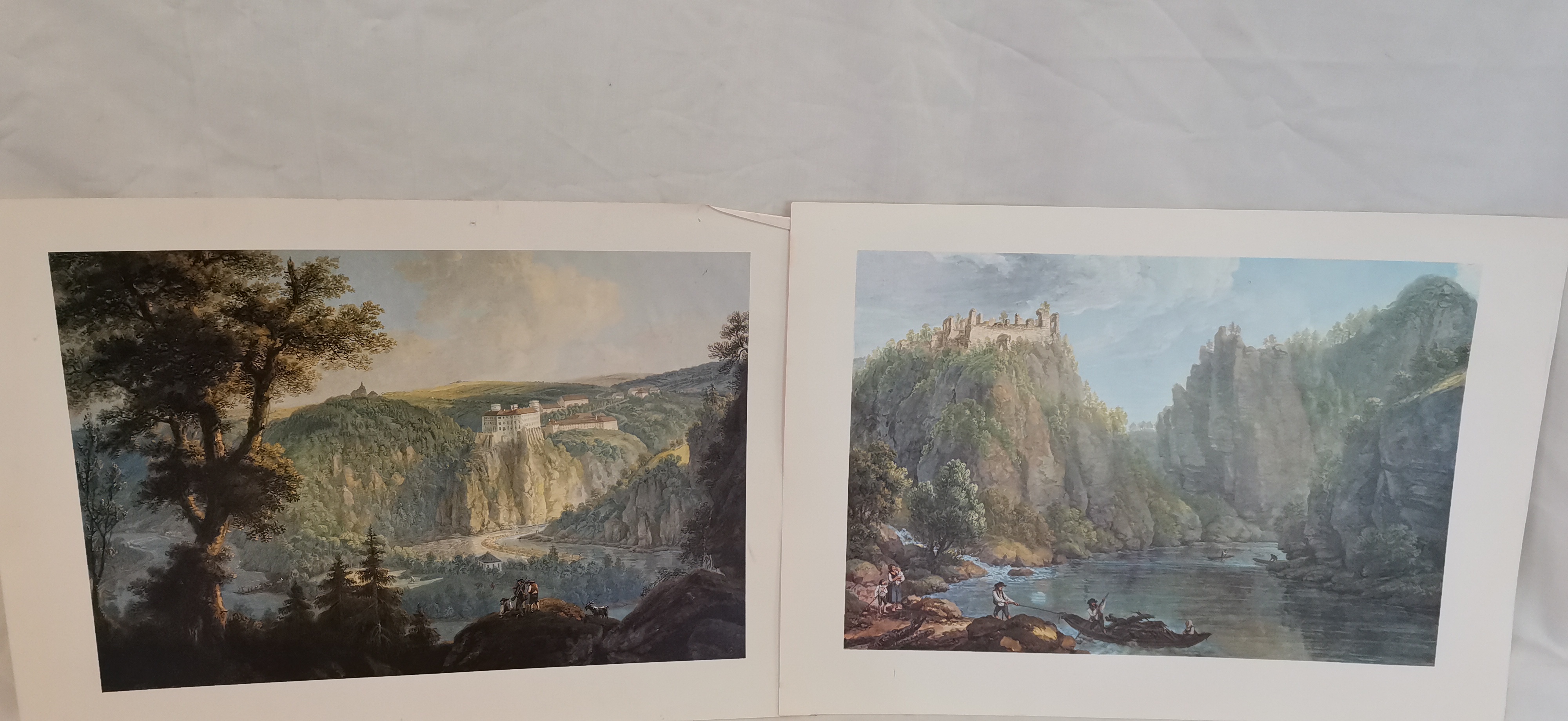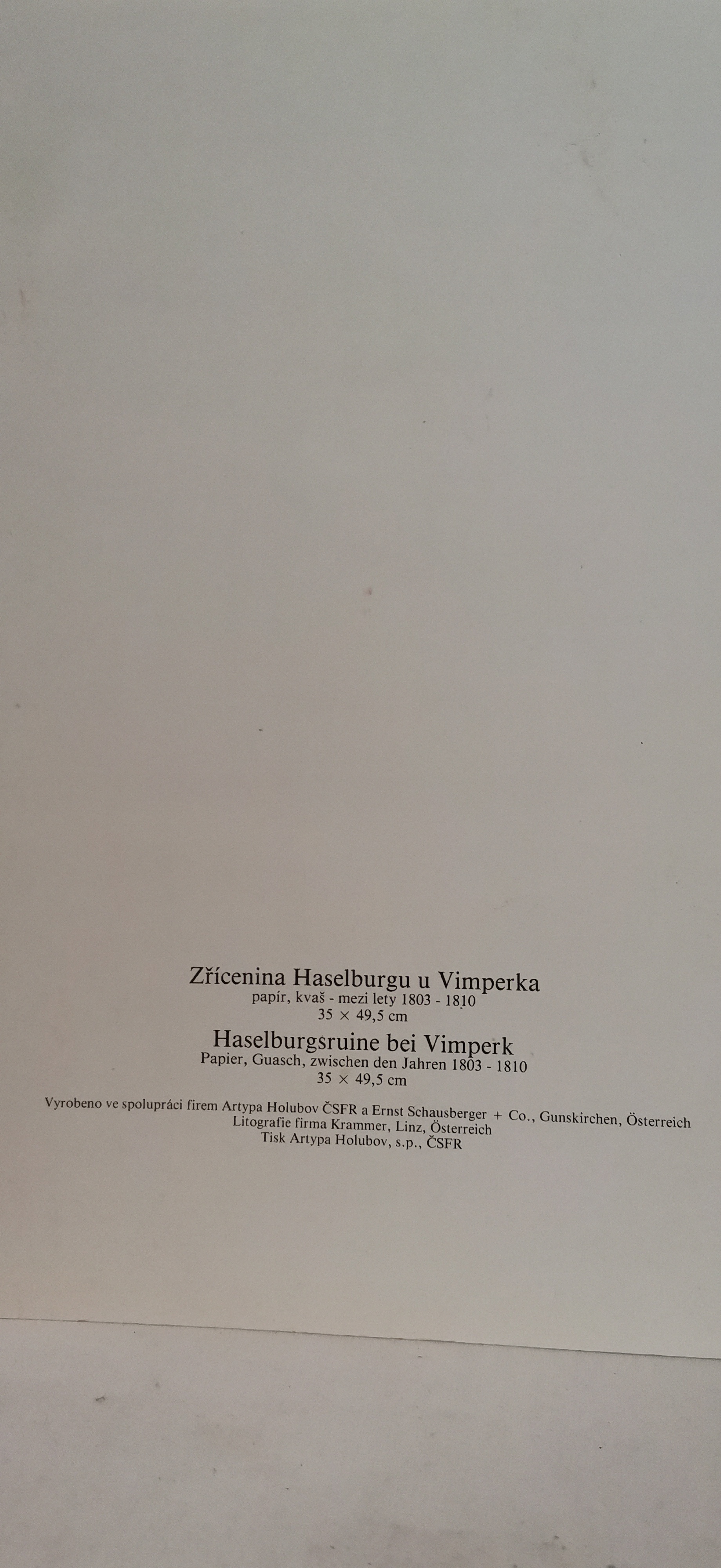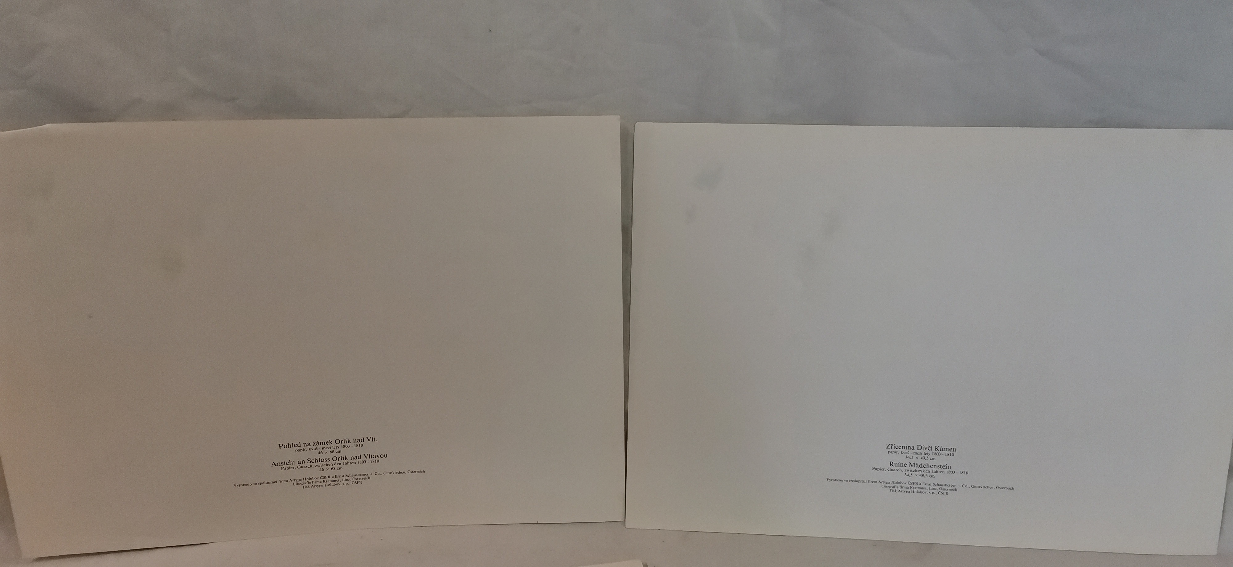 This lot comprises a collection of large-format landscape art prints titled Krajinne pohledy Schwarzenbergskych panstvi / Landschaftsansichte der Schwarzenbergsbesitztum. The portfolio was produced as a joint venture between Artypa Holubov (CSFR) and Ernst Schausberger + Co. of Gunskirchen, Austria, with lithography by Firma Krammer of Linz, Austria. The collection contains modern reproductions of early 19th-century gouache paintings depicting various estates and historical scenes associated with the Schwarzenberg family. Included subjects are Schloss Orlik nad Vltavou, Ruine Madchenstein (Zricenina Divci Kamen), Schloss Vimperk (Zamek Vimperk), Der Kirchtag im Lomec (Pout na Lomci), Schloss Postoloprty (Zamek Postoloprty), Schloss Kratochvile (Zamek Kratochvile), Ruine Karluv Hradek (Karluv Hradek u Purkarce), Tsar Alexander I as a Plowman at Hosin (Car Alexandr I. jako orac u Hosina), and Haselburgsruine (Zricenina Haselburgu). The plates are housed in a large red card folder with a stapled binding. Each plate features descriptive text on the reverse in Czech and German, including the original painting dates which range from 1803 to 1834.