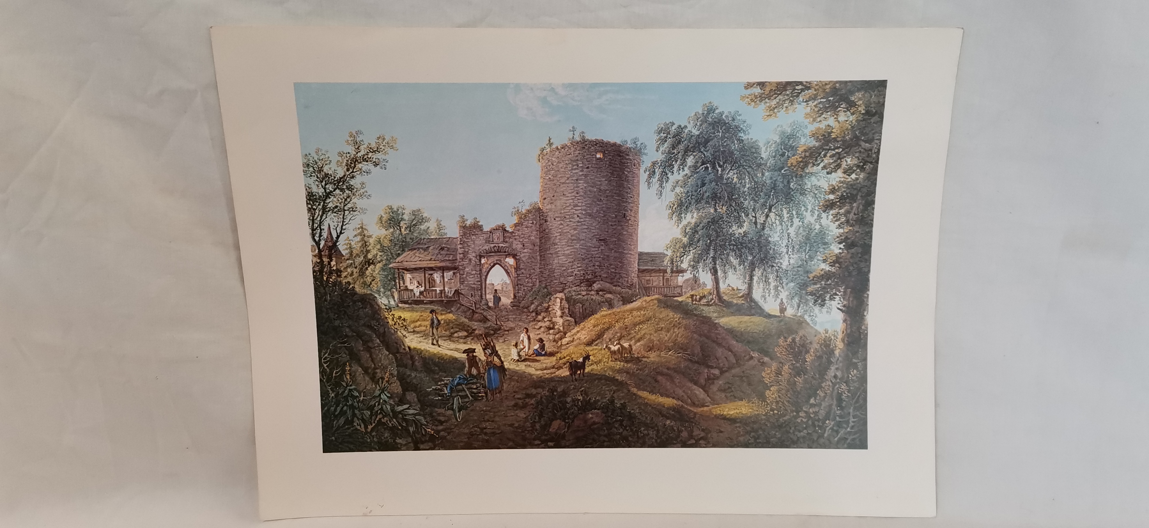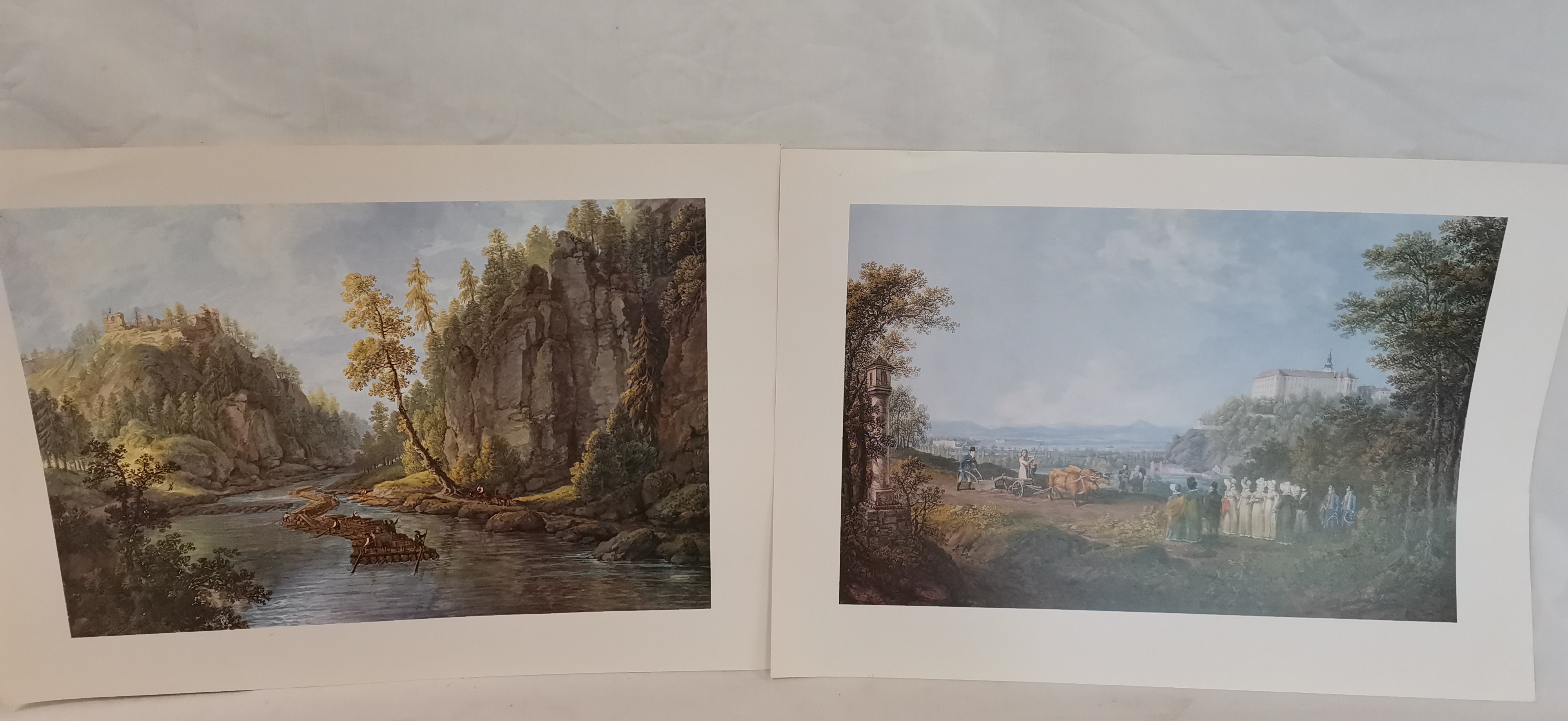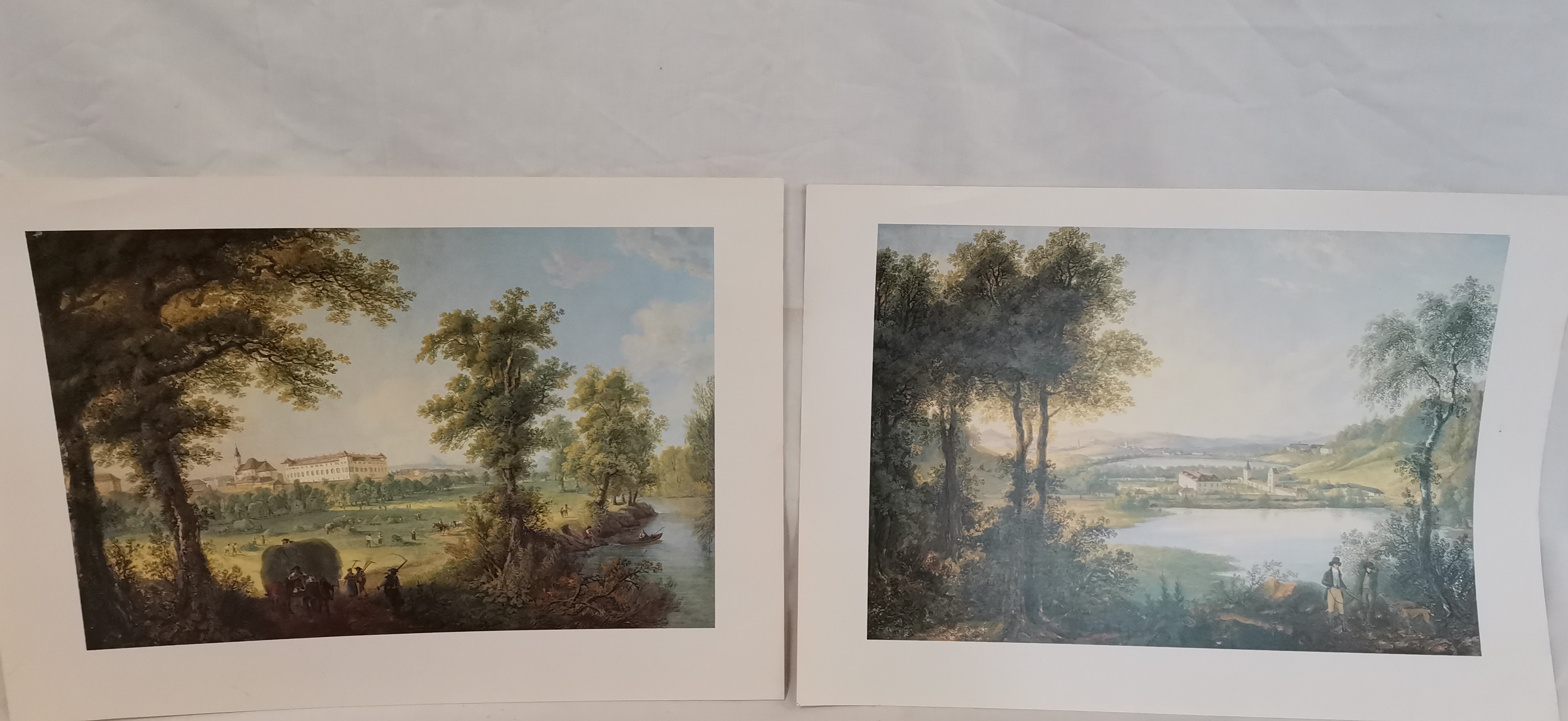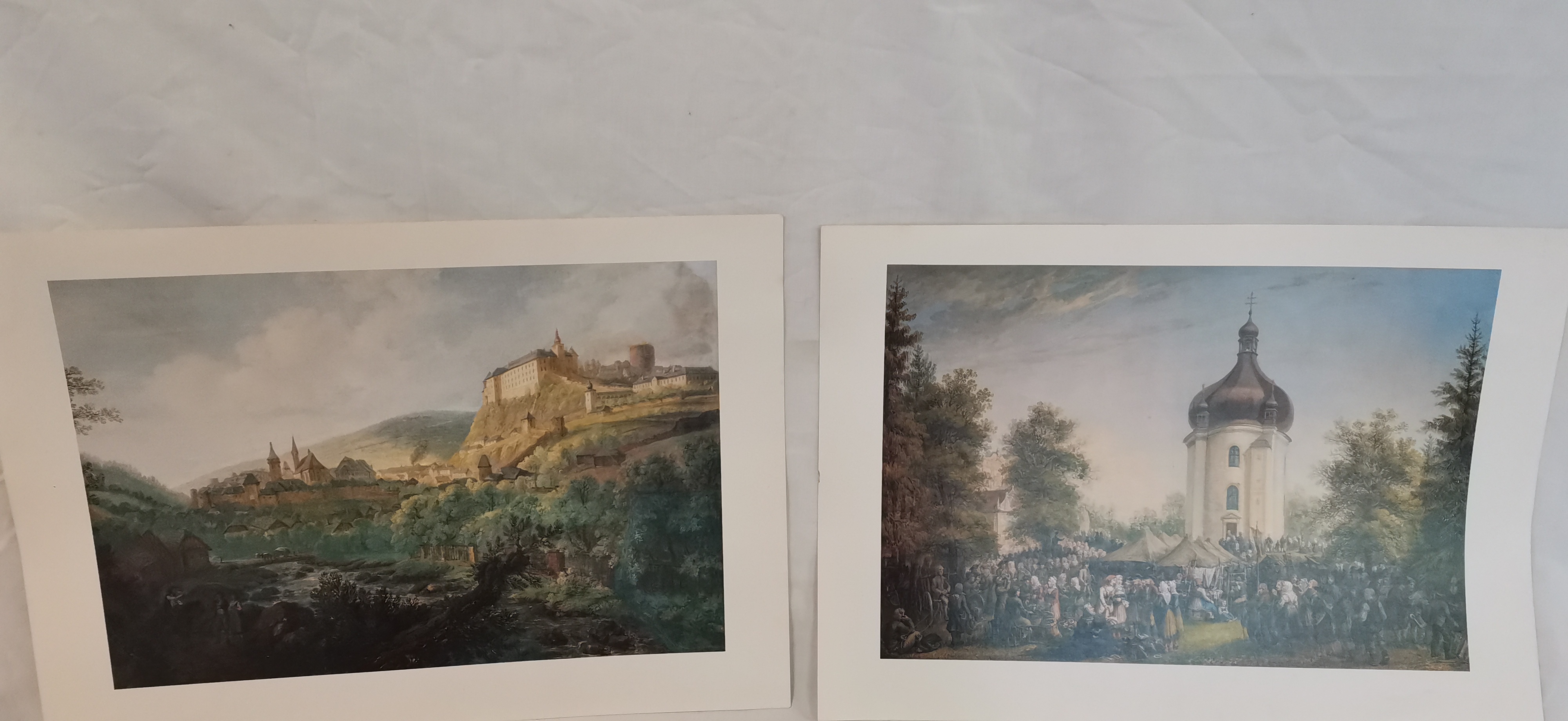 This lot comprises a collection of large-format landscape art prints titled Krajinne pohledy Schwarzenbergskych panstvi / Landschaftsansichte der Schwarzenbergsbesitztum. The portfolio was produced as a joint venture between Artypa Holubov (CSFR) and Ernst Schausberger + Co. of Gunskirchen, Austria, with lithography by Firma Krammer of Linz, Austria. The collection contains modern reproductions of early 19th-century gouache paintings depicting various estates and historical scenes associated with the Schwarzenberg family. Included subjects are Schloss Orlik nad Vltavou, Ruine Madchenstein (Zricenina Divci Kamen), Schloss Vimperk (Zamek Vimperk), Der Kirchtag im Lomec (Pout na Lomci), Schloss Postoloprty (Zamek Postoloprty), Schloss Kratochvile (Zamek Kratochvile), Ruine Karluv Hradek (Karluv Hradek u Purkarce), Tsar Alexander I as a Plowman at Hosin (Car Alexandr I. jako orac u Hosina), and Haselburgsruine (Zricenina Haselburgu). The plates are housed in a large red card folder with a stapled binding. Each plate features descriptive text on the reverse in Czech and German, including the original painting dates which range from 1803 to 1834.
