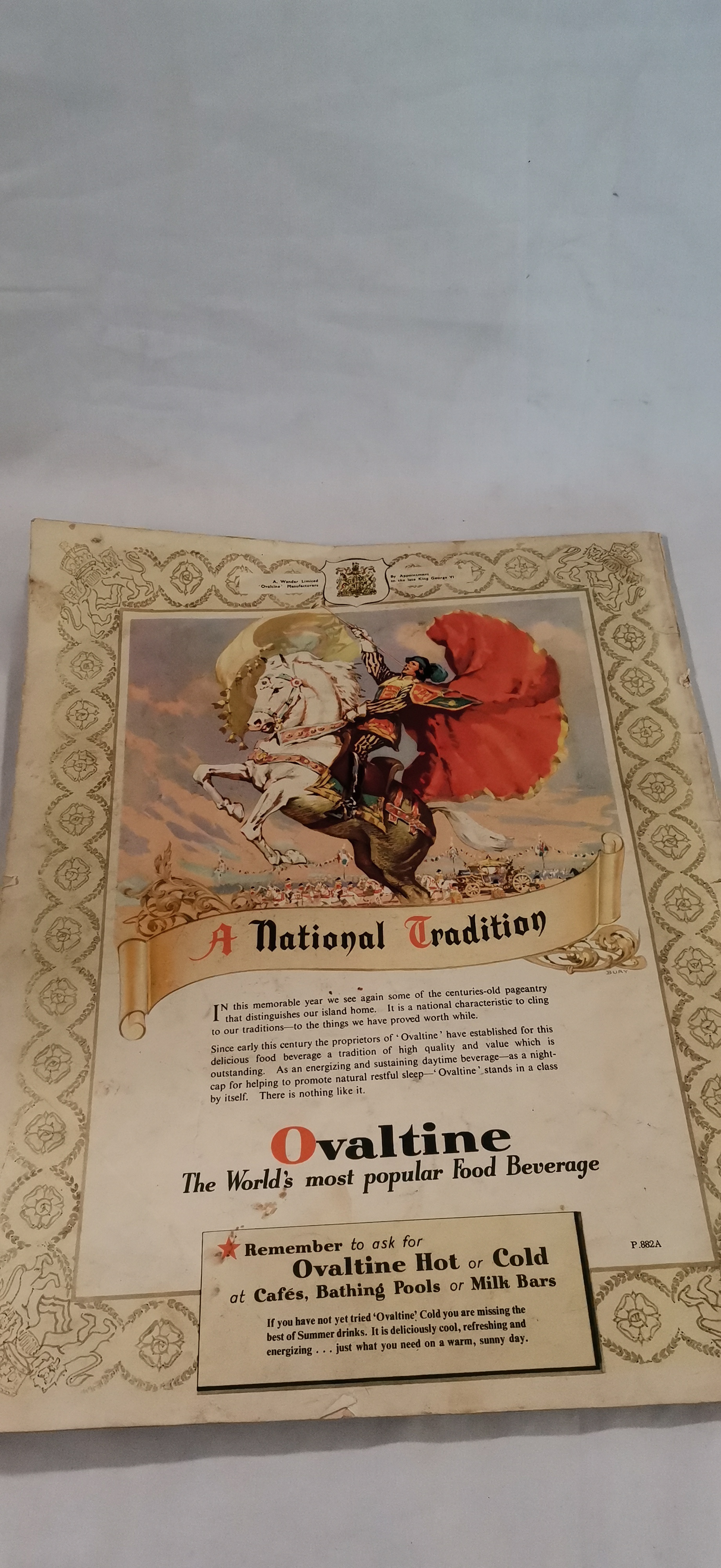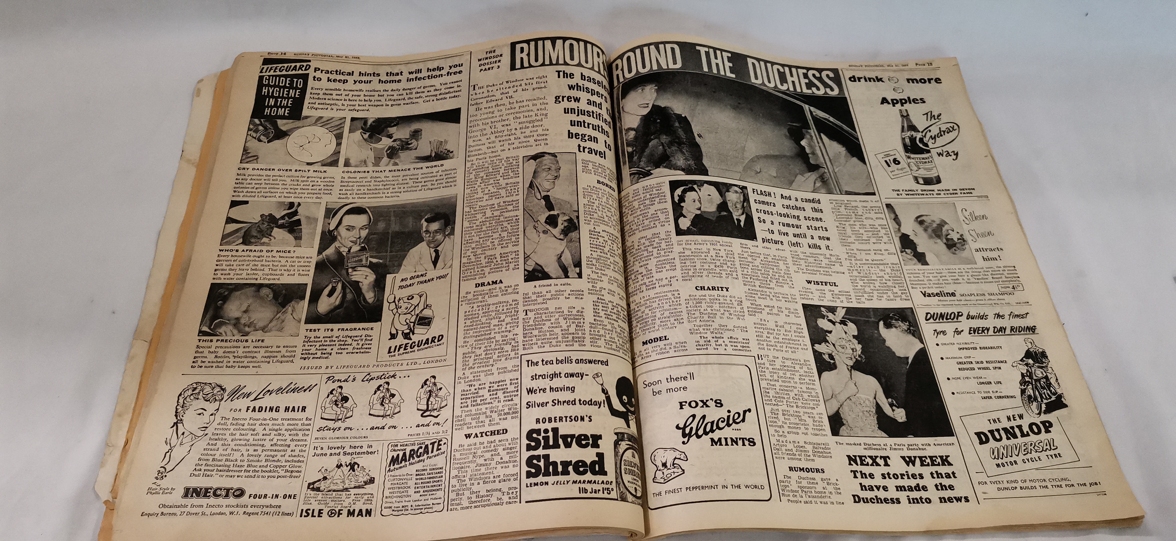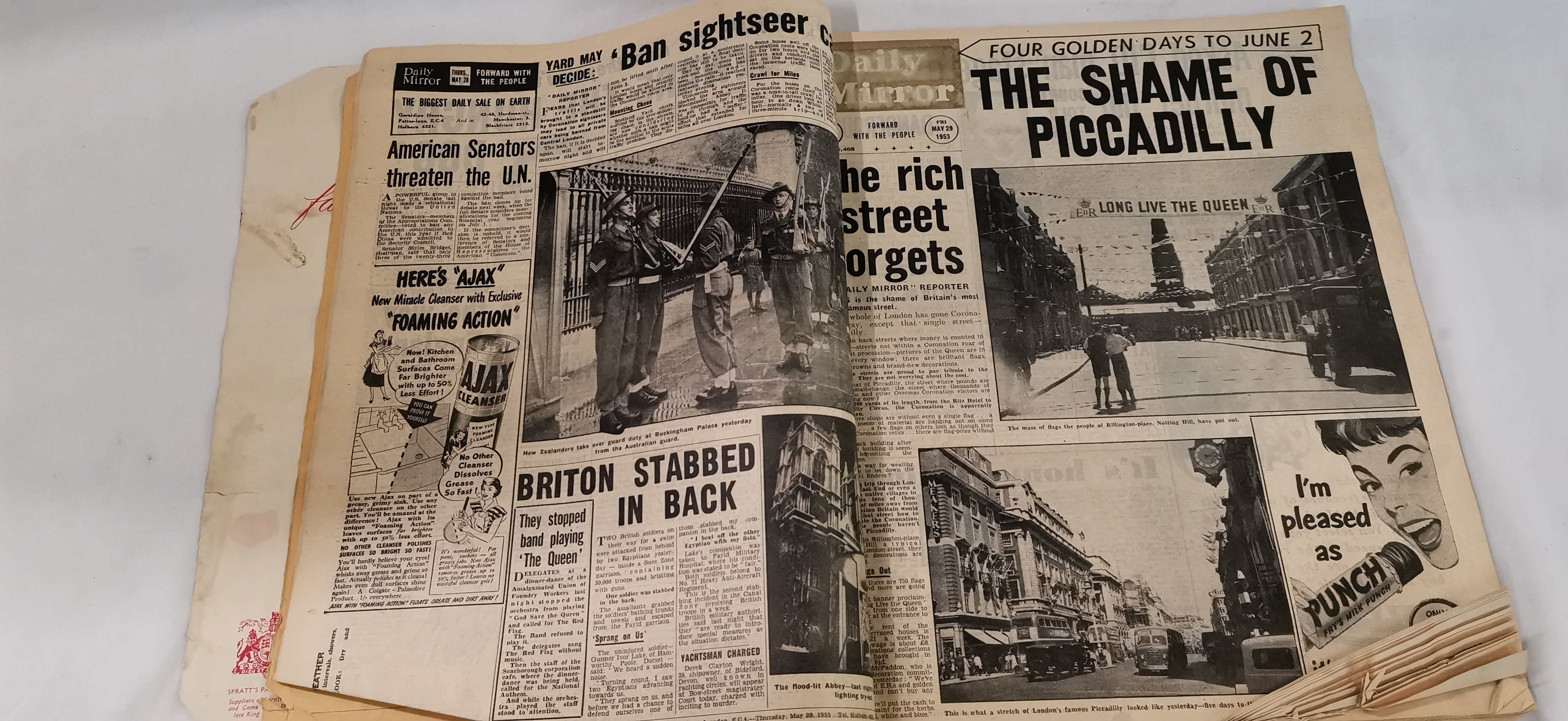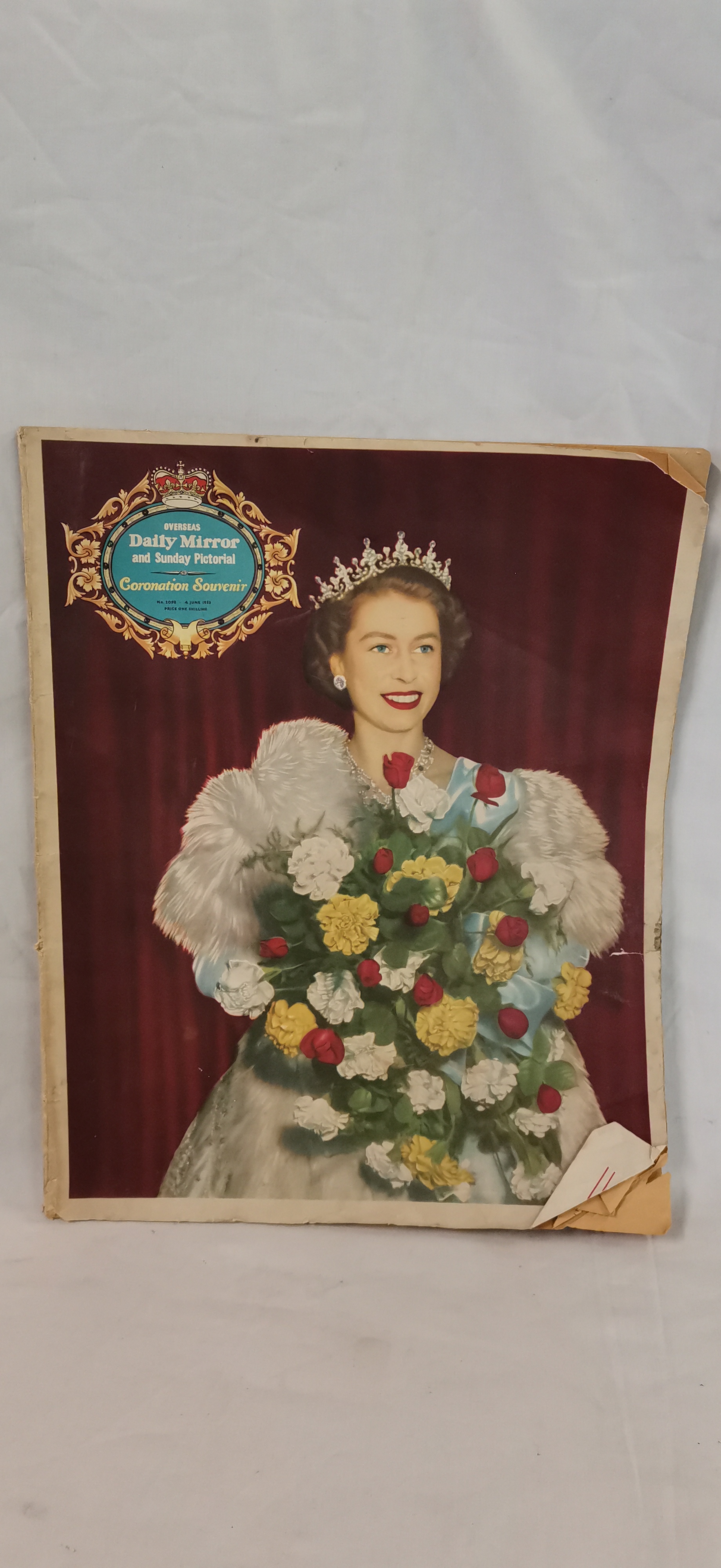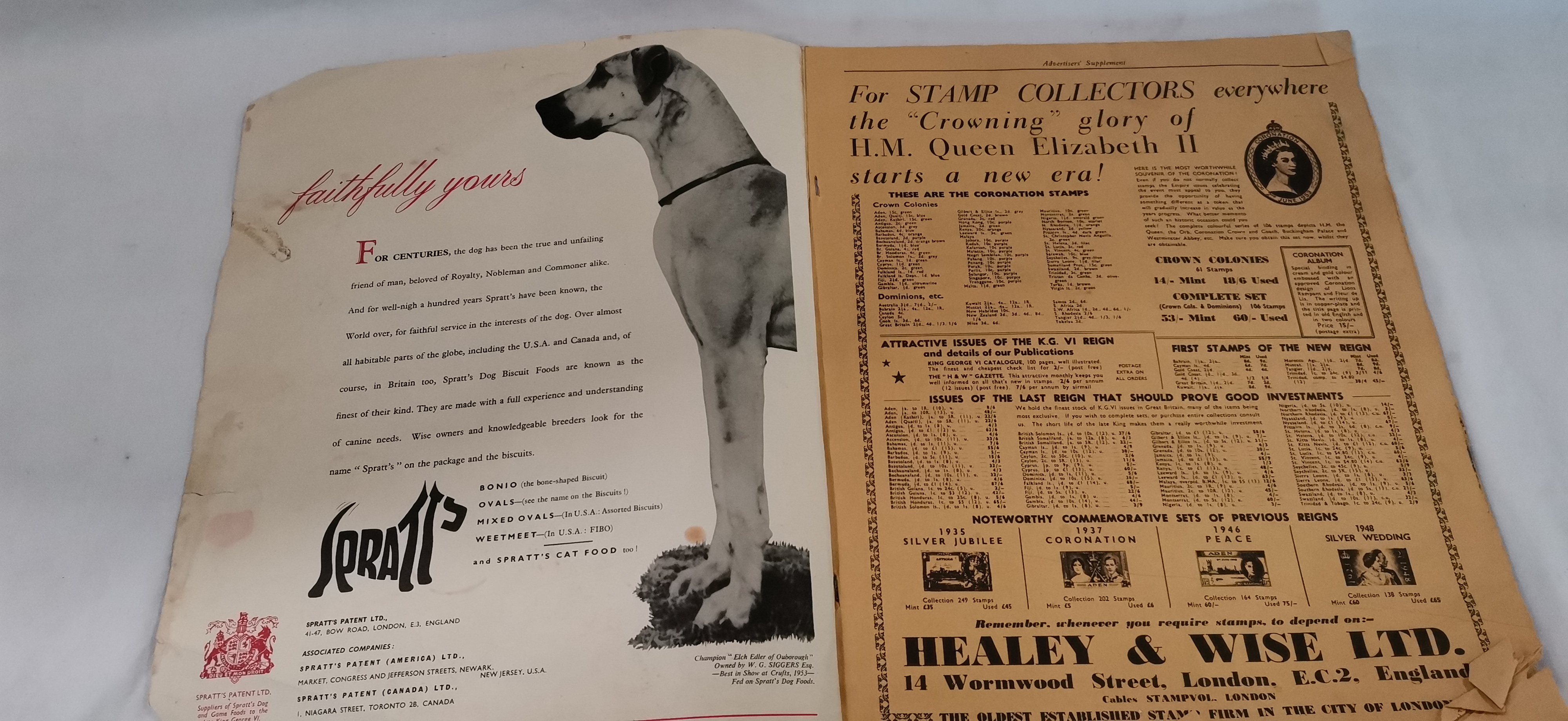 A commemorative staple-bound softcover magazine published for the coronation of Queen Elizabeth II, specifically the Overseas Edition dated 4 June 1953. The front cover features a colour portrait of Her Majesty wearing a tiara and white fur wrap, holding a bouquet of yellow and white carnations and red roses. The publication contains a compilation of news and features from late May 1953, including reports on international affairs and social commentary. Notable editorial content includes a feature titled The Shame of Piccadilly and a piece regarding the Duchess of Windsor titled Rumour Round the Duchess. The magazine is heavily illustrated with period advertisements for brands including Spratt’s Dog Biscuits, Ajax Cleanser, Fox’s Glacier Mints, Dunlop Tyres, and a full-page Ovaltine advertisement on the back cover. Internal pages include a supplement for stamp collectors by Healey and Wise Ltd.