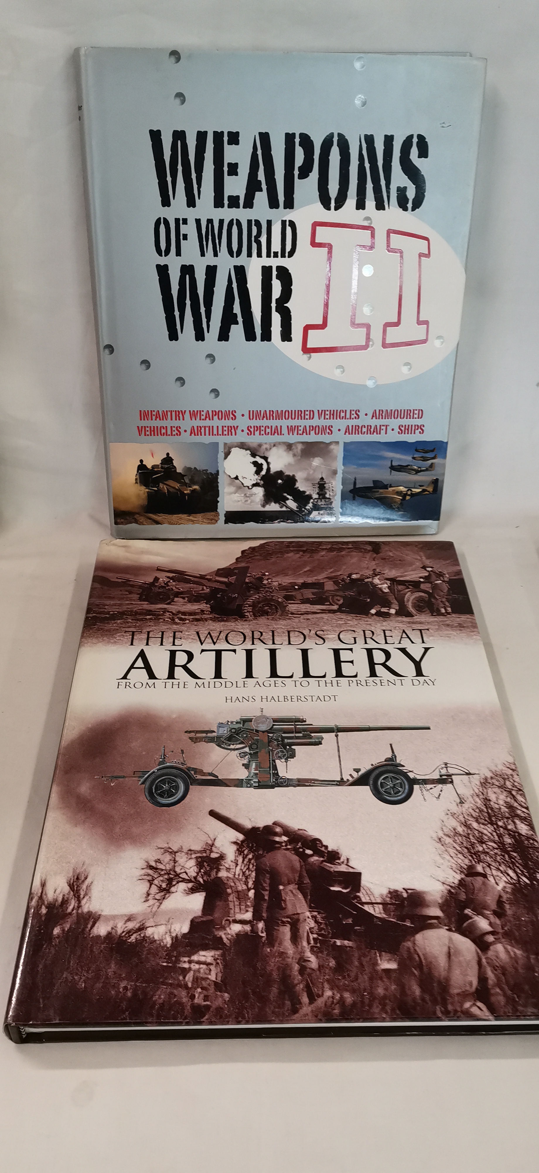 A collection of hardcover volumes relating to the history of warfare and firearms. The group includes Weapons of War by Chris Cook and John Stevenson; The World’s Great Artillery from the Middle Ages to the Present Day by Hans Halberstadt; War and Weapons from the New Horizon Library series; The World’s Finest Sporting Guns; and Weapons of World War II. The volumes are quarto to small folio in size and are bound in publisher’s cloth or pictorial boards with original dust jackets. The contents feature extensive illustrations, including colour plates and historical photographs detailing infantry weapons, armoured vehicles, artillery, and sporting guns.