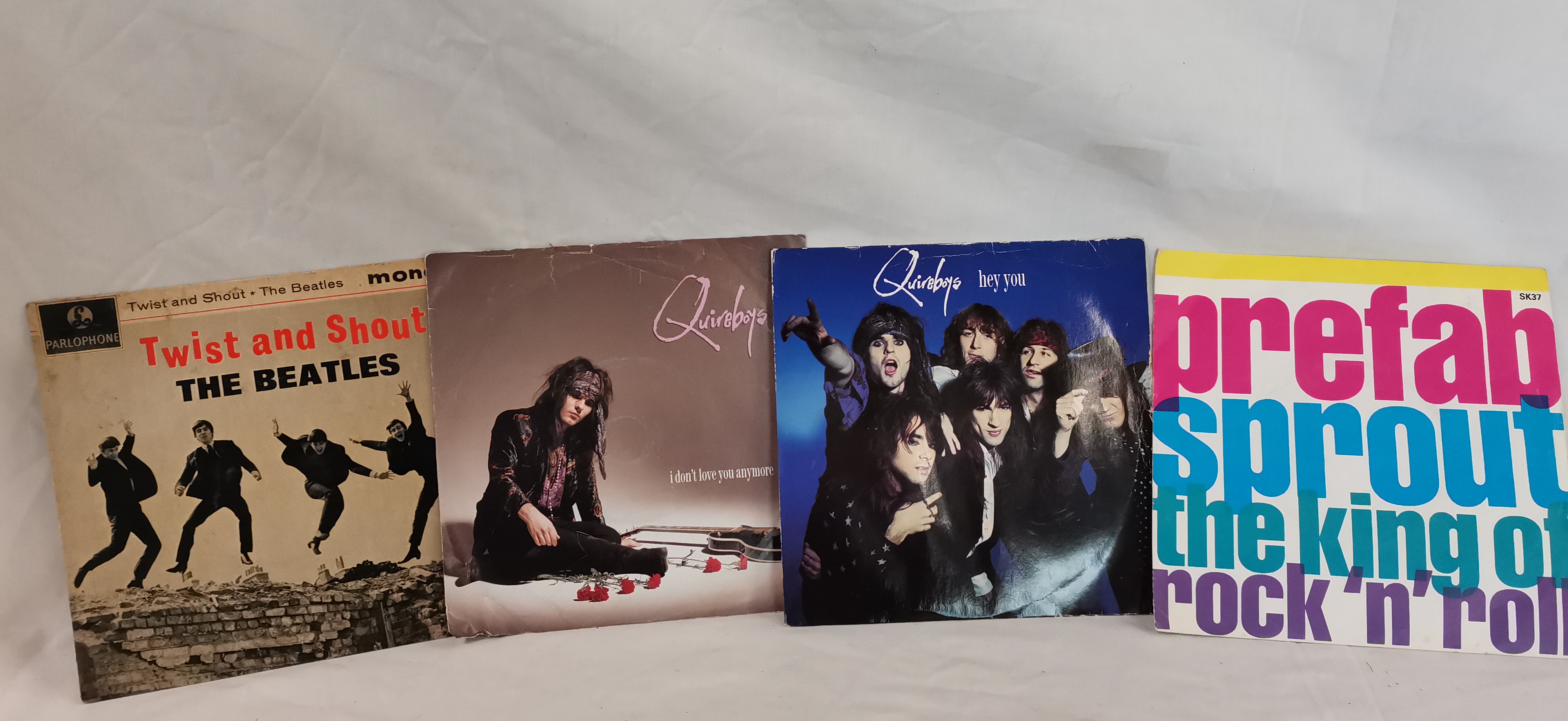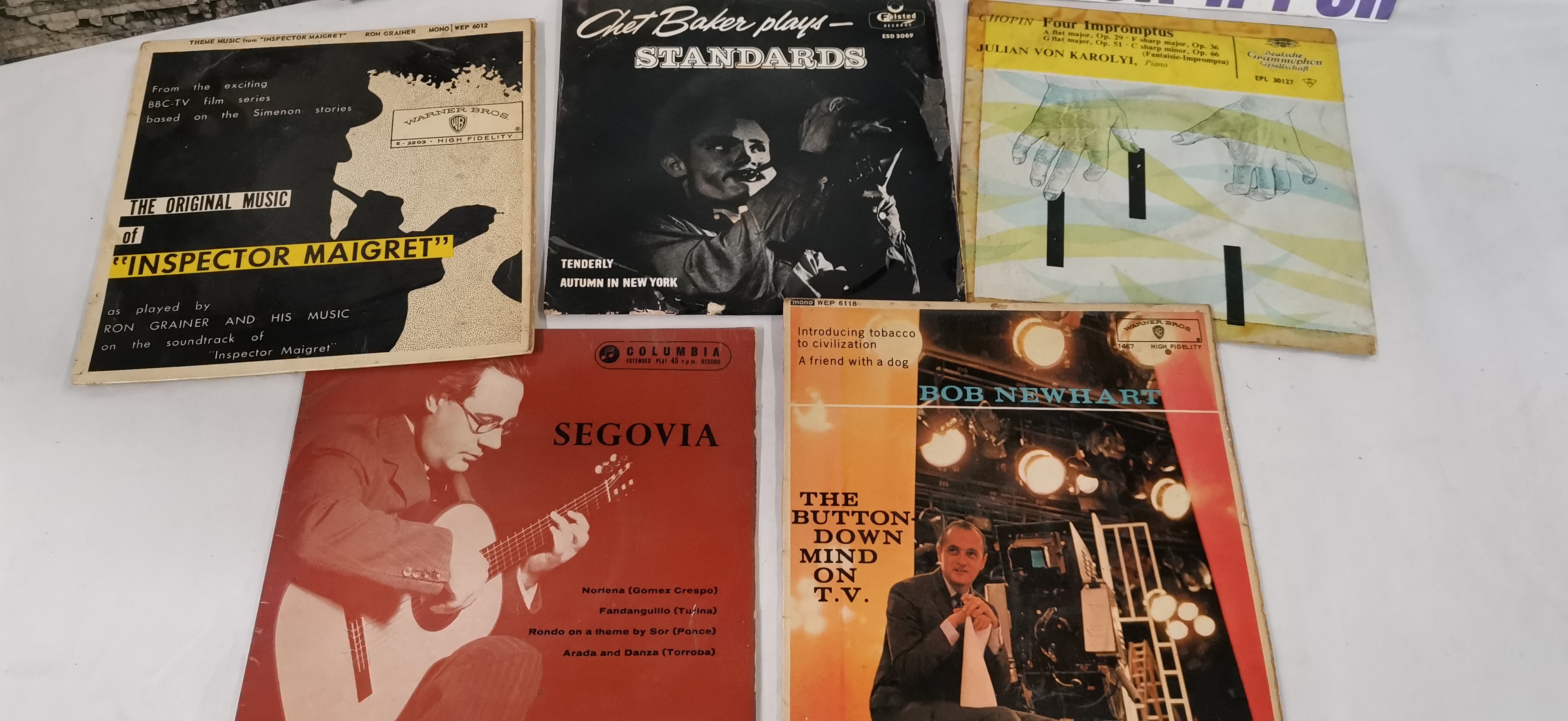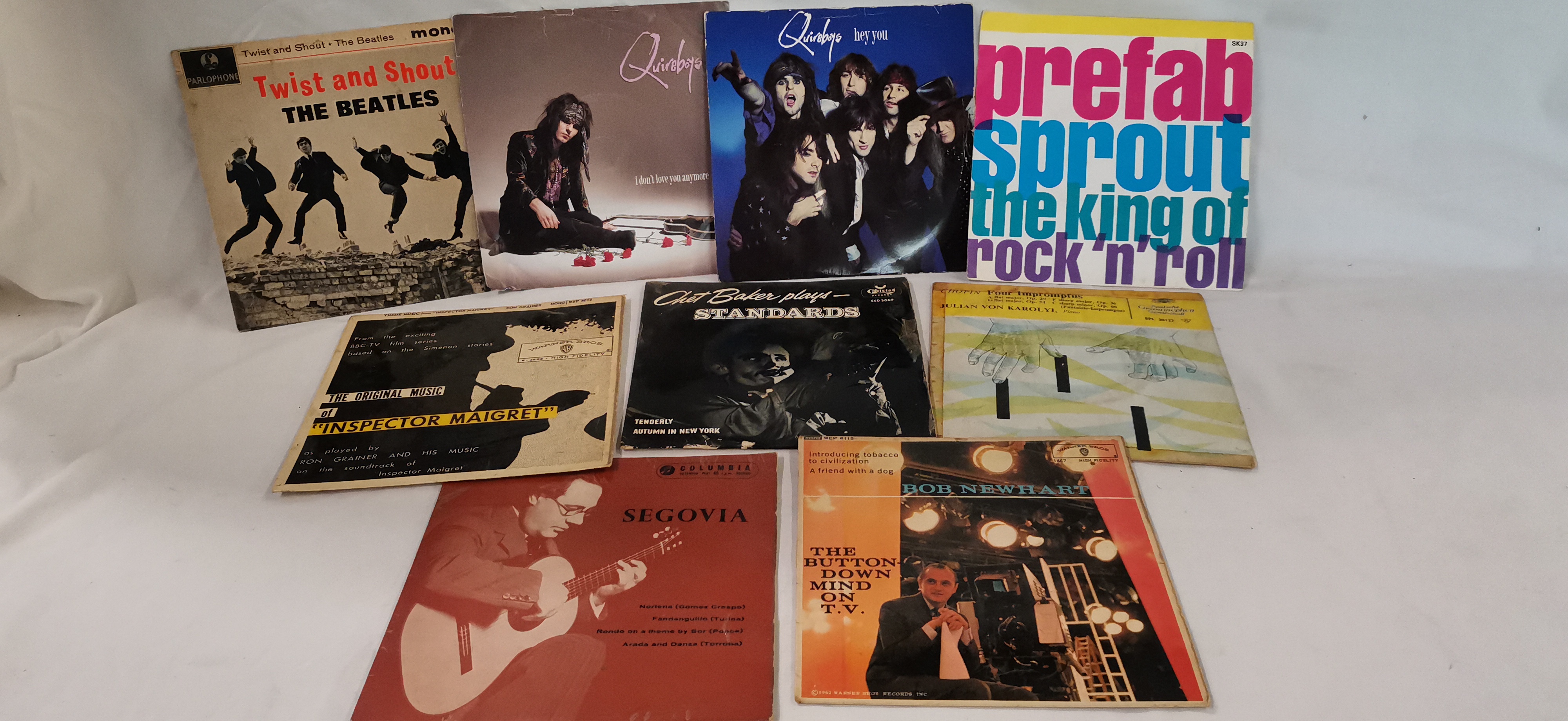 A collection of 9 vinyl records comprising a selection of 7-inch singles and Extended Play (EP) records across various genres including rock, pop, jazz, classical, and comedy. The lot consists of United Kingdom pressings on various labels. Featured items include The Beatles, Twist and Shout, UK mono EP on the Parlophone label (GEP 8882) with a sleeve featuring the Dezo Hoffmann photograph. Also included are two 7-inch singles by The Quireboys titled I Don’t Love You Anymore and Hey You, both on the Parlophone label. Prefab Sprout is represented by the 7-inch single The King of Rock ‘n’ Roll on Kitchenware Records, catalogue number SK37. Jazz and classical items include Chet Baker plays Standards on the Felsted label (ESD 3069), Segovia on the Columbia label, and Julian Von Karolyi performing Chopin: Four Impromptus on the Deutsche Grammophon Gesellschaft label (EPL 30127). The collection is completed by two Warner Bros. EPs: Ron Grainer and His Music, The Original Music of Inspector Maigret (WEP 6012) and Bob Newhart, The Button-Down Mind on T.V. (WEP 6118).