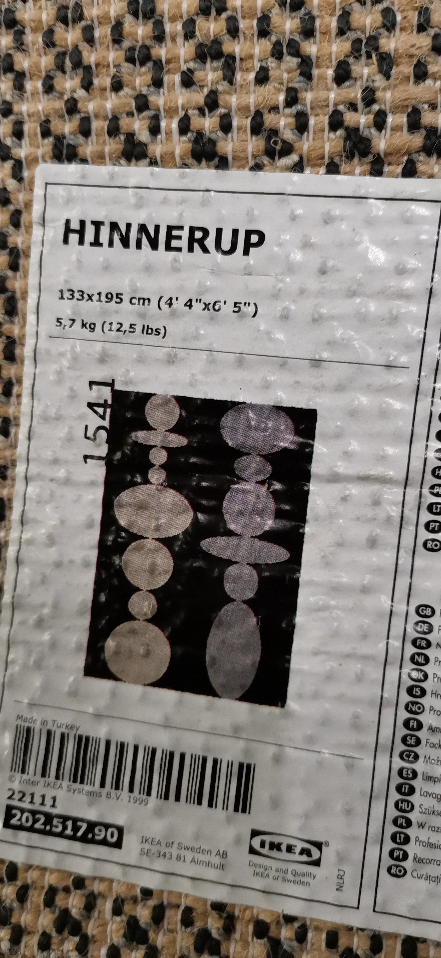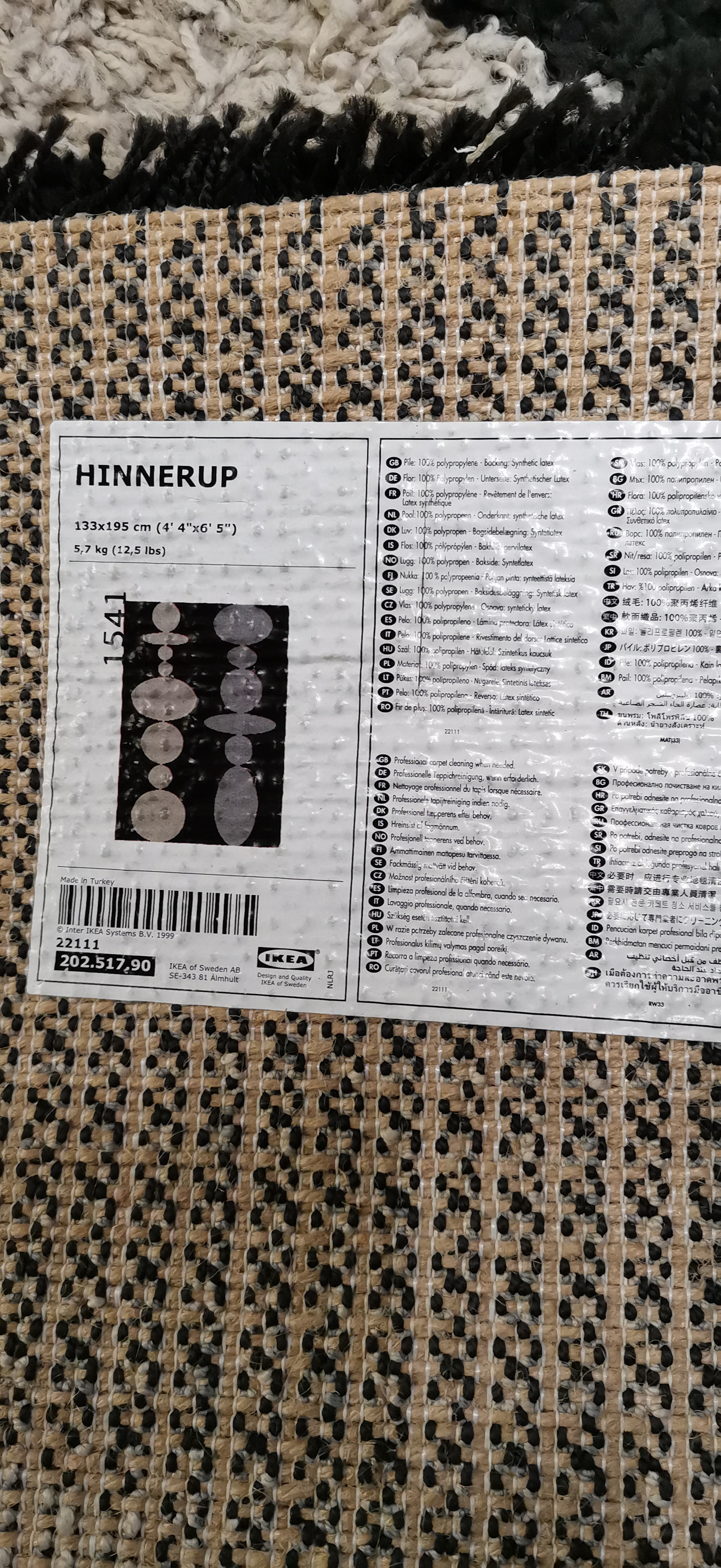 An IKEA Hinnerup model area rug featuring a modern abstract design. The pattern consists of two vertical columns of connected organic, circular, and oval shapes in light grey and off-white, set against a solid black ground. The rug is constructed with a 100% polypropylene pile and a synthetic latex backing. It was manufactured in Turkey and retains the original manufacturer label on the reverse, which includes the model name, model number 202.517.90, and the IKEA of Sweden AB branding. The label also indicates a copyright date of 1999 for the design system.