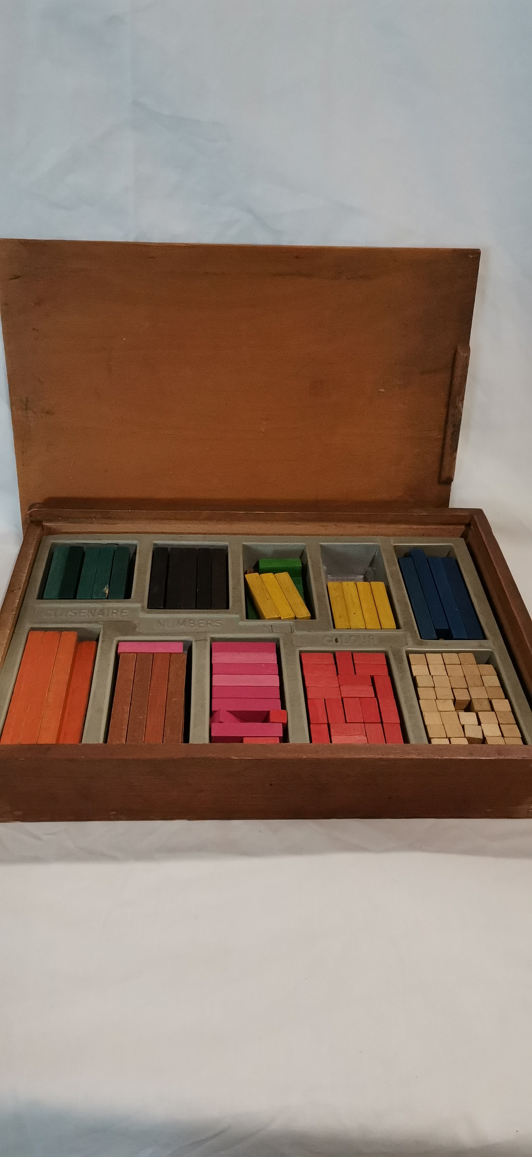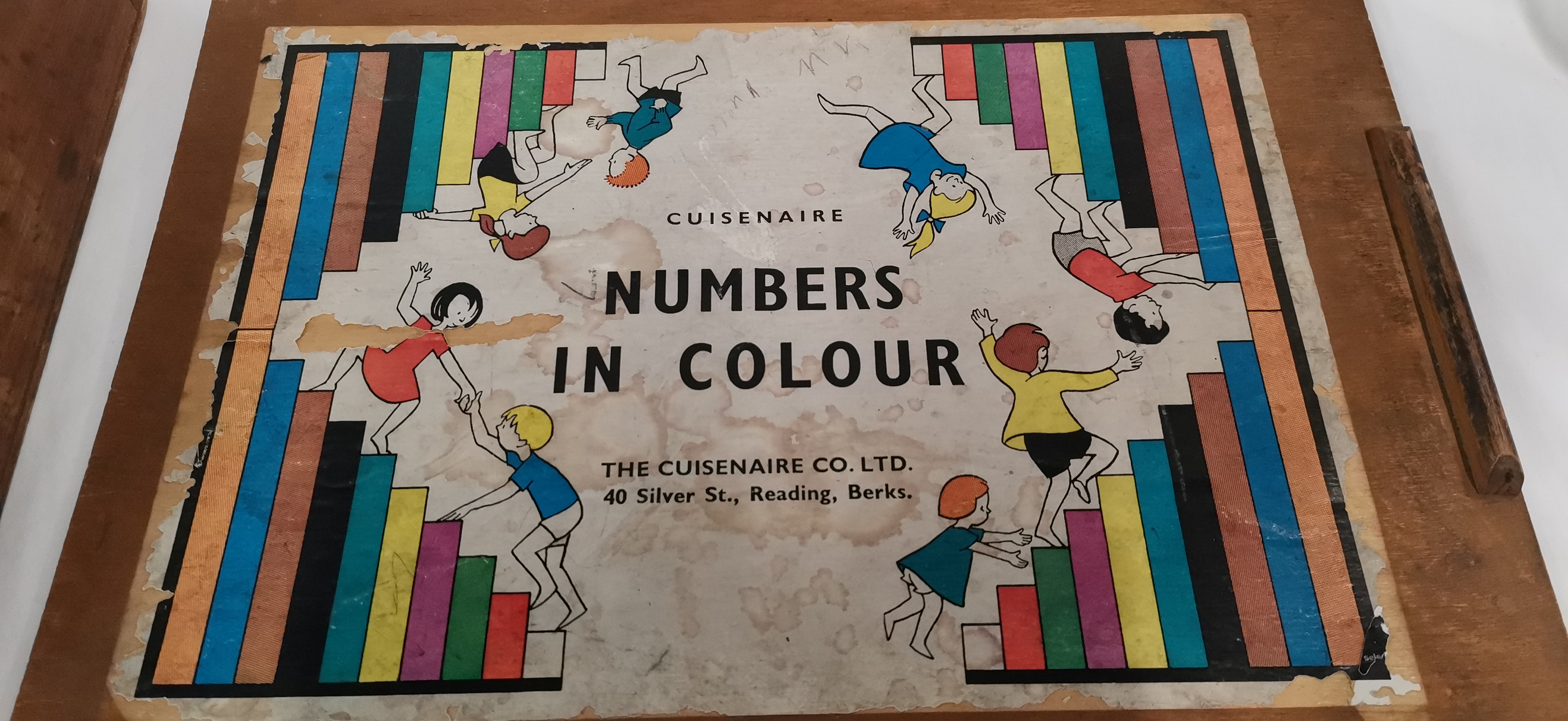 A vintage Cuisenaire Numbers in Colour mathematics teaching aid produced by The Cuisenaire Co. Ltd. of 40 Silver St., Reading, Berkshire. The set is housed in a rectangular wooden box with a sliding lid. The interior contains a collection of painted wooden rods in ten varying lengths and colours, including small natural wood cubes and rods in red, pink, brown, orange, blue, yellow, black, and green. The rods are organised within a moulded grey interior tray embossed with the text CUISENAIRE NUMBERS IN COLOUR. The underside of the lid features an illustrated paper label with the set title and manufacturer details, depicting children using the rods. The construction consists of a timber box with a composite or plastic insert and painted wooden components.