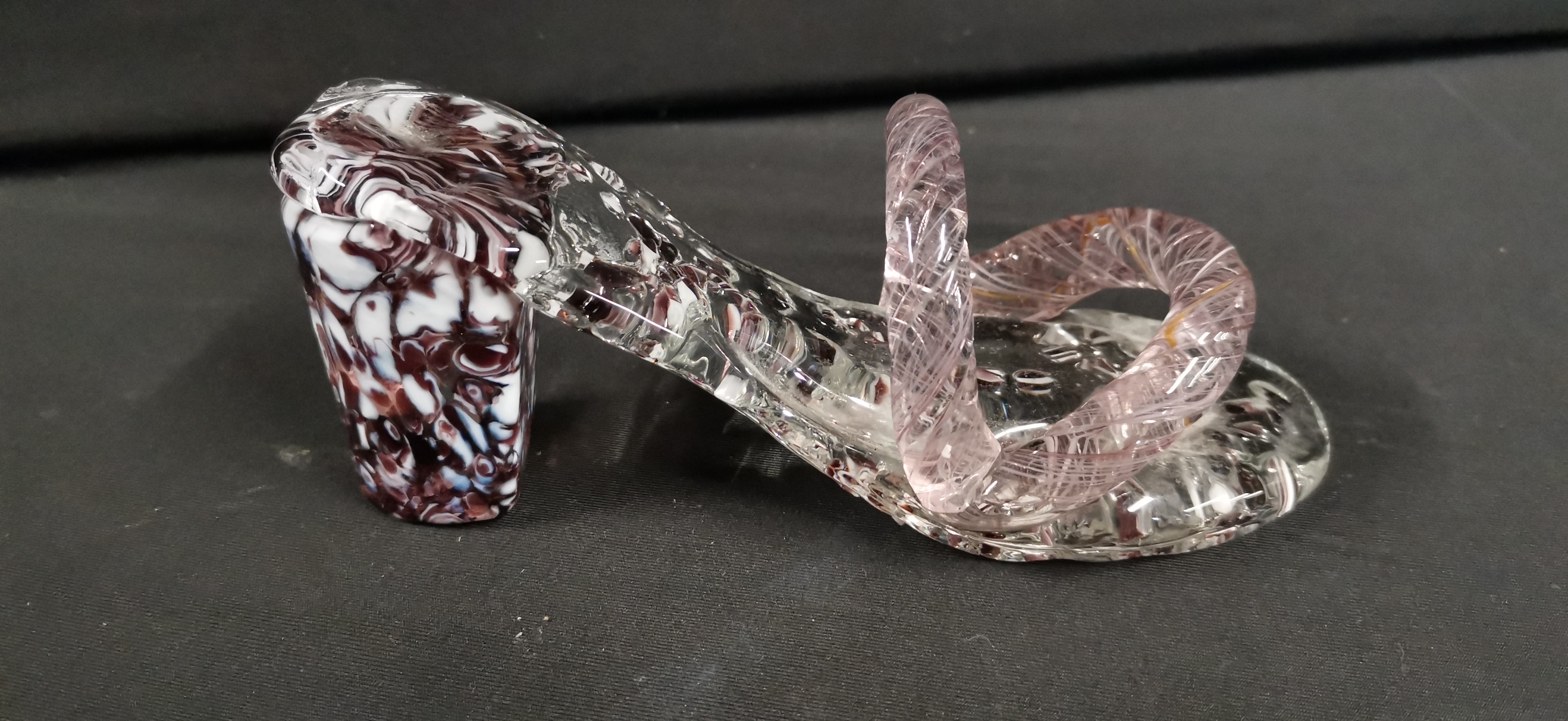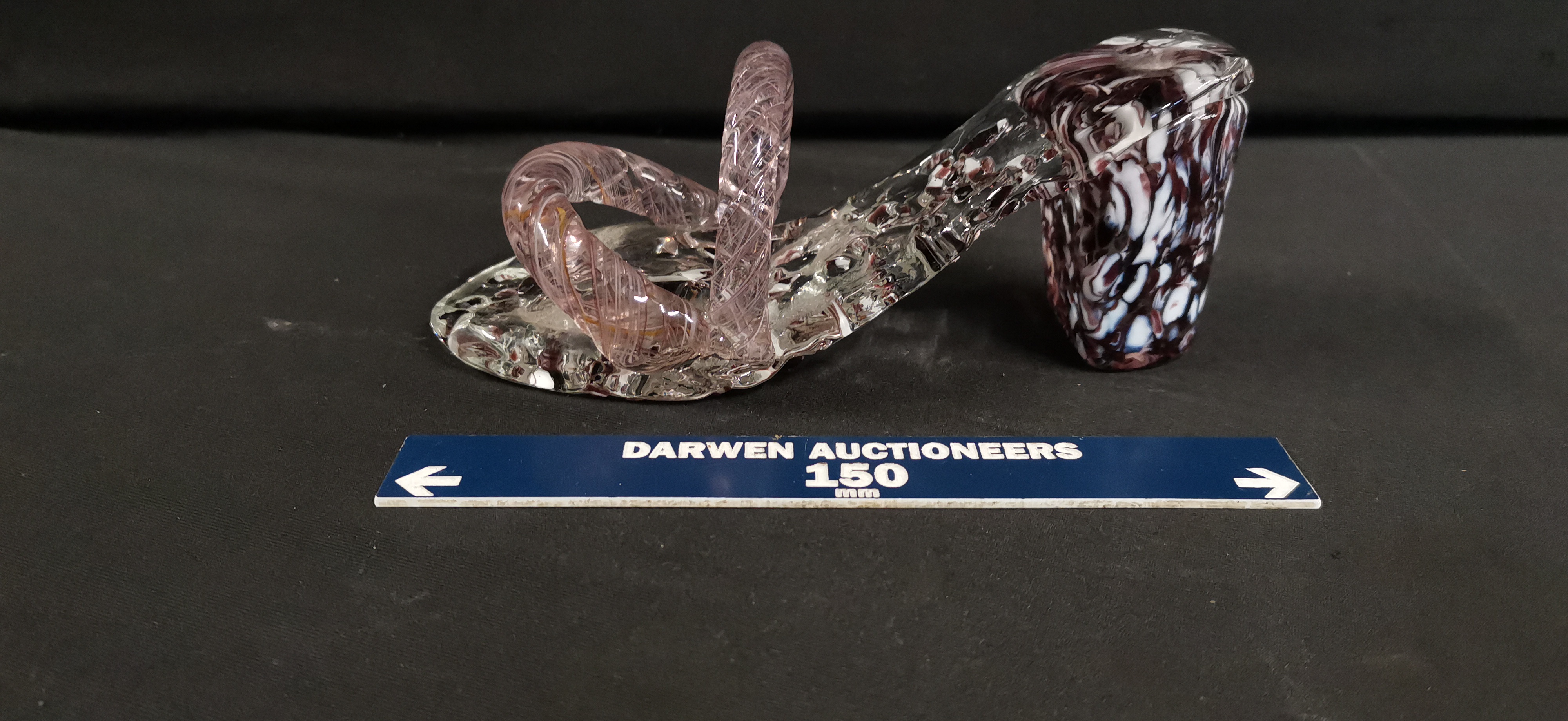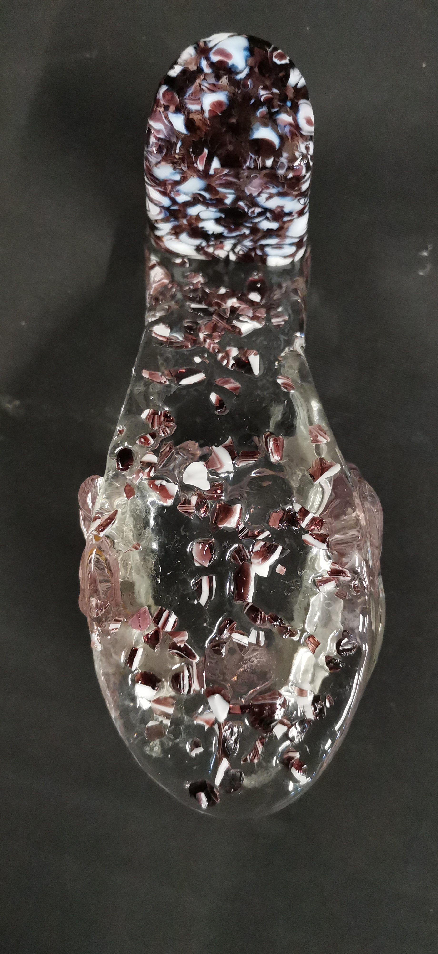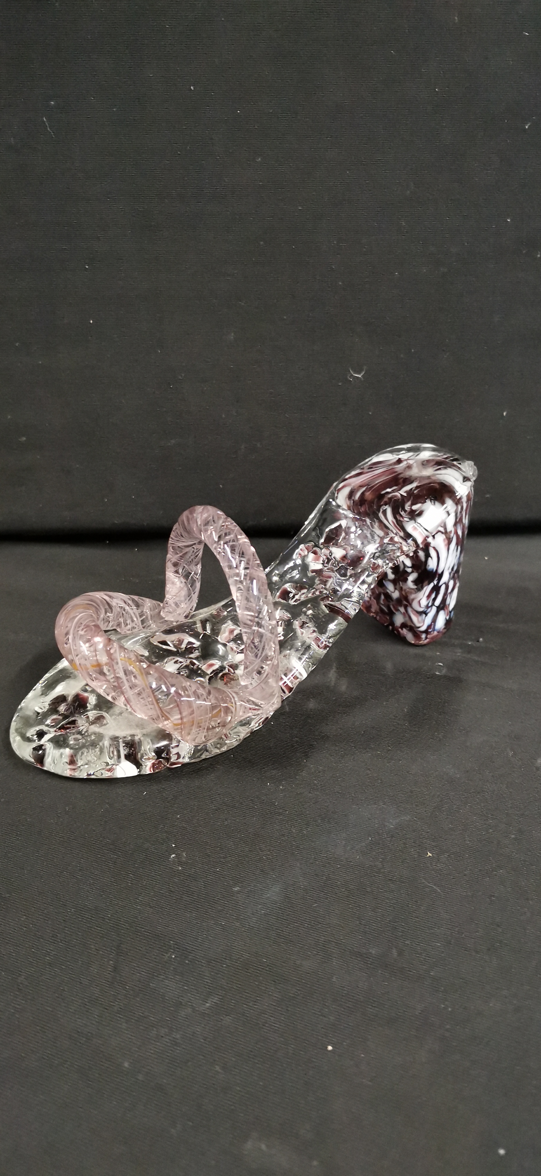 A decorative high-heeled sandal fashioned from hand-blown and worked art glass, created in the Murano style. The clear glass body incorporates internal decoration, with the sole and chunky heel featuring embedded polychrome glass frit in shades of deep plum and white. The straps are formed from twisted glass canes containing internal pink and white zanfirico latticinio threads. The piece exhibits characteristic tool marks and minor internal air bubbles from the manual forming process. No maker’s marks, signatures, or factory labels are visible.