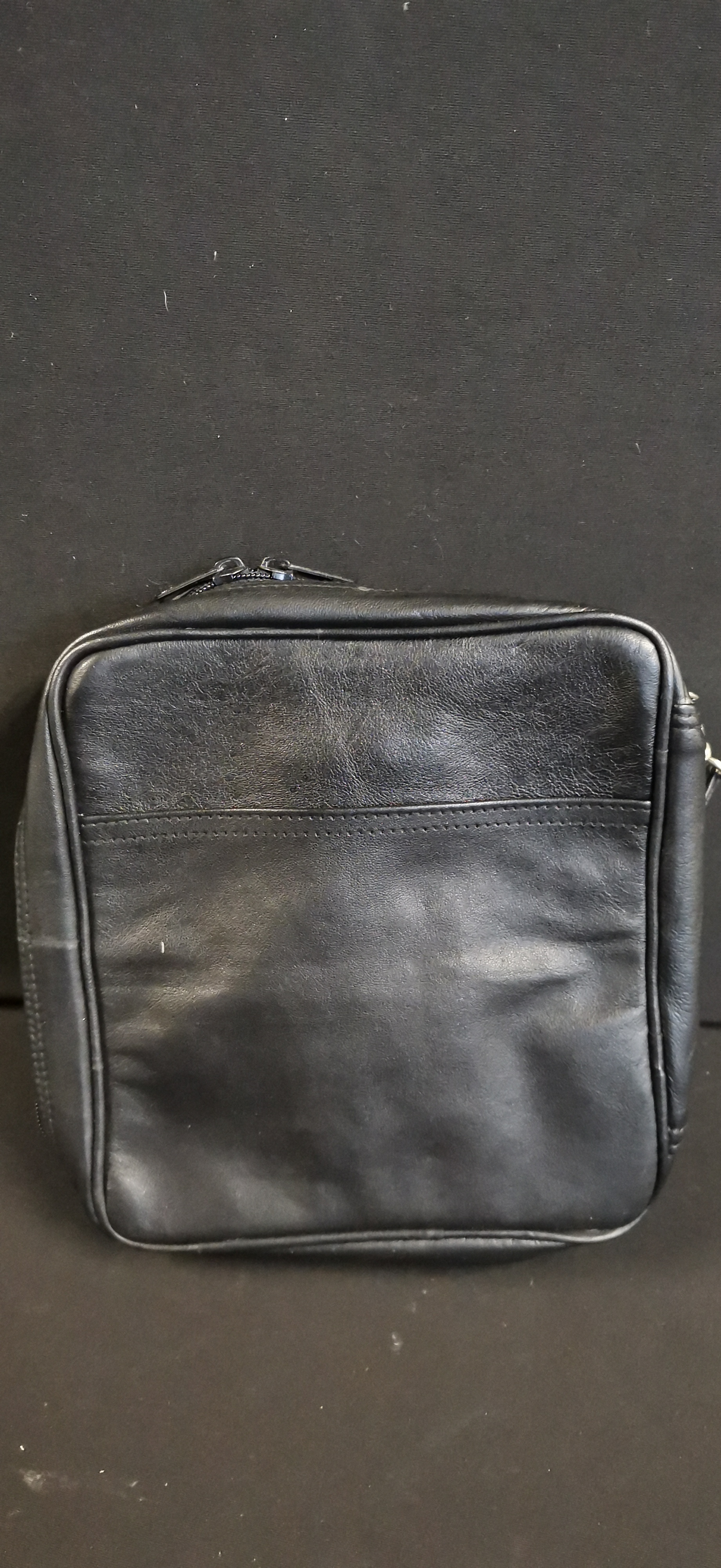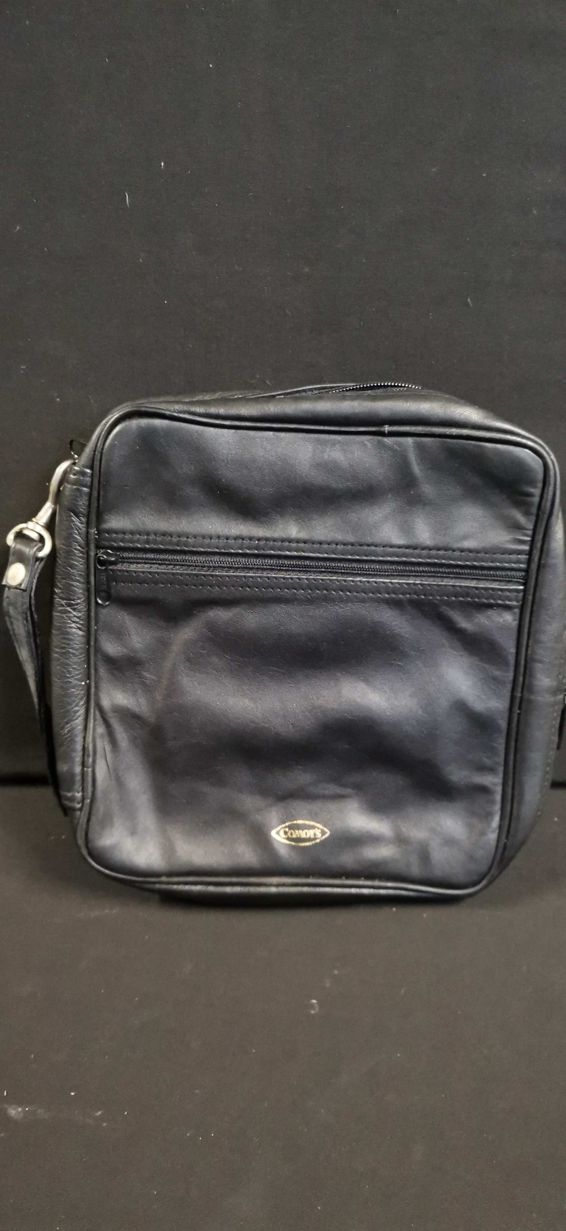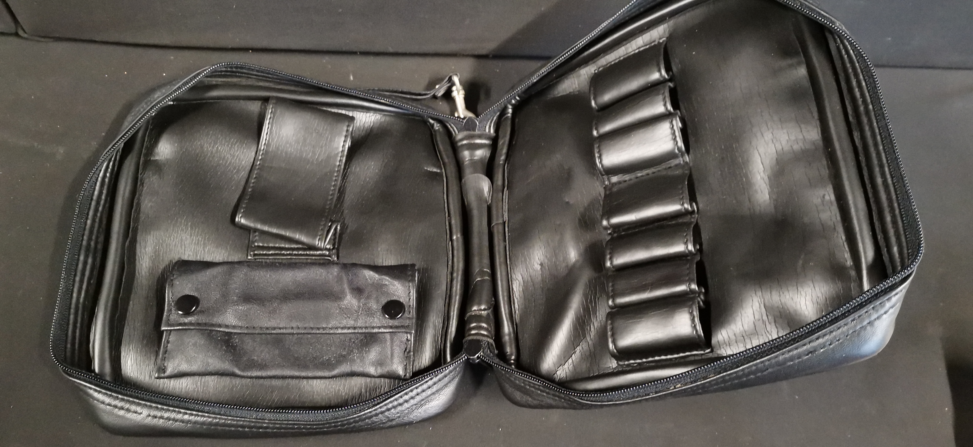 A professional-grade pipe smoker’s travel organiser bag by Comoy’s of London. The exterior is constructed from supple black leather and features a front-facing zipped compartment and a rear slip pocket. The main body is accessed via a wrap-around double zip, allowing the case to open flat. The interior is lined with a black synthetic grained material. The right side contains five leather loops designed for the secure storage of tobacco pipes. The left side features a horizontal pouch secured by two black metal snap fasteners, alongside a wide vertical leather loop for tools or cleaners. The item includes a detachable leather wrist strap with a silver-toned metal swivel clasp. The lower front of the exterior is gold-stamped with the Comoy’s oval logo.
