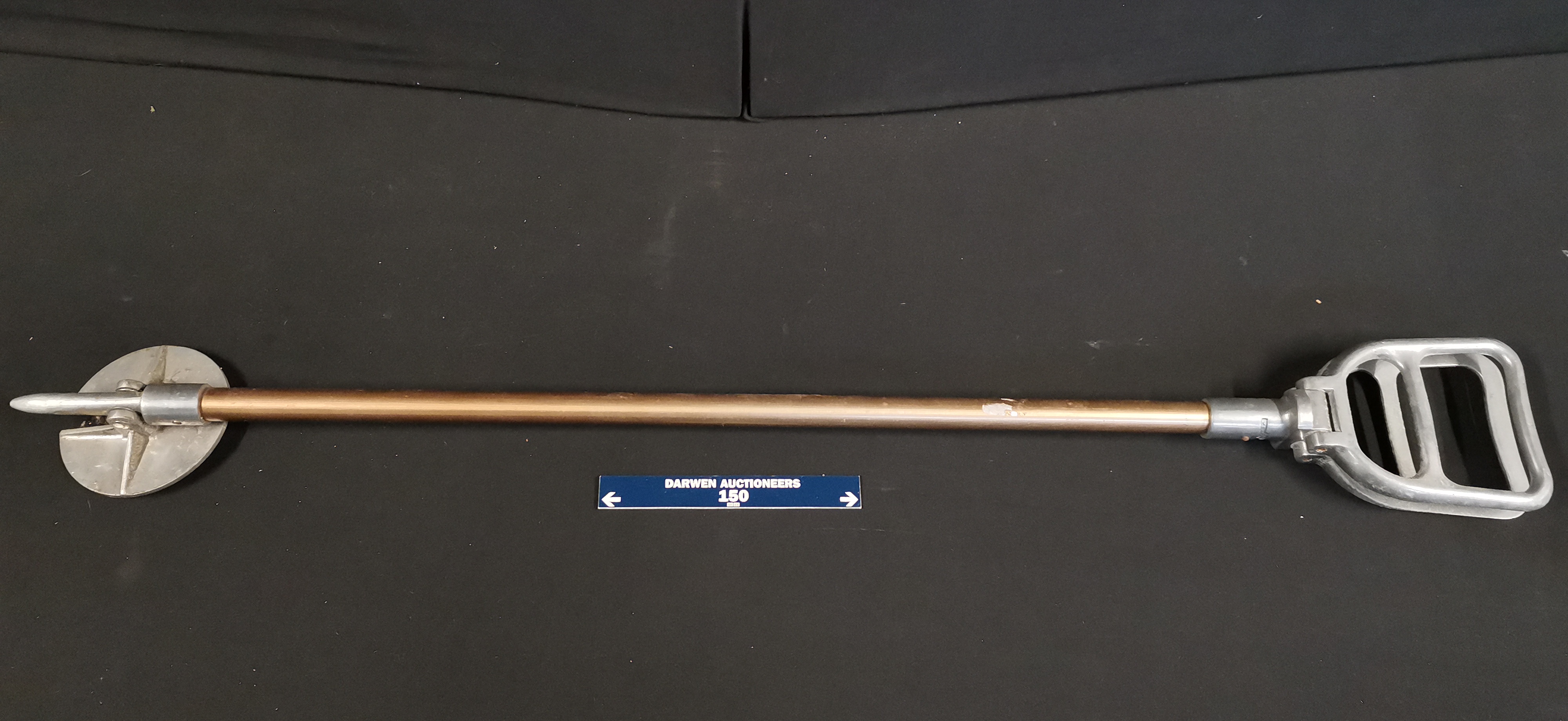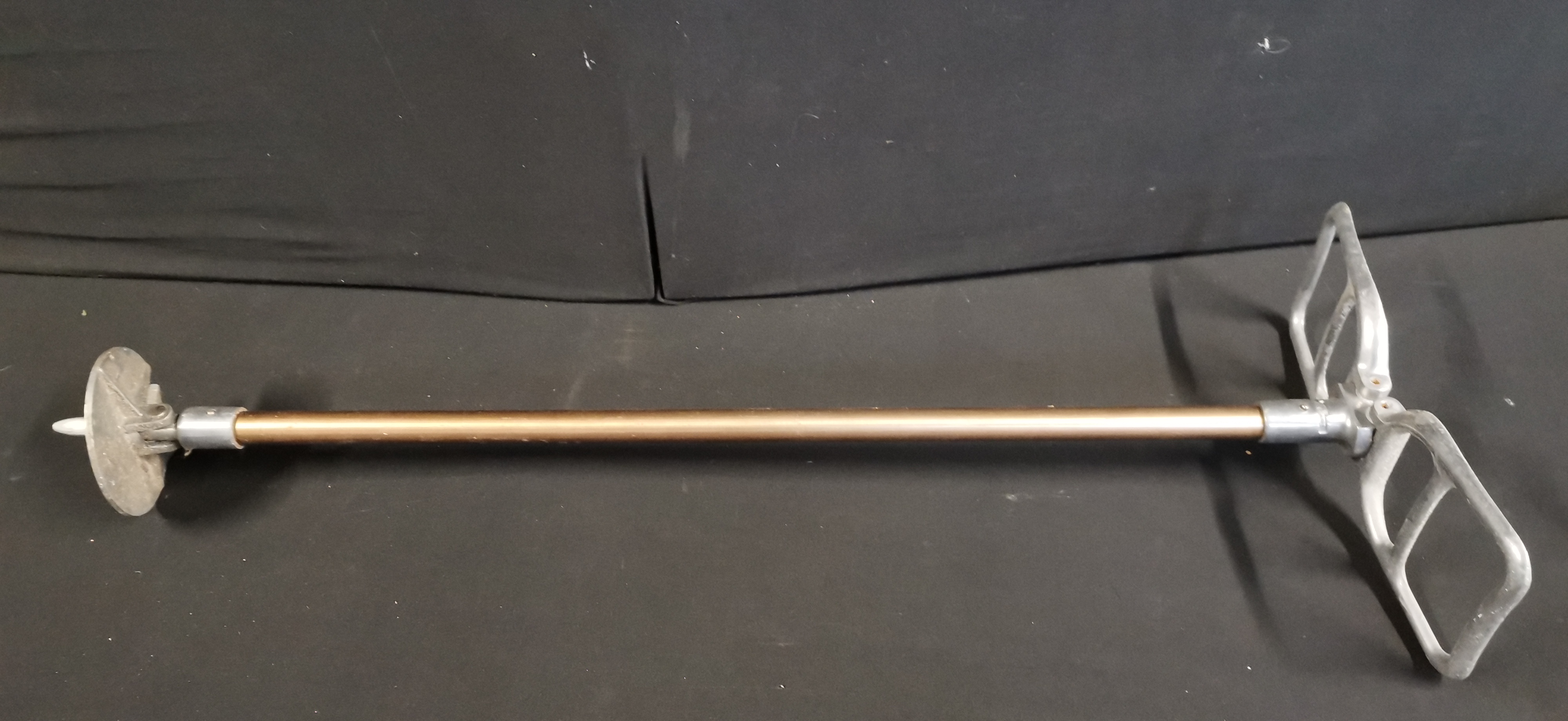 A lightweight shooting stick seat attributed to Featherwate. The construction features a central aluminium shaft with a copper-toned anodised finish. The upper section is fitted with two hinged, D-shaped cast aluminium handles that fold outwards to form a seat. The base of the shaft is equipped with a circular ground plate designed to prevent the stick from sinking into soft ground, terminating in a pointed metal spike. A collar near the handles is stamped with the mark PATENT PEND. There are partial remains of a white adhesive label on the shaft. This item is designed to function as both a walking aid and a portable seat for outdoor activities.