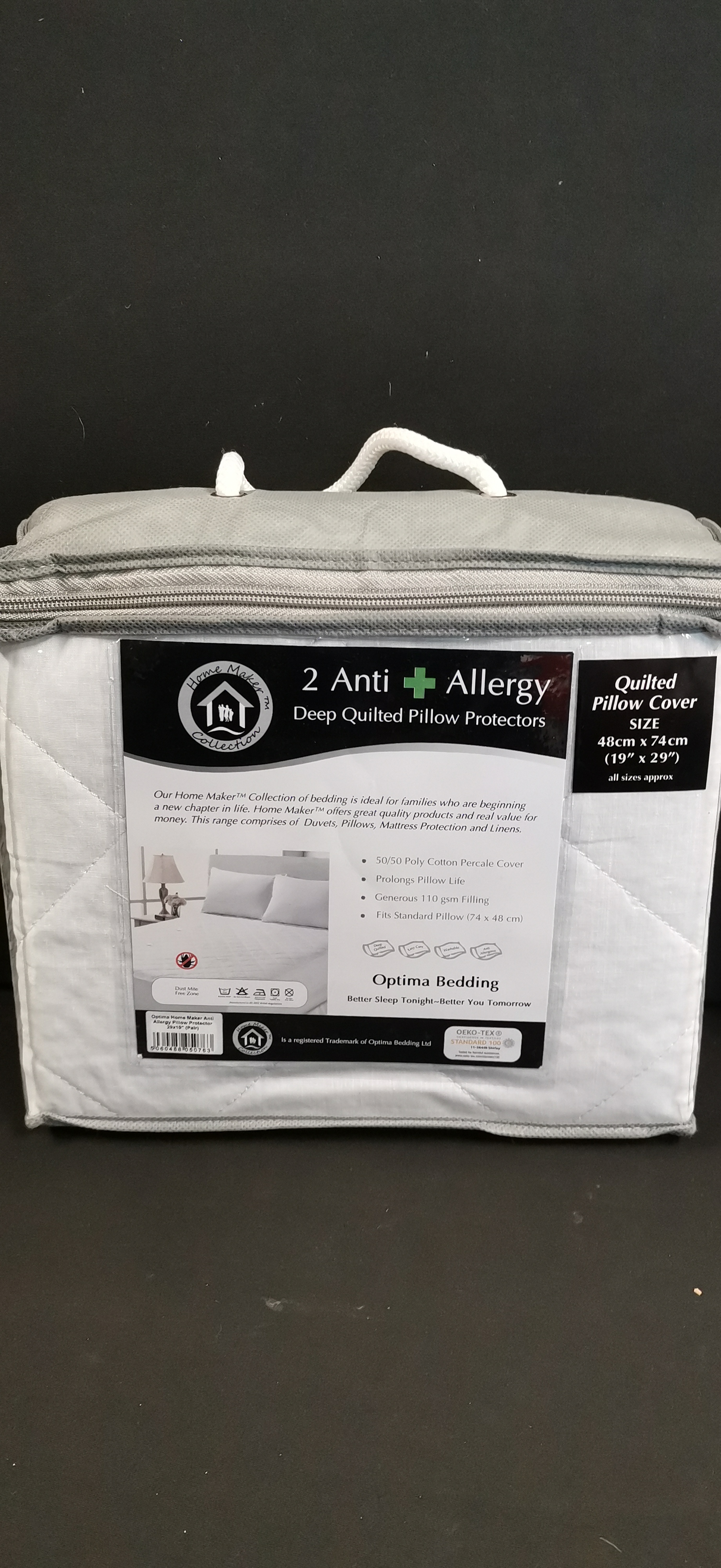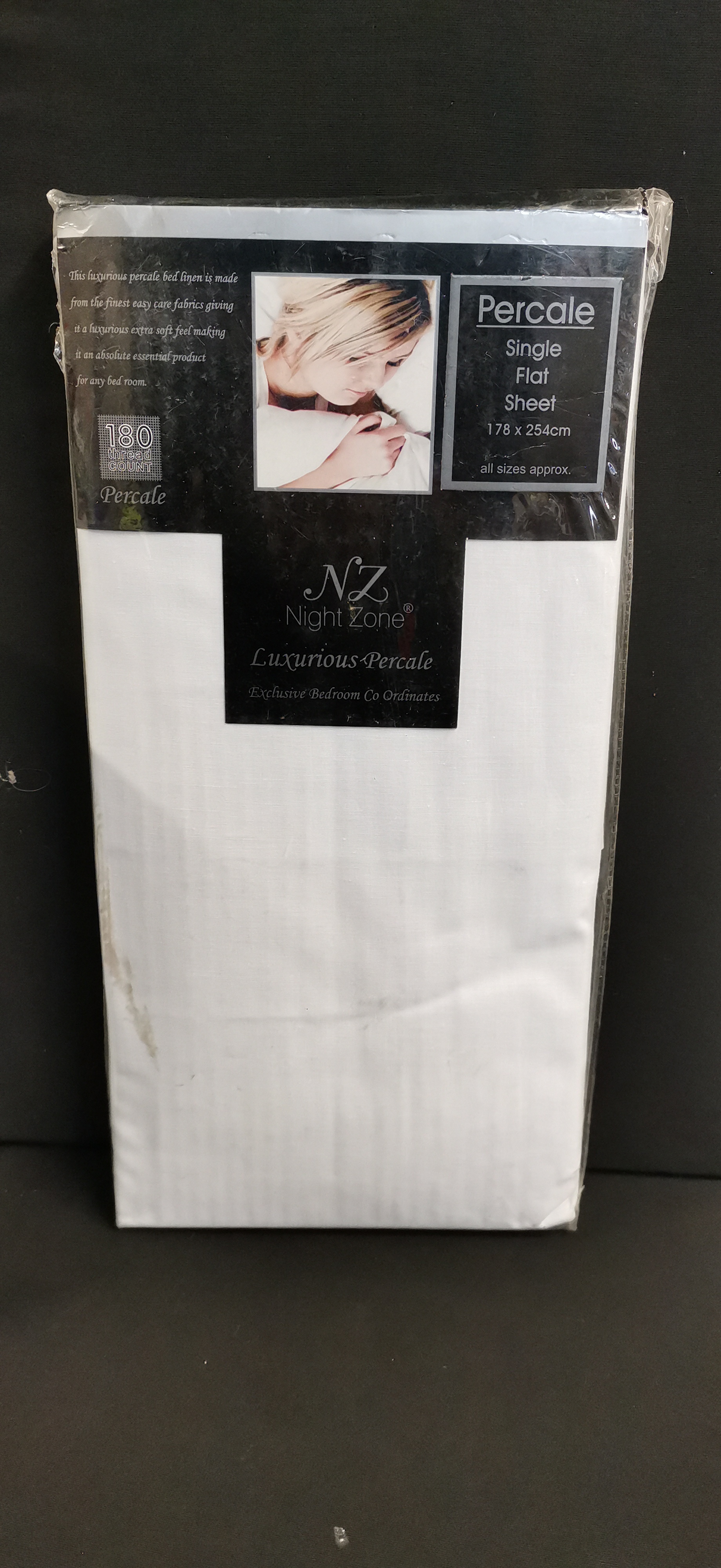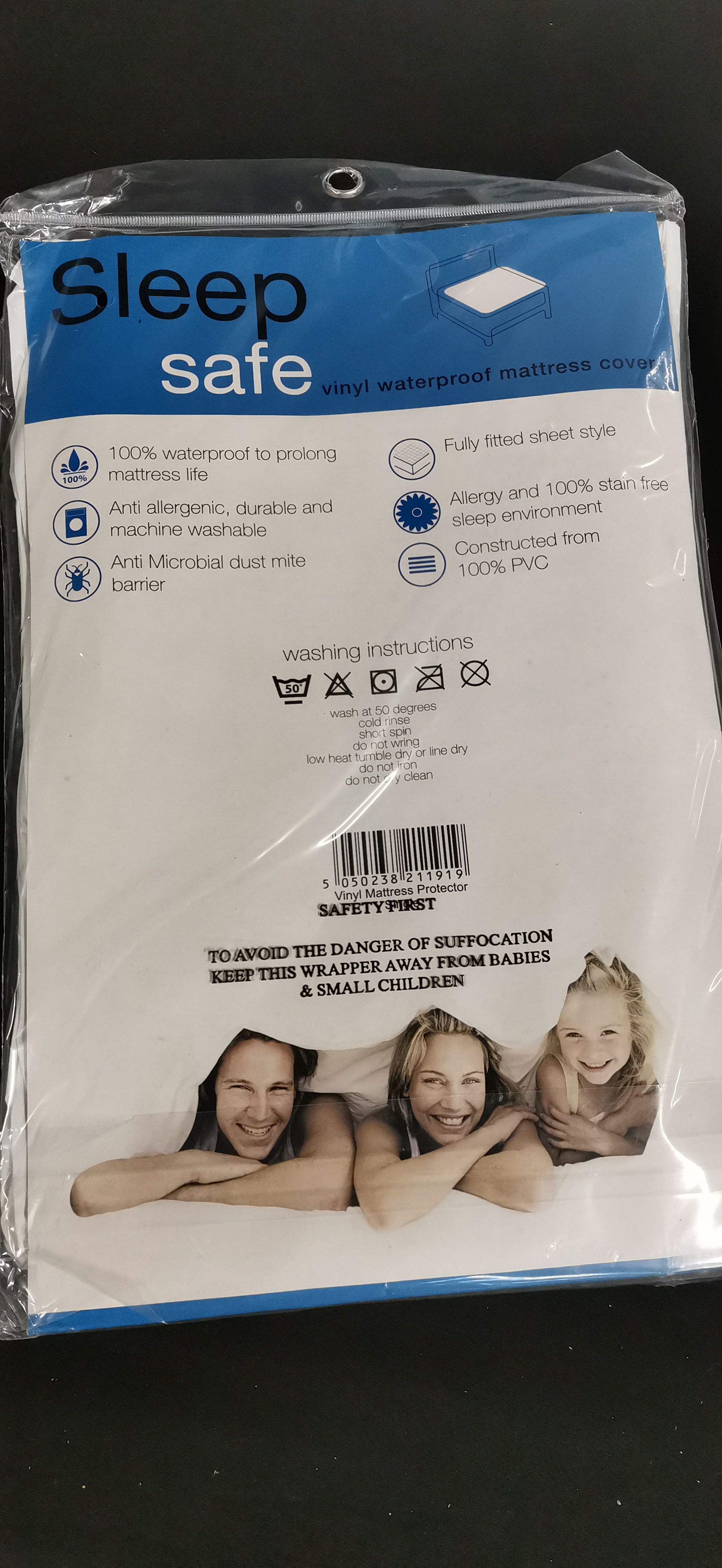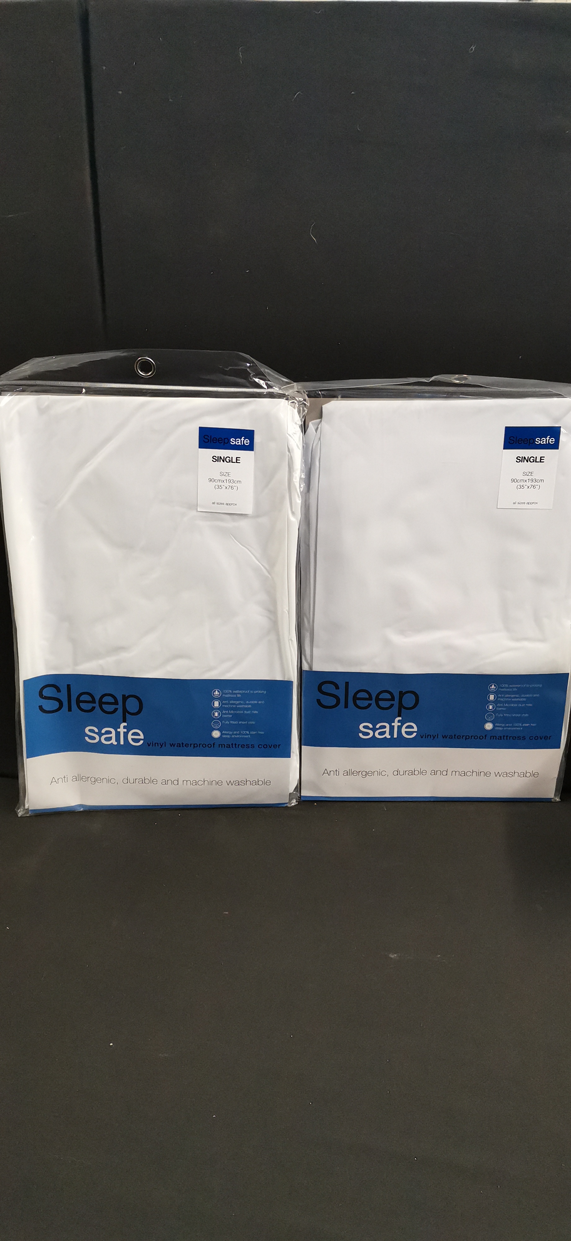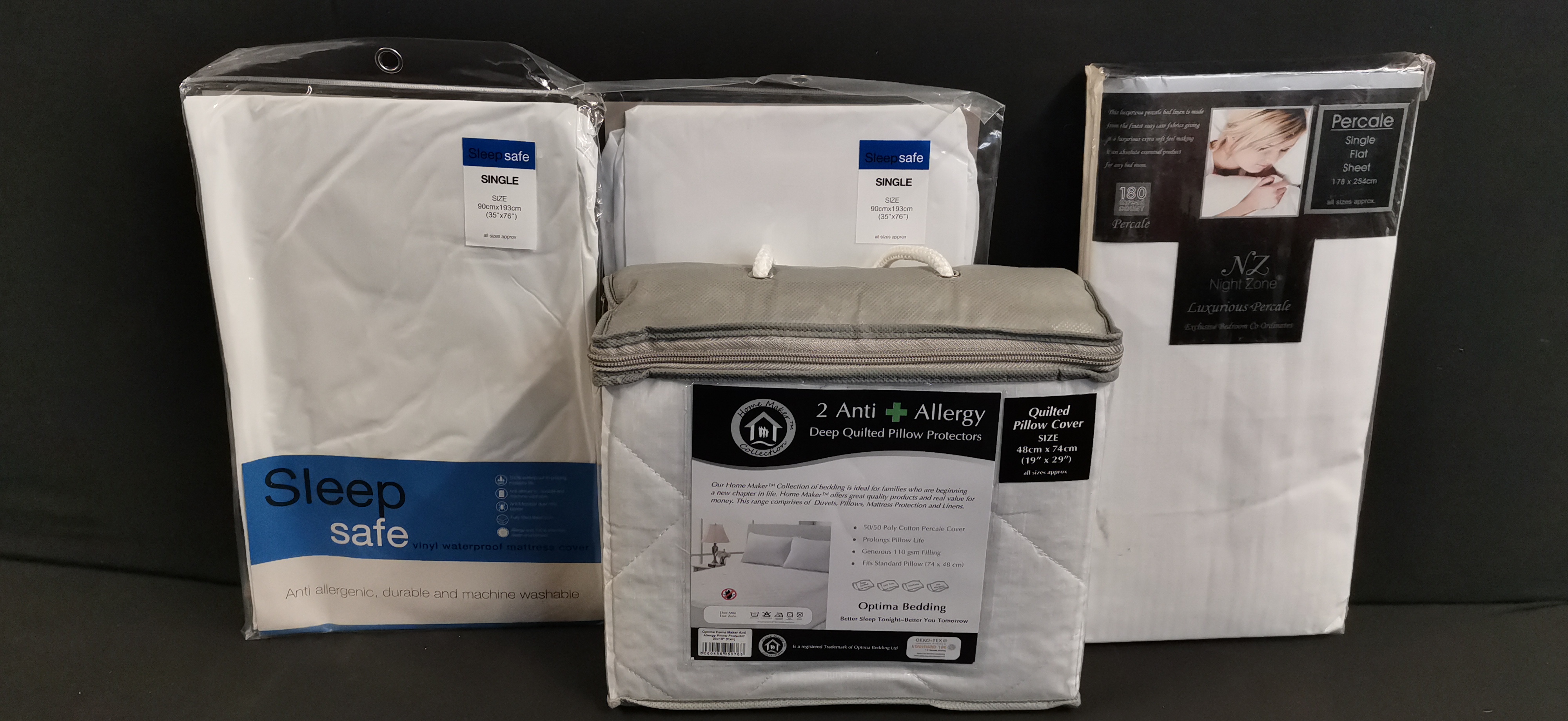 A group of four new bedding items in original retail packaging. The lot includes two Sleep safe brand vinyl waterproof mattress covers for a single bed, constructed from 100% PVC with anti-allergenic and anti-microbial properties. Also included is a zippered pack from the Optima Bedding Home Maker Collection containing two anti-allergy deep quilted pillow protectors featuring a 50/50 poly cotton percale cover and 110 gsm filling. The collection is completed by a Night Zone Luxurious Percale single flat sheet with a 180 thread count. All items are formatted for the UK market with metric and imperial measurements provided on the packaging.