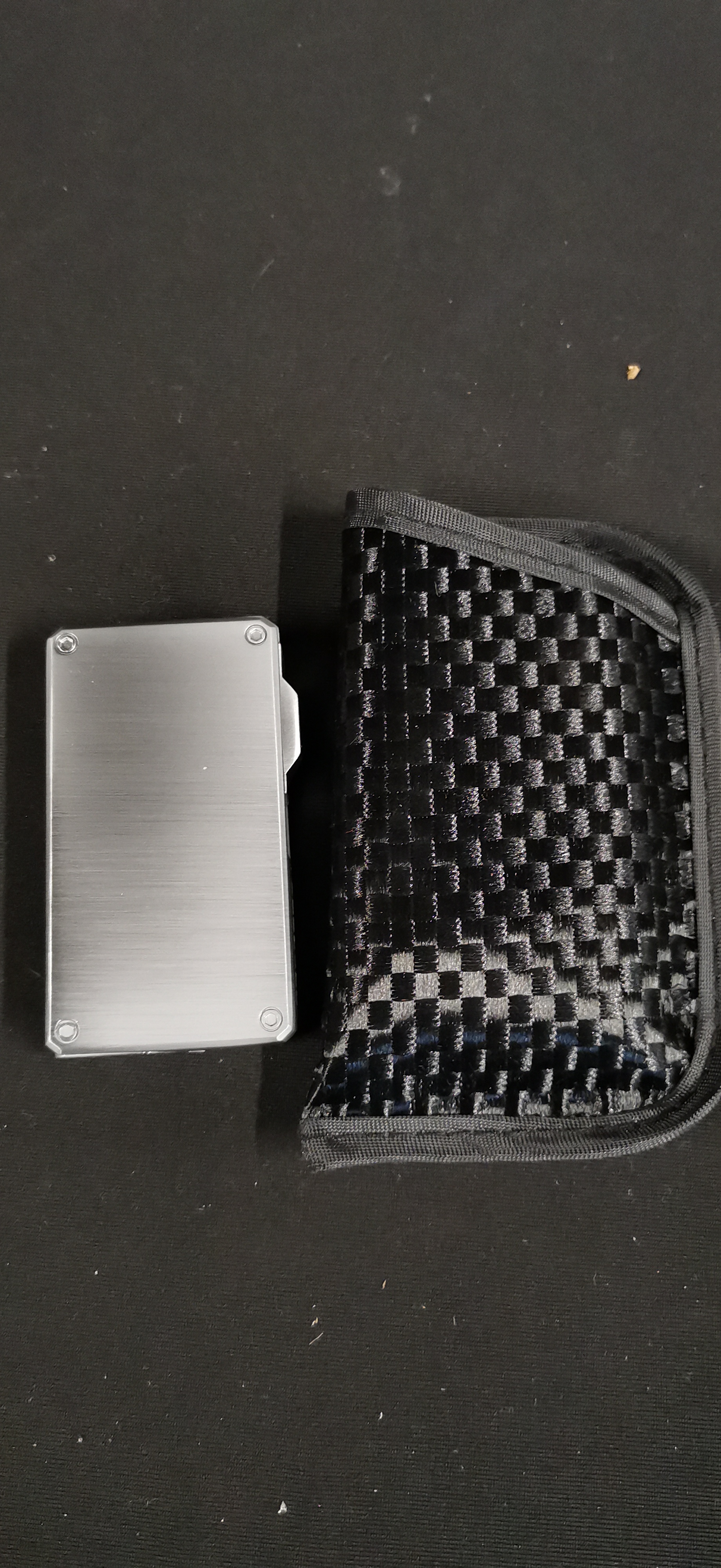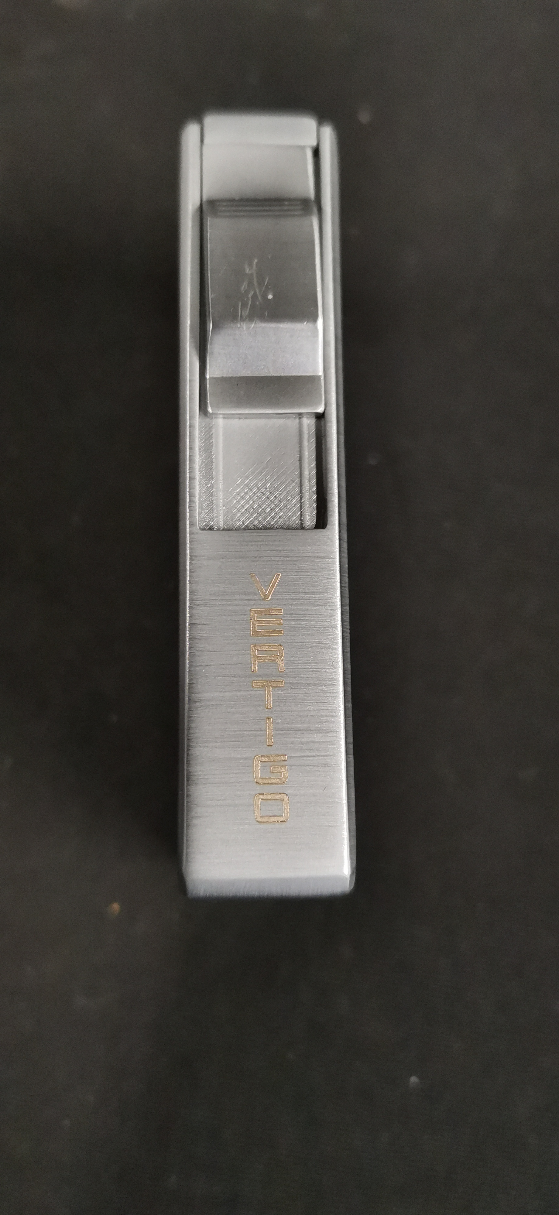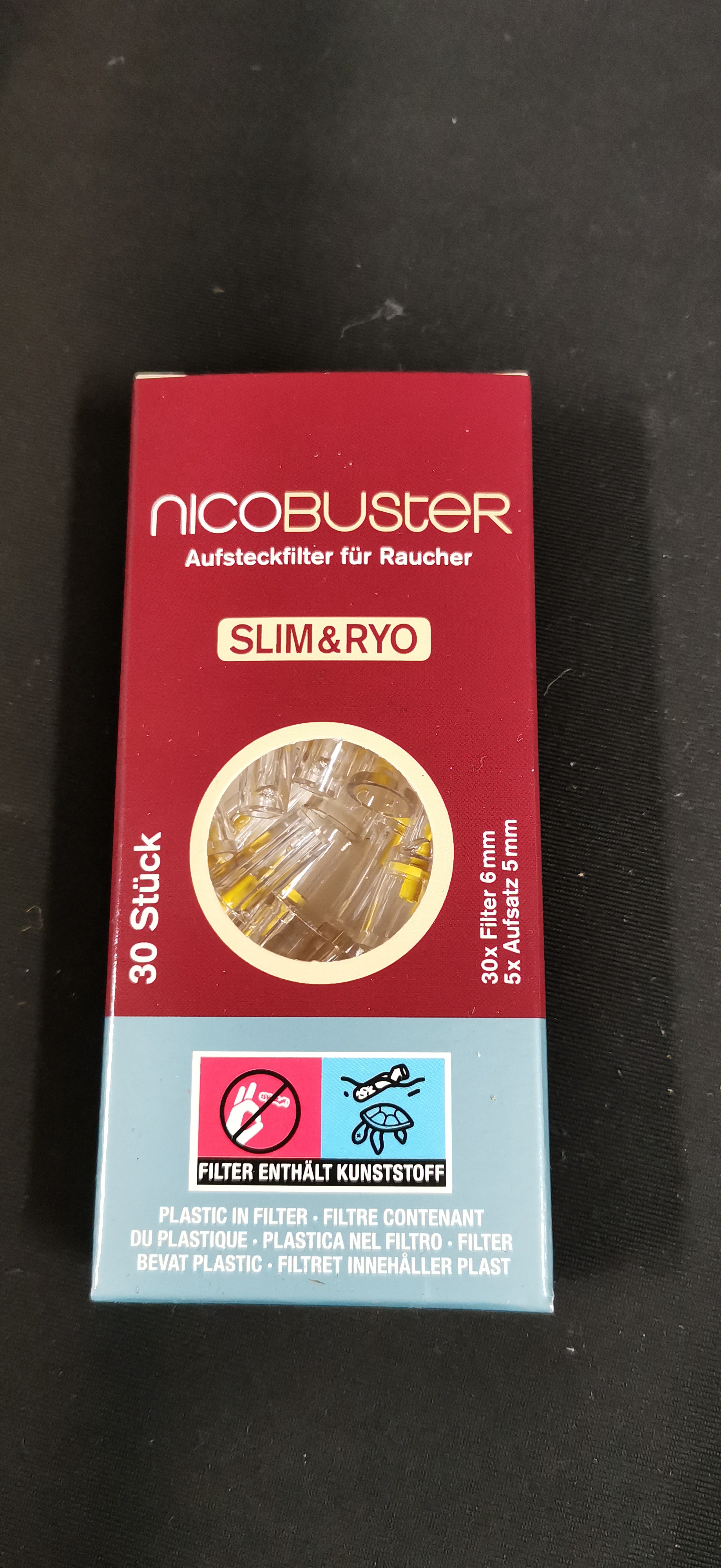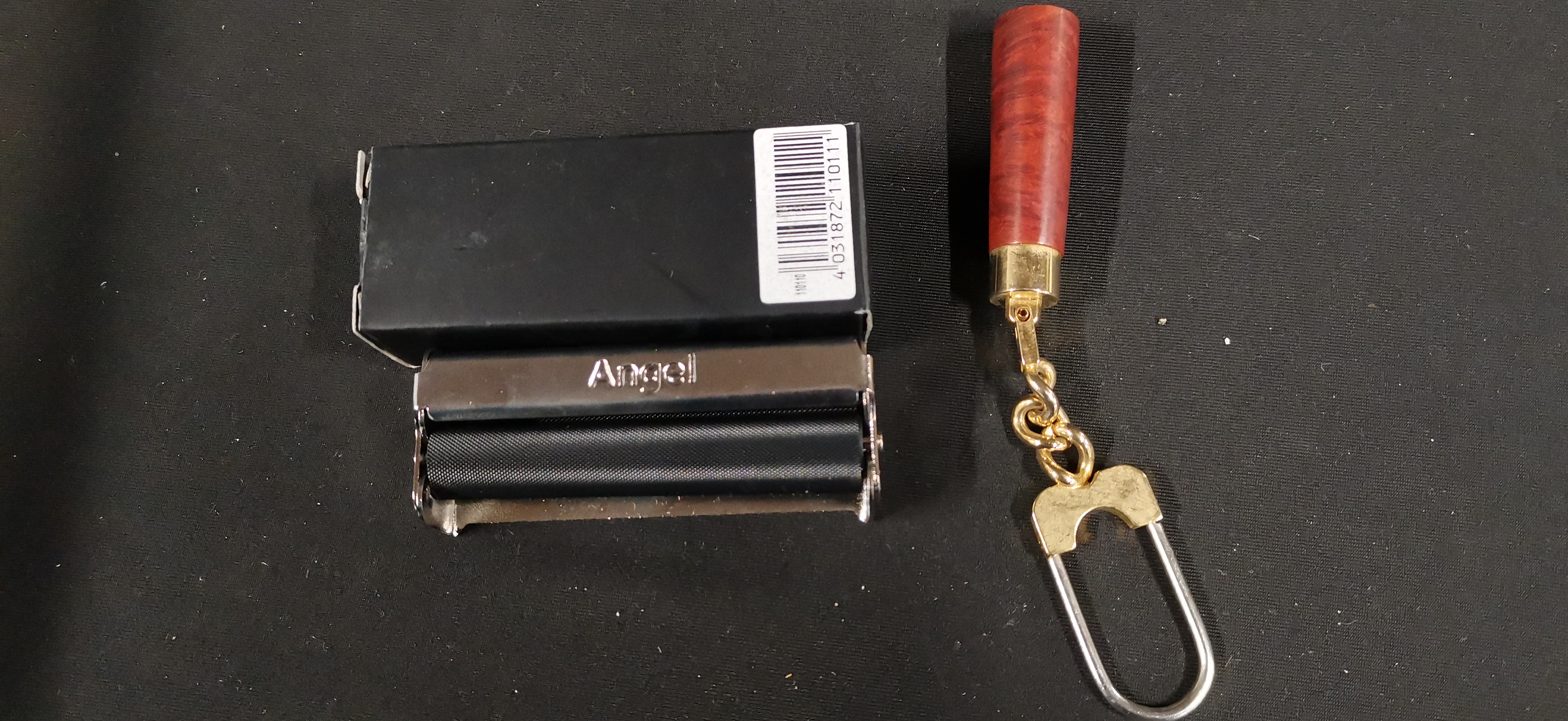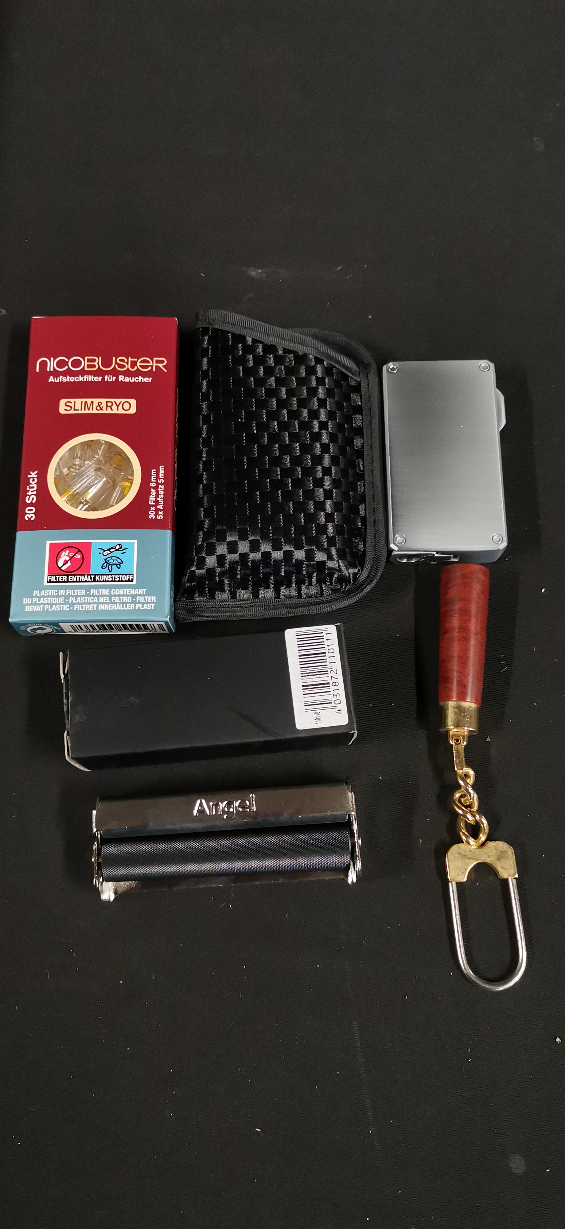 A collection of various tobacco and smoking accessories. The assortment includes a brushed metal butane lighter with the manufacturer name VERTIGO engraved vertically on the casing, paired with a black chequered-pattern fabric protective pouch. Also included is a manual metal cigarette rolling machine with the brand name Angel embossed on the frame. The collection features a retail box of NicoBuster SLIM & RYO clip-on filters, marked as containing 30 pieces with German-language text. Additionally, there is a smoking tool comprising a reddish wood-effect cylindrical handle attached via a gold-tone chain to a U-shaped metal clip. The lot is completed by a small black cardboard box bearing a barcode label (4 031872 110111).