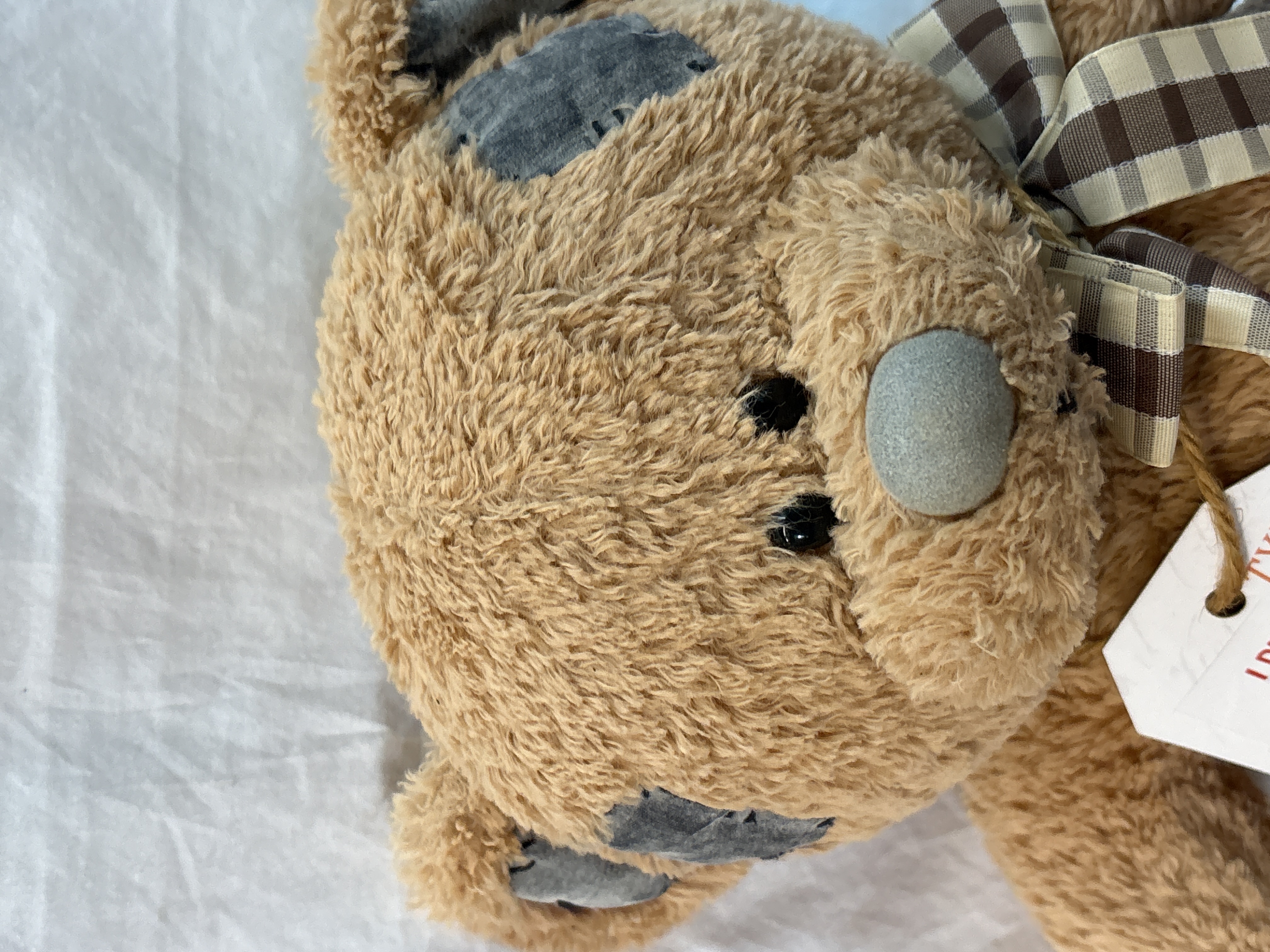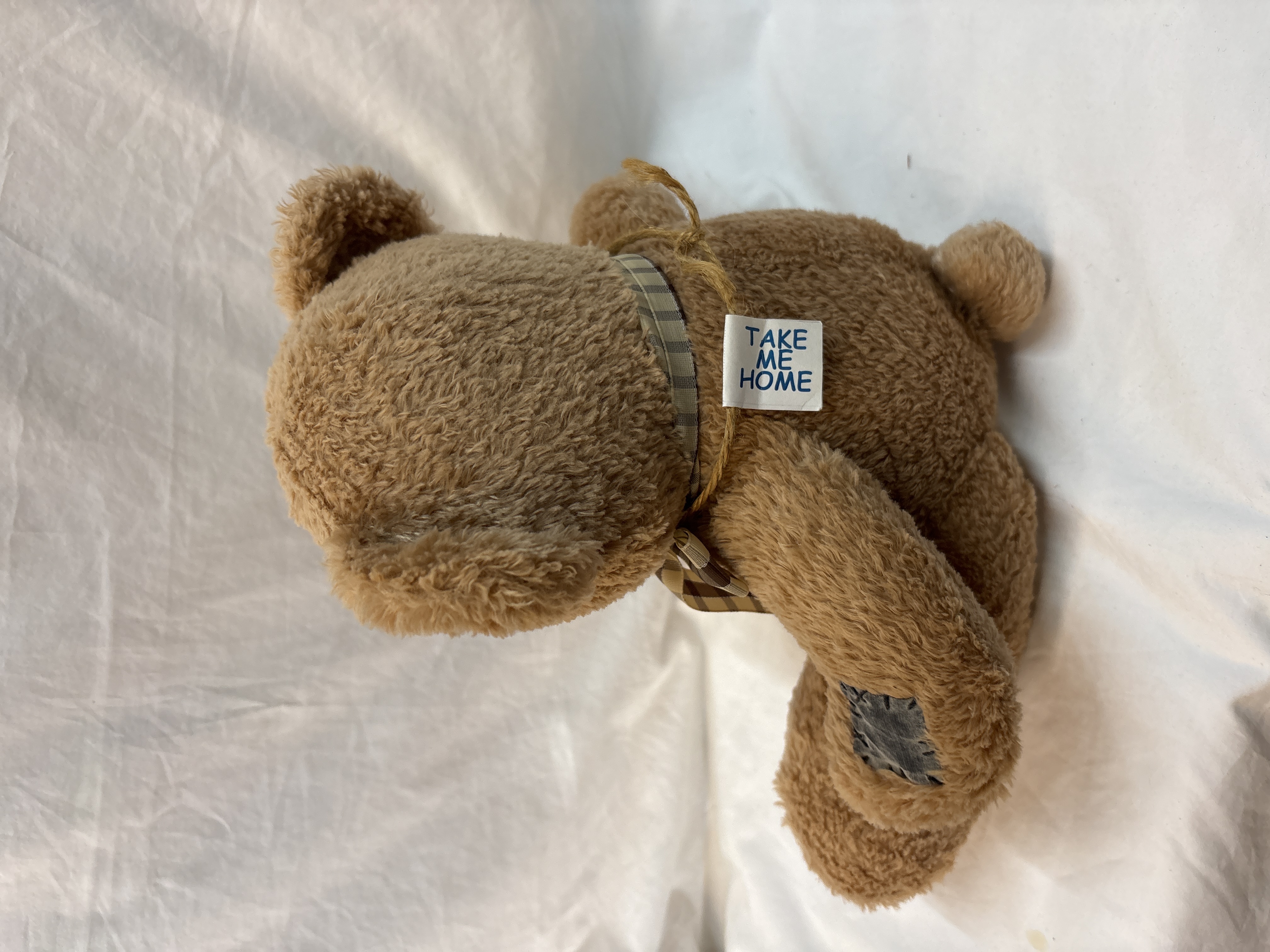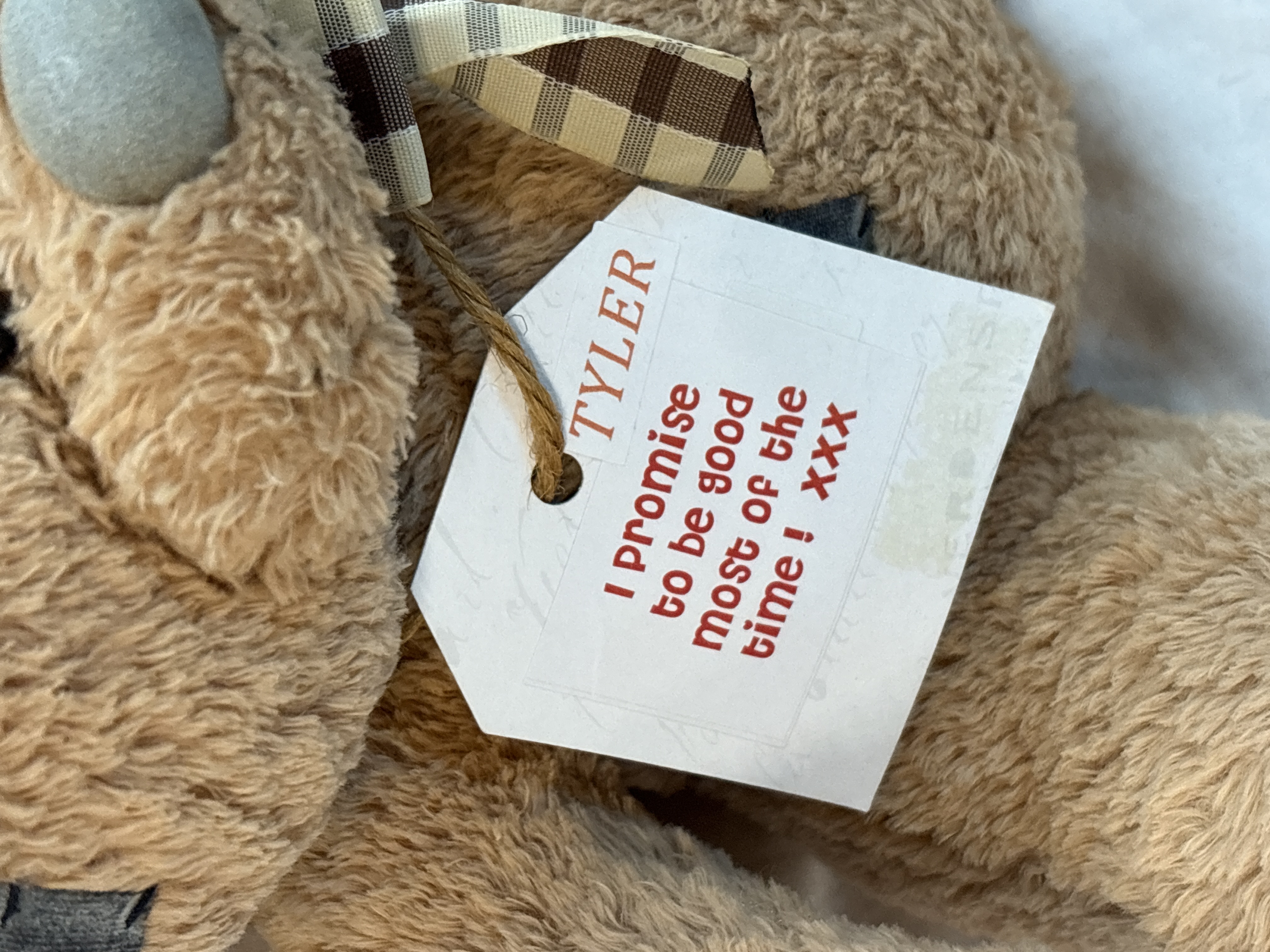 A plush teddy bear manufactured by Metro Soft Toys. The bear is constructed from light brown plush material and features a shabby aesthetic with various decorative grey fabric patches. These patches include black stitched detailing and are located on the ears, forehead, and feet. The bear has small black bead eyes and a large soft grey nose. A brown and cream checkered ribbon bow is tied around the neck. The item retains its original white paper swing tag which features the name Tyler in a reddish-brown font and the text I promise to be good most of the time ! xxx in red. The right edge of the tag bears a faint vertical mark for the retailer Clintons. A small white fabric label is attached to the back of the bear, printed with the words Take Me Home in blue.