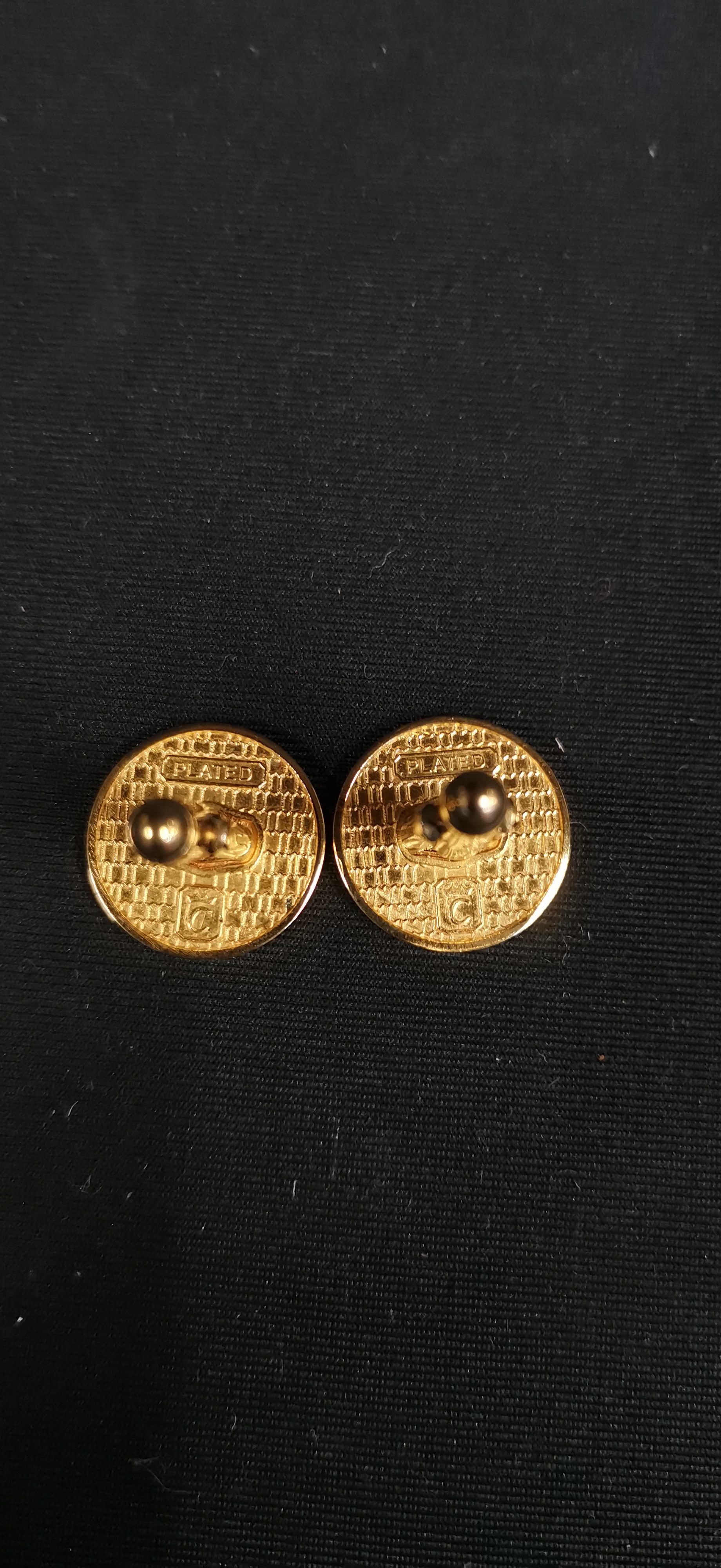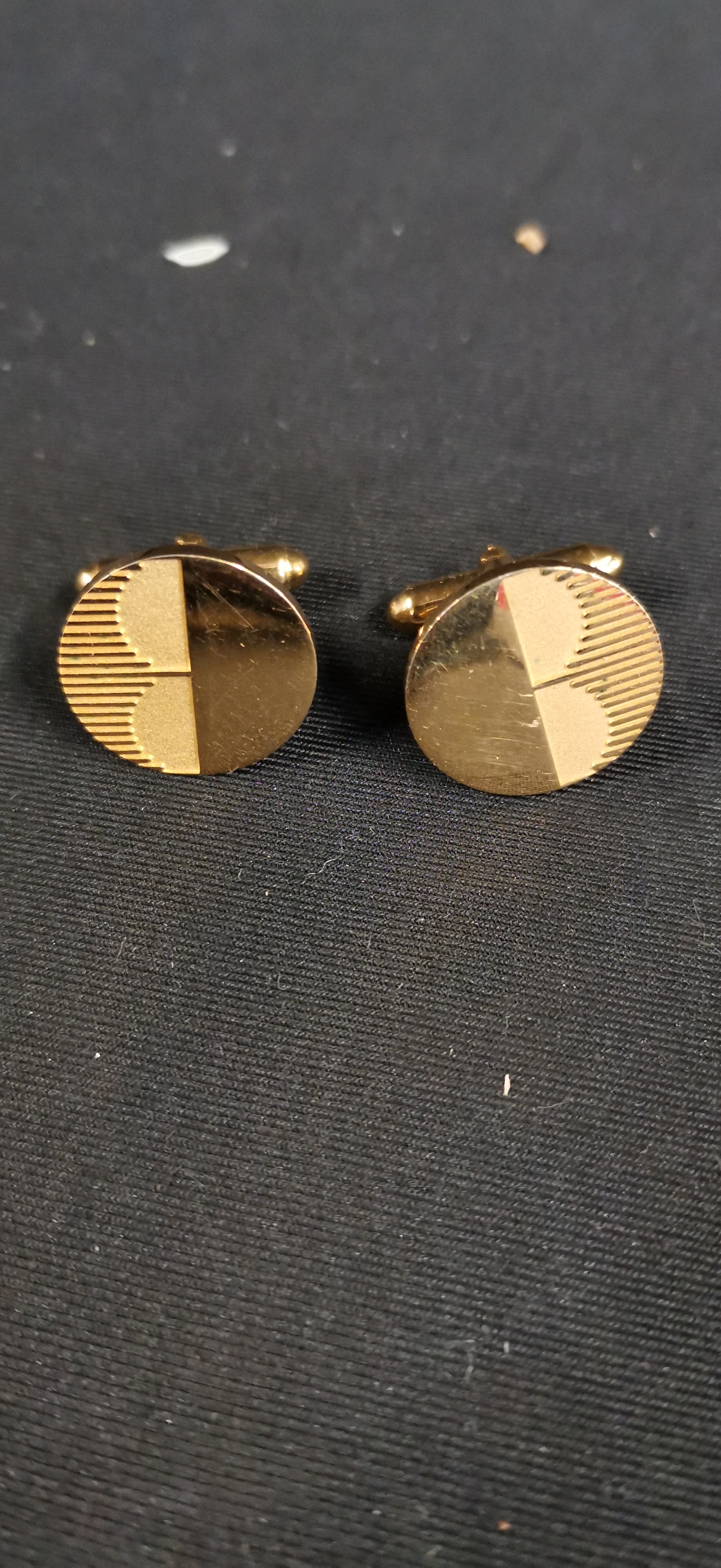 A pair of yellow gold-plated cufflinks featuring circular faces with a tripartite geometric design. The decorative faces are divided into three sections showcasing a combination of polished, engine-turned, and matte finishes. The cufflinks are constructed with T-bar swivel back mechanisms. The reverse of each cufflink head features a textured surface and is stamped with the word PLATED within a rectangular cartouche. Each piece also bears a maker’s mark consisting of a stylised letter G within a square border.