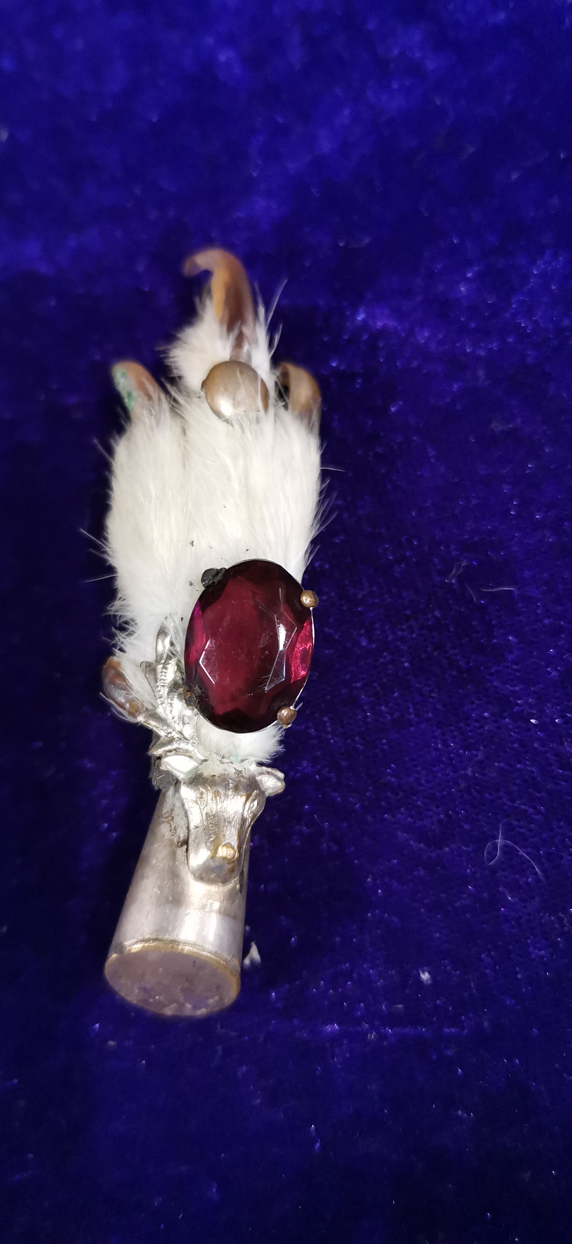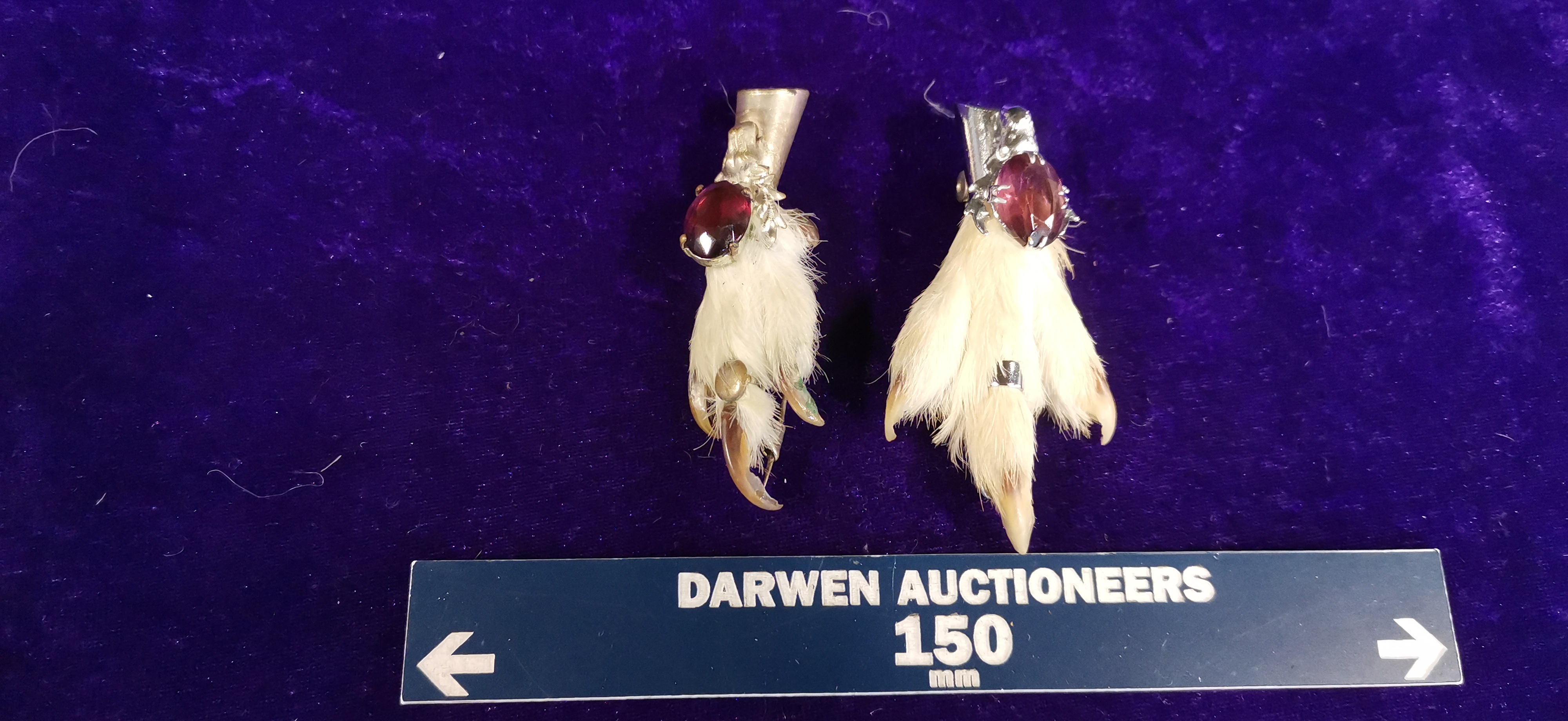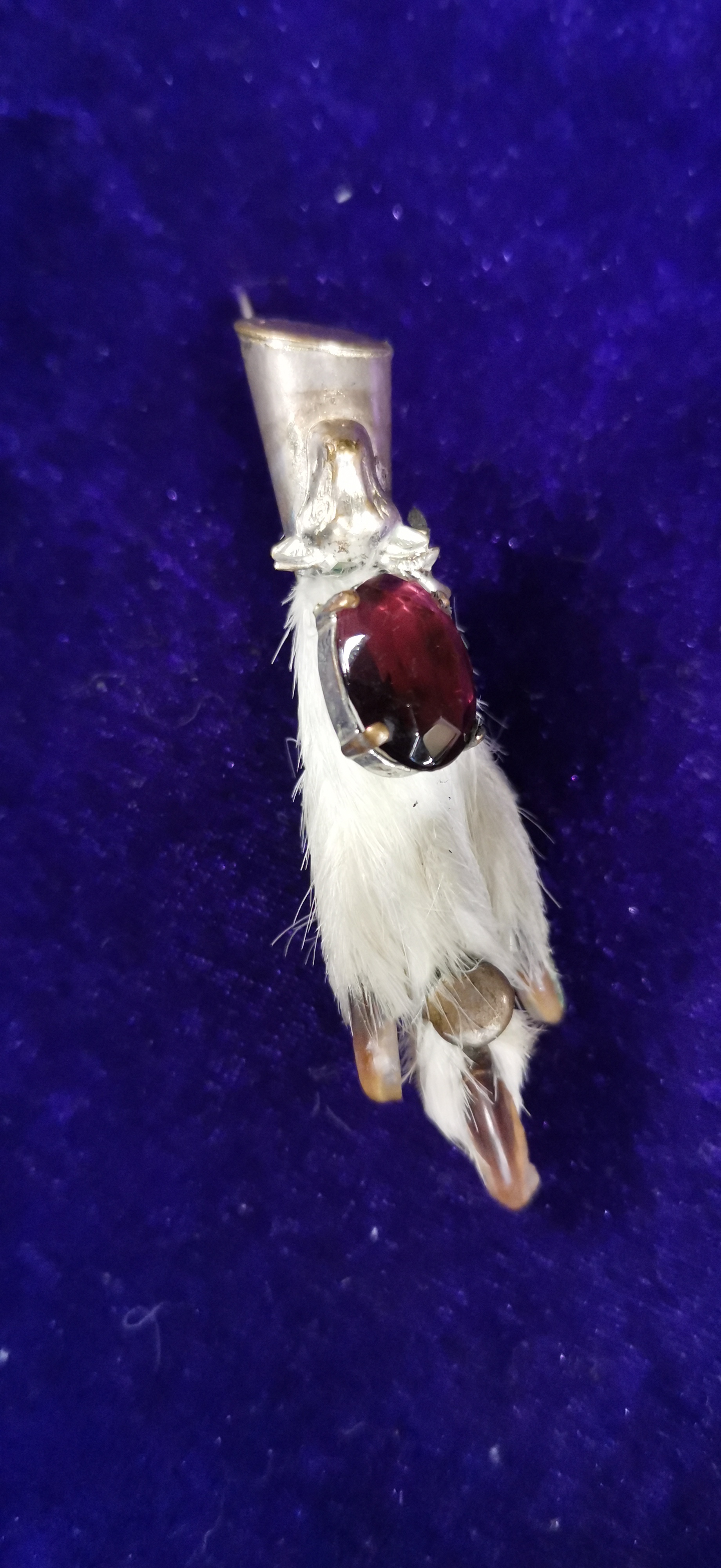 A pair of traditional Scottish taxidermy grouse foot brooches, commonly known as lucky kilt pins. Each brooch consists of a preserved grouse foot with white plumage and dark claws. One brooch features a white metal mount cast in the form of a stag’s head, set with a large oval-faceted purple stone in a multi-pronged claw setting. The second brooch features a plain white metal cap mount set with a similar large oval-faceted deep red-purple stone. Both items are fitted with a simple pin and C-clasp mechanism to the reverse. No maker’s marks or silver hallmarks are visible on the metal components.