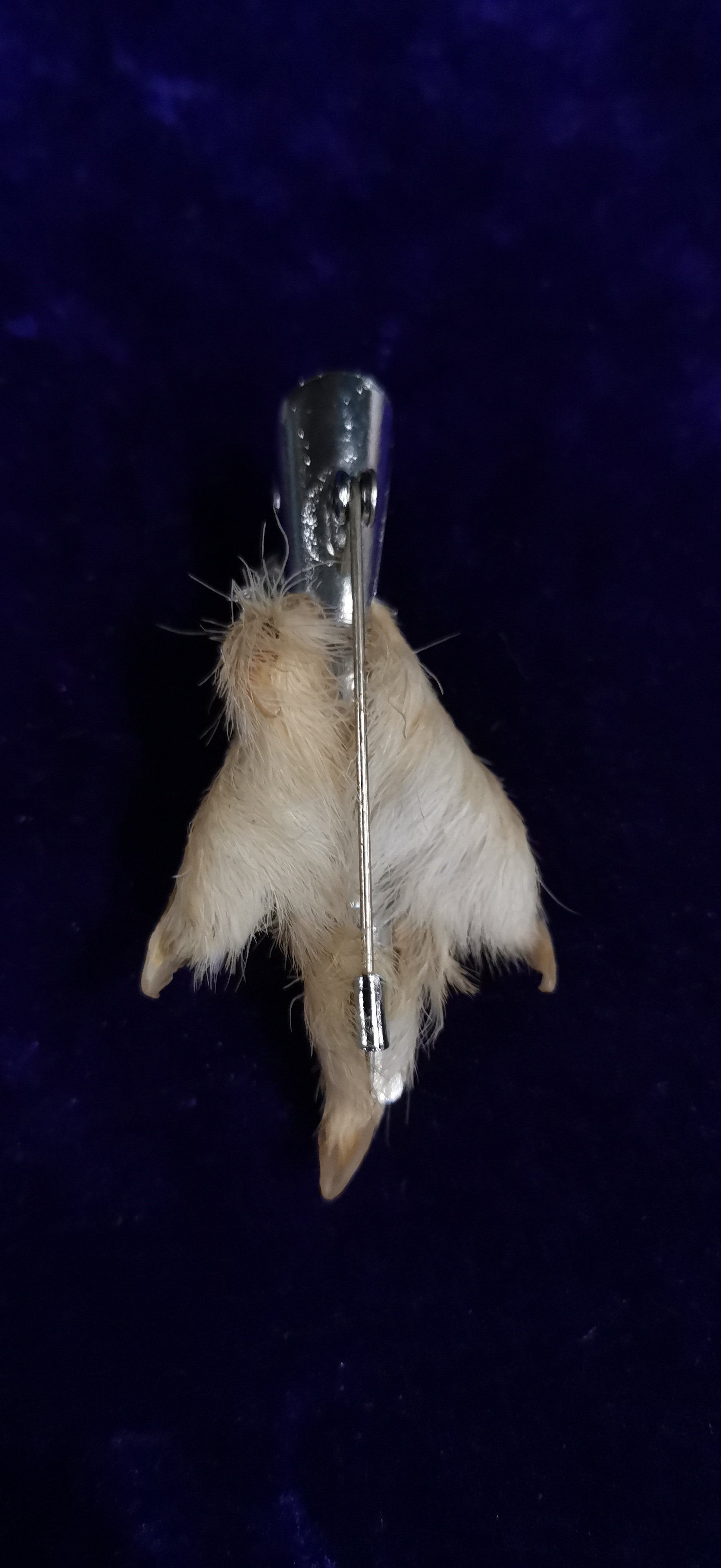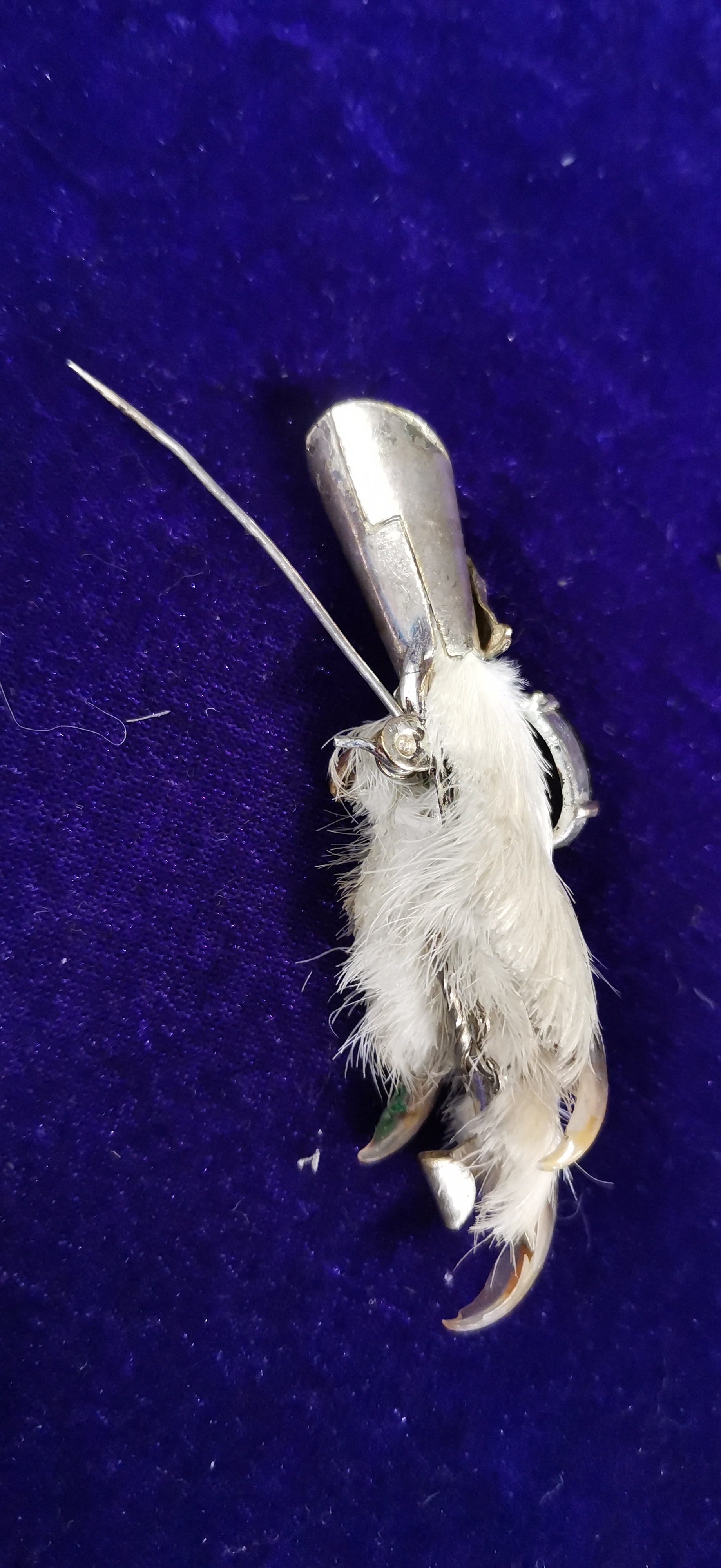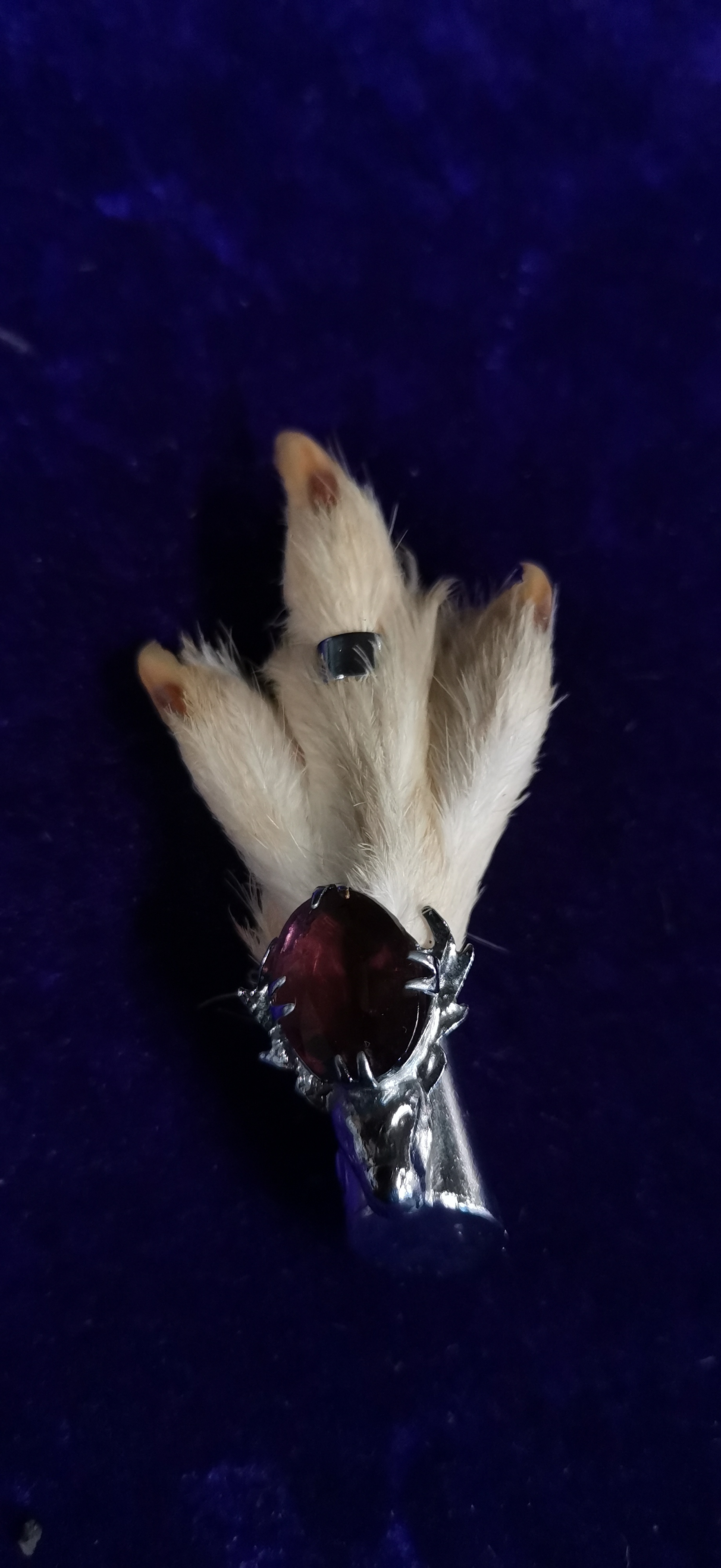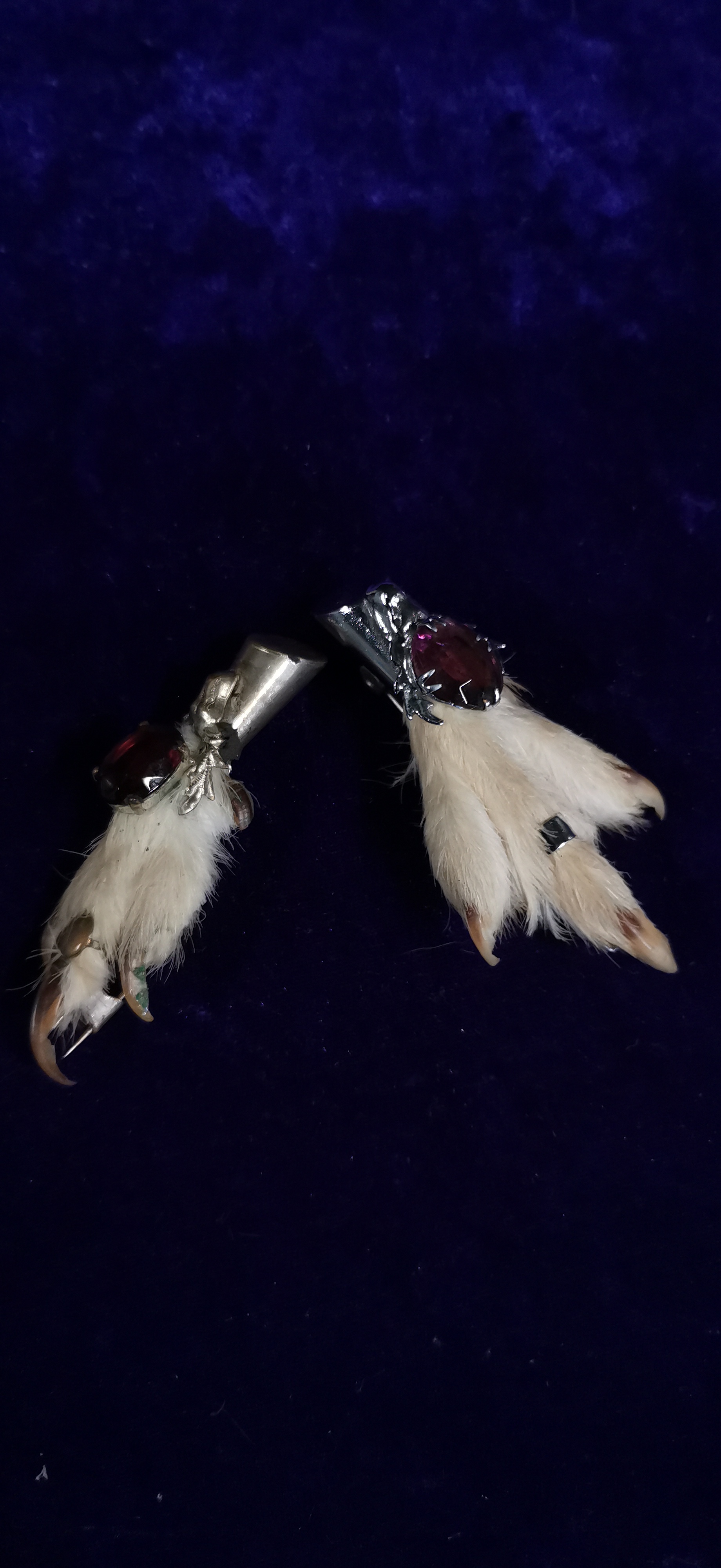 A pair of traditional Scottish taxidermy grouse foot brooches, commonly known as lucky kilt pins. Each brooch consists of a preserved grouse foot with white plumage and dark claws. One brooch features a white metal mount cast in the form of a stag’s head, set with a large oval-faceted purple stone in a multi-pronged claw setting. The second brooch features a plain white metal cap mount set with a similar large oval-faceted deep red-purple stone. Both items are fitted with a simple pin and C-clasp mechanism to the reverse. No maker’s marks or silver hallmarks are visible on the metal components.