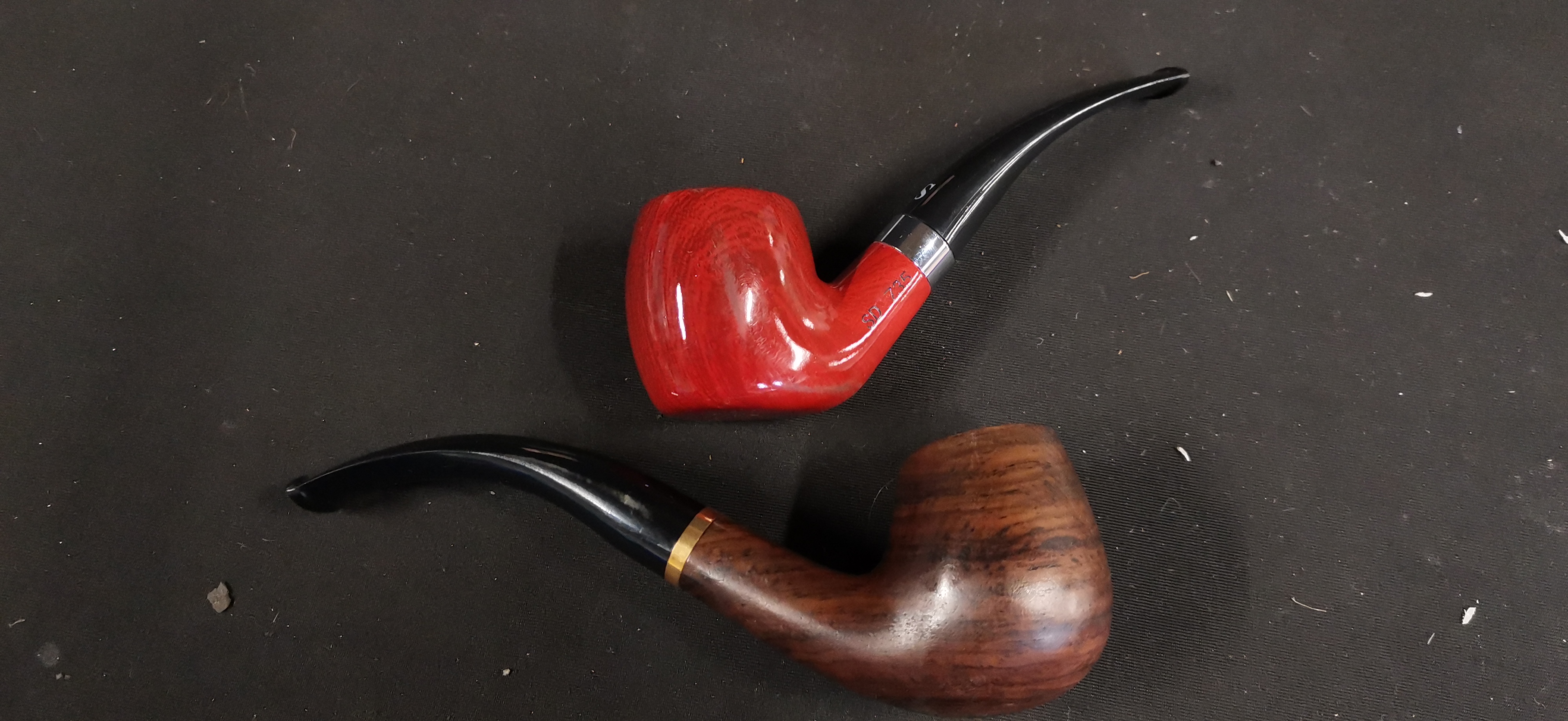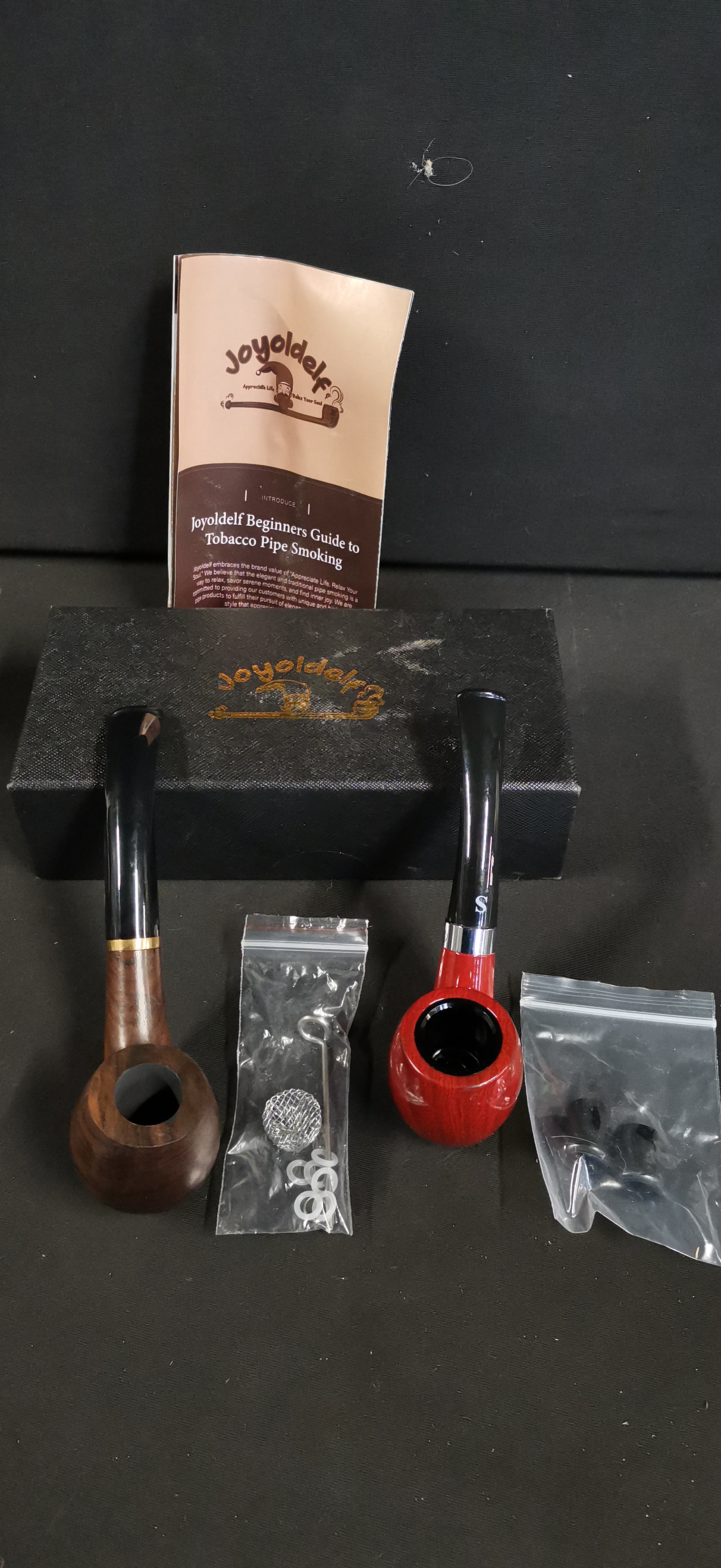 A set comprising two wooden tobacco smoking pipes and associated accessories by Joyoldelf. The first pipe is designed with a dark brown wood-grain finish bowl, a black bent stem, and a gold-toned decorative band. The second pipe features a reddish wood-grain finish bowl with the incised model number SD-775 on the shank, a silver-toned band, and a white S mark on the black bent stem. The collection includes a metal pipe screen, a metal multi-tool, white rubber bit guards, and additional black components. The set is presented in the original black textured box with gold-toned branding and includes a Beginners Guide to Tobacco Pipe Smoking booklet.