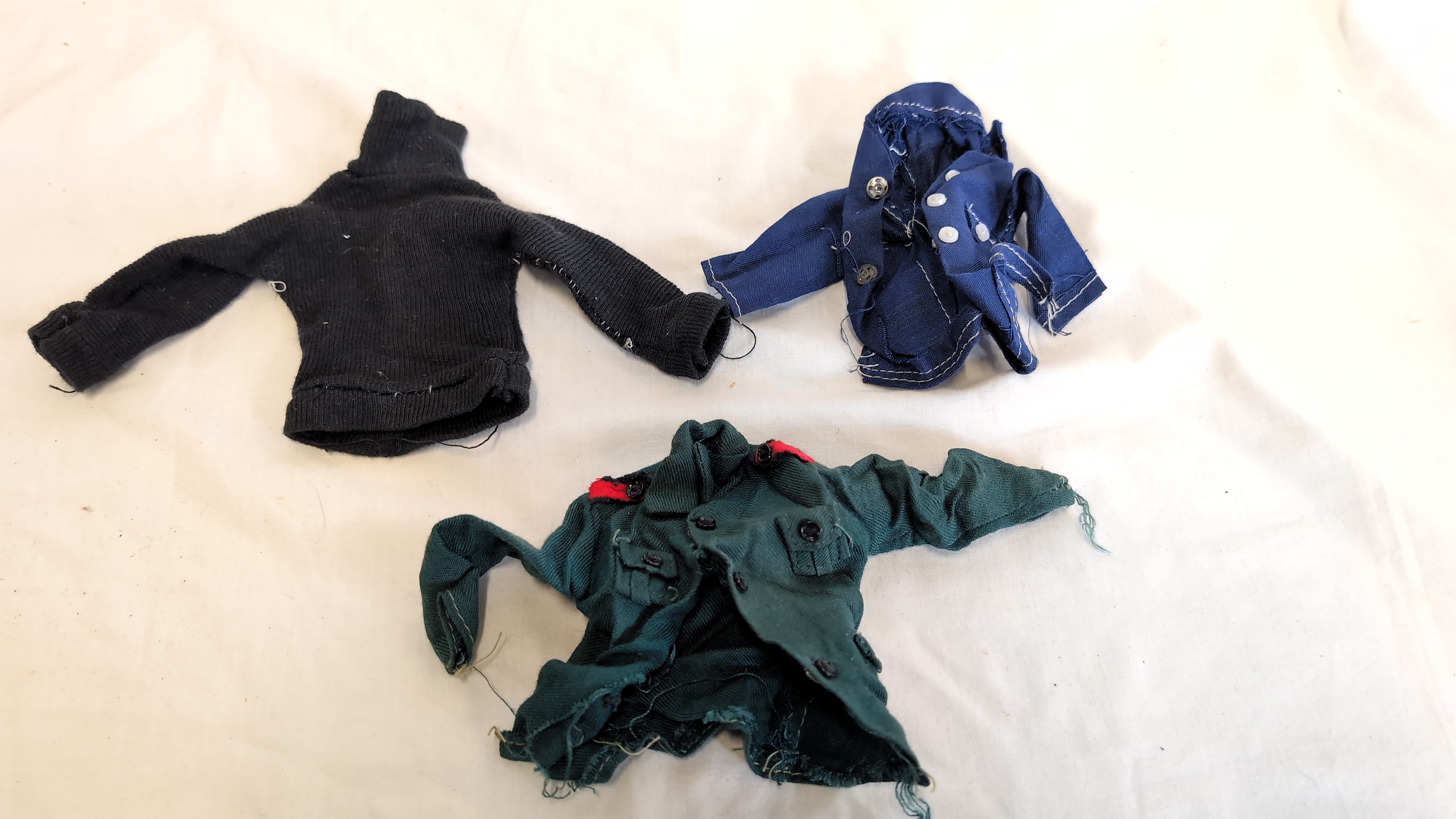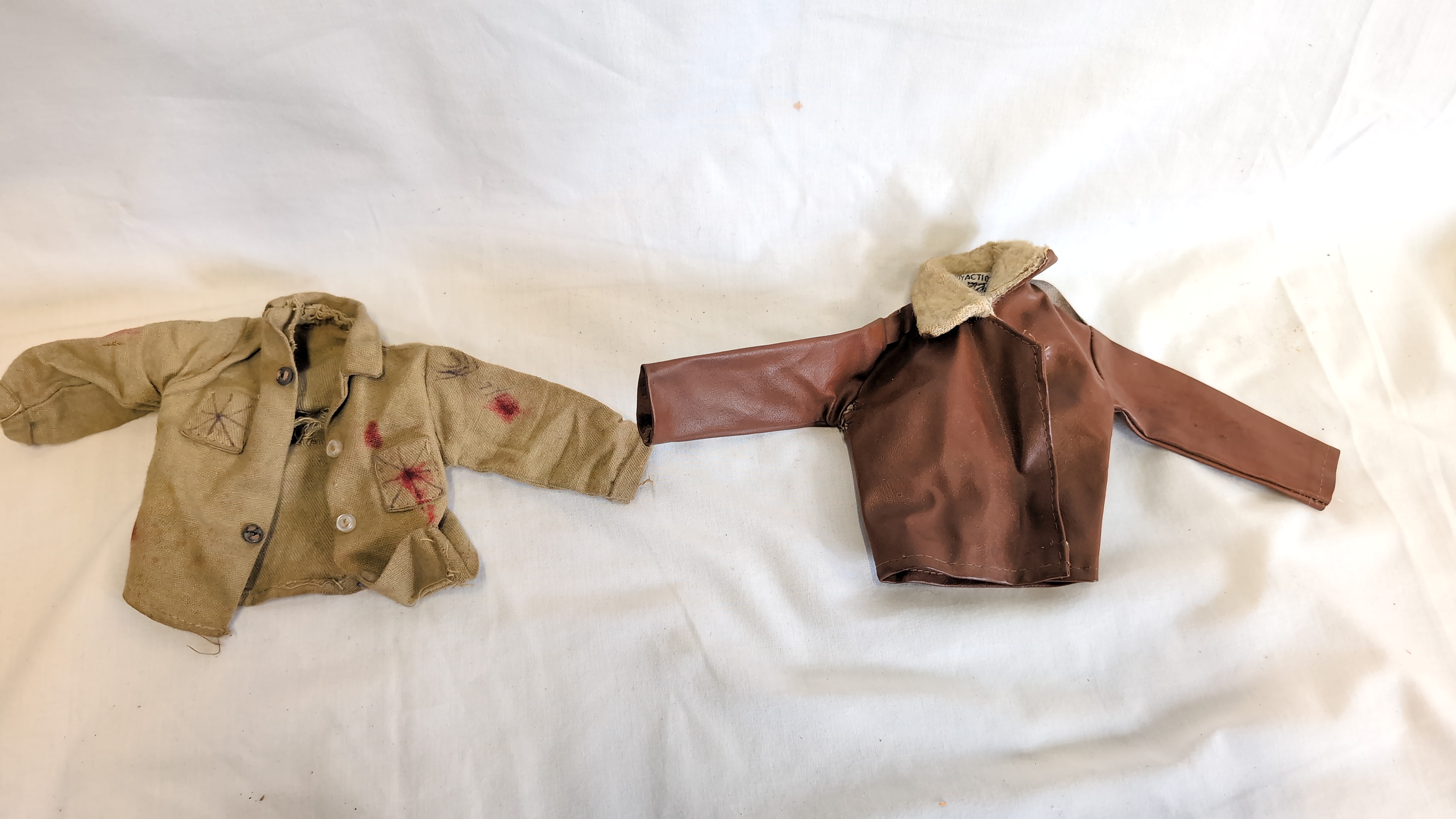 This collection of miniature clothing is designed for the 12-inch Palitoy Action Man figure range. The assortment includes a brown vinyl flight jacket with a cream faux-fur collar, which retains the original Action Man fabric label to the interior. Also present is a tan cotton military field jacket featuring simulated battle damage and red staining. The dark green military tunic includes red shoulder epaulettes and black buttons, characteristic of the Russian Infantryman set. The lot is completed by a black ribbed knit turtleneck sweater and a blue cloth uniform jacket with white button detailing. The garments are constructed from a variety of materials including cotton, synthetic fabrics, and vinyl.