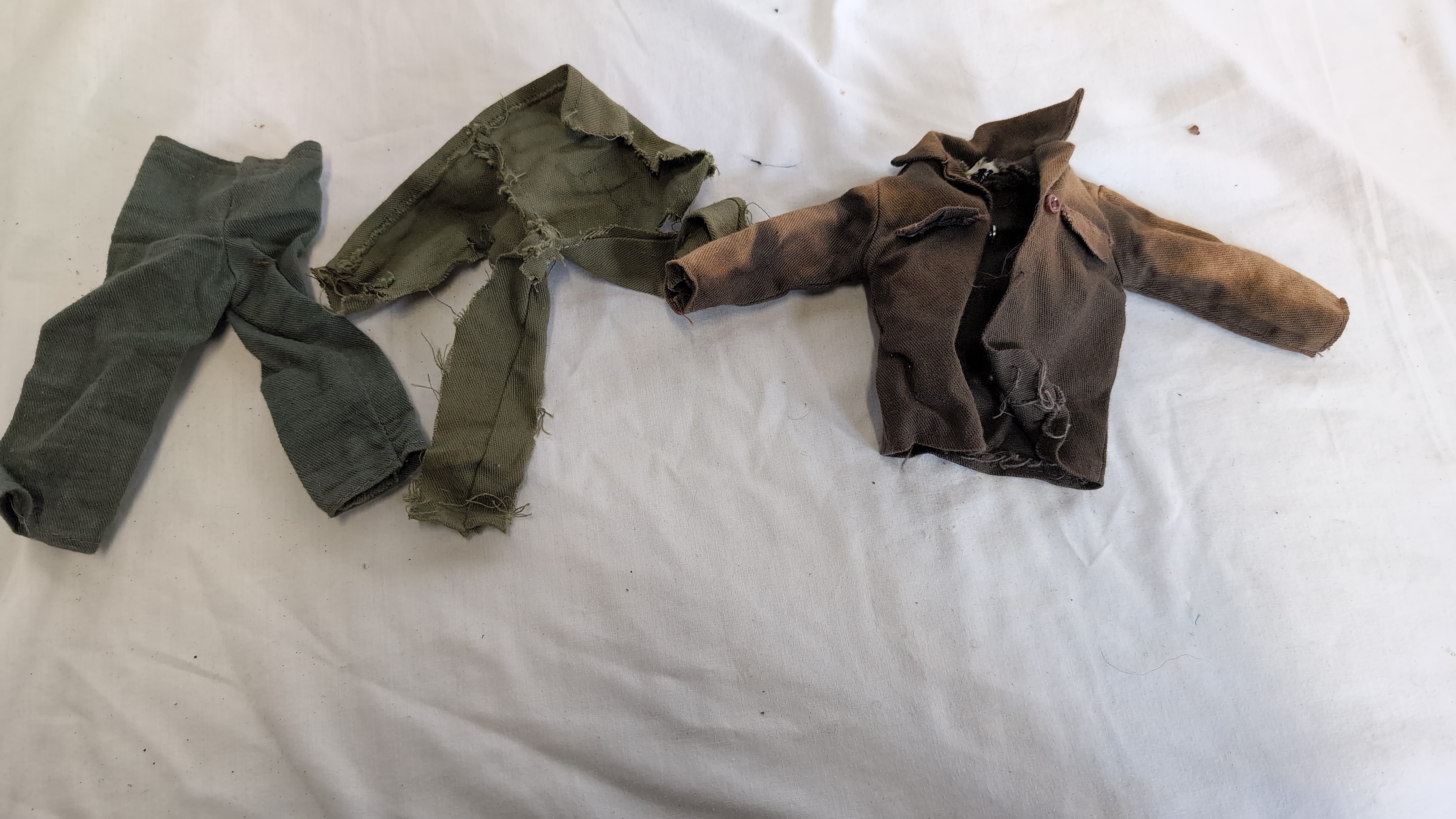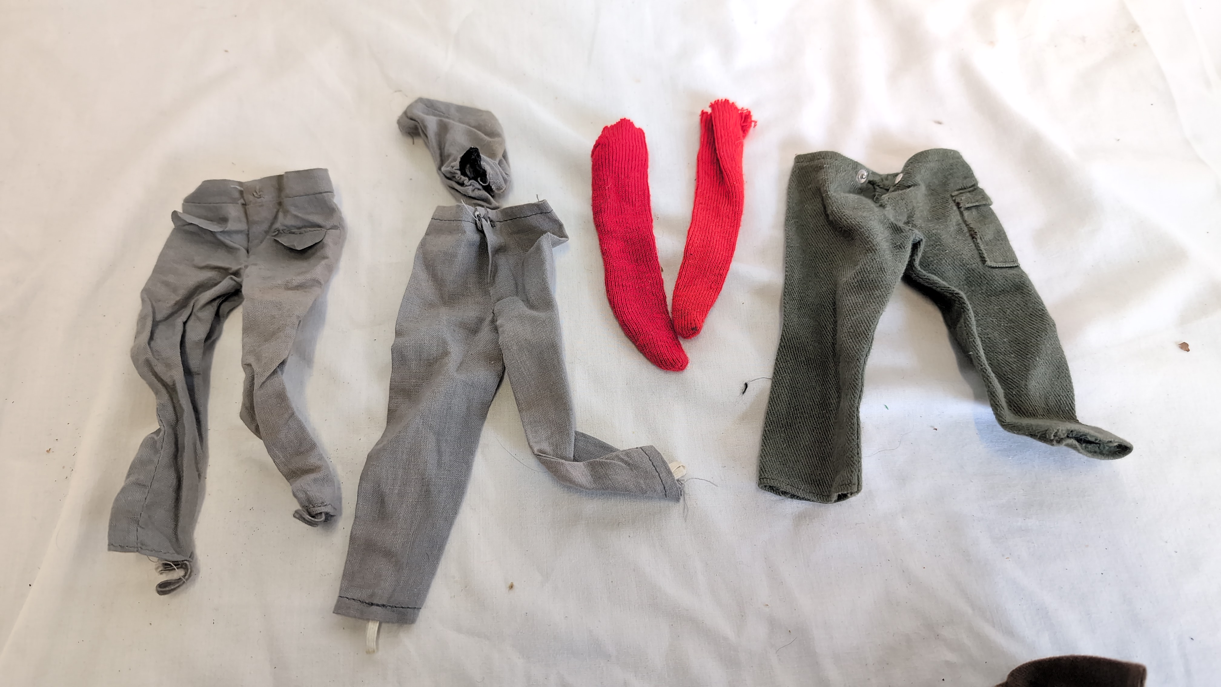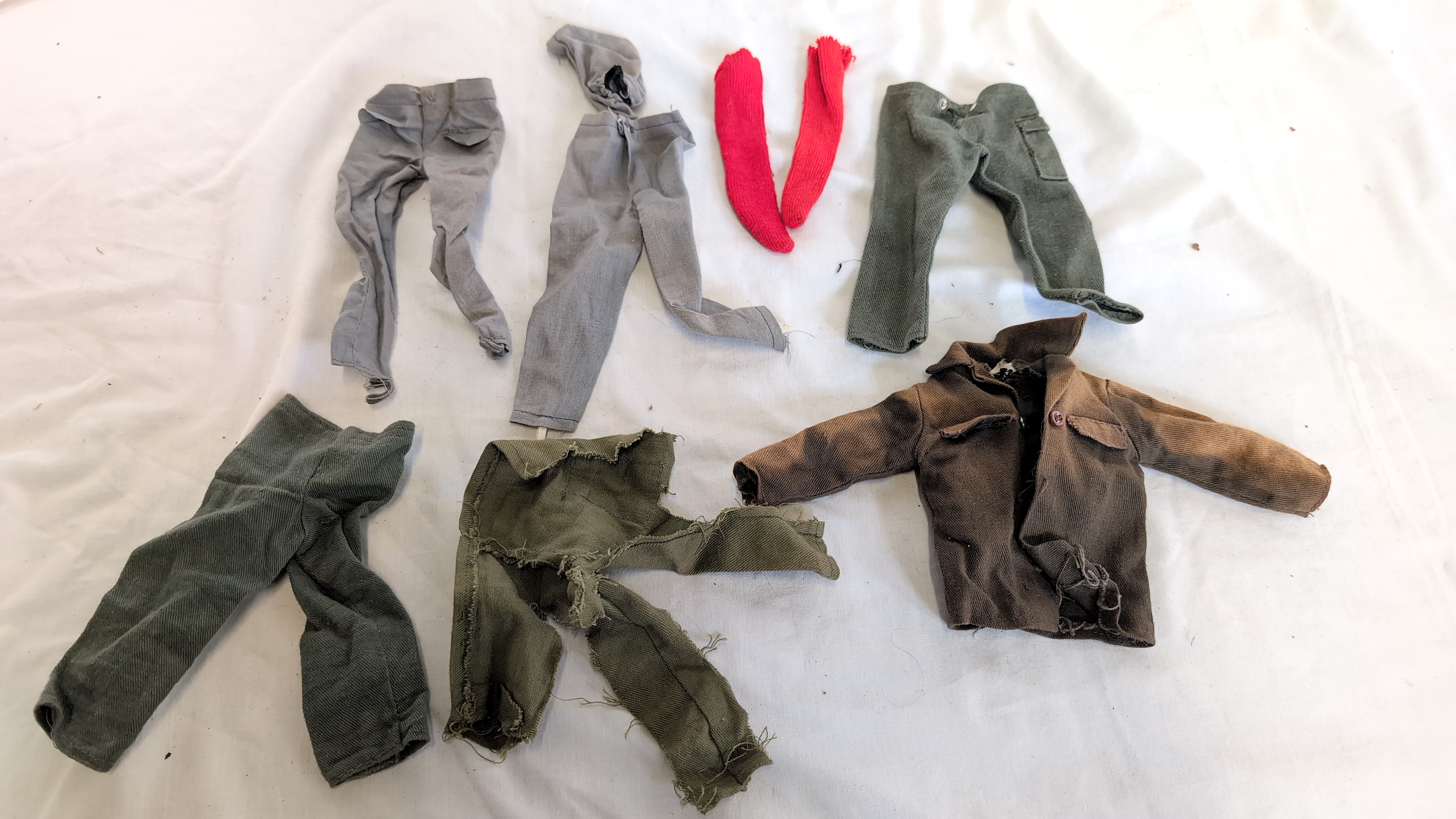 This lot comprises an assortment of vintage 1/6 scale action figure clothing, characteristic of the 1960s Hasbro G.I. Joe and Palitoy Action Man lines. The collection includes various garments constructed from woven cloth and knitted textiles. The items include light grey trousers, one pair featuring an integrated hood; red knitted socks; and olive drab trousers, featuring variations such as a side cargo pocket with a metal snap fastener, and a pair significantly shredded and distressed. Also present is a brown field-style jacket with a single visible button on the breast pocket and frayed detailing. These garments are designed for standard 12-inch poseable action figures of the mid-20th century.
