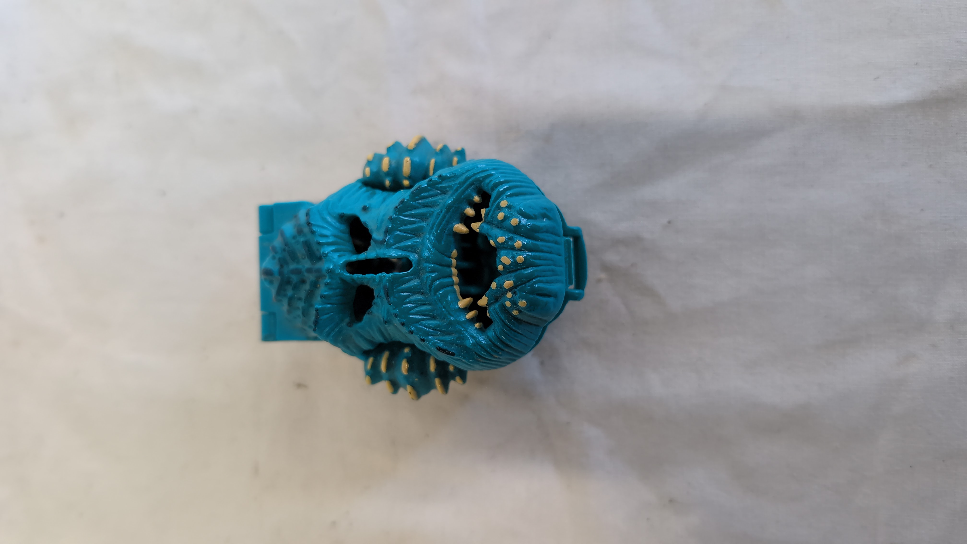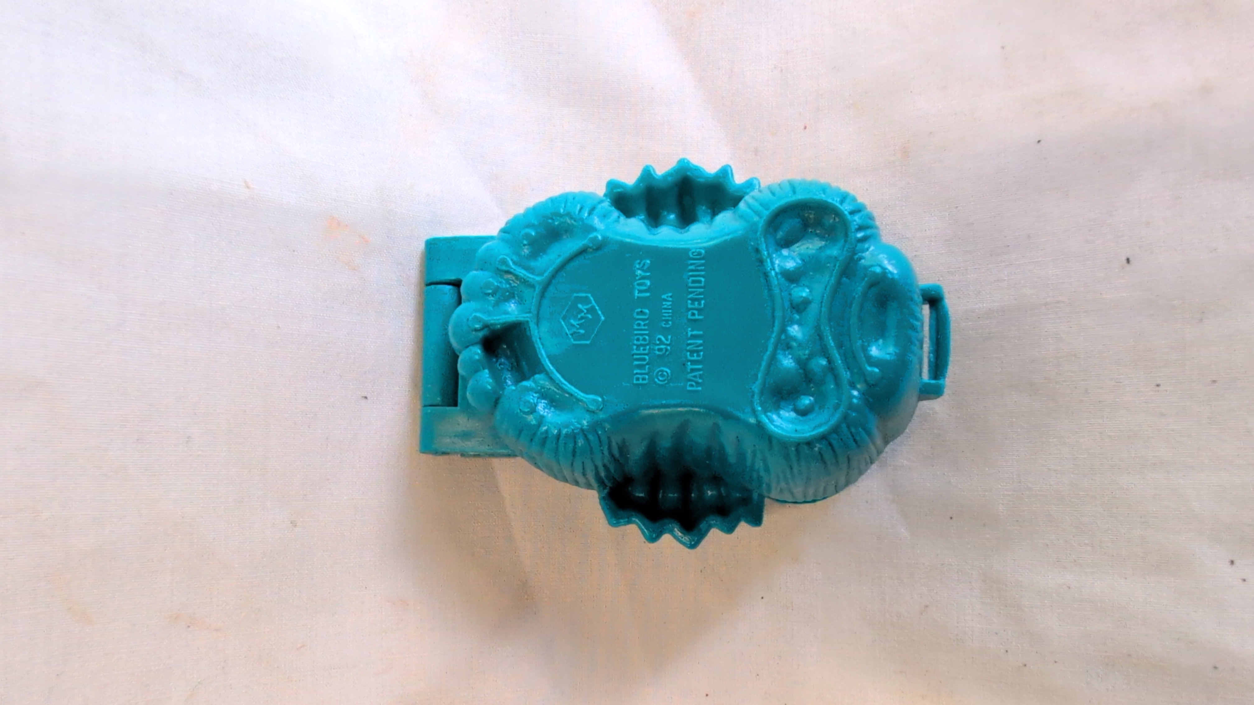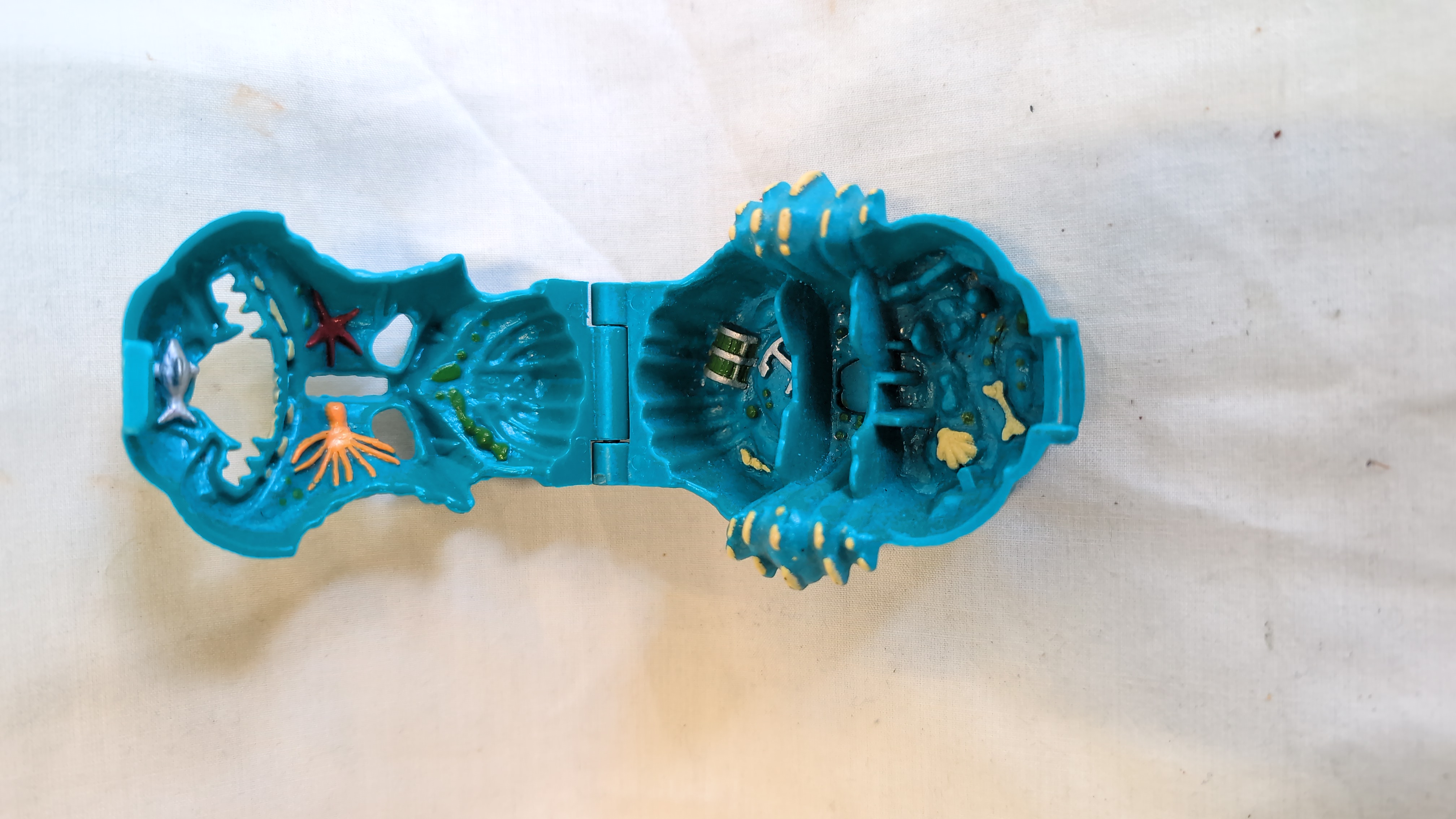 A vintage micro-playset from the Mighty Max product line, specifically the Pulverizes Sea Squirm model from the Horror Heads series. The item is constructed from moulded plastic with a hinged clamshell mechanism. The exterior is sculpted in the form of a monstrous blue sea creature with yellow-painted nodules. The interior contains a moulded underwater diorama featuring a red starfish, an orange octopus, a green and silver treasure chest, an anchor, and a yellow bone. A small silver fish remains attached to the upper jaw hinge. The base of the set is marked with the text BLUEBIRD TOYS, © 92 CHINA, and PATENT PENDING, accompanied by a hexagonal MM logo.