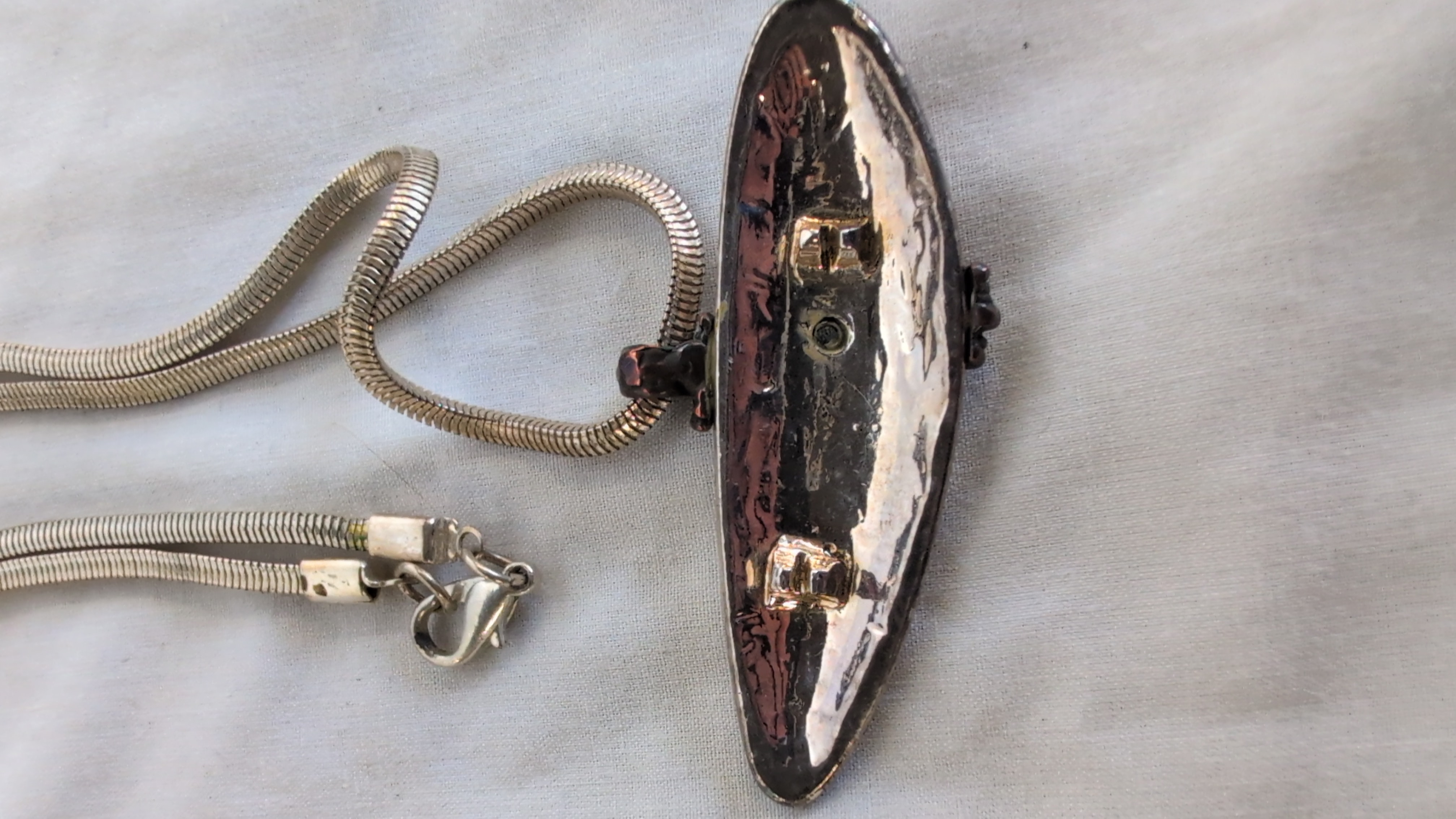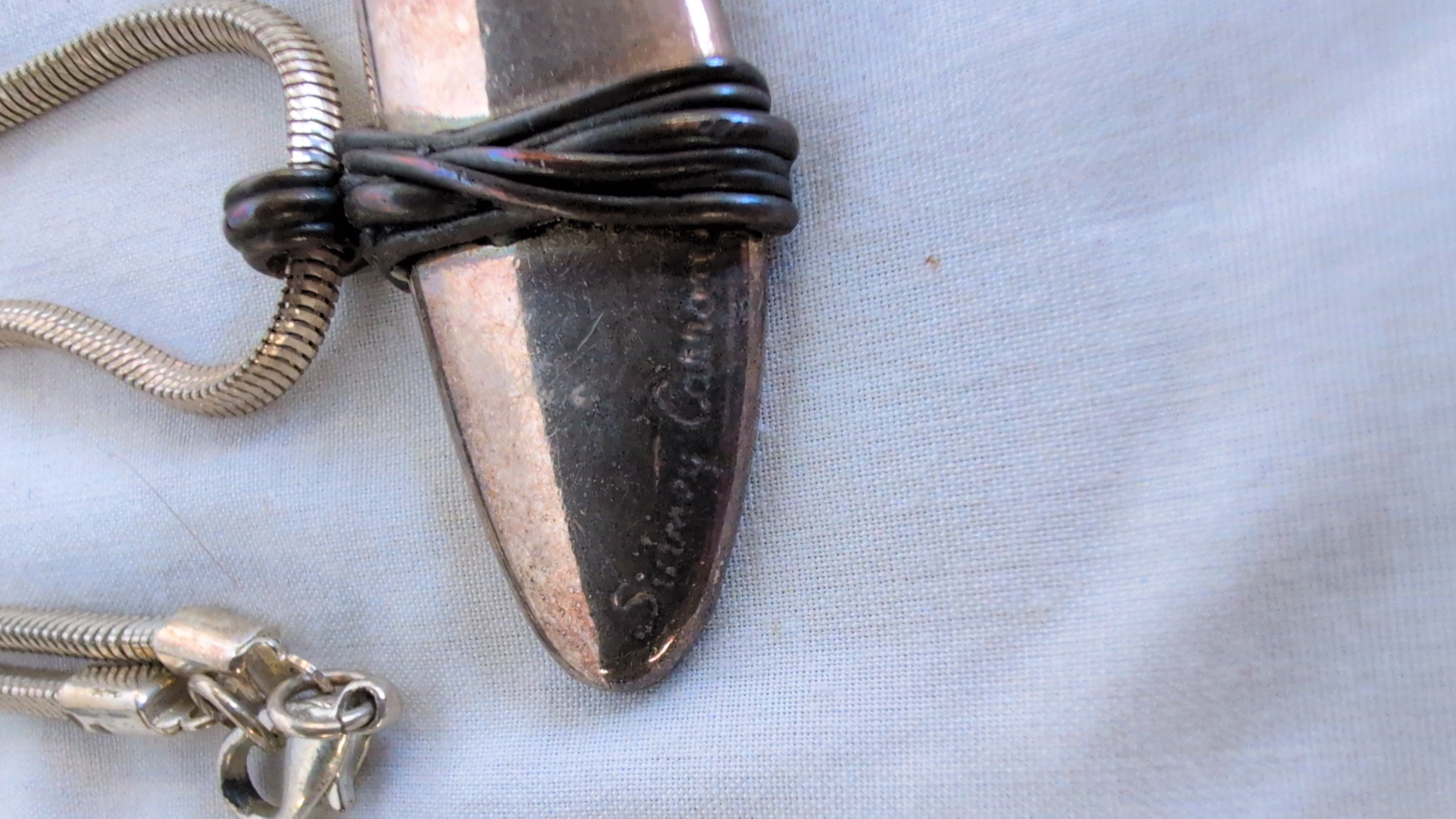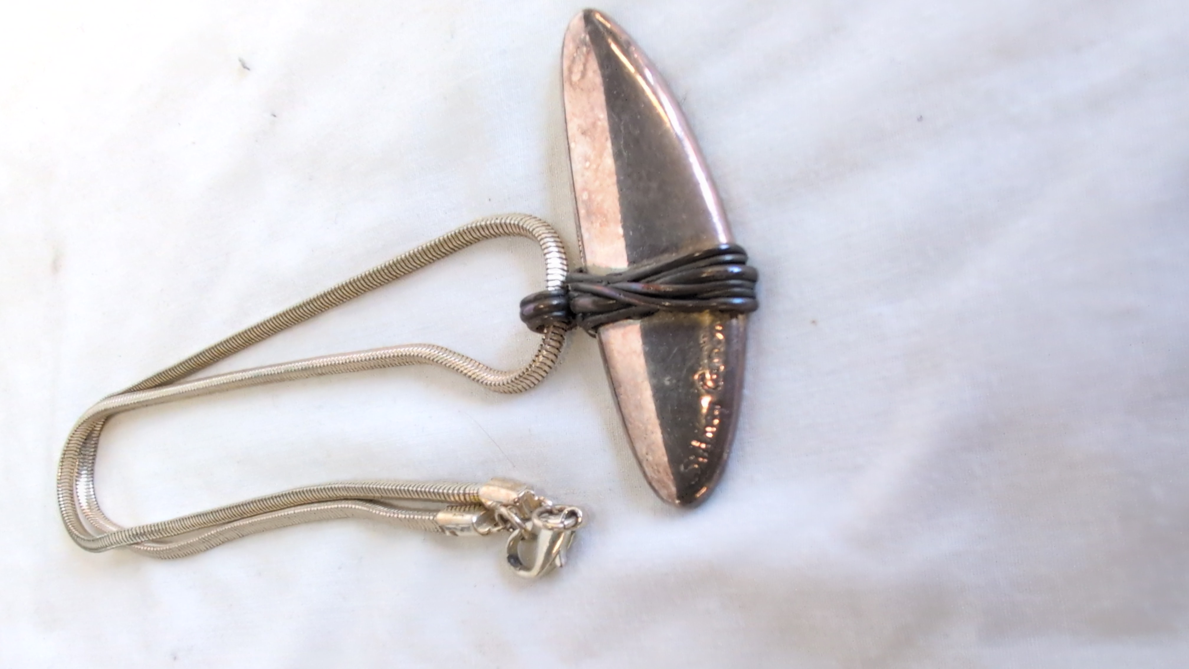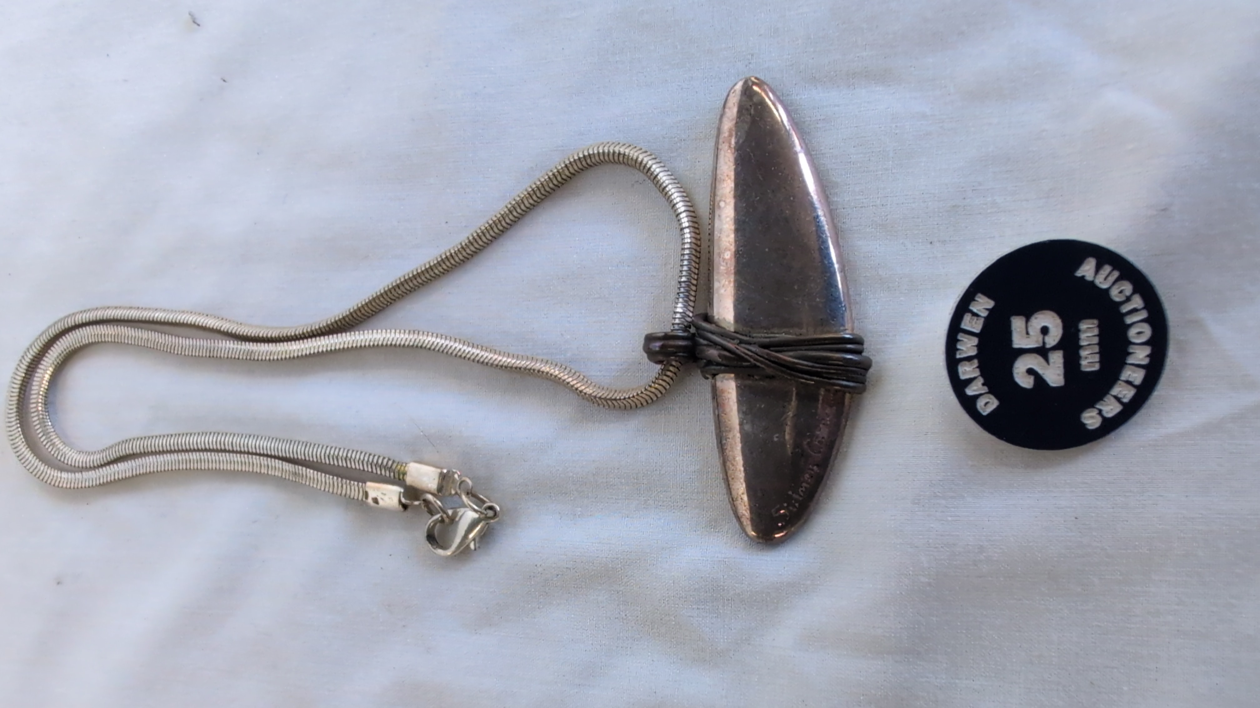 A sculptural designer pendant necklace by British maker Sidney Carron. The piece features a large, elongated crescent-shaped pendant with a polished silver-toned finish. The central section is detailed with a decorative dark-toned wire wrap. The reverse of the pendant has a textured surface and two integral loops. The necklace is suspended on a double-strand snake chain and is secured with a lobster claw clasp. The designer’s signature Sidney Carron is incised into the lower front edge of the pendant. No hallmarks for precious metal content are visible.