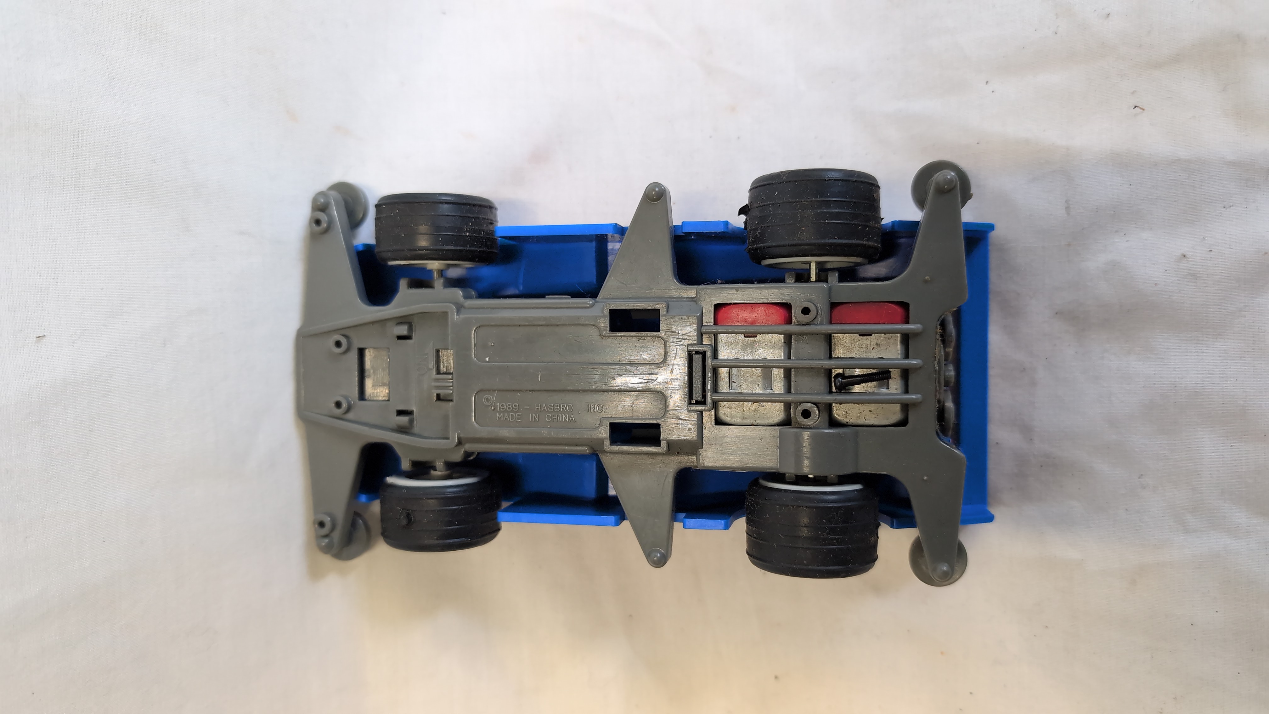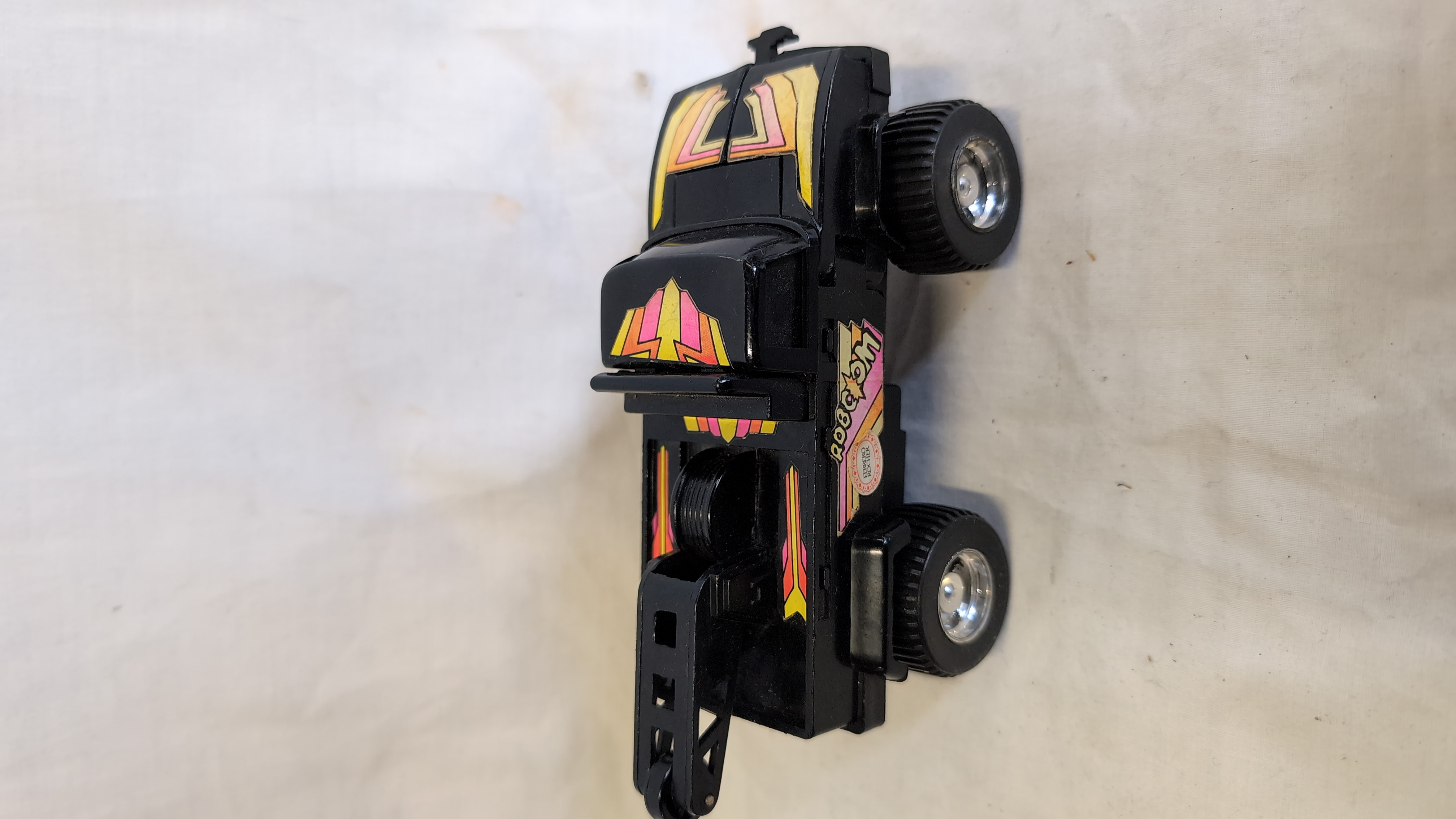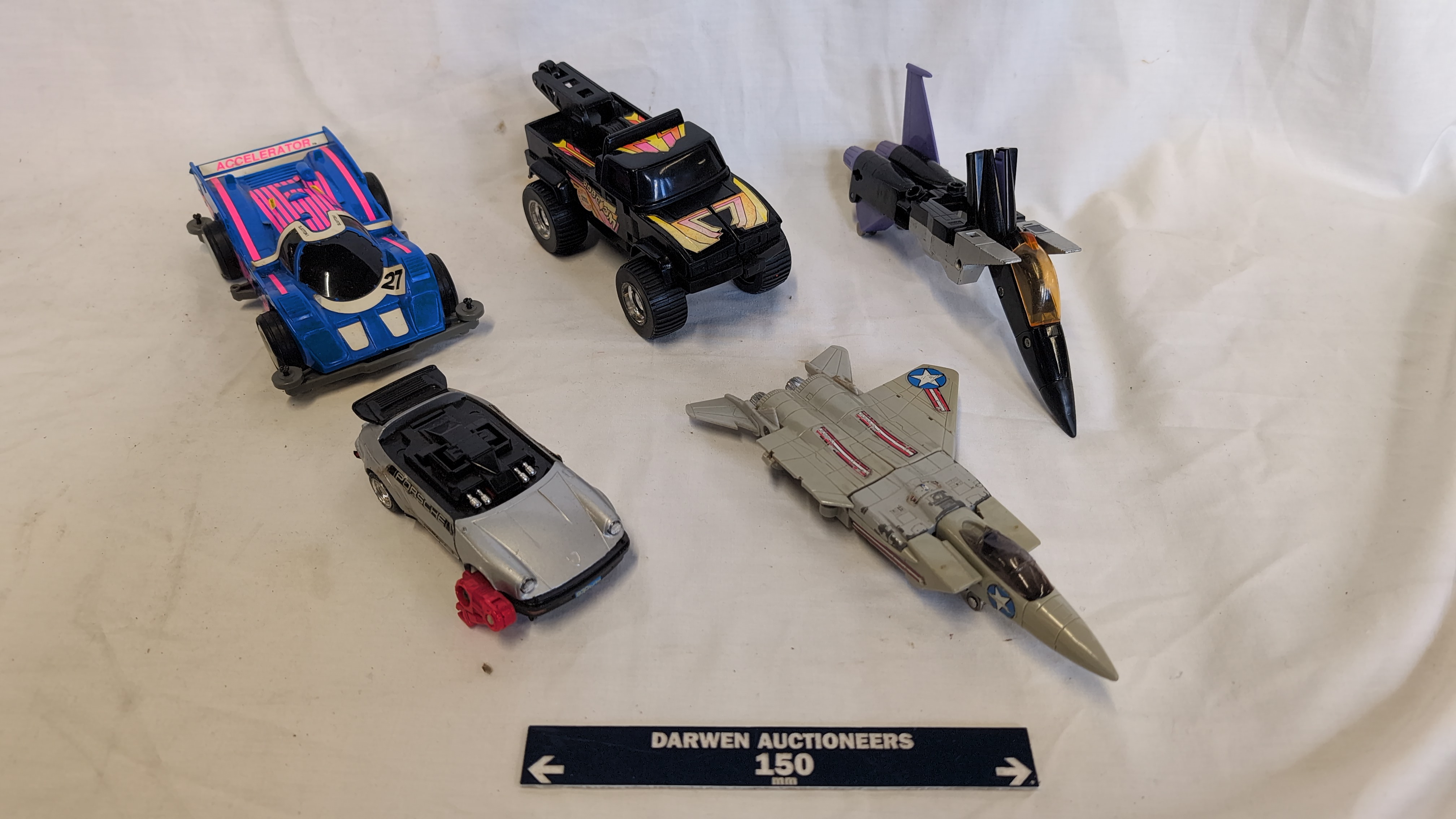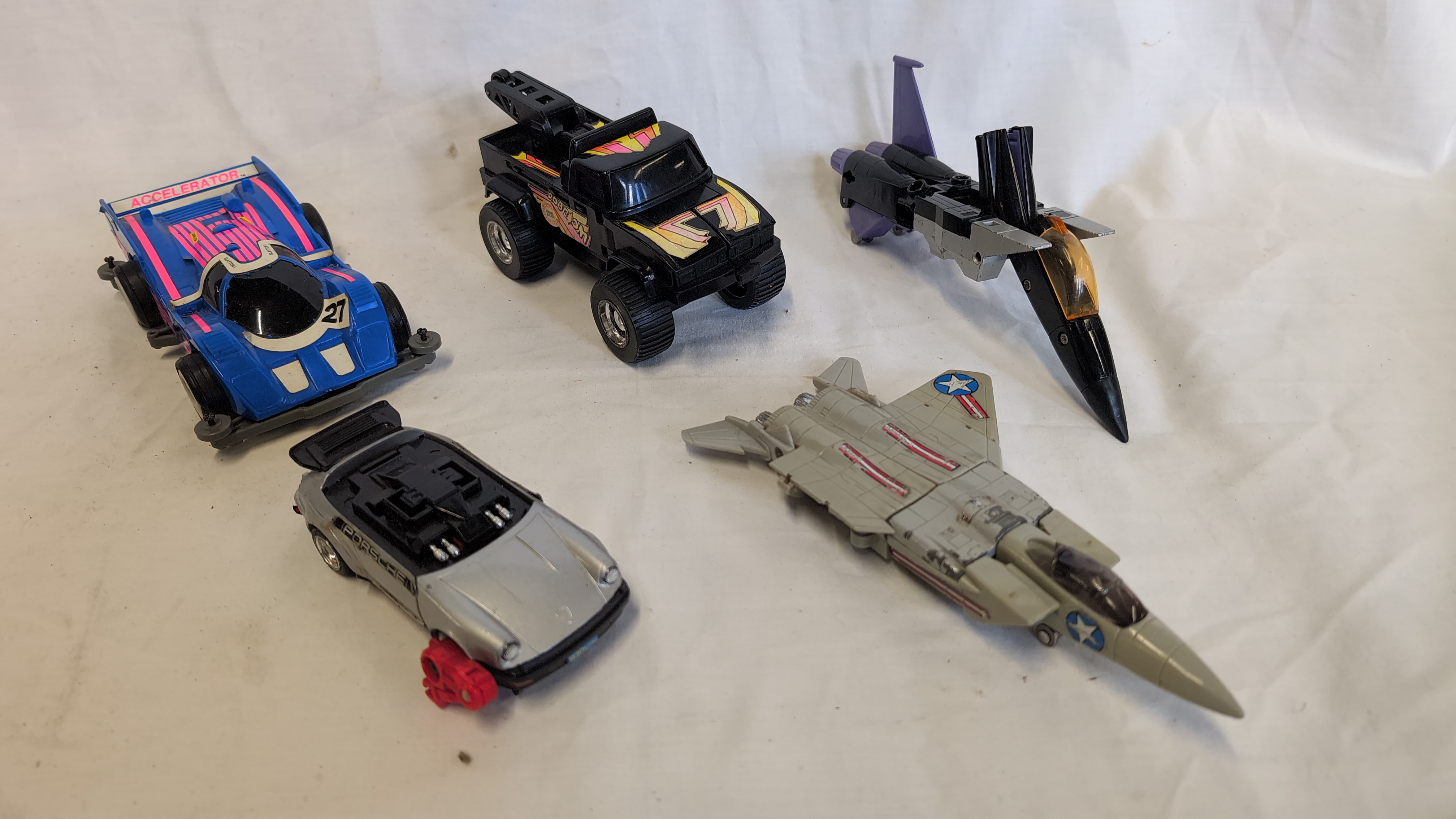 An assortment of vintage plastic and die-cast metal toys featuring several Hasbro Transformers Generation 1 figures and related motorized vehicles. The group includes an Autobot Jazz figure, styled as a silver Porsche 911 with Porsche side decals; a Decepticon Skywarp figure in black and purple; and a Decepticon Ramjet figure in light grey with United States military star decals. Also present is a Hasbro Accelerators motorized racing car, identified as Slayton, featuring a blue body with pink and white Accelerator decals and marked 1989 Hasbro Inc. Made in China on the grey plastic base. A black transforming tow truck with multi-coloured decals and Robom text completes the lot. The Jazz figure is constructed with a die-cast metal chest and plastic components. The seeker jets Skywarp and Ramjet feature die-cast and plastic construction.