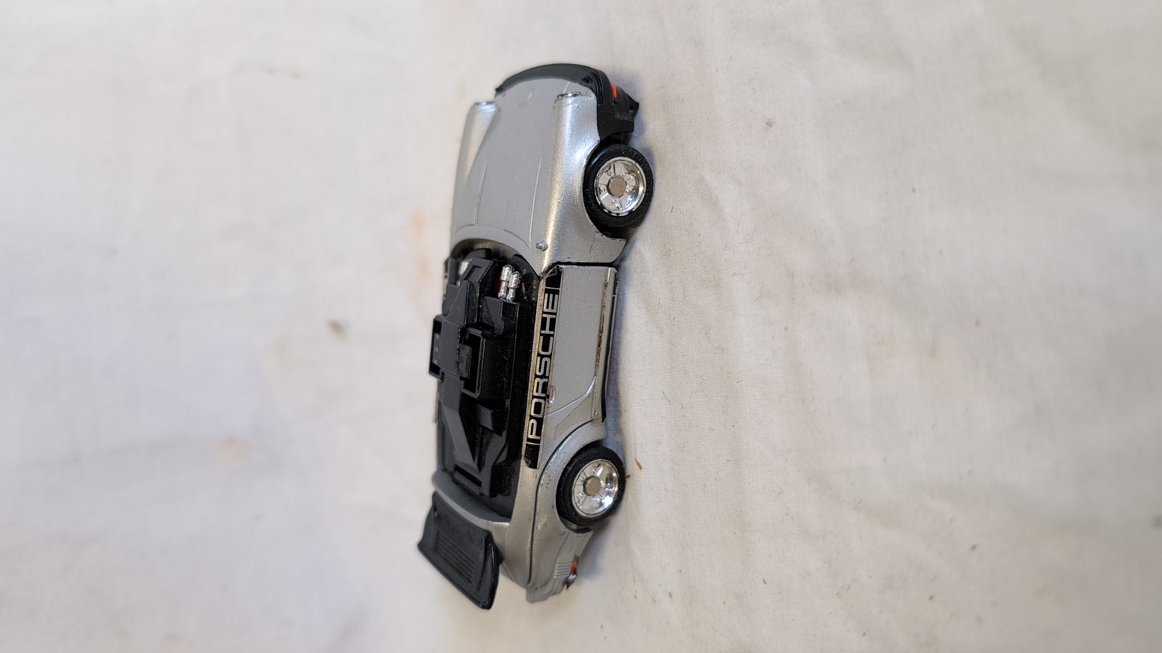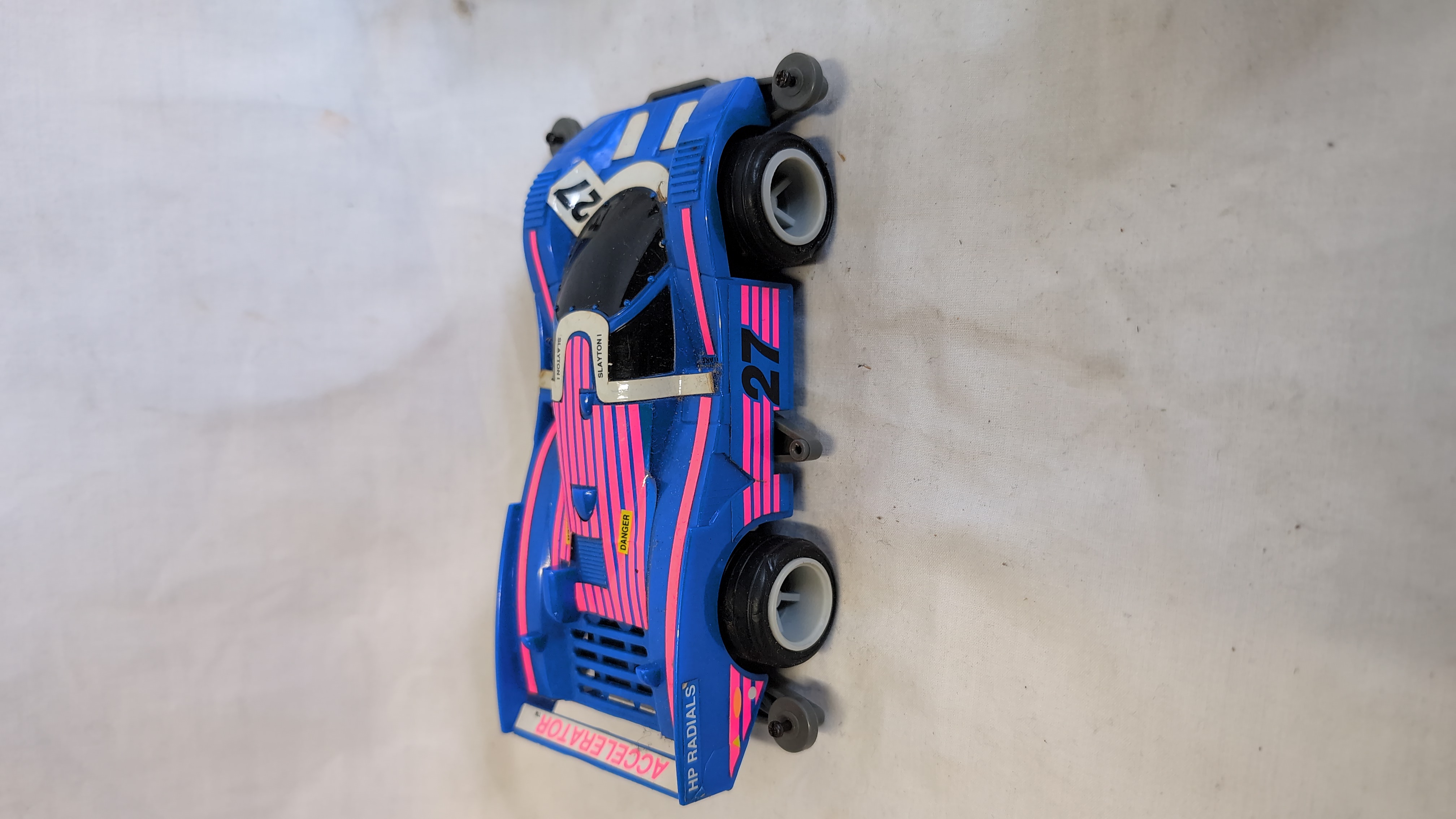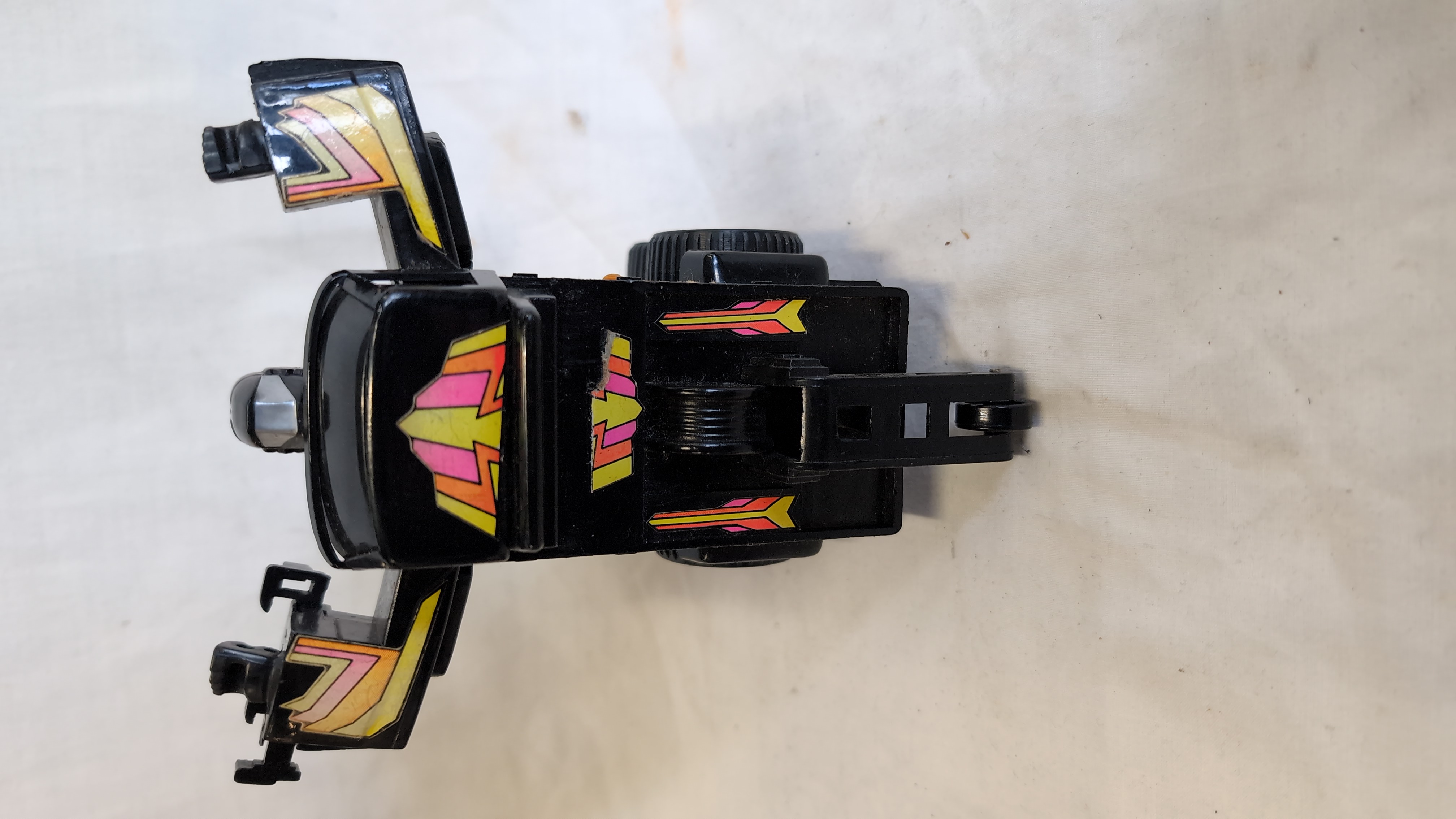 An assortment of vintage plastic and die-cast metal toys featuring several Hasbro Transformers Generation 1 figures and related motorized vehicles. The group includes an Autobot Jazz figure, styled as a silver Porsche 911 with Porsche side decals; a Decepticon Skywarp figure in black and purple; and a Decepticon Ramjet figure in light grey with United States military star decals. Also present is a Hasbro Accelerators motorized racing car, identified as Slayton, featuring a blue body with pink and white Accelerator decals and marked 1989 Hasbro Inc. Made in China on the grey plastic base. A black transforming tow truck with multi-coloured decals and Robom text completes the lot. The Jazz figure is constructed with a die-cast metal chest and plastic components. The seeker jets Skywarp and Ramjet feature die-cast and plastic construction.