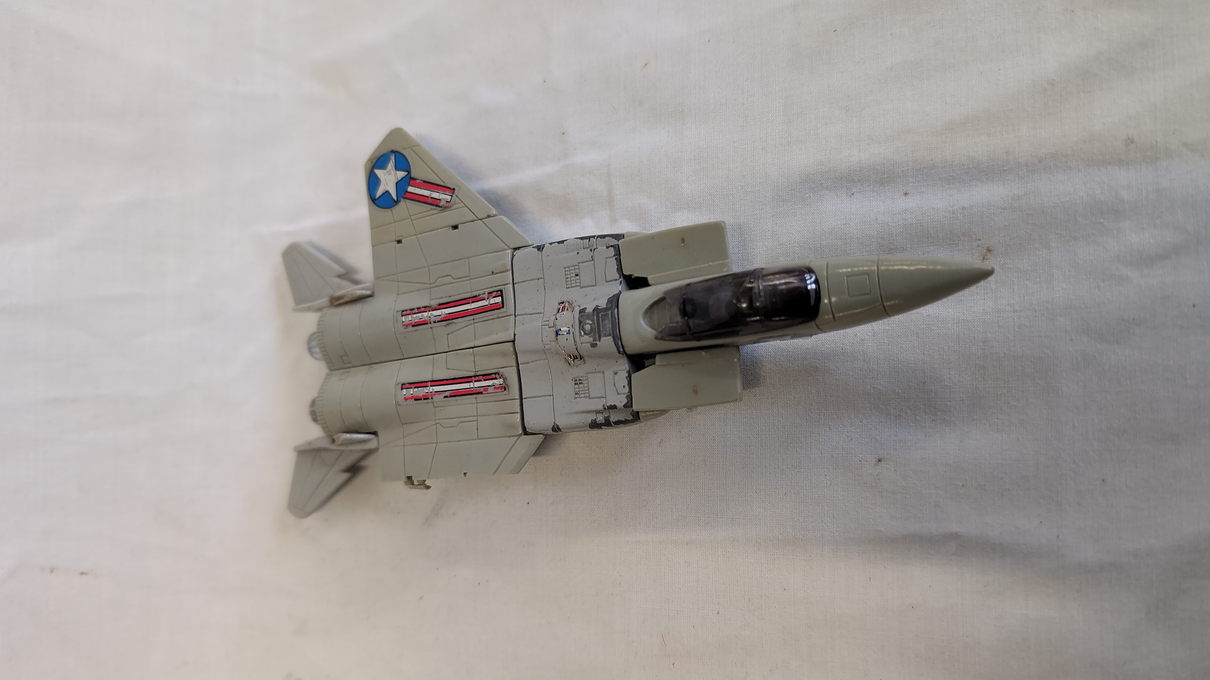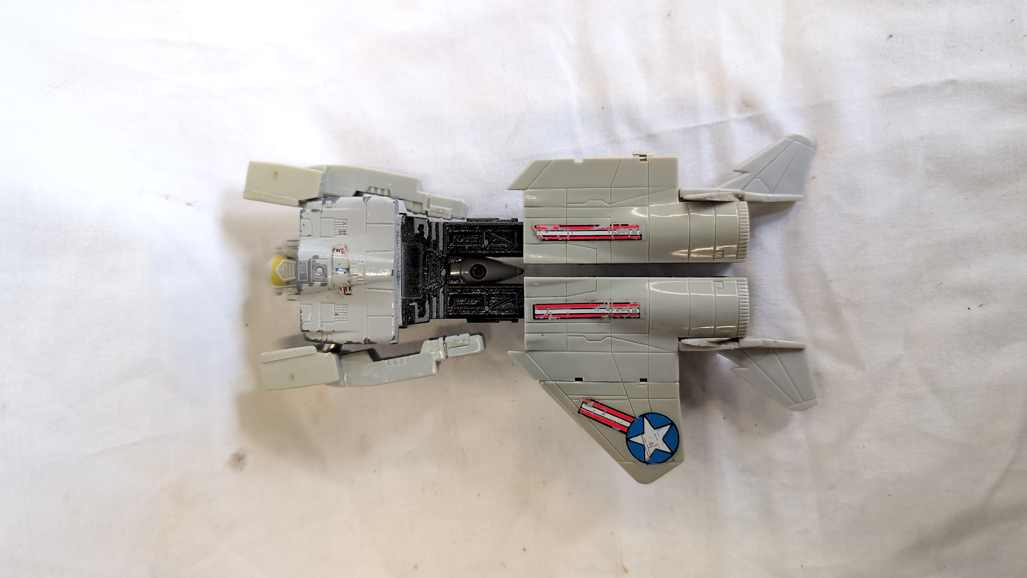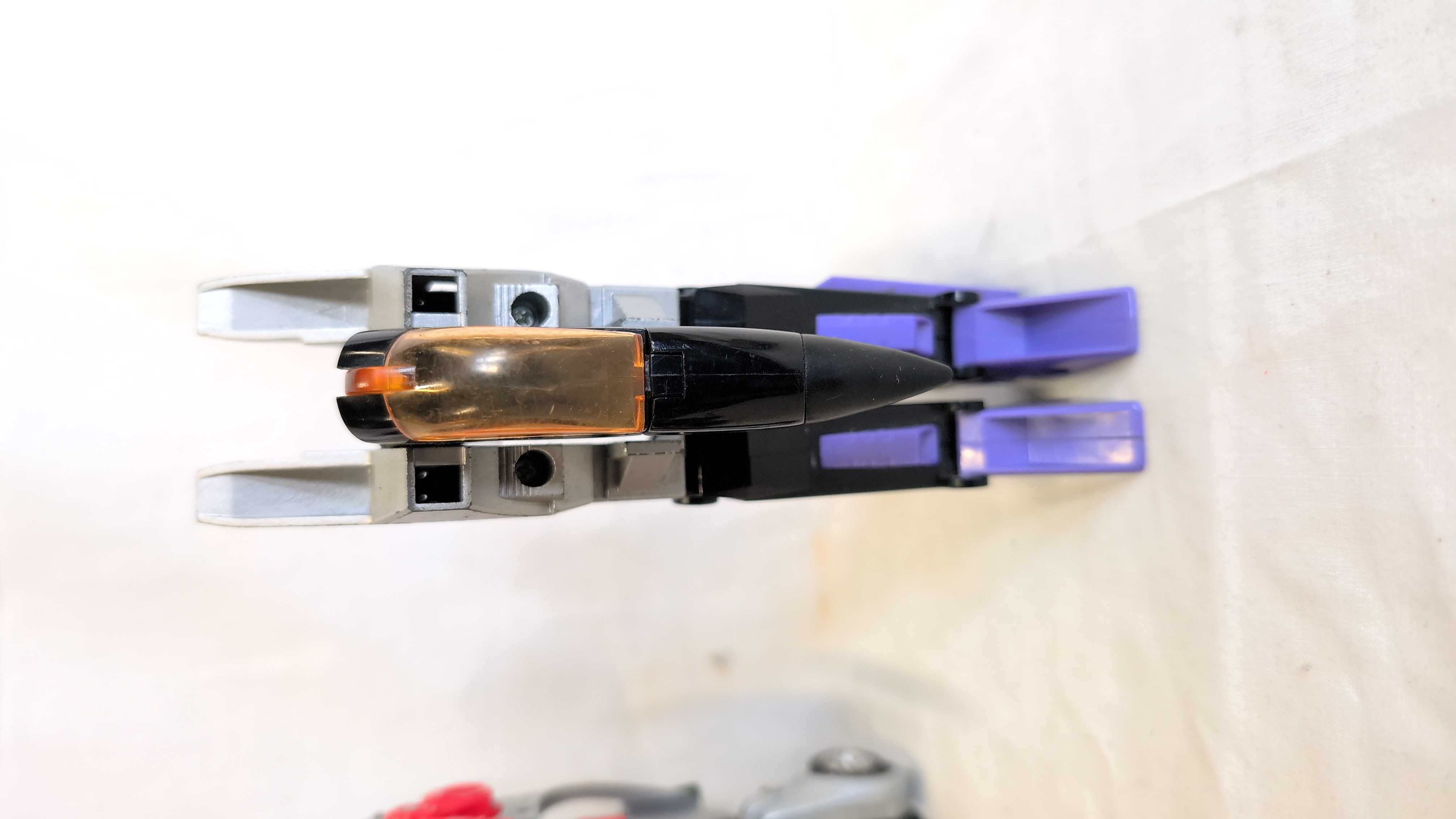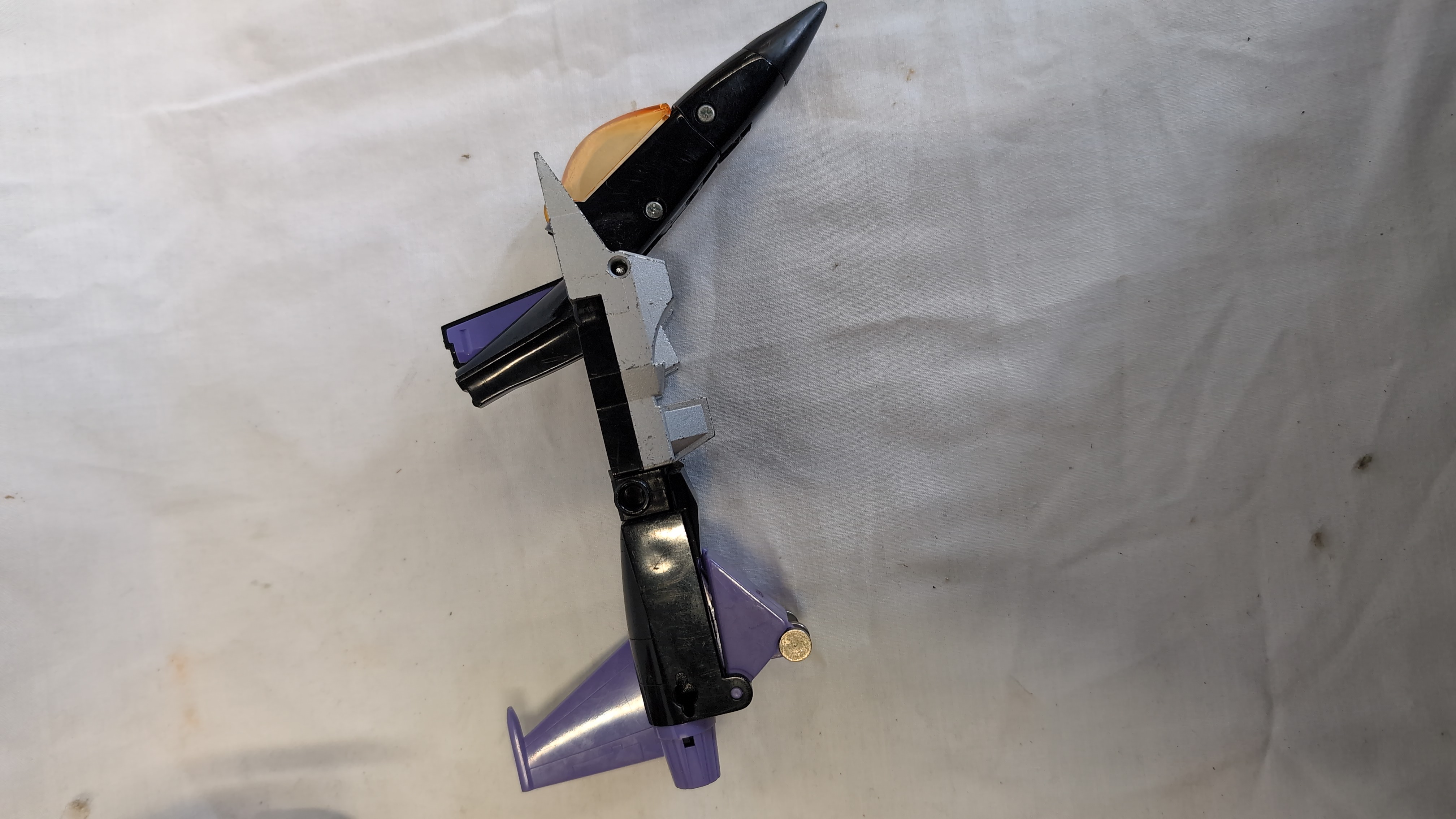 An assortment of vintage plastic and die-cast metal toys featuring several Hasbro Transformers Generation 1 figures and related motorized vehicles. The group includes an Autobot Jazz figure, styled as a silver Porsche 911 with Porsche side decals; a Decepticon Skywarp figure in black and purple; and a Decepticon Ramjet figure in light grey with United States military star decals. Also present is a Hasbro Accelerators motorized racing car, identified as Slayton, featuring a blue body with pink and white Accelerator decals and marked 1989 Hasbro Inc. Made in China on the grey plastic base. A black transforming tow truck with multi-coloured decals and Robom text completes the lot. The Jazz figure is constructed with a die-cast metal chest and plastic components. The seeker jets Skywarp and Ramjet feature die-cast and plastic construction.