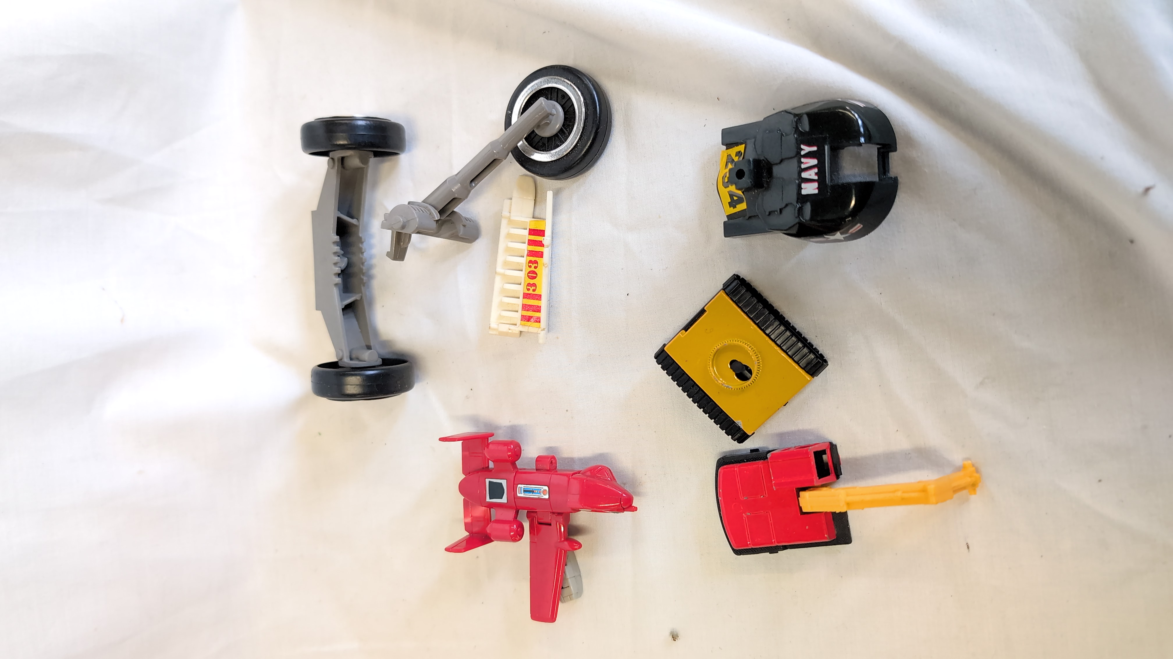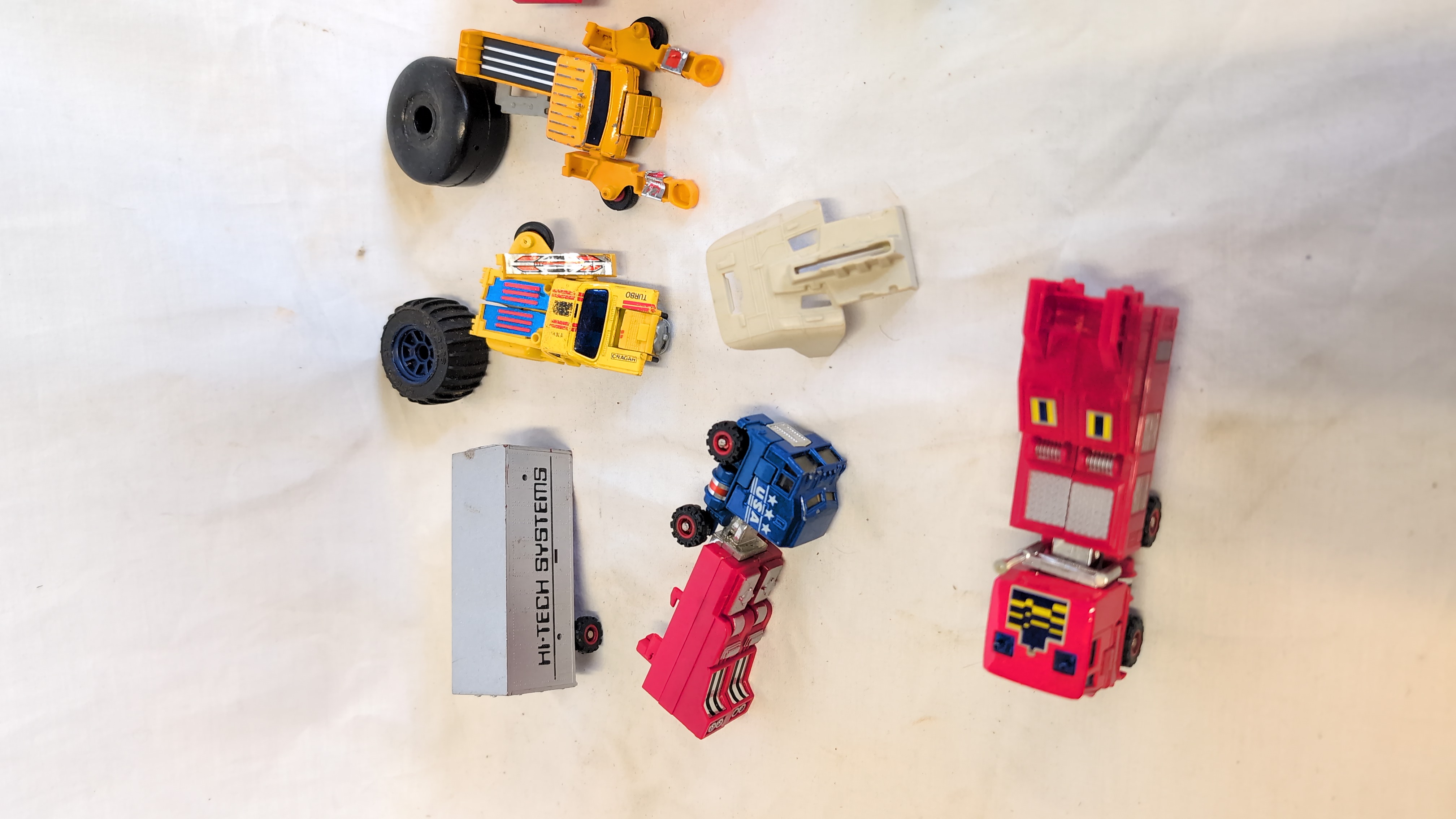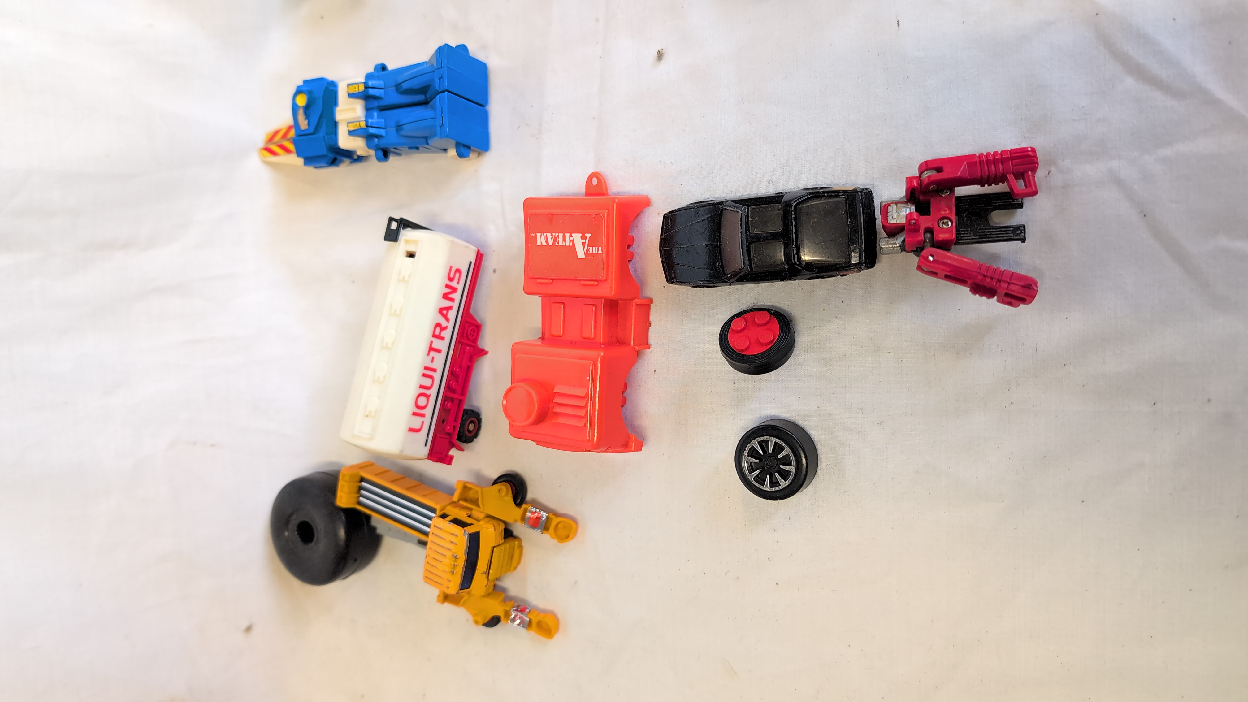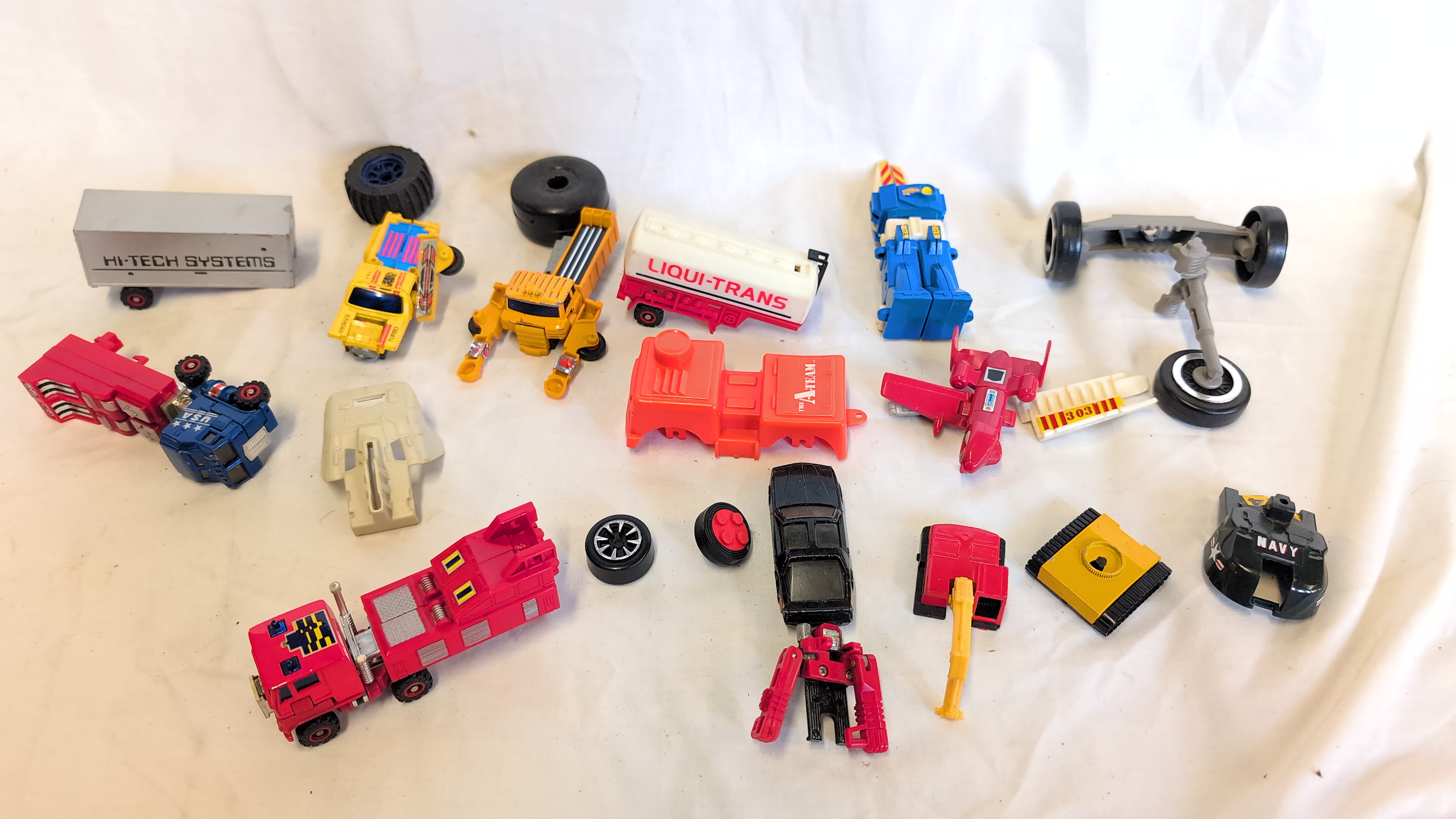 A collection of vintage toy vehicles and robotic components primarily dating from the 1980s, including items from the Hasbro Transformers and Tonka/Bandai GoBots lines. The lot comprises a variety of moulded plastic and die-cast metal pieces. Notable items include a yellow construction vehicle component from the Transformers Constructicon series, a blue articulated robot, a red jet aircraft, and a black car body with attached red robotic limbs. The collection also features a red plastic chassis part bearing The A-Team television series branding. Several commercial vehicle components are present, including a silver trailer marked HI-TECH SYSTEMS and a white tanker trailer marked LIQUI-TRANS. Other markings include USA with stars on a blue cab, NAVY 234 on a black component, and TURBO CRAGAR on a yellow vehicle. A white ladder accessory is marked 303. The lot includes various loose structural components such as large grey plastic landing gear, axles, and individual wheels.
