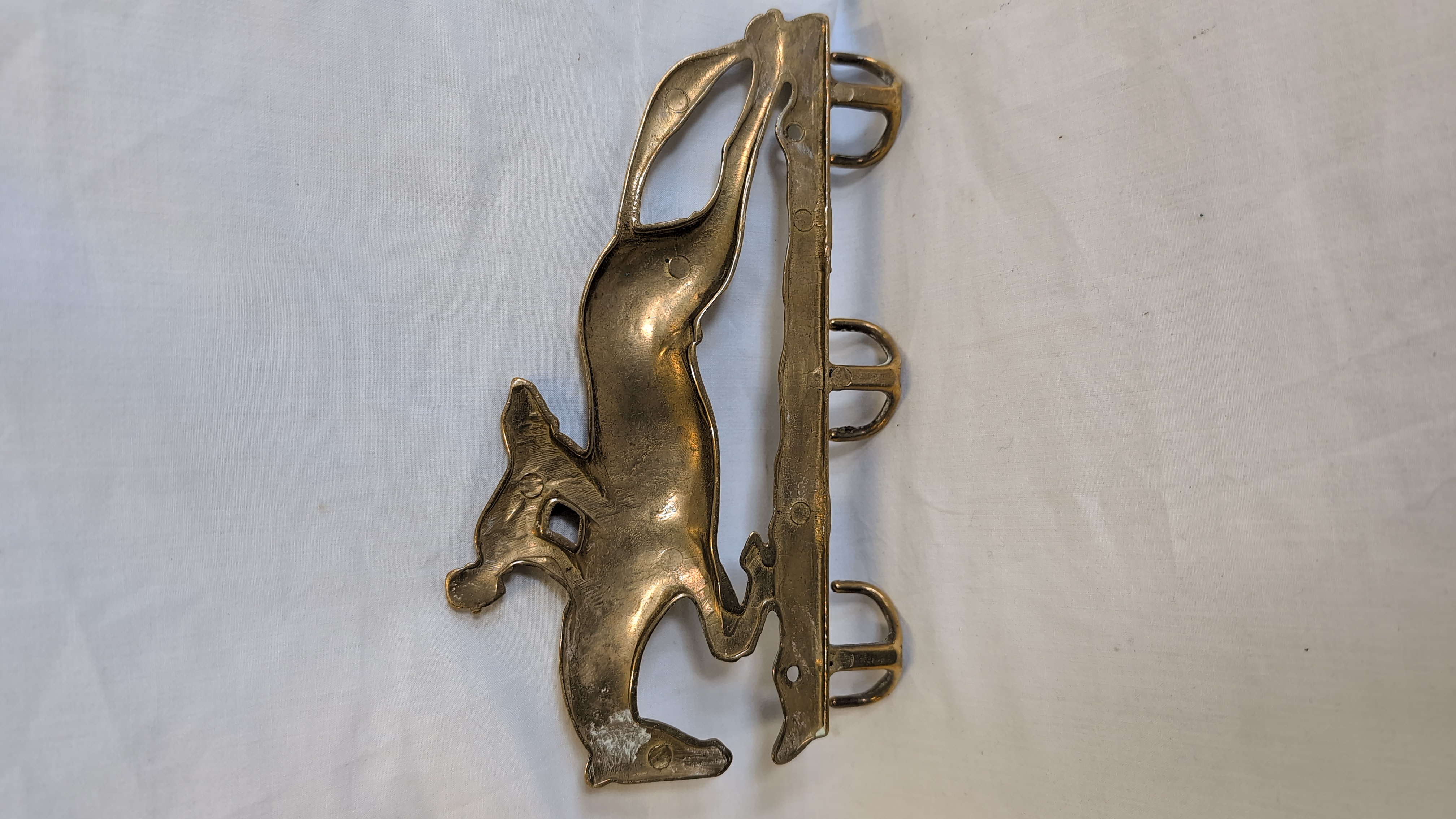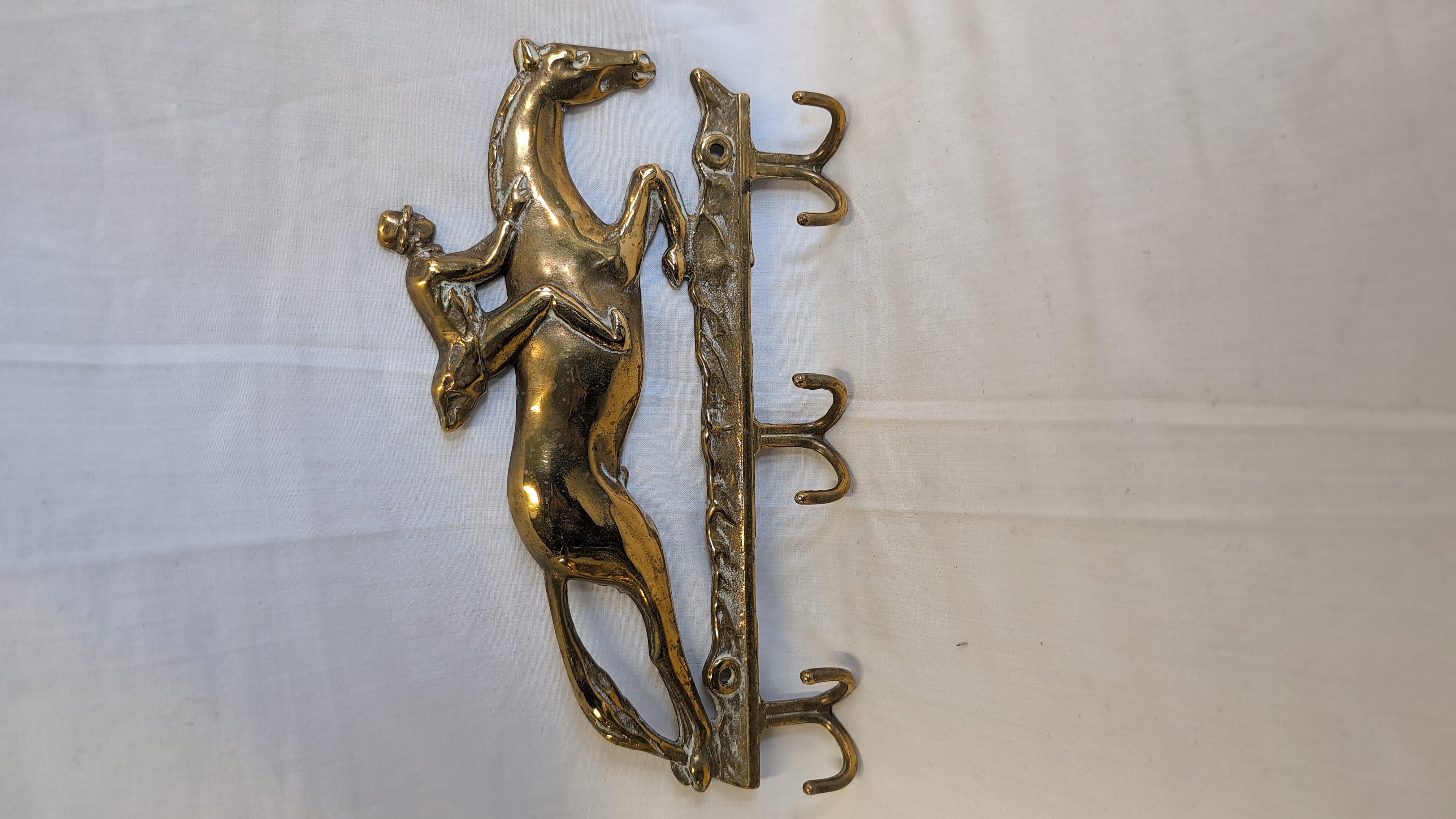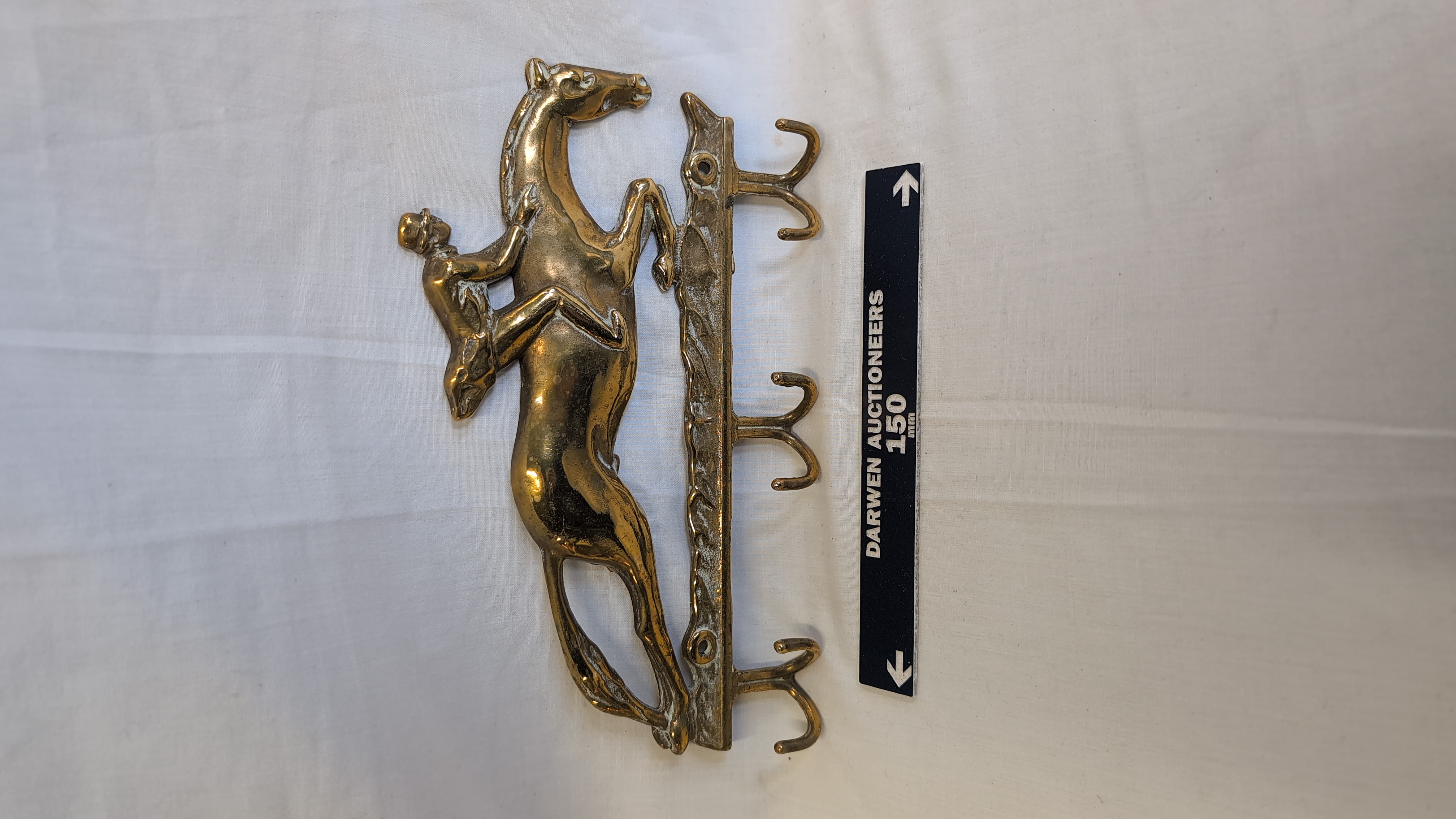 A decorative wall hook rack manufactured from cast brass, featuring a sporting equestrian motif. The design depicts a rearing horse and rider in profile. This central figure is joined to a vertical mounting bar that carries three double-pronged hooks. The rack is designed for wall mounting and includes two pre-drilled circular holes. The reverse of the casting is hollowed and shows characteristic marks from the manufacturing process.