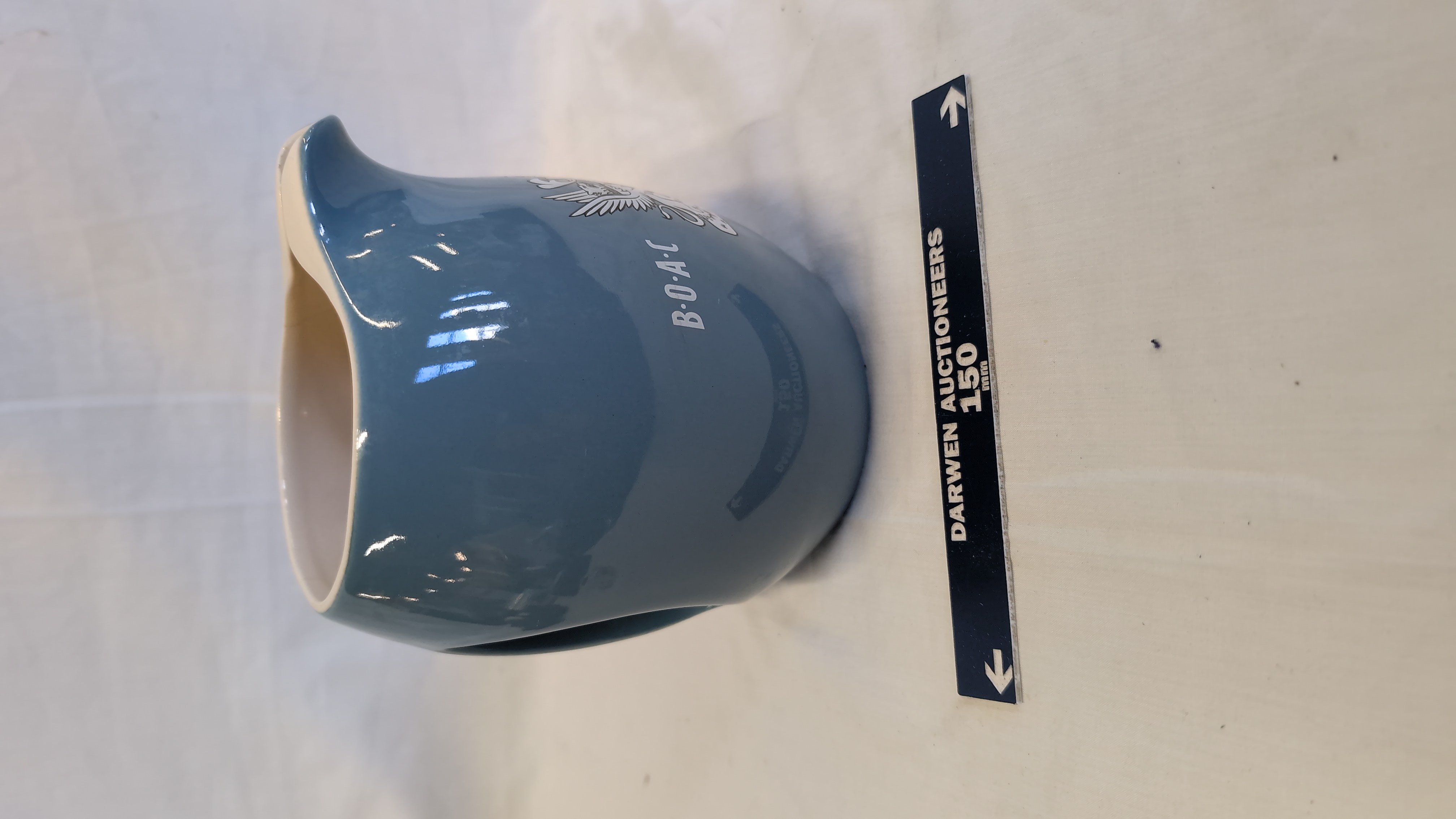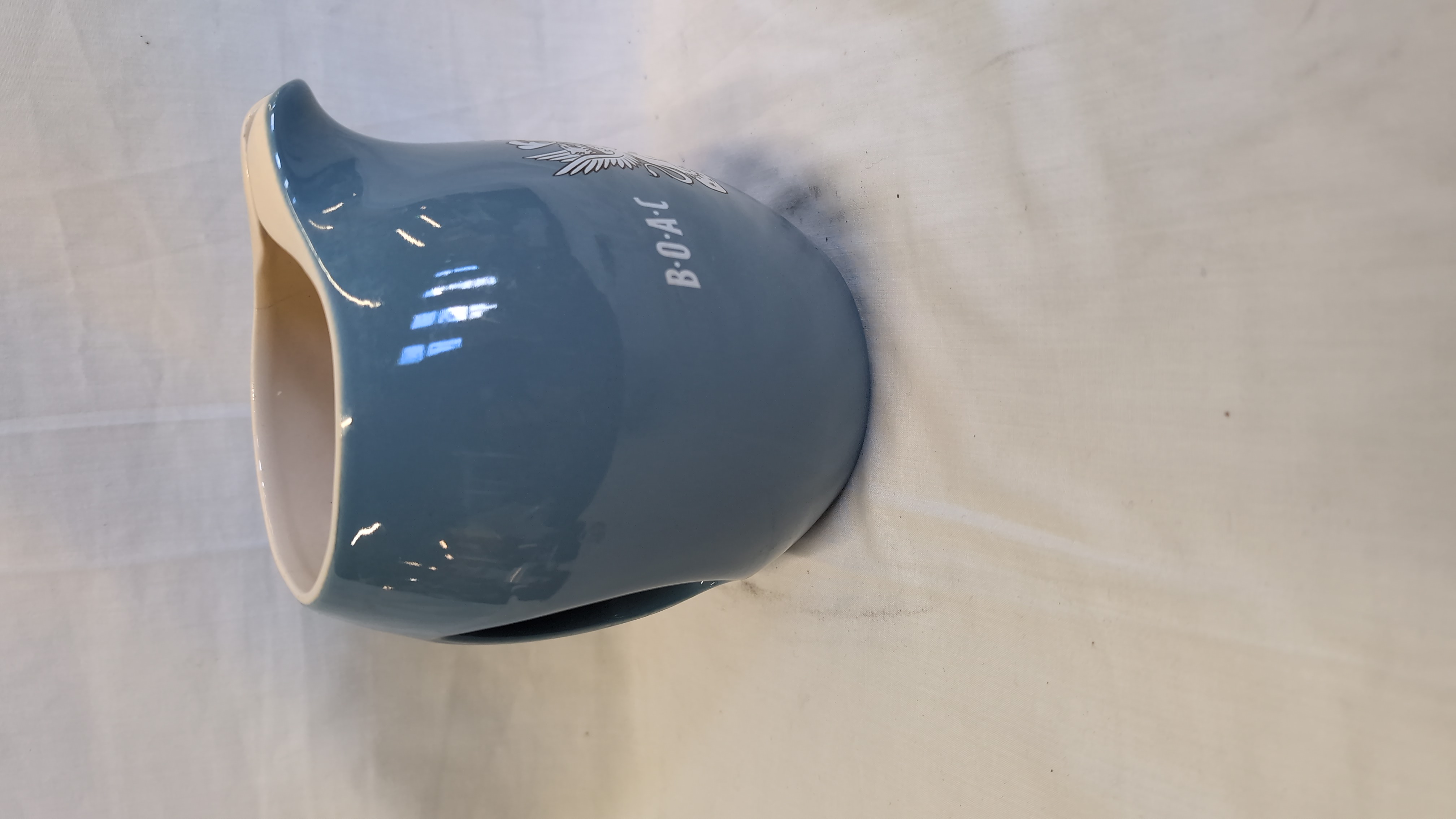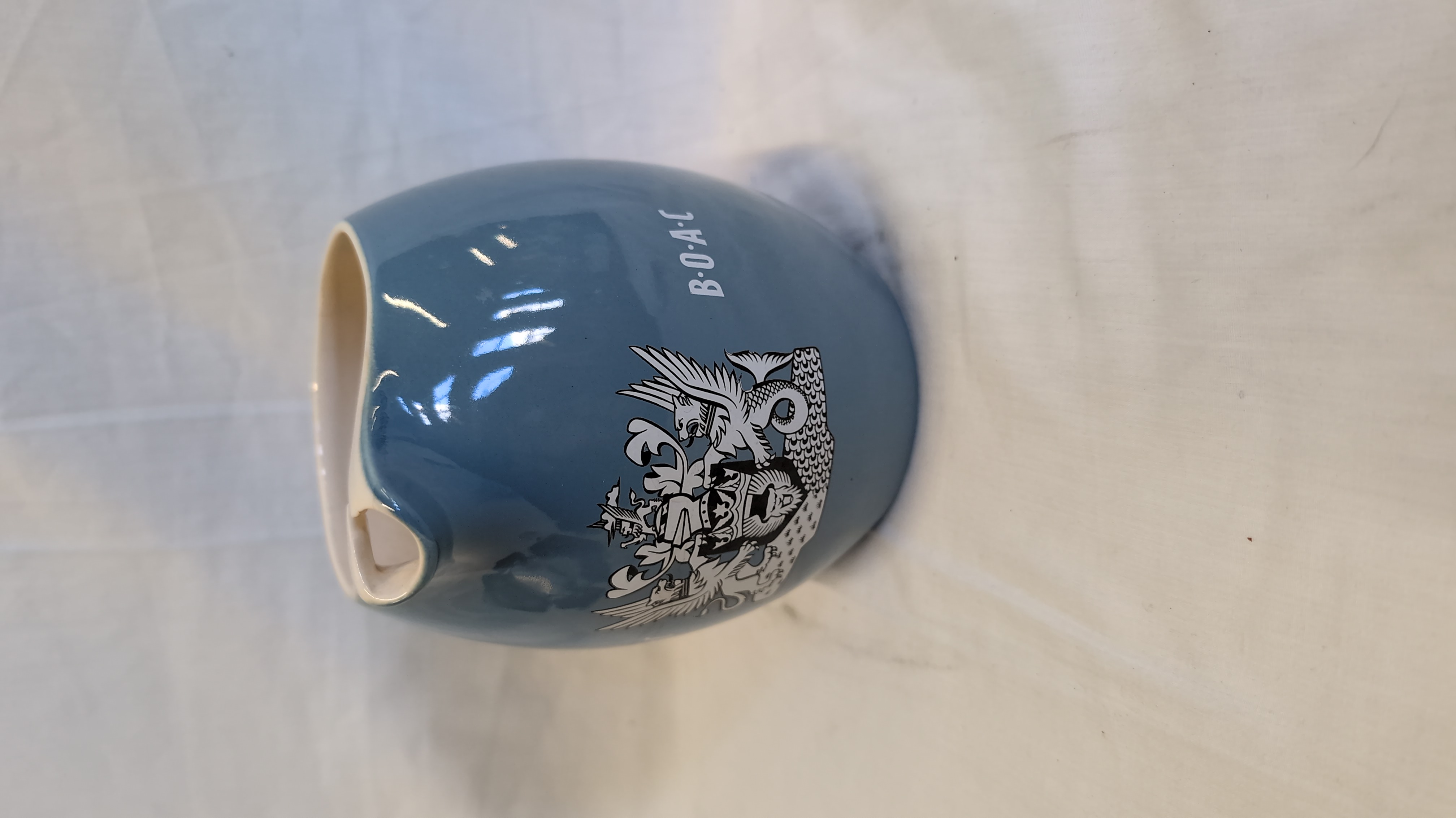 A bulbous-shaped water jug manufactured by Wade for the British Overseas Airways Corporation (BOAC). The piece is constructed from glazed earthenware, featuring a mid-blue exterior and a white interior. The exterior displays a white transfer-printed BOAC logo above a heraldic crest depicting a shield supported by a griffin and a winged sea-lion. The jug incorporates a pinched pouring spout and an integrated handle following the body contour. The base bears the printed mark for Wade Regicor, London, England, flanked by vertical leaf motifs.