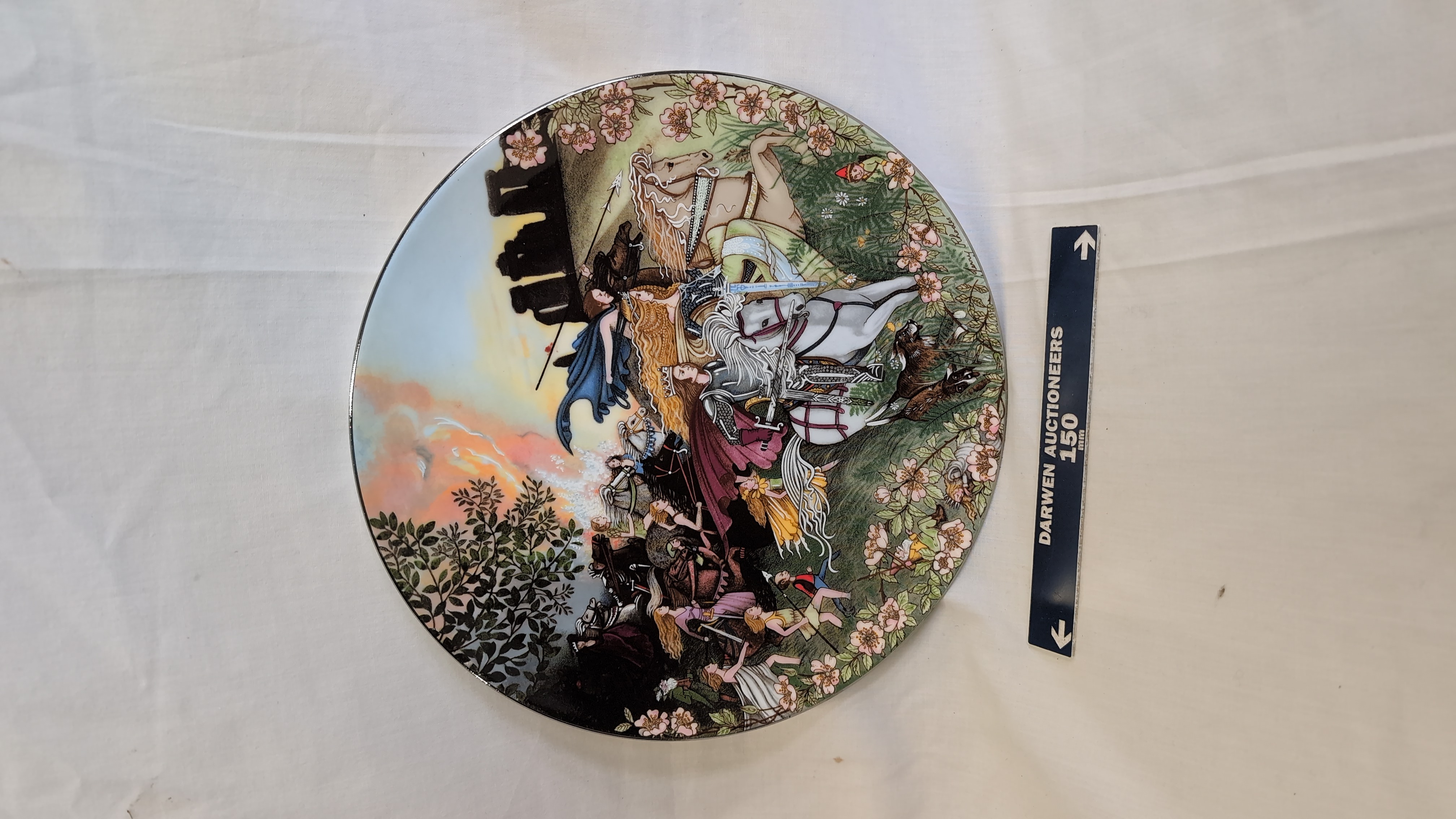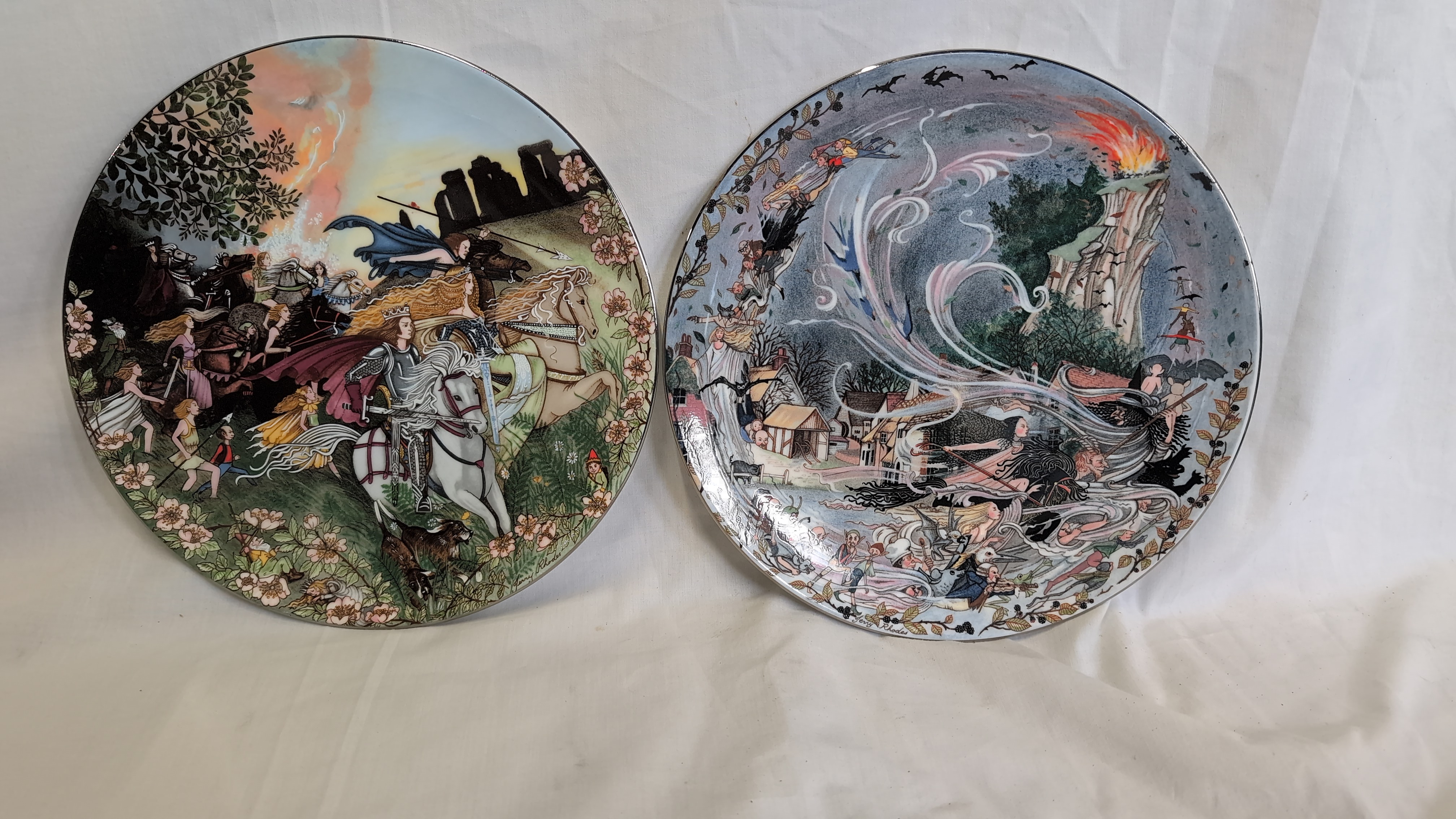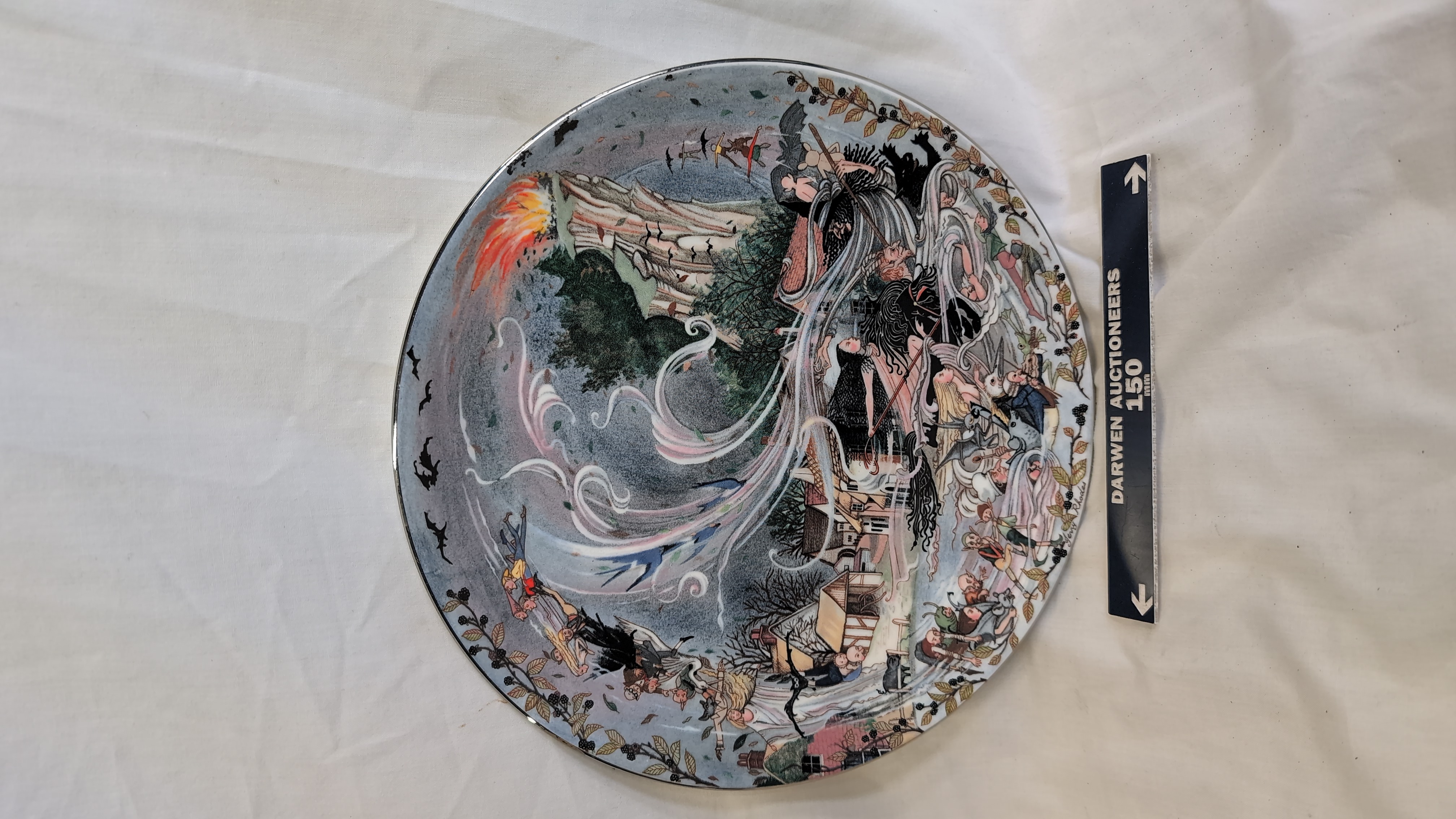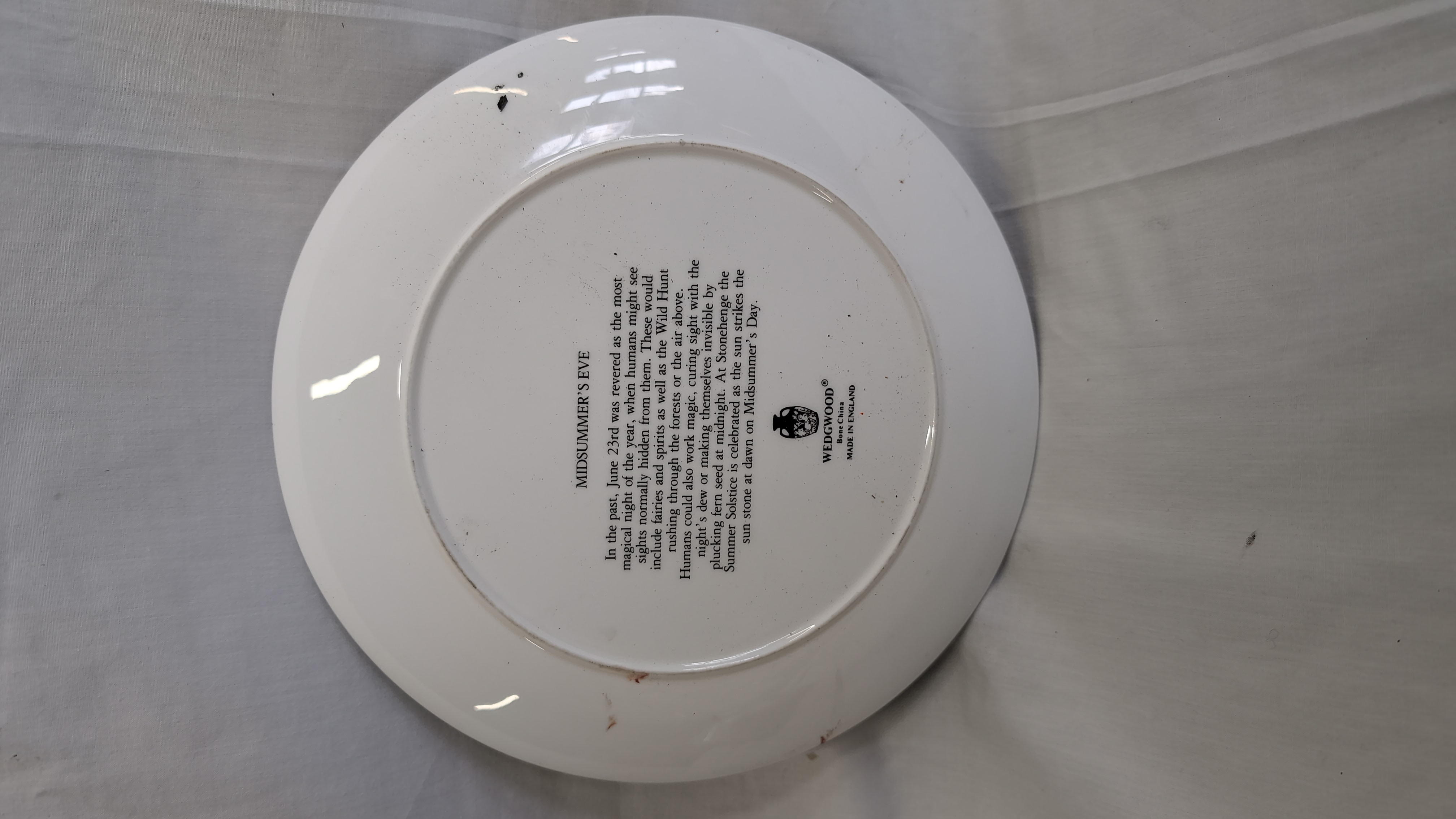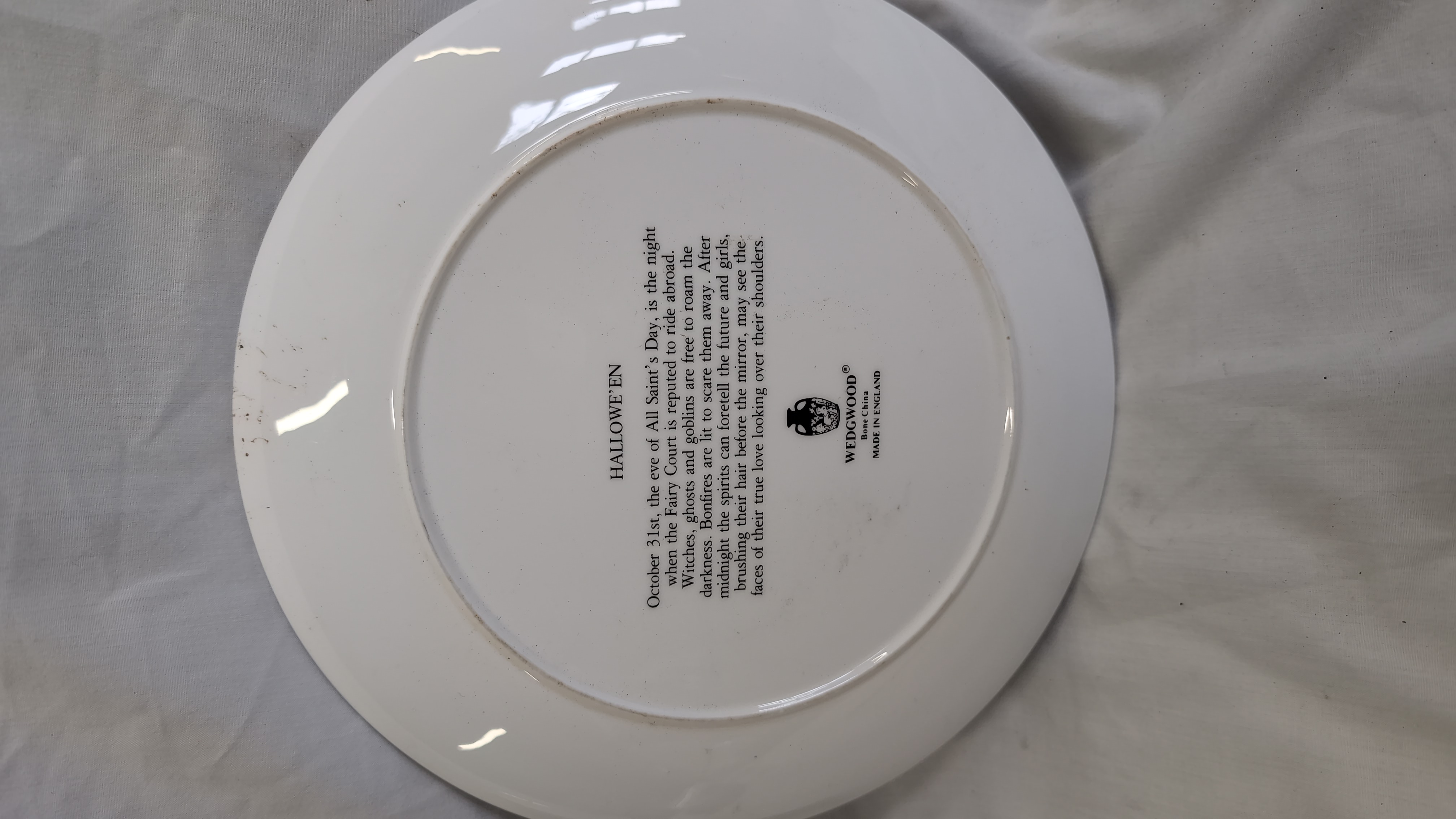 A pair of circular bone china decorative wall plates from the Feasts and Festivals series manufactured by Wedgwood, England. Each plate features a detailed transfer-printed illustration by the artist Harry Rhodes, whose signature is incorporated into the lower right edge of the designs. The first plate, titled Midsummer’s Eve, depicts a folkloric procession of figures on horseback, including a knight in silver-coloured armour and various fairy folk, with the megaliths of Stonehenge visible in the background. The scene is framed by a border of pink floral sprigs. The second plate, titled Hallowe’en, shows a nocturnal scene of witches, goblins, and mythical creatures flying over a rural village landscape towards a fire-topped peak. This scene is bordered by dark foliage and berries. Both plates are finished with a silver-toned rim. The reverse of each plate bears the title of the work in capital letters, a descriptive paragraph regarding the specific folklore depicted, and the Wedgwood vase backstamp with the text WEDGWOOD Bone China MADE IN ENGLAND.