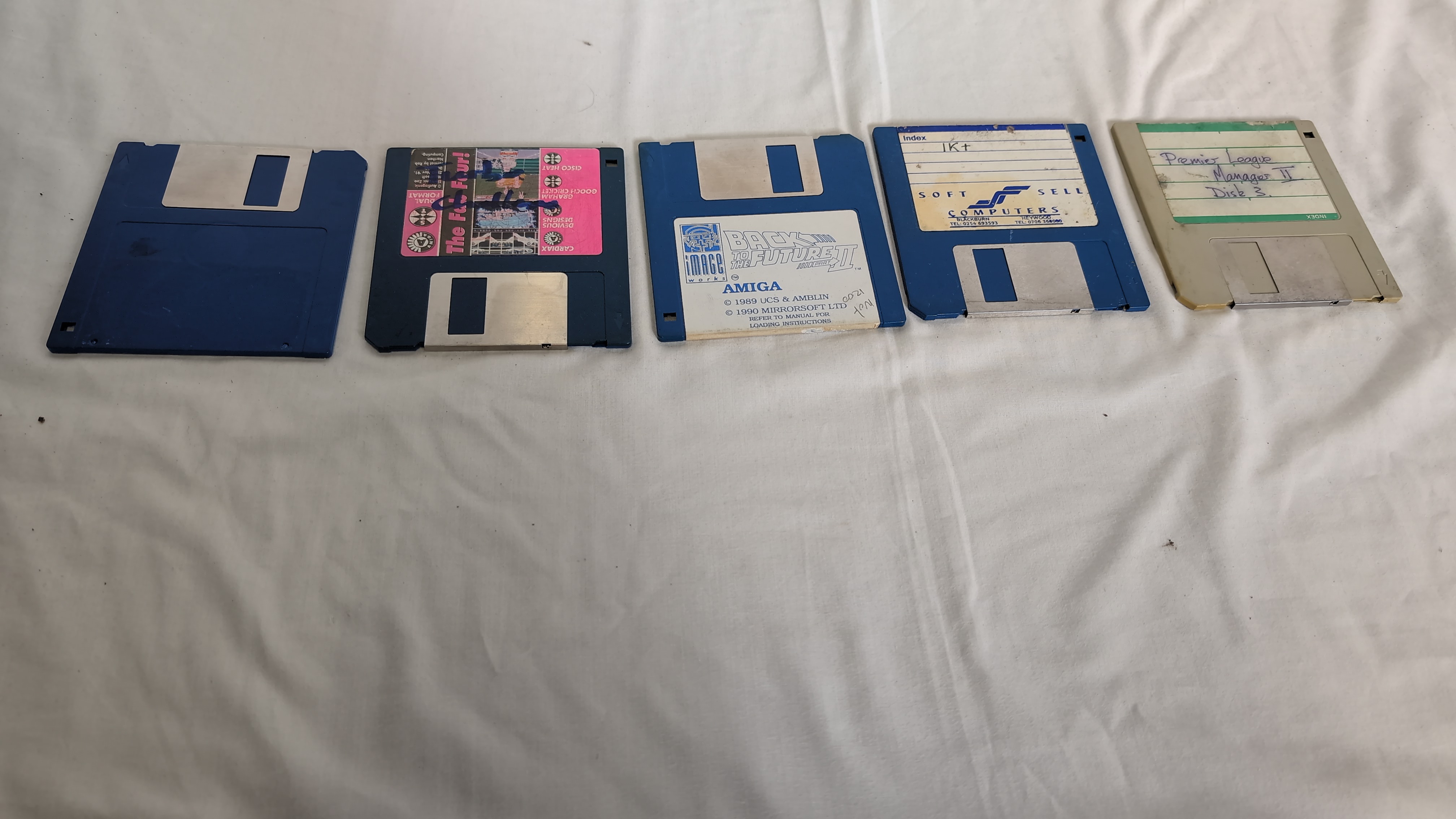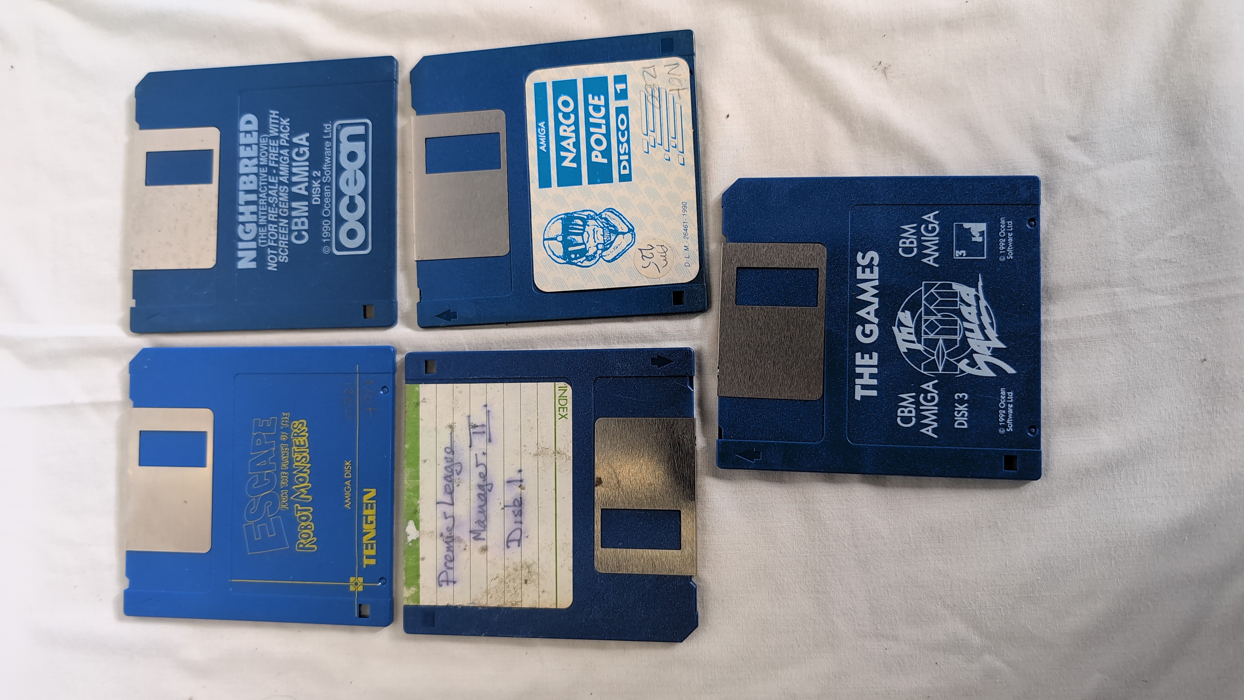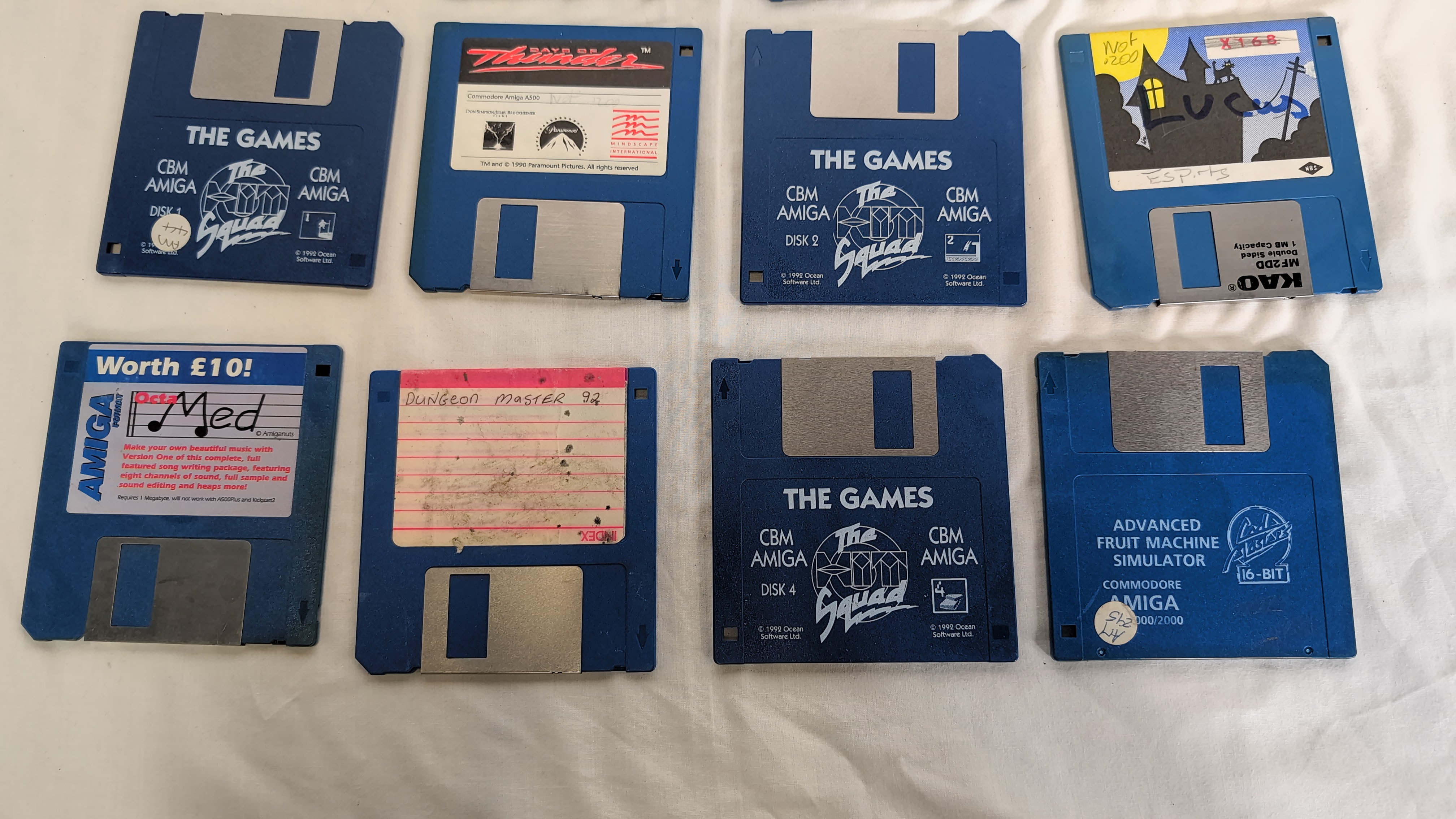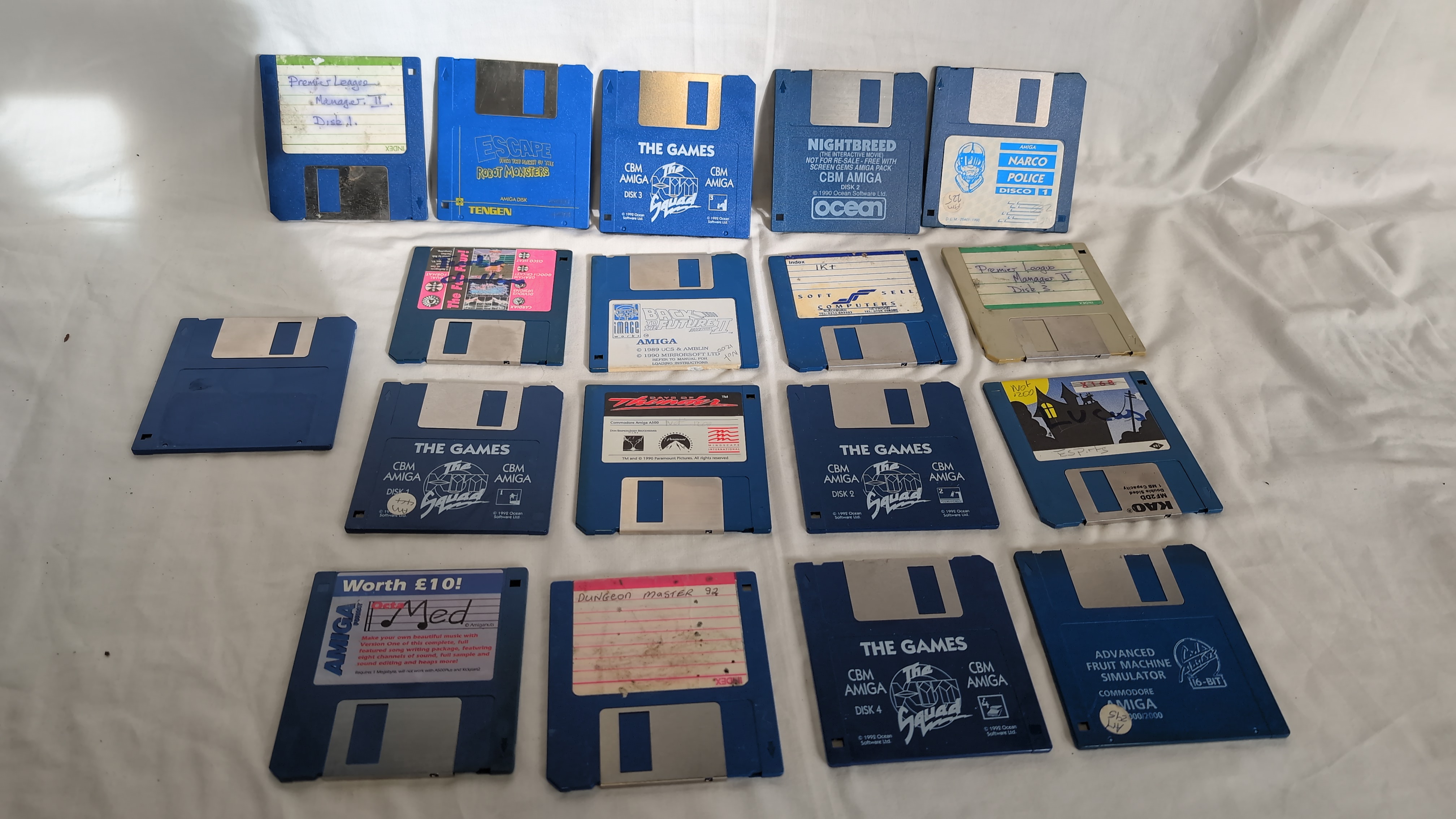 This collection consists of seventeen 3.5-inch floppy disks designed for the Commodore Amiga home computer system. The assortment includes a mix of original retail releases, budget re-releases, and disks with handwritten labels. Notable titles include Escape from the Planet of the Robot Monsters published by Tengen, and several titles from Ocean Software Ltd. including Nightbreed and Narco Police. Also present is Back to the Future Part II by Mirrorsoft Ltd. and Days of Thunder by Mindscape International. A set of four disks from The Hit Squad budget label titled The Games (Disks 1 through 4) is included, along with Advanced Fruit Machine Simulator. The Fun Fear! compilation disk is also present. Several disks feature handwritten identification for titles such as Premier League Manager II (Disks 1 and 3), Dungeon Master 92, IK plus, and a disk labelled OctaMED, which was a music utility often distributed on magazine cover disks. One disk displays a graphic associated with LucasArts titles and the handwritten name Lucas. The disks are constructed of blue or grey plastic casings with metal shutters and paper labels. Markings include CBM AMIGA, Ocean, Tengen, Mirrorsoft Ltd., and The Hit Squad.