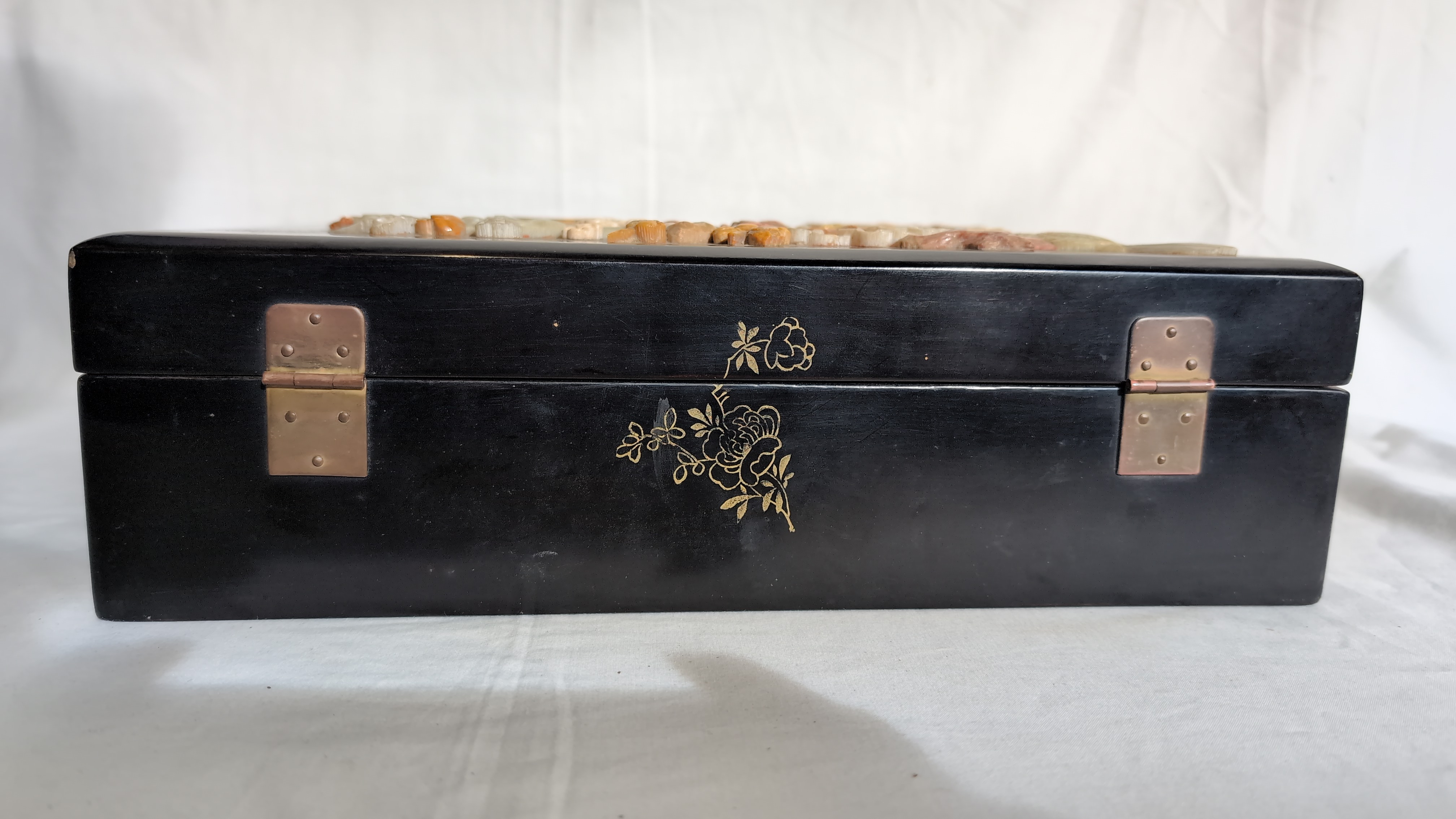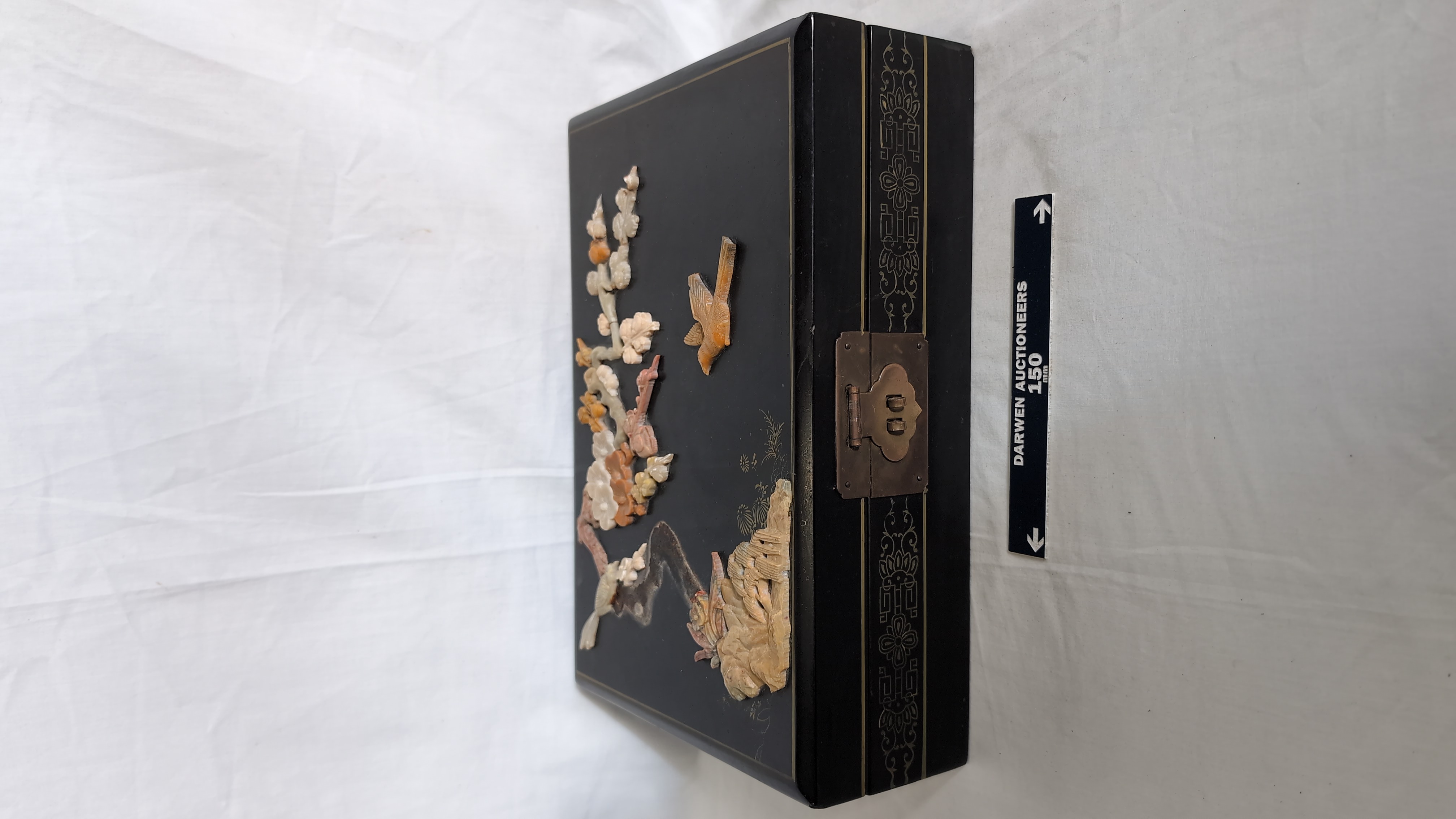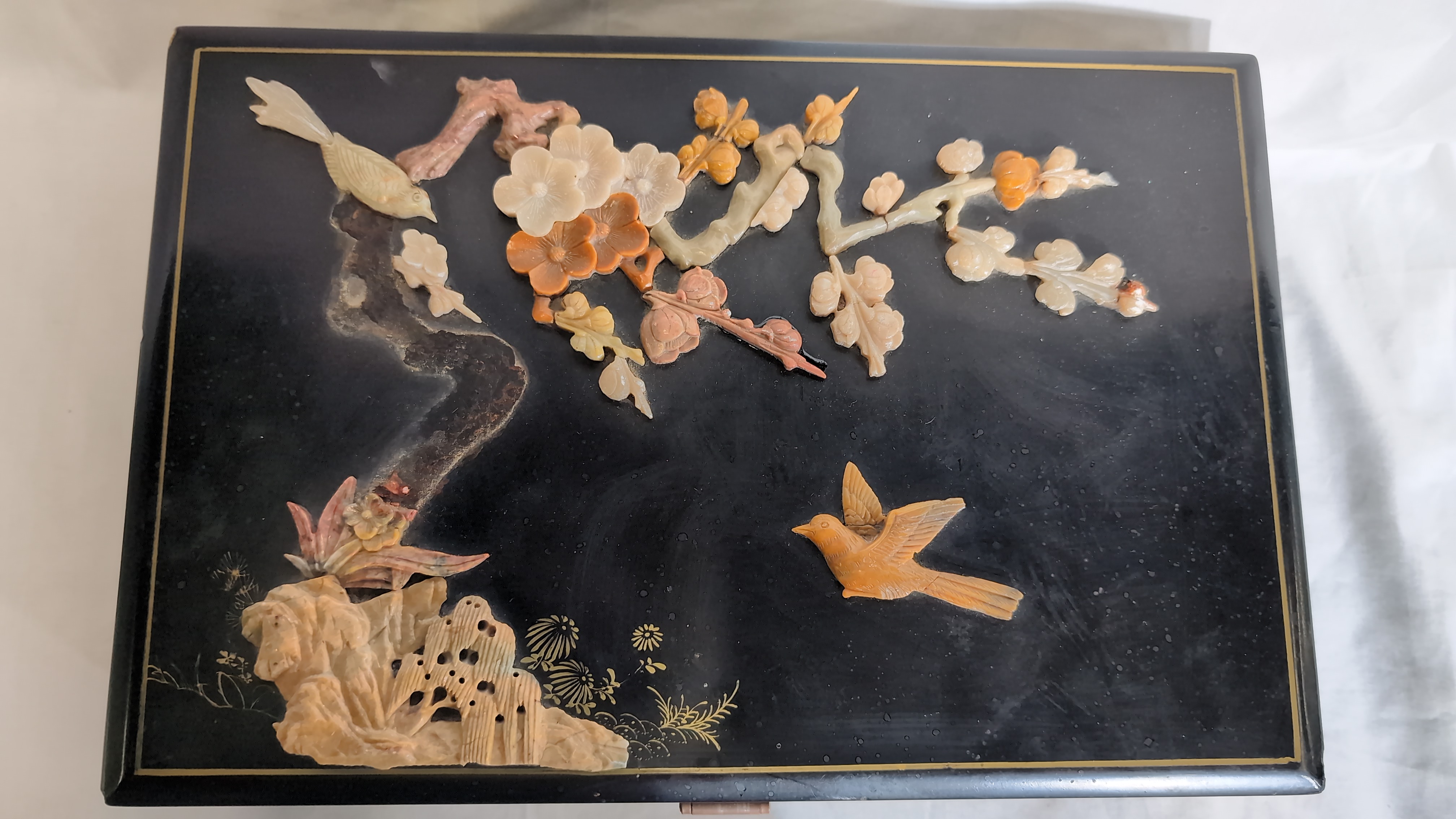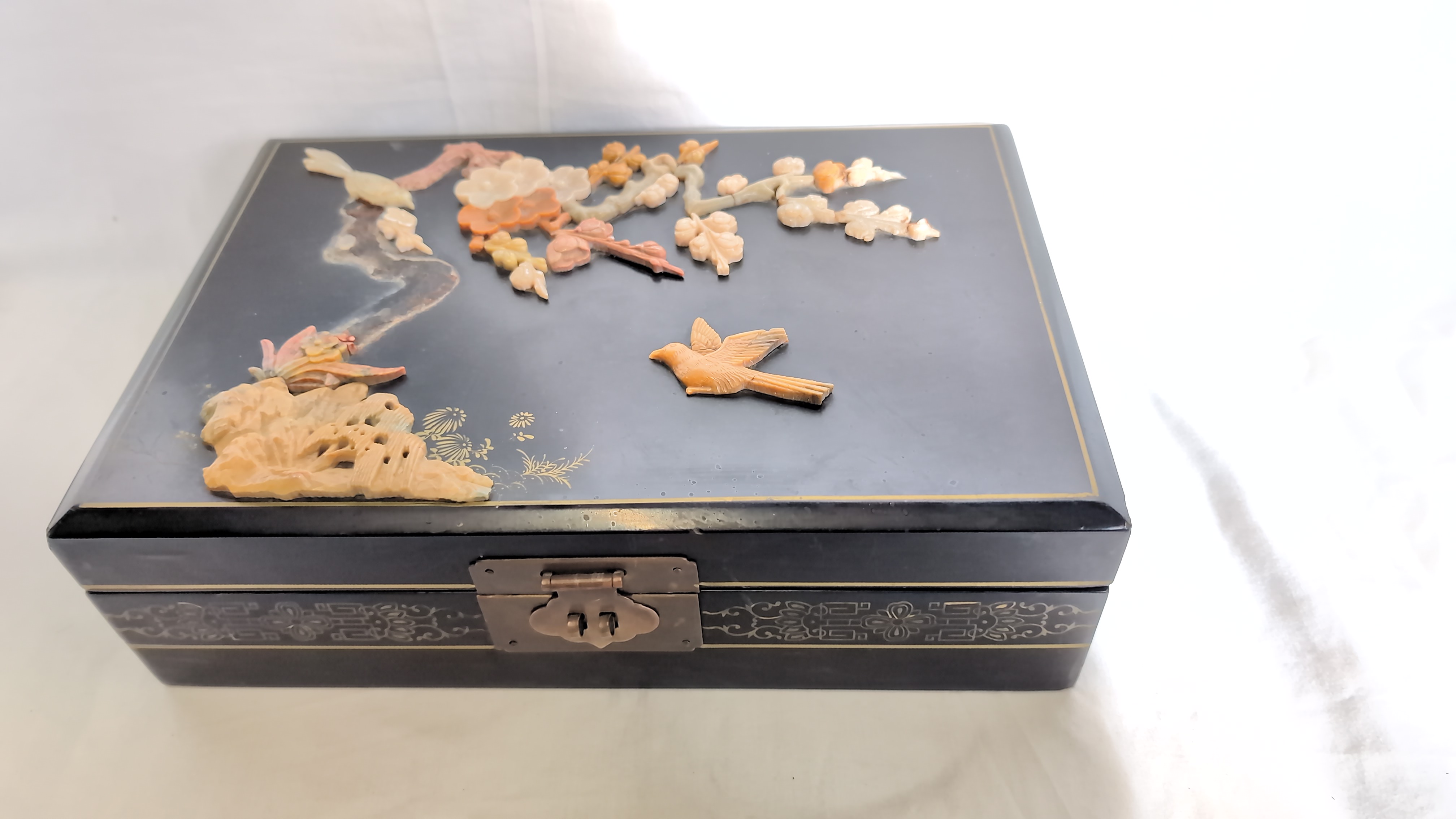 This rectangular jewellery box is constructed from black lacquered wood. The hinged lid features a high-relief scene composed of applied carved hardstone pieces, depicting two birds amongst a flowering plum blossom branch above a garden rockery. The scene is further embellished with hand-painted gilt highlights. The front, back, and sides of the box are decorated with gilt-painted scrolling foliate and geometric borders. The box is fitted with brass-toned metal hinges and a traditional ruyi-shaped lock plate with a twin-pin clasp. The interior is lined with a vibrant turquoise-blue fabric, featuring a divided tray with a ring-roll section and a larger compartment. A shaped mirror is set into the underside of the lid. No maker marks or reign marks are visible on the base or interior.