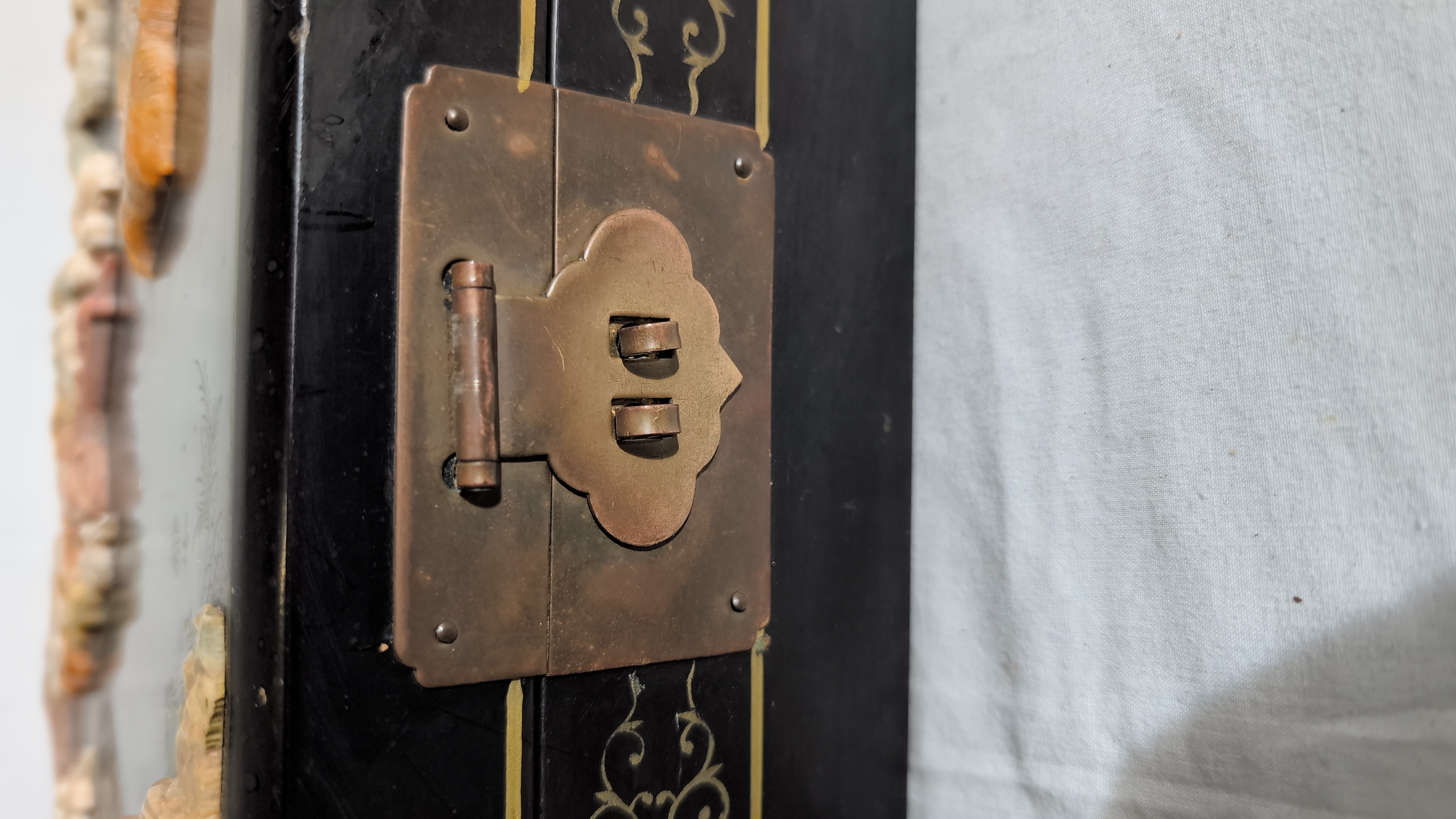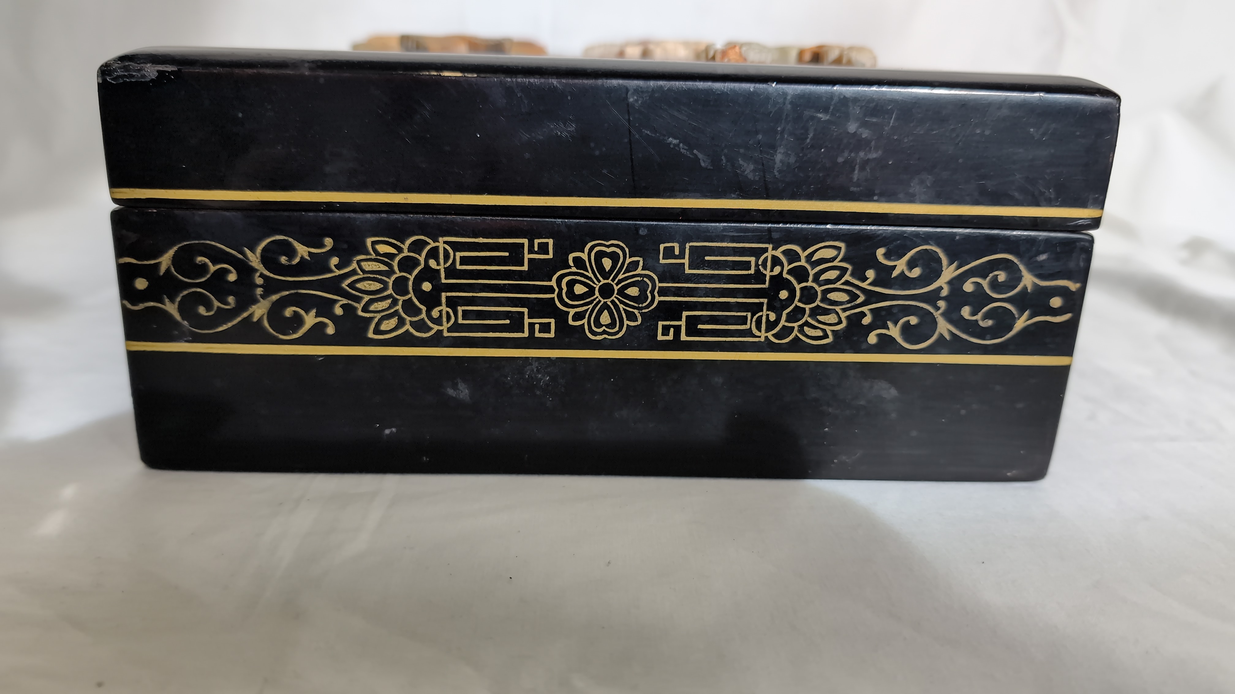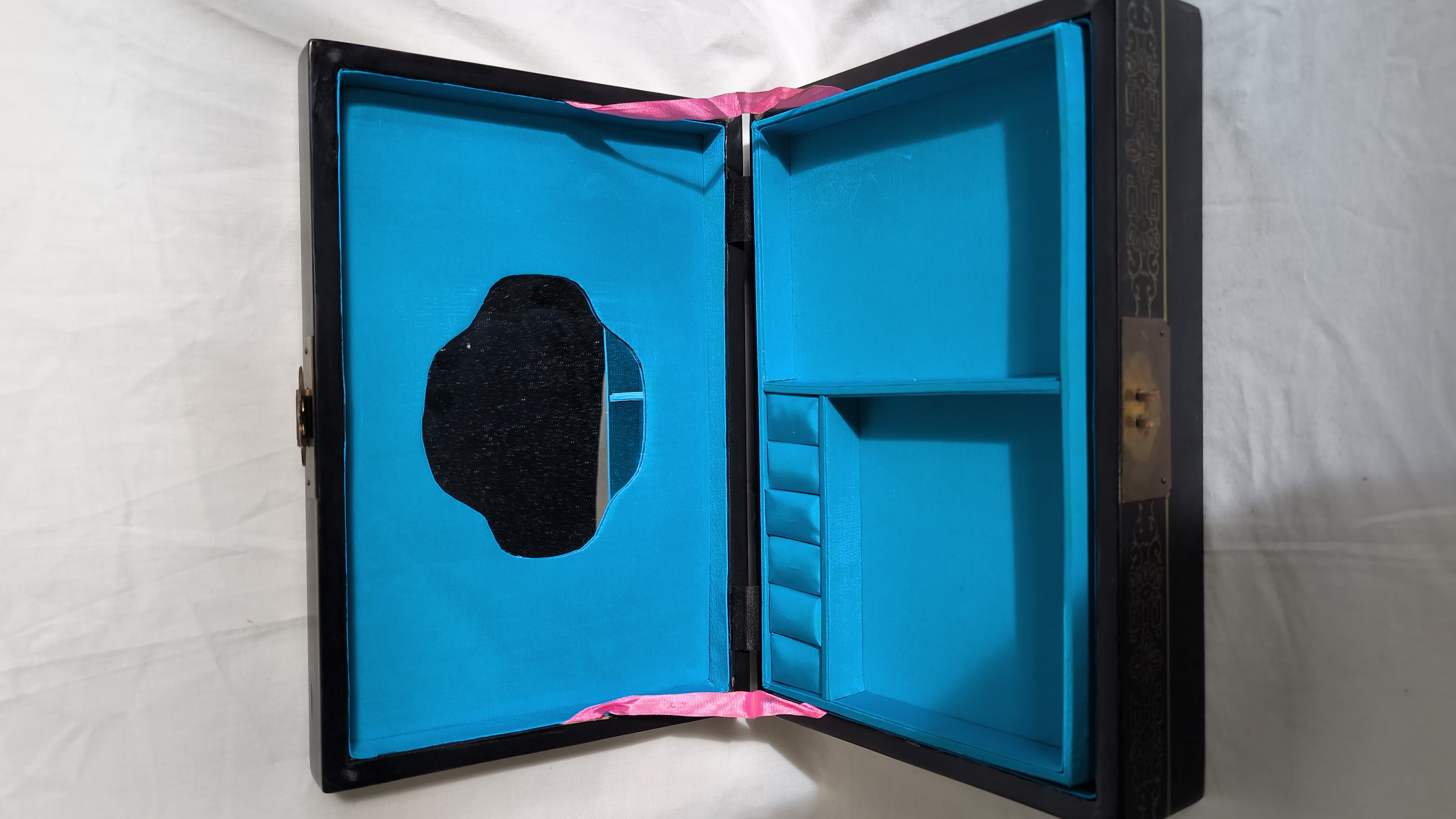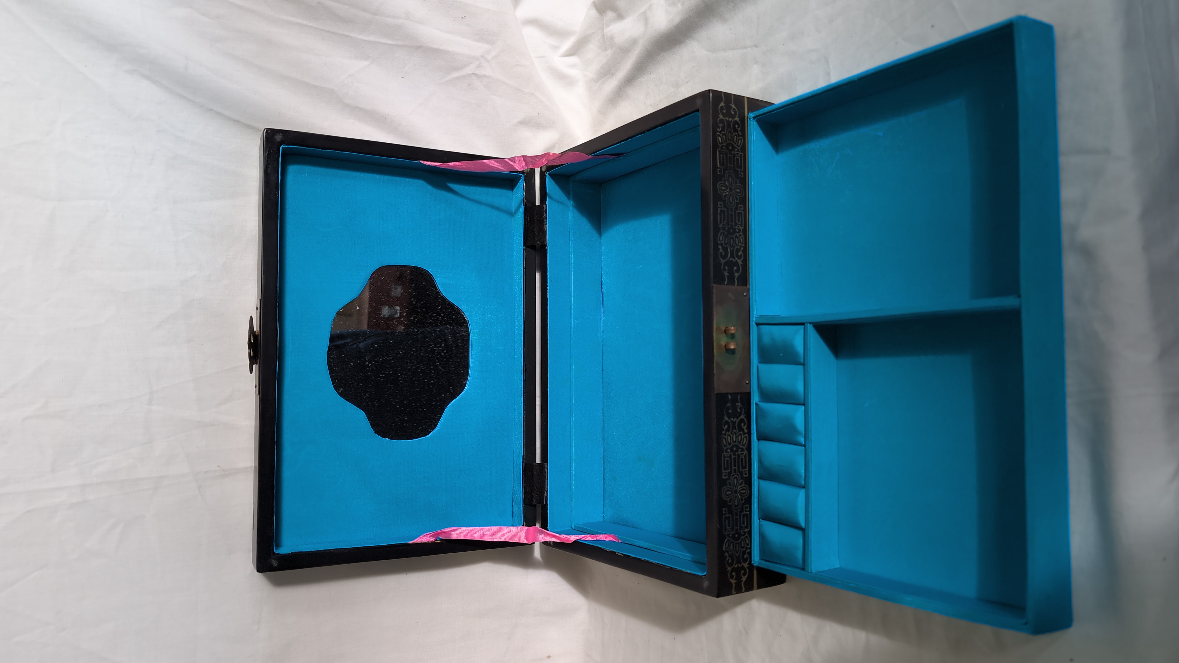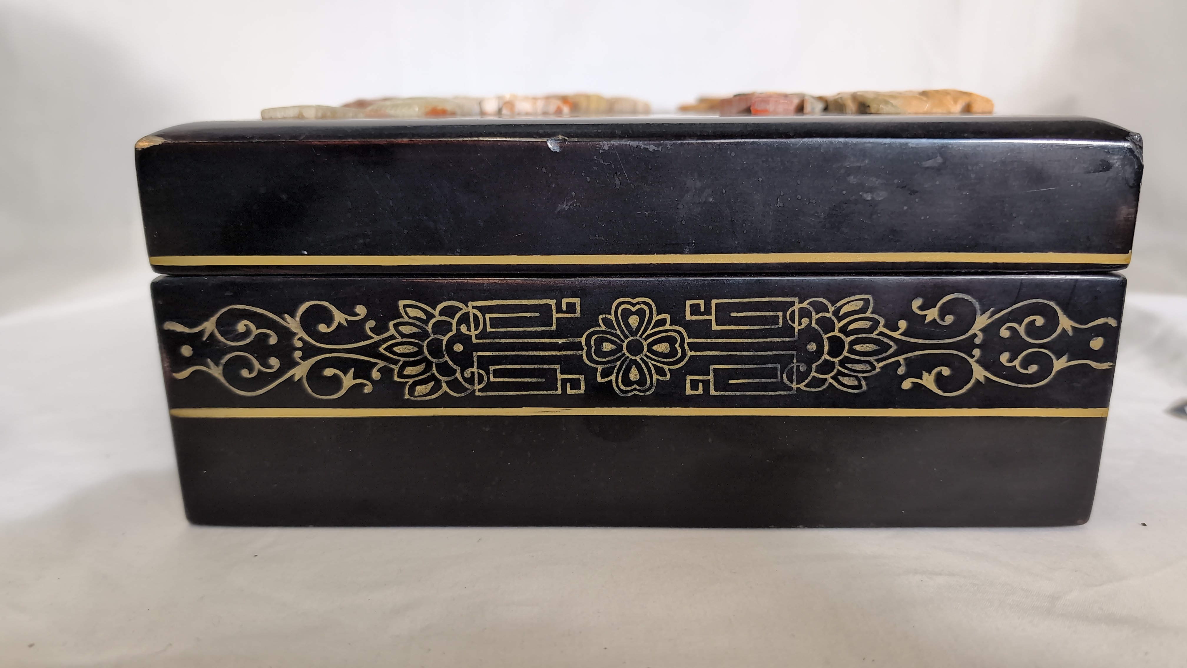 This rectangular jewellery box is constructed from black lacquered wood. The hinged lid features a high-relief scene composed of applied carved hardstone pieces, depicting two birds amongst a flowering plum blossom branch above a garden rockery. The scene is further embellished with hand-painted gilt highlights. The front, back, and sides of the box are decorated with gilt-painted scrolling foliate and geometric borders. The box is fitted with brass-toned metal hinges and a traditional ruyi-shaped lock plate with a twin-pin clasp. The interior is lined with a vibrant turquoise-blue fabric, featuring a divided tray with a ring-roll section and a larger compartment. A shaped mirror is set into the underside of the lid. No maker marks or reign marks are visible on the base or interior.