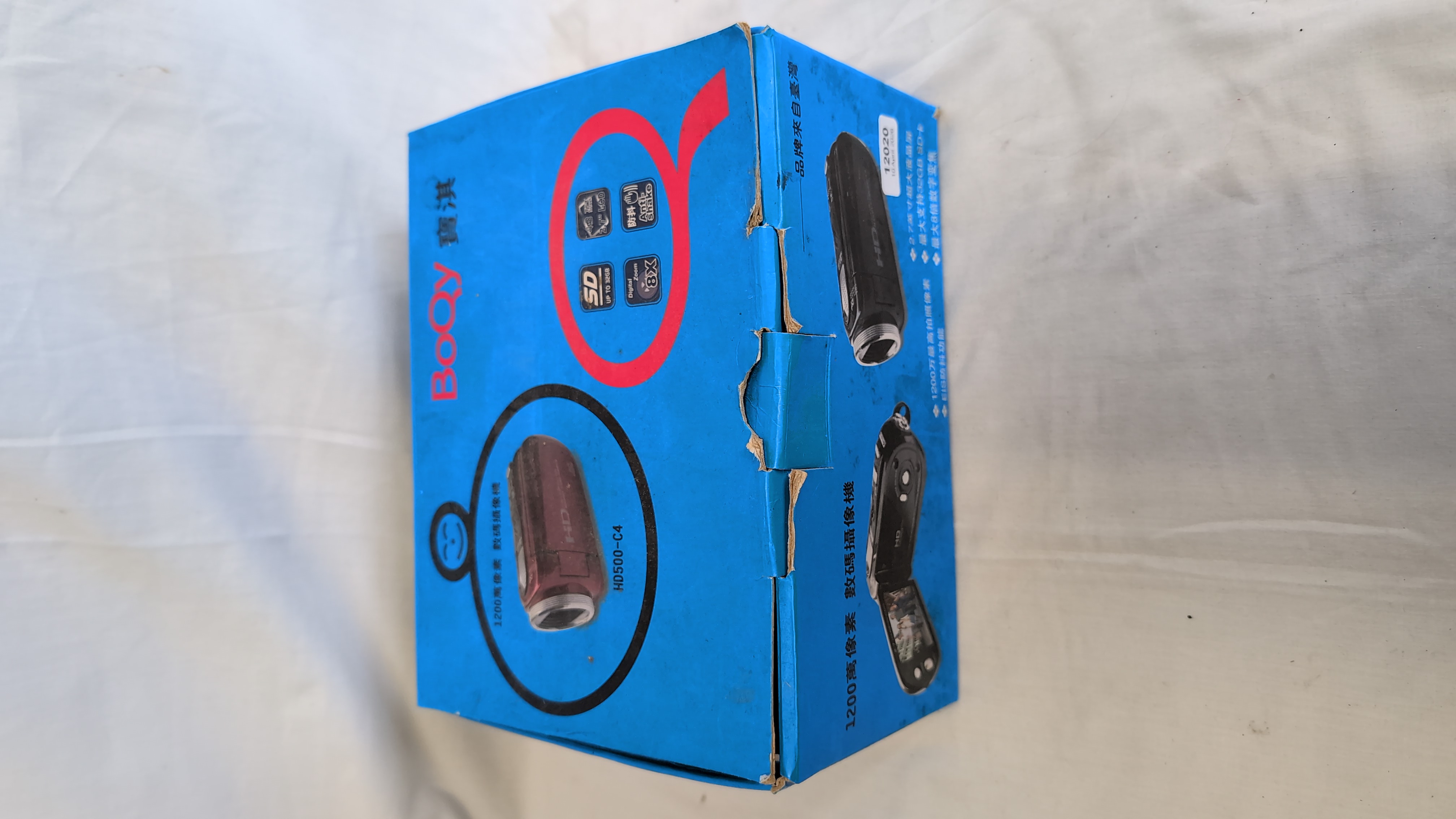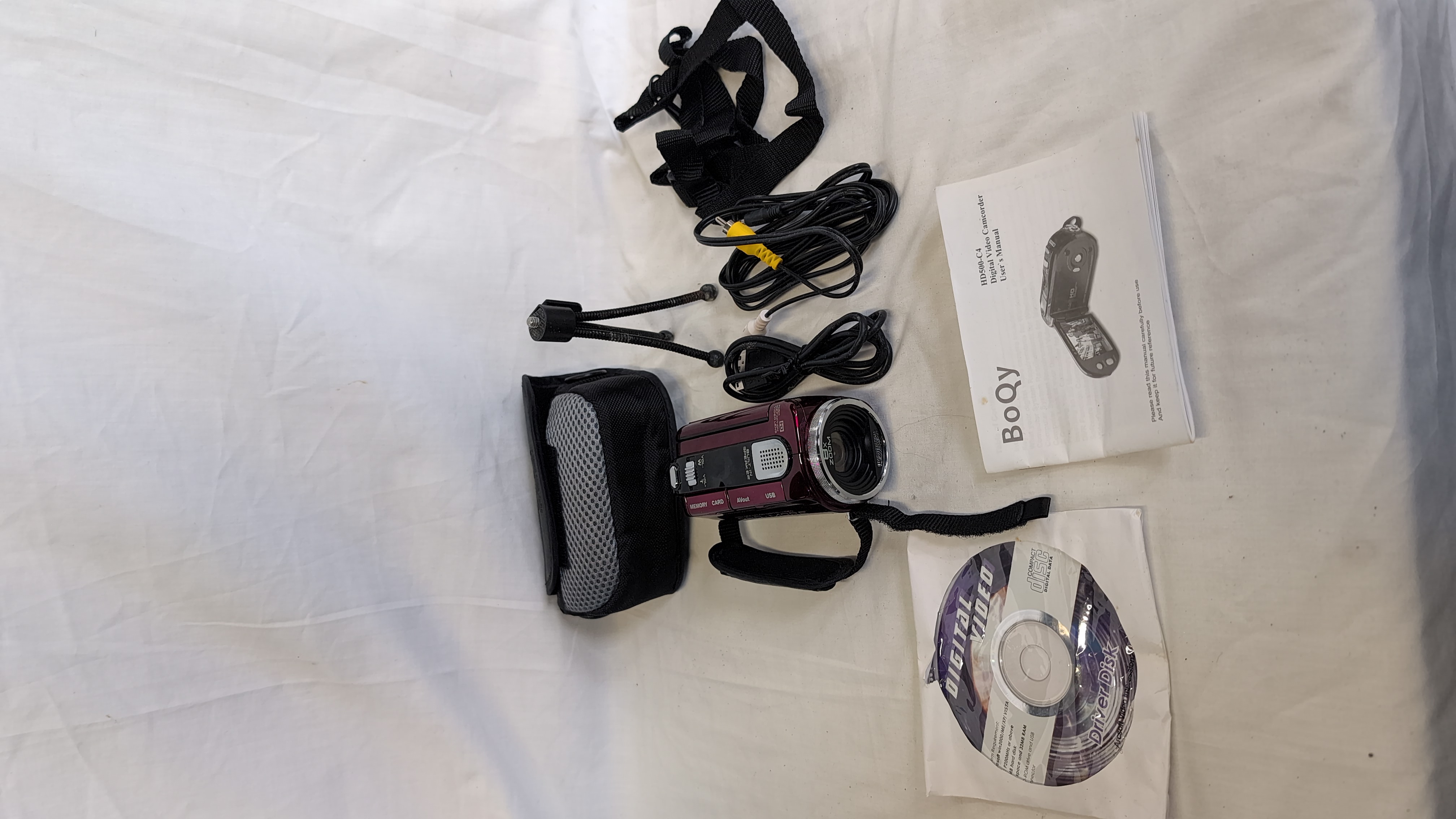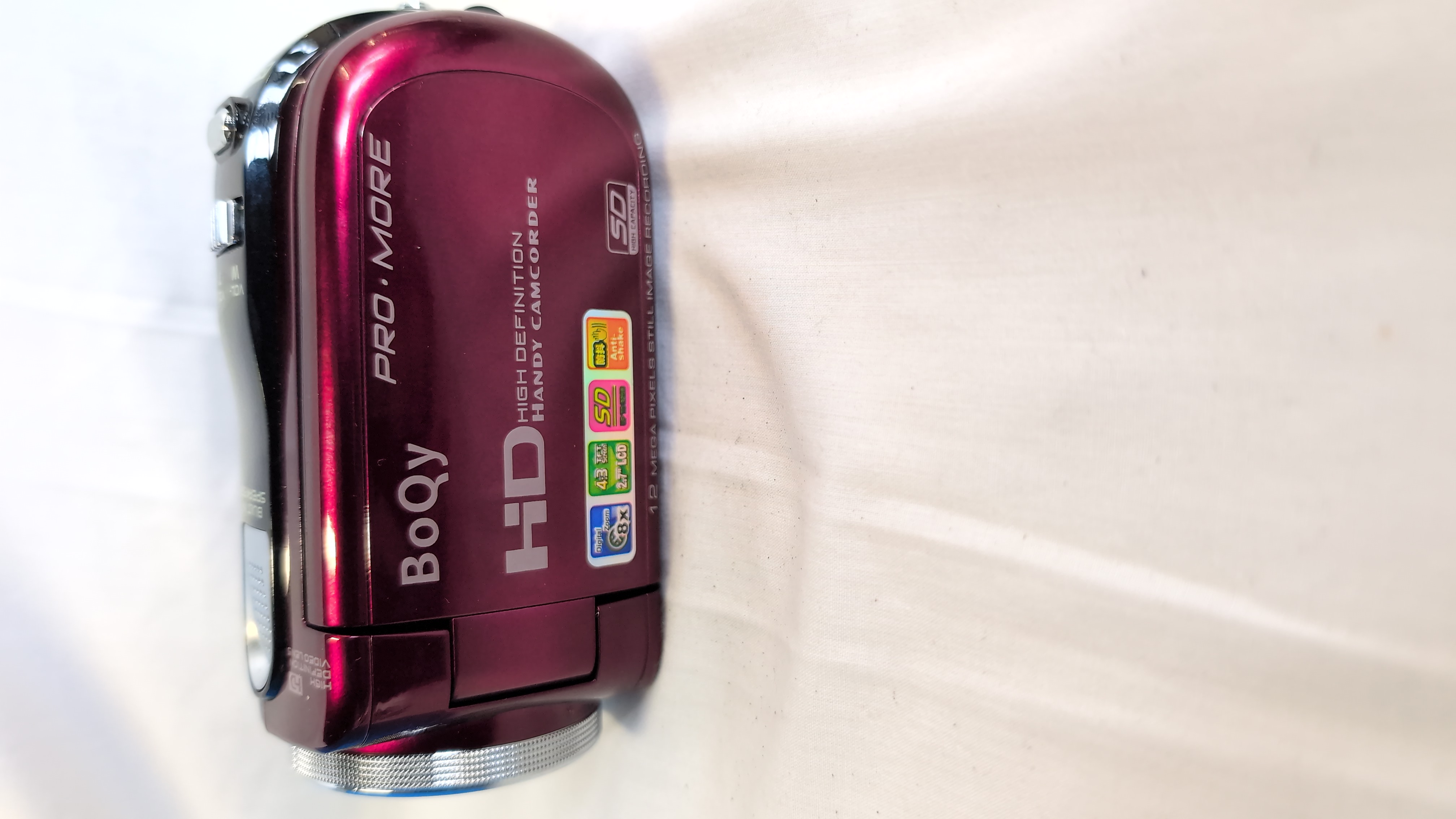 A BoQy model HD500-C4 digital video camcorder finished in a glossy metallic burgundy and black plastic housing. The unit features a flip-out 2.7-inch LCD preview screen and is designed for recording to SD or SDHC memory cards, supporting capacities up to 32GB. The lens is surround-marked High Definition Video Lens and provides 8x digital zoom. Applied labelling indicates 12-megapixel still image recording capability and electronic anti-shake functionality. The camcorder is accompanied by its original retail box, user manual, software driver disc, a miniature flexible tripod, an AV output cable, a USB data cable, and a black padded soft carrying case. An integrated wrist strap is attached to the camera body.