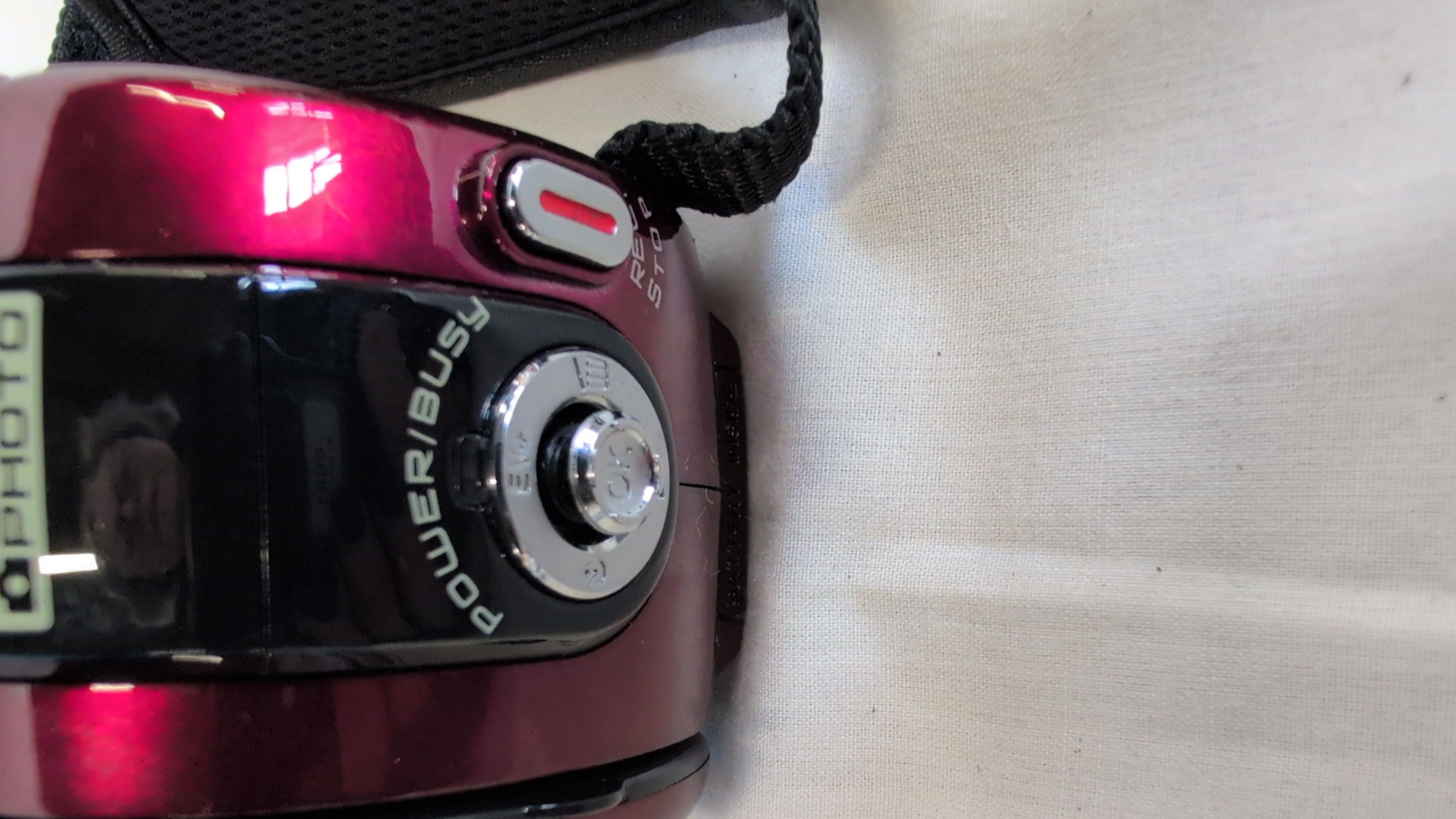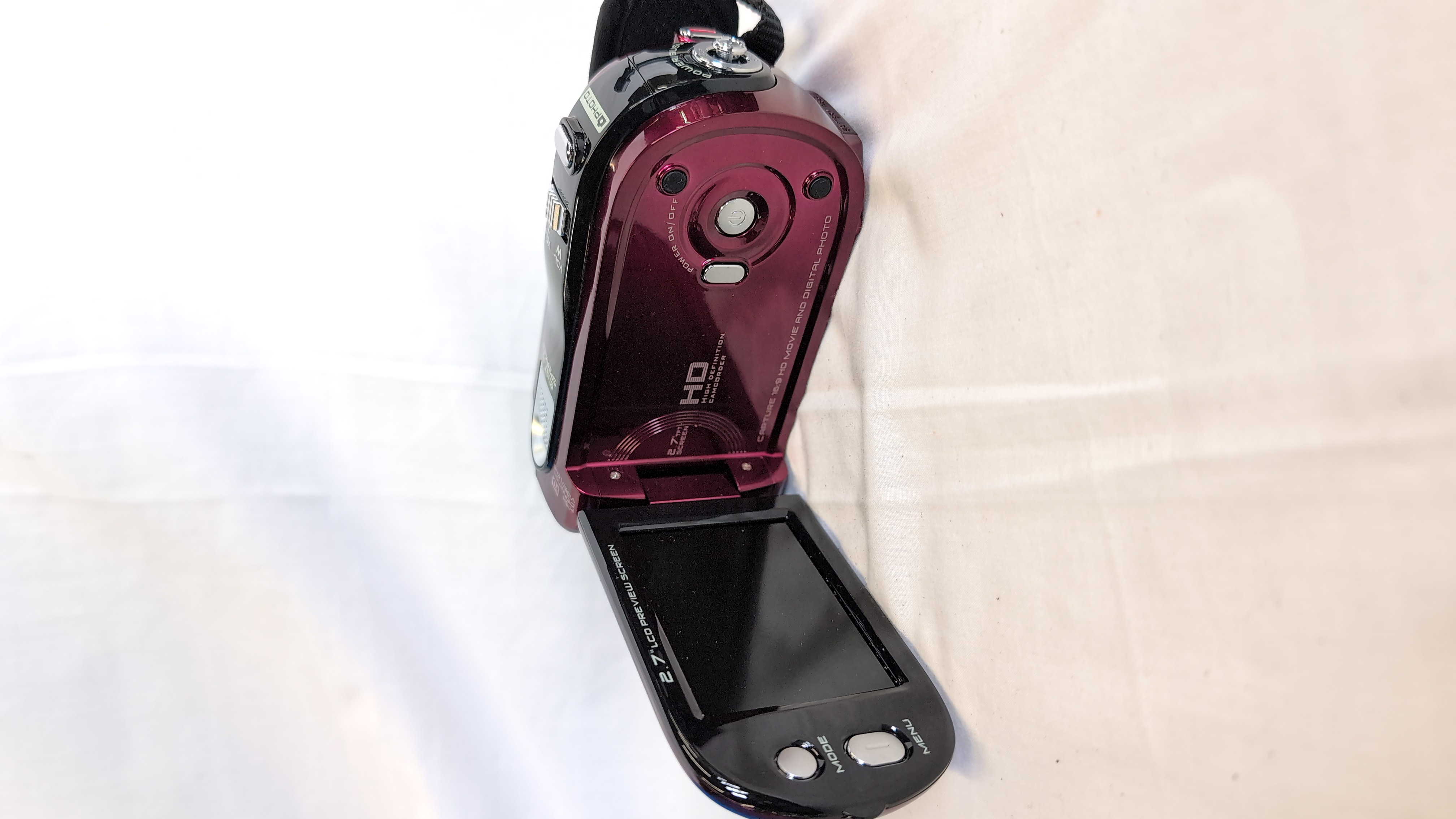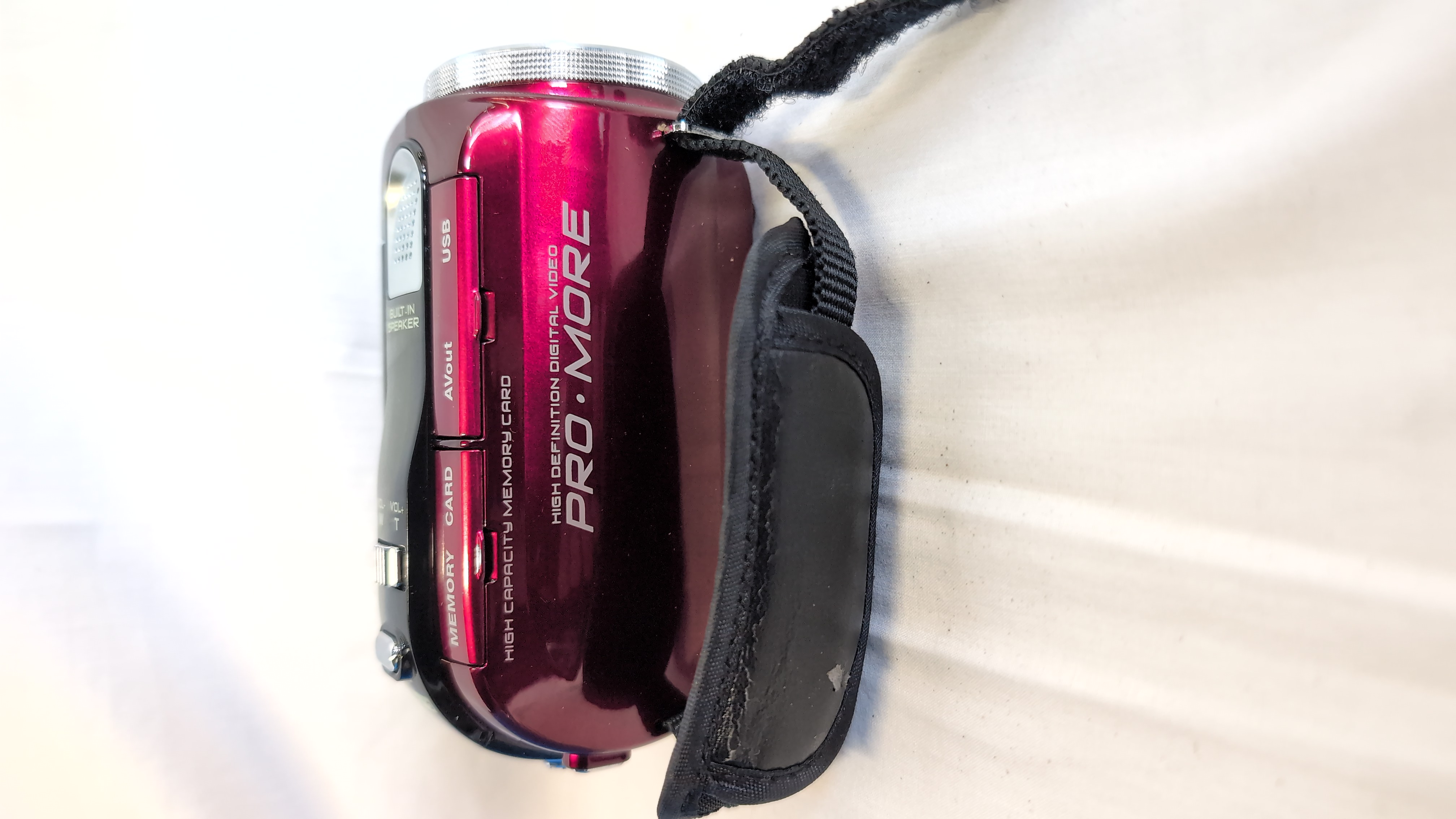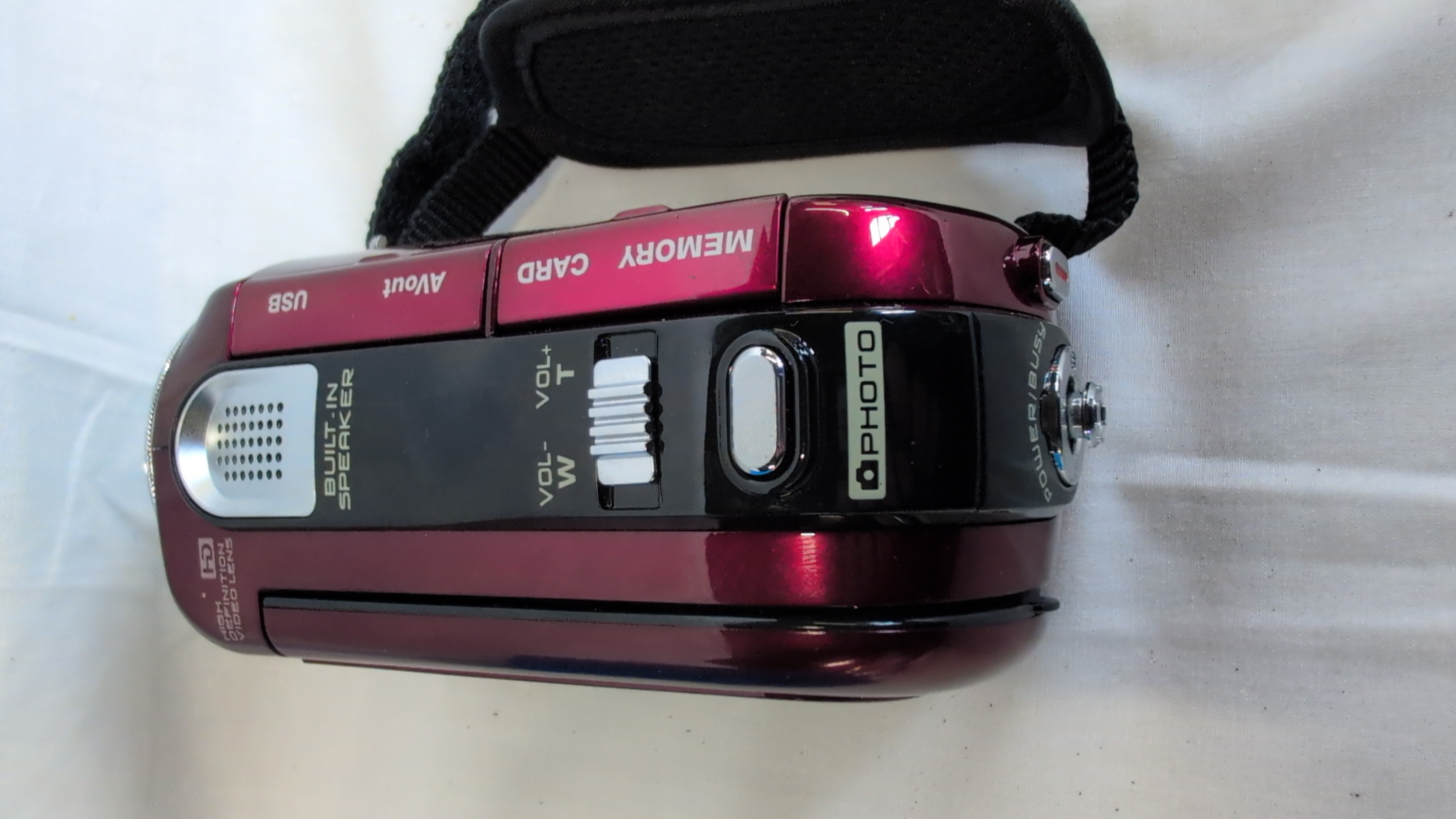 A BoQy model HD500-C4 digital video camcorder finished in a glossy metallic burgundy and black plastic housing. The unit features a flip-out 2.7-inch LCD preview screen and is designed for recording to SD or SDHC memory cards, supporting capacities up to 32GB. The lens is surround-marked High Definition Video Lens and provides 8x digital zoom. Applied labelling indicates 12-megapixel still image recording capability and electronic anti-shake functionality. The camcorder is accompanied by its original retail box, user manual, software driver disc, a miniature flexible tripod, an AV output cable, a USB data cable, and a black padded soft carrying case. An integrated wrist strap is attached to the camera body.
