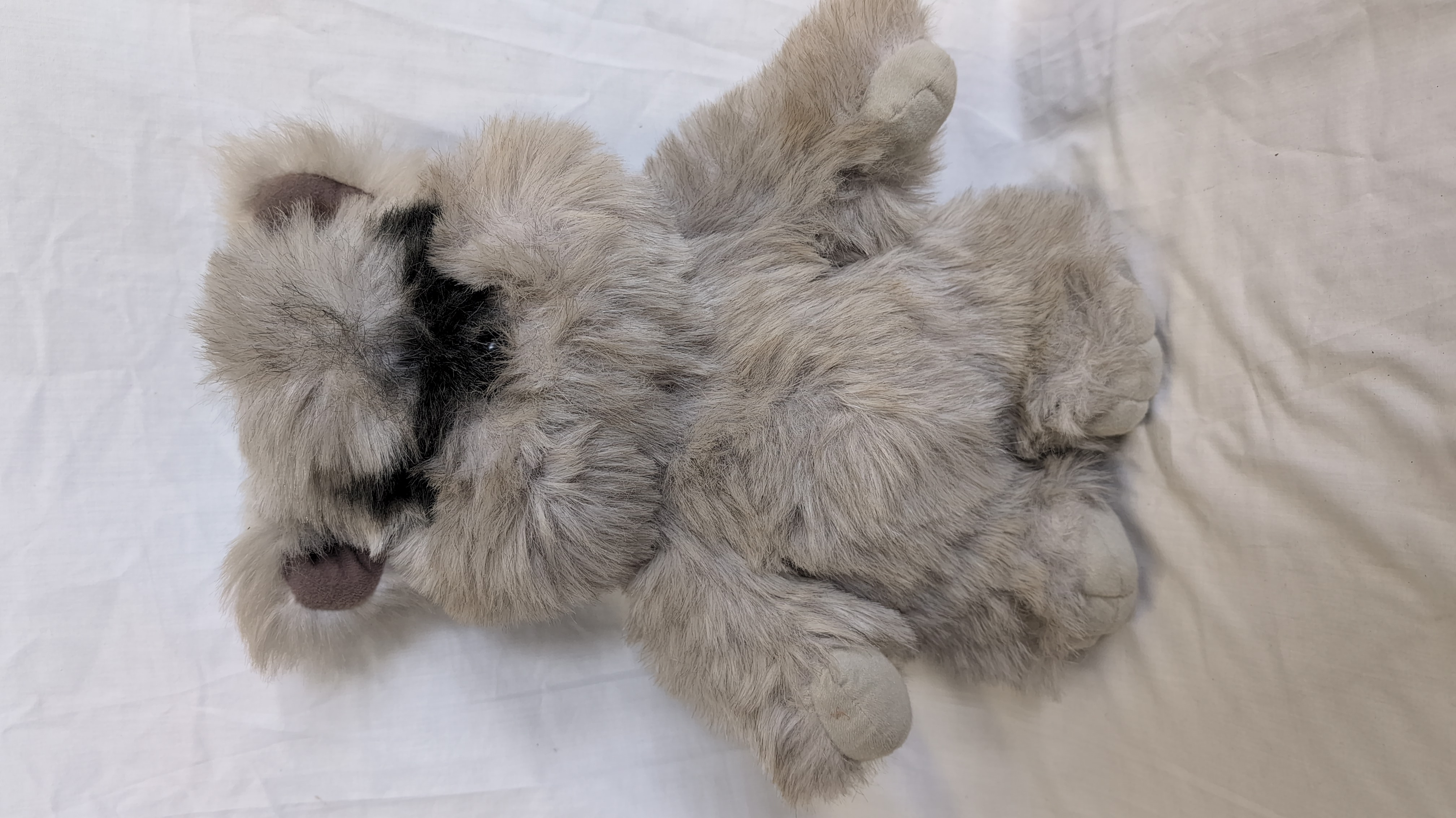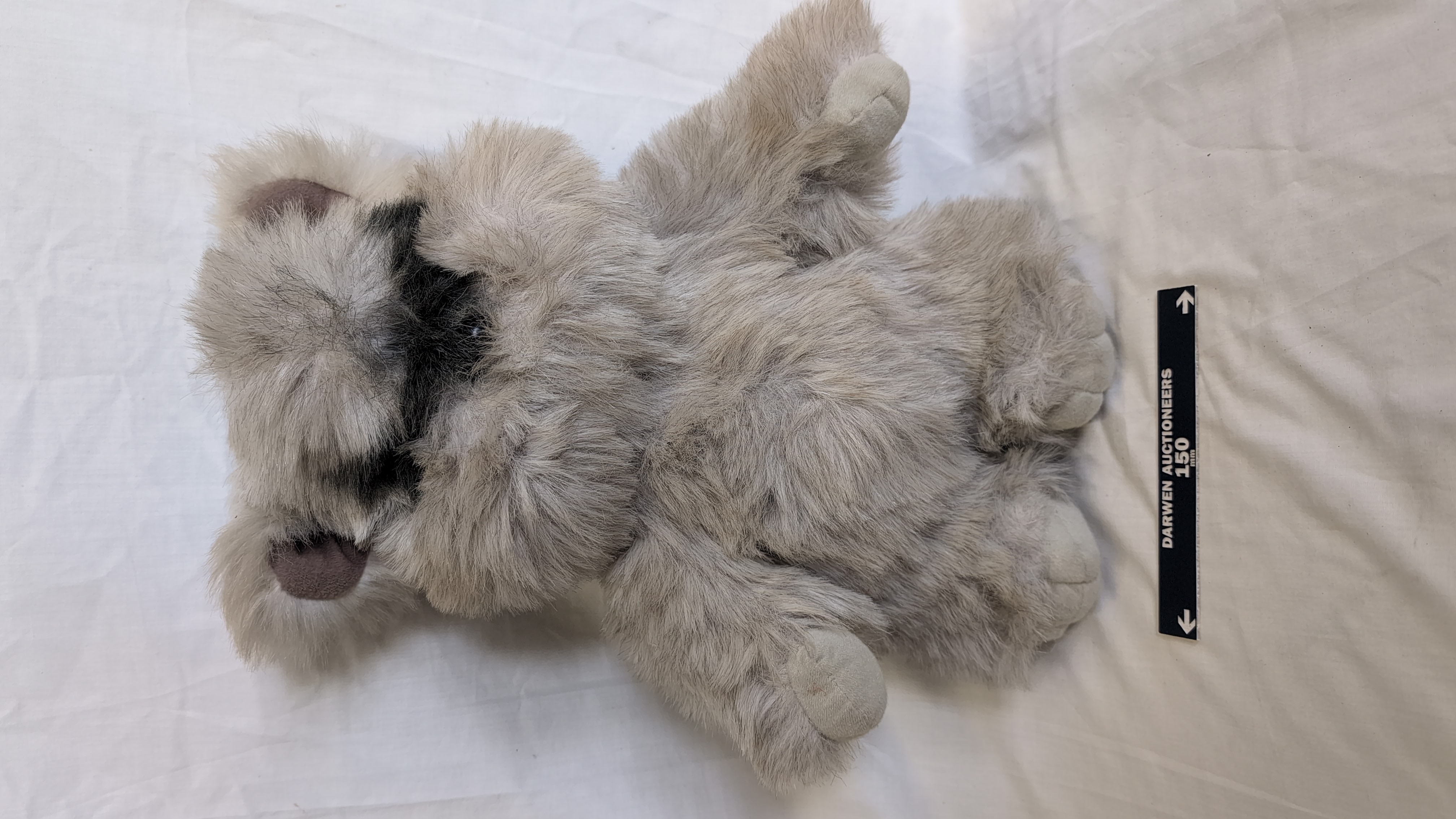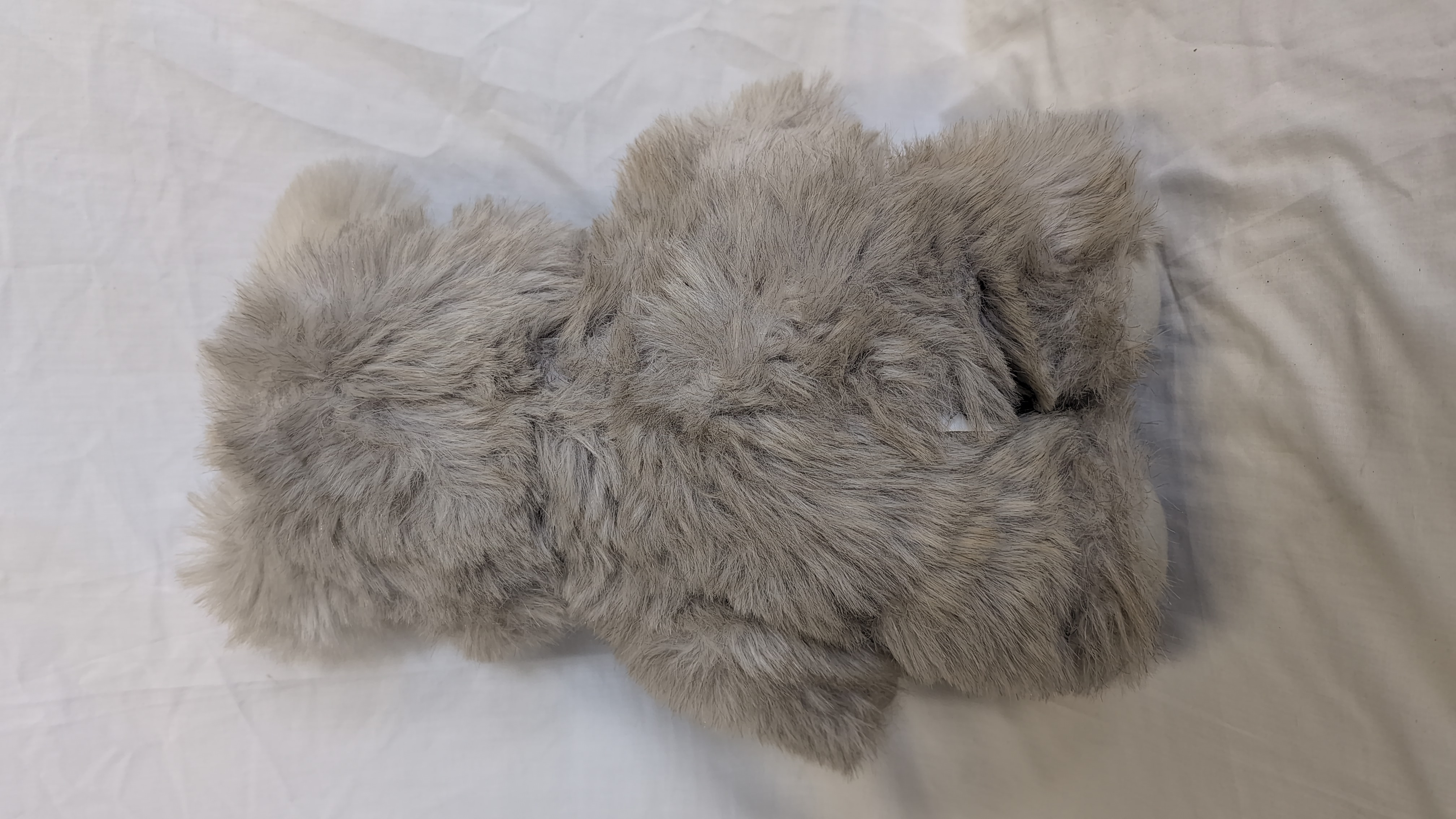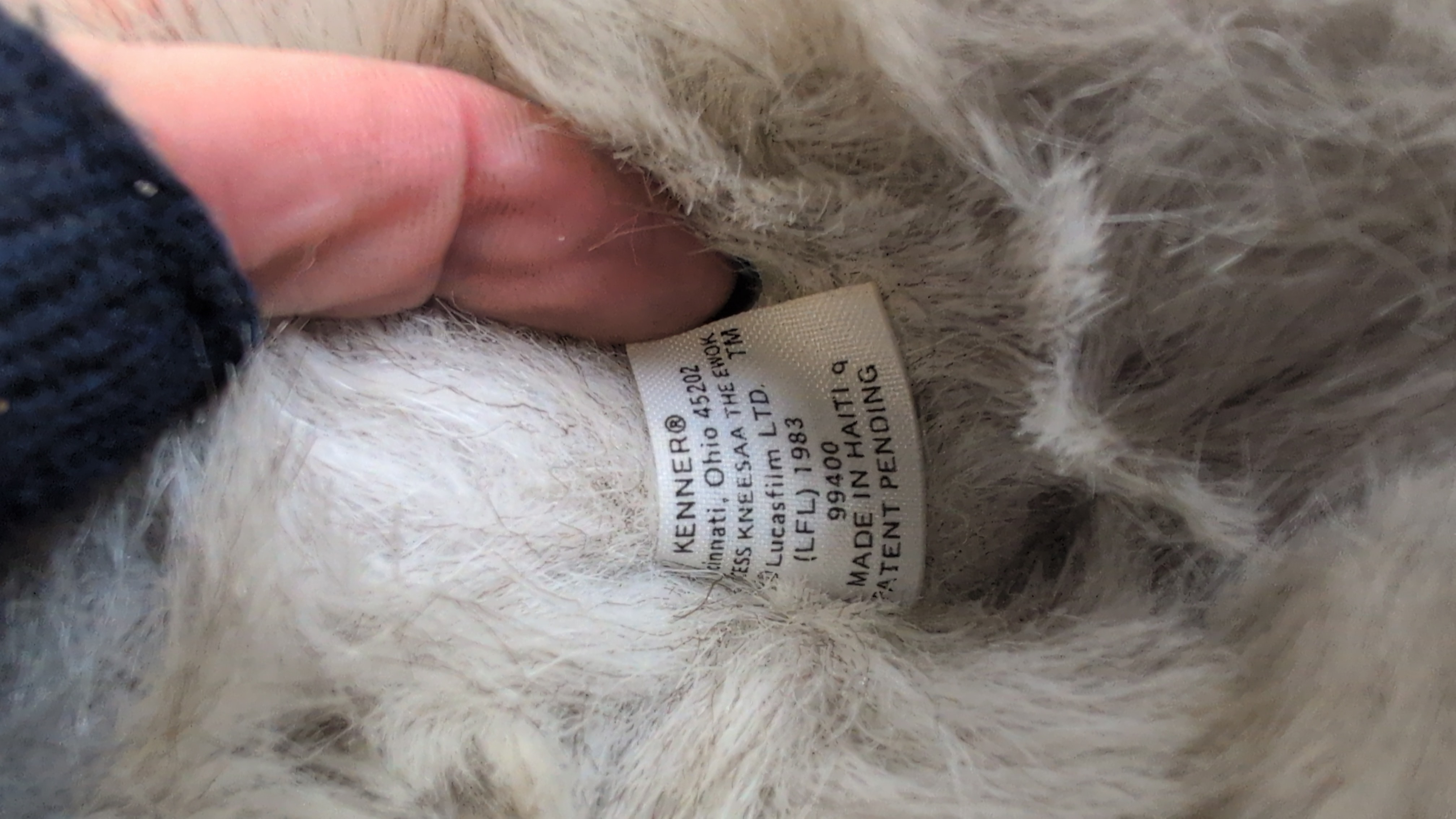 This vintage plush toy is a representation of the Star Wars character Princess Kneesaa the Ewok, manufactured by Kenner. The item is constructed from long-pile grey and white faux fur with brown felt-like fabric inserts used for the interior of the ears. An original manufacturer’s white fabric tag is attached, bearing the following text: KENNER Cincinnati, Ohio 45202, PRINCESS KNEESAA THE EWOK TM, © Lucasfilm LTD., (LFL) 1983, 99400, MADE IN HAITI q, and PATENT PENDING. This toy was produced under license from Lucasfilm Ltd. following the release of Return of the Jedi.