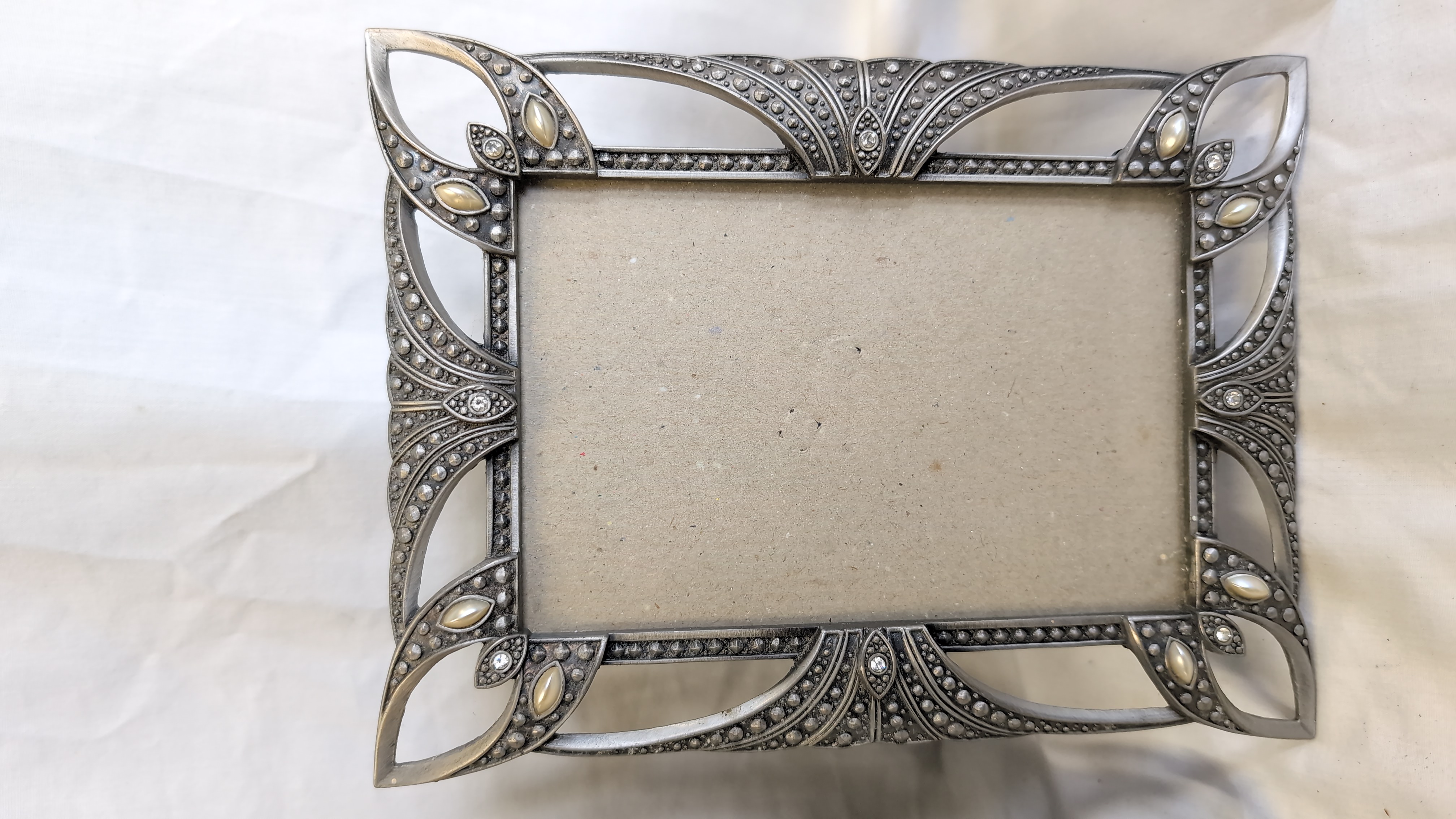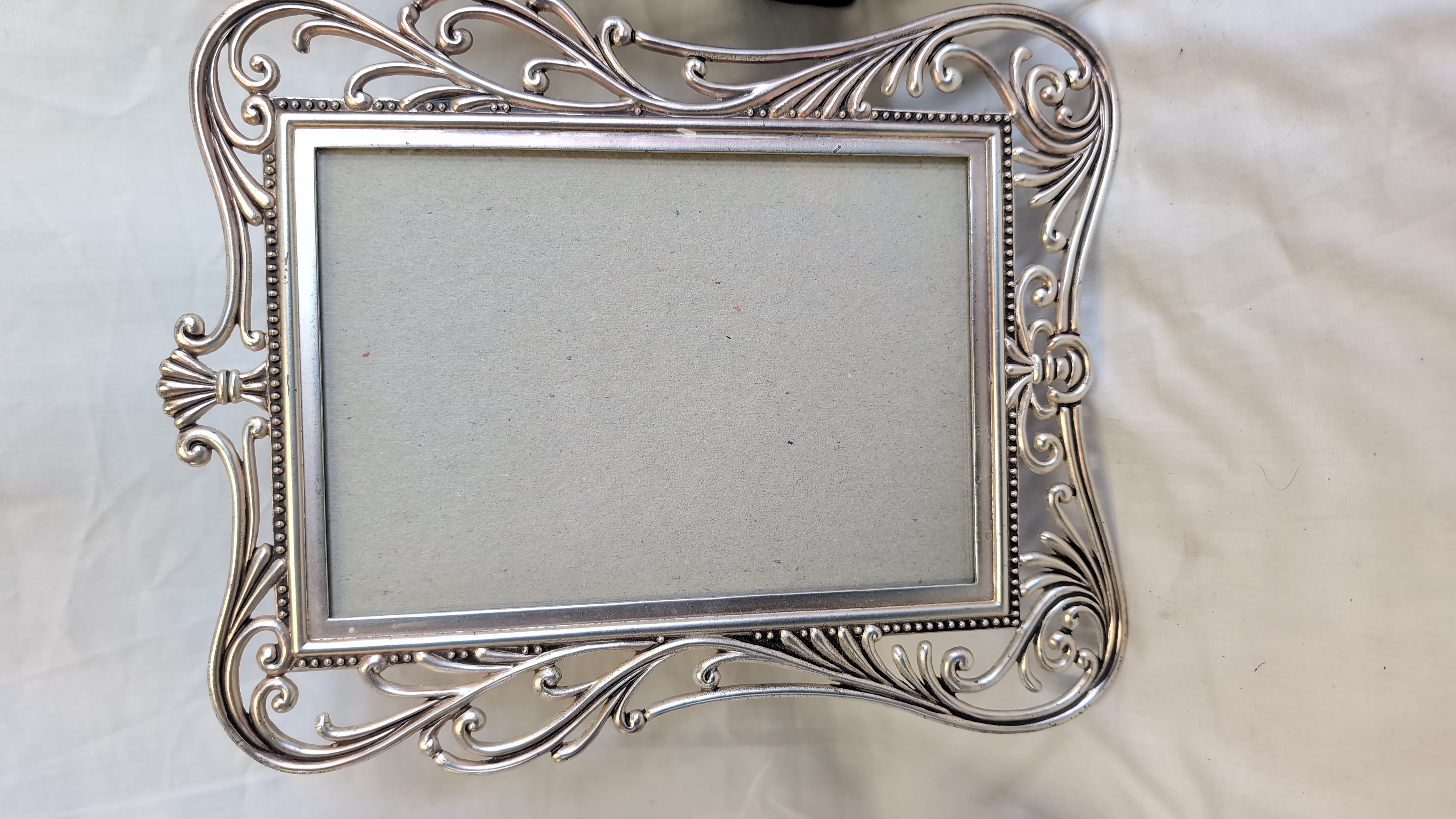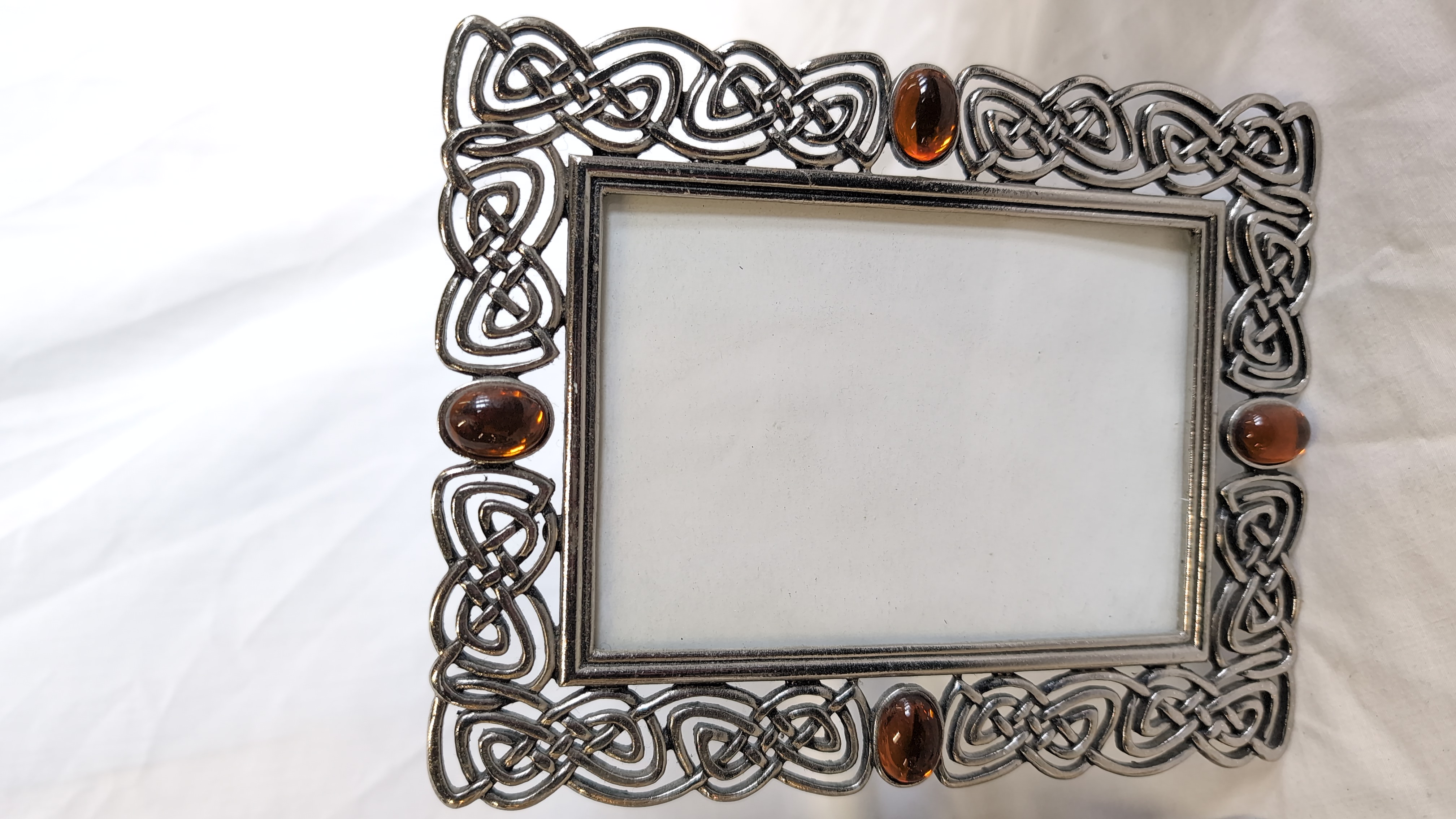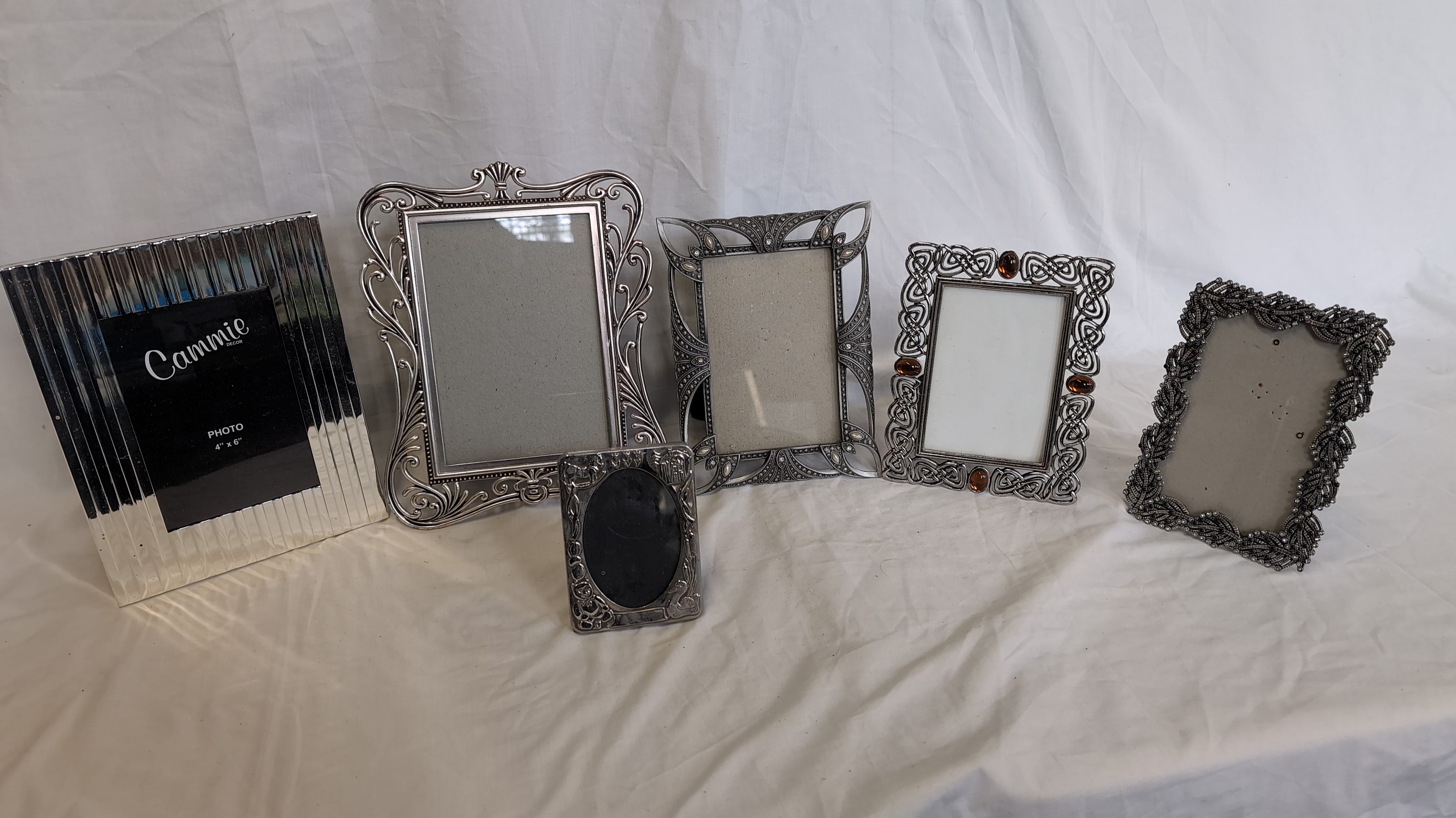 An assortment of silver-toned photo frames in various sizes and decorative styles. The collection includes a modern rectangular frame with a vertically reeded polished border, containing an insert for a 4 inch by 6 inch photograph branded Cammie Decor. A large portrait frame in the Rococo style features a pierced border with scrolling acanthus leaves and a central shell motif. An openwork frame in the Edwardian style is decorated with stylized foliate motifs and inset with faux pearls and clear stones. A Celtic Revival style frame has a continuous knotwork border set with four oval amber-coloured glass cabochons. A small rectangular nursery-themed frame with an oval aperture is embossed with child-related motifs including a teddy bear, rocking horse, swan, and a house. A Children’s Decorated Metal Frame Finally, a heavily textured frame features overlapping foliate motifs set with clear and black rhinestones.