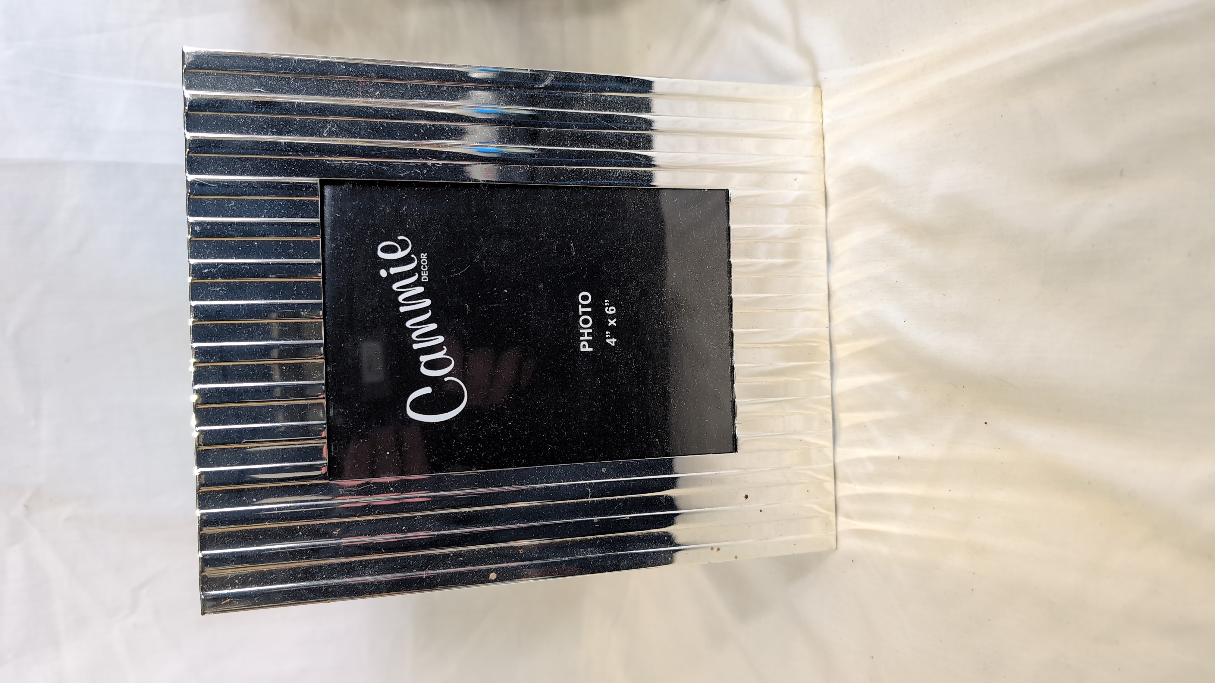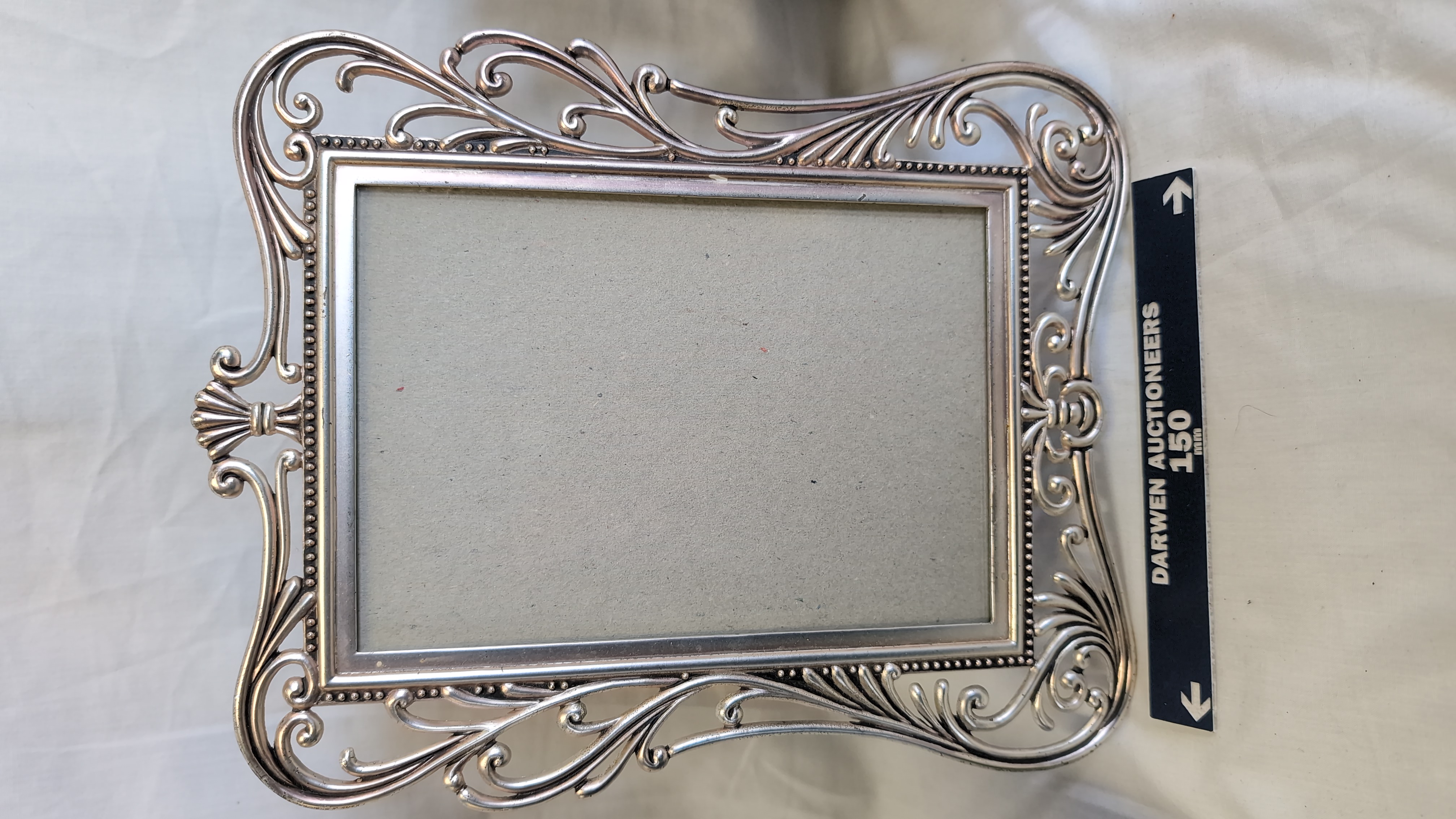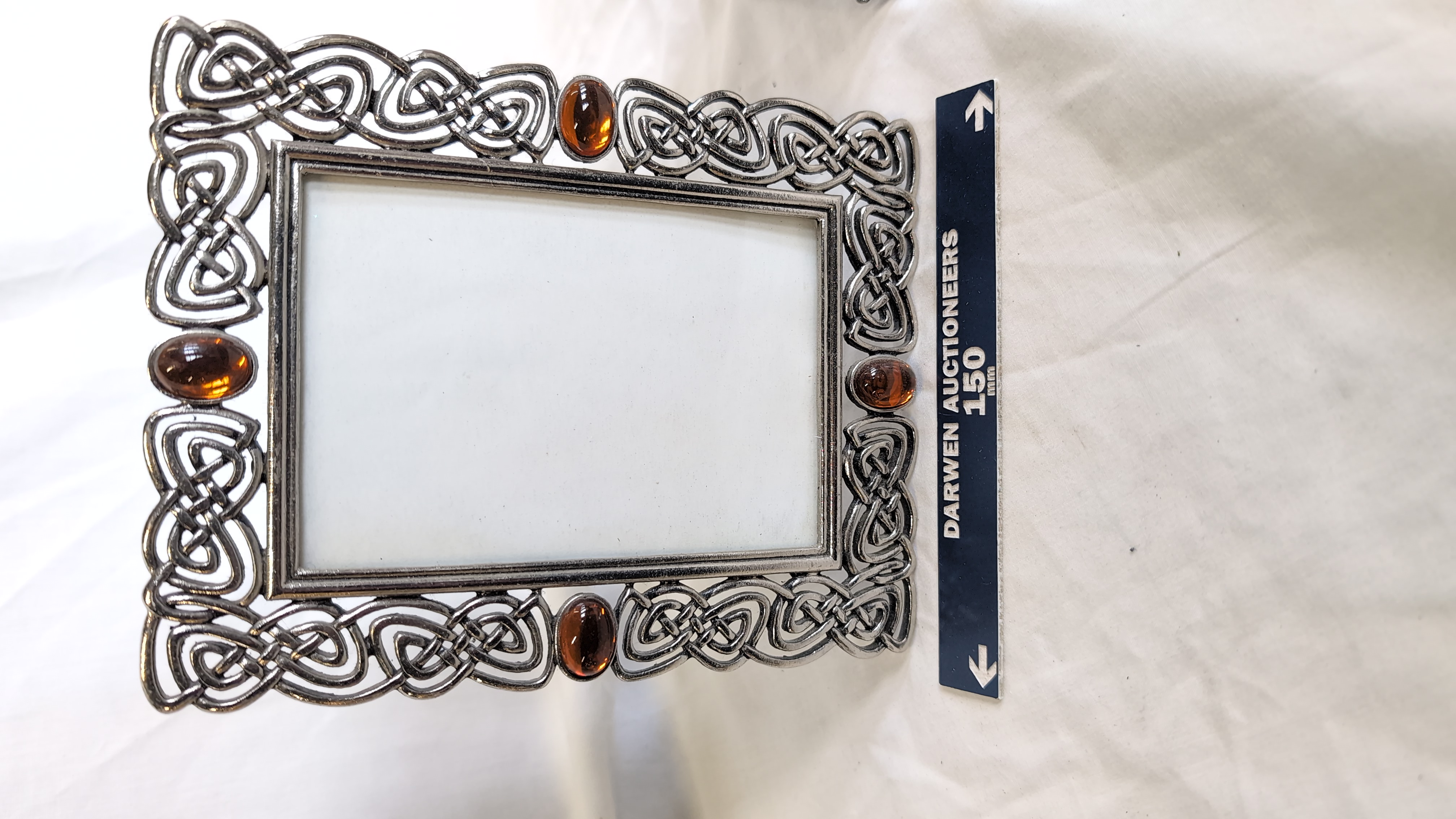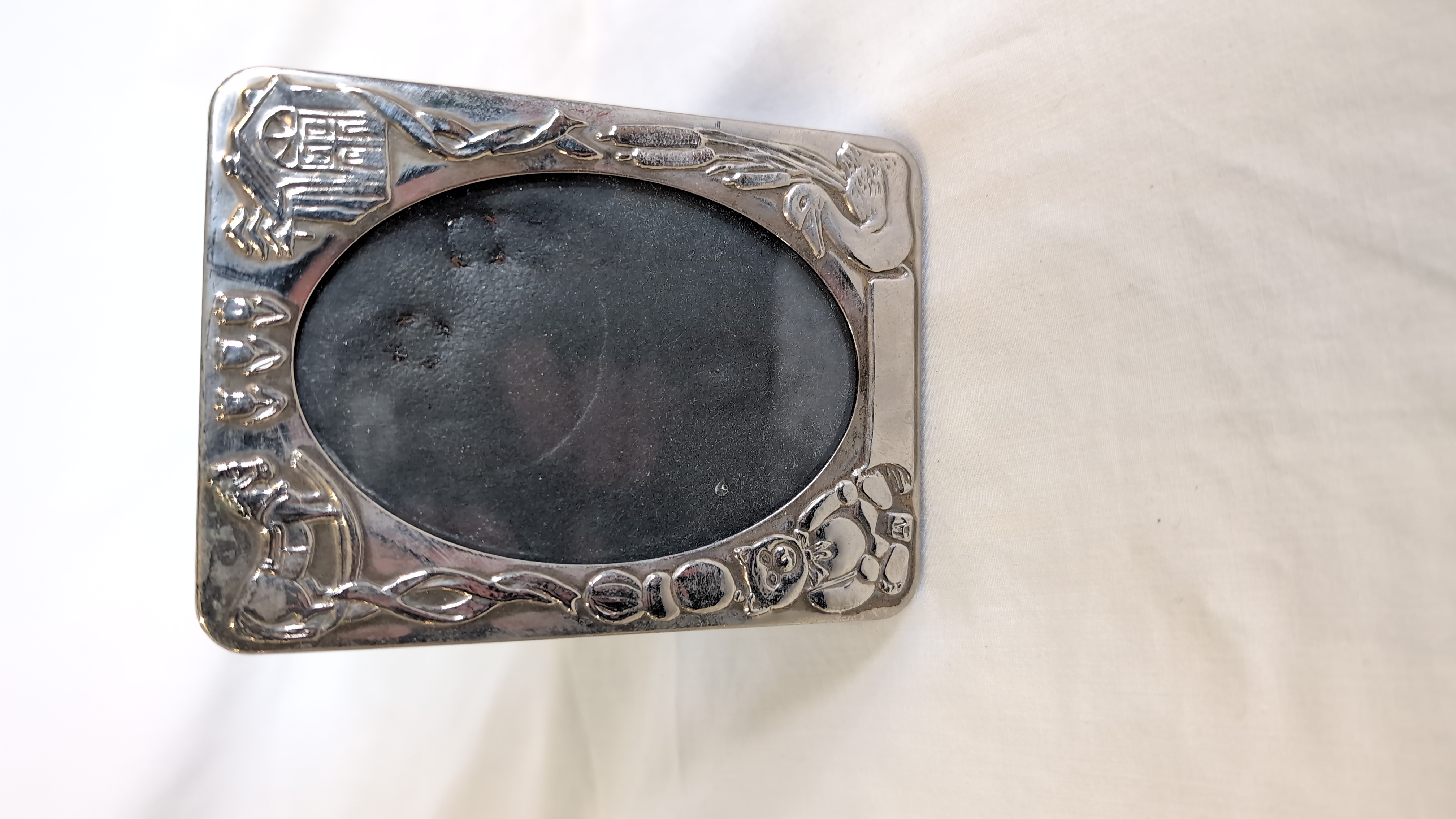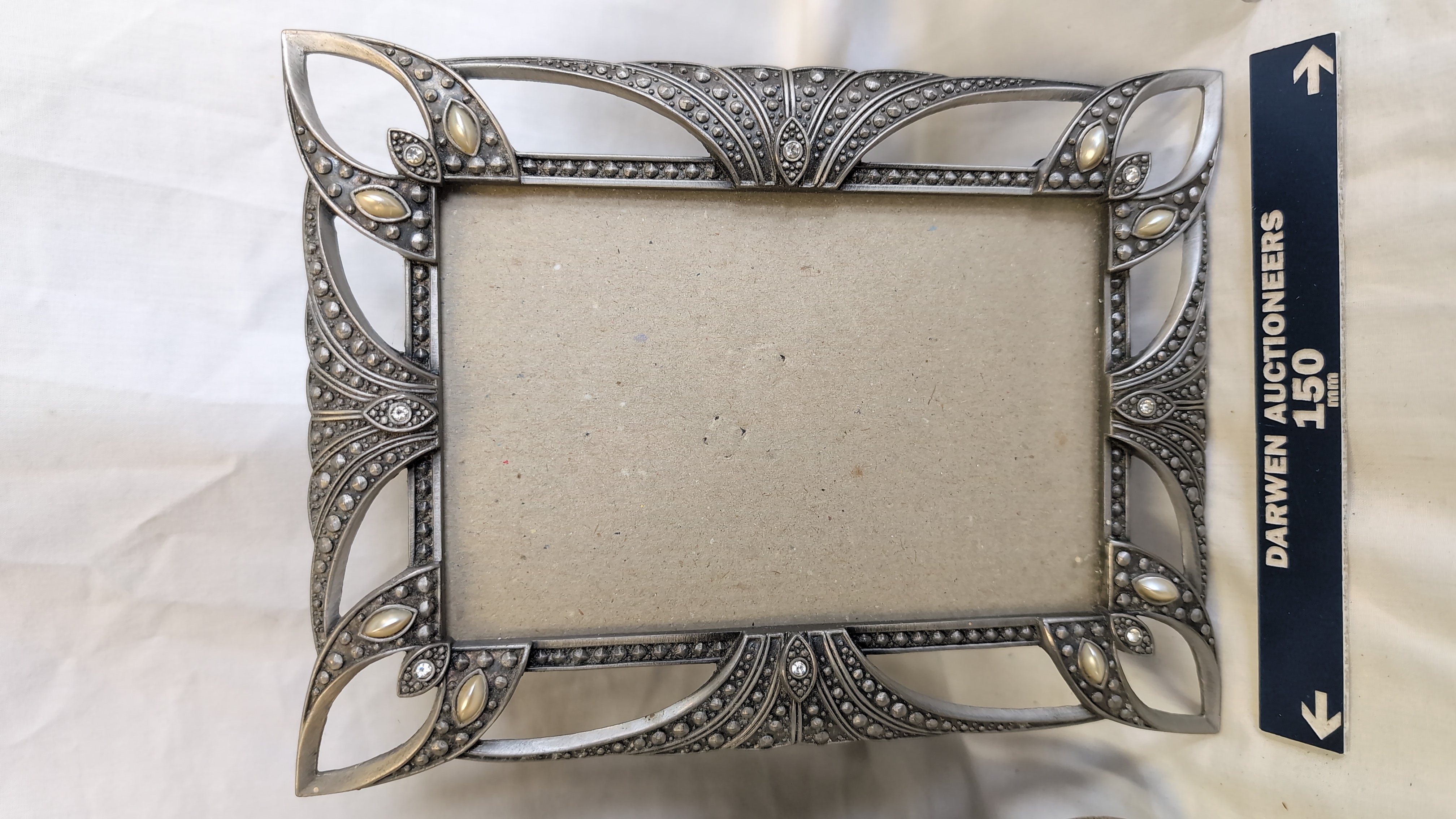An assortment of silver-toned photo frames in various sizes and decorative styles. The collection includes a modern rectangular frame with a vertically reeded polished border, containing an insert for a 4 inch by 6 inch photograph branded Cammie Decor. A large portrait frame in the Rococo style features a pierced border with scrolling acanthus leaves and a central shell motif. An openwork frame in the Edwardian style is decorated with stylized foliate motifs and inset with faux pearls and clear stones. A Celtic Revival style frame has a continuous knotwork border set with four oval amber-coloured glass cabochons. A small rectangular nursery-themed frame with an oval aperture is embossed with child-related motifs including a teddy bear, rocking horse, swan, and a house. A Children’s Decorated Metal Frame Finally, a heavily textured frame features overlapping foliate motifs set with clear and black rhinestones.