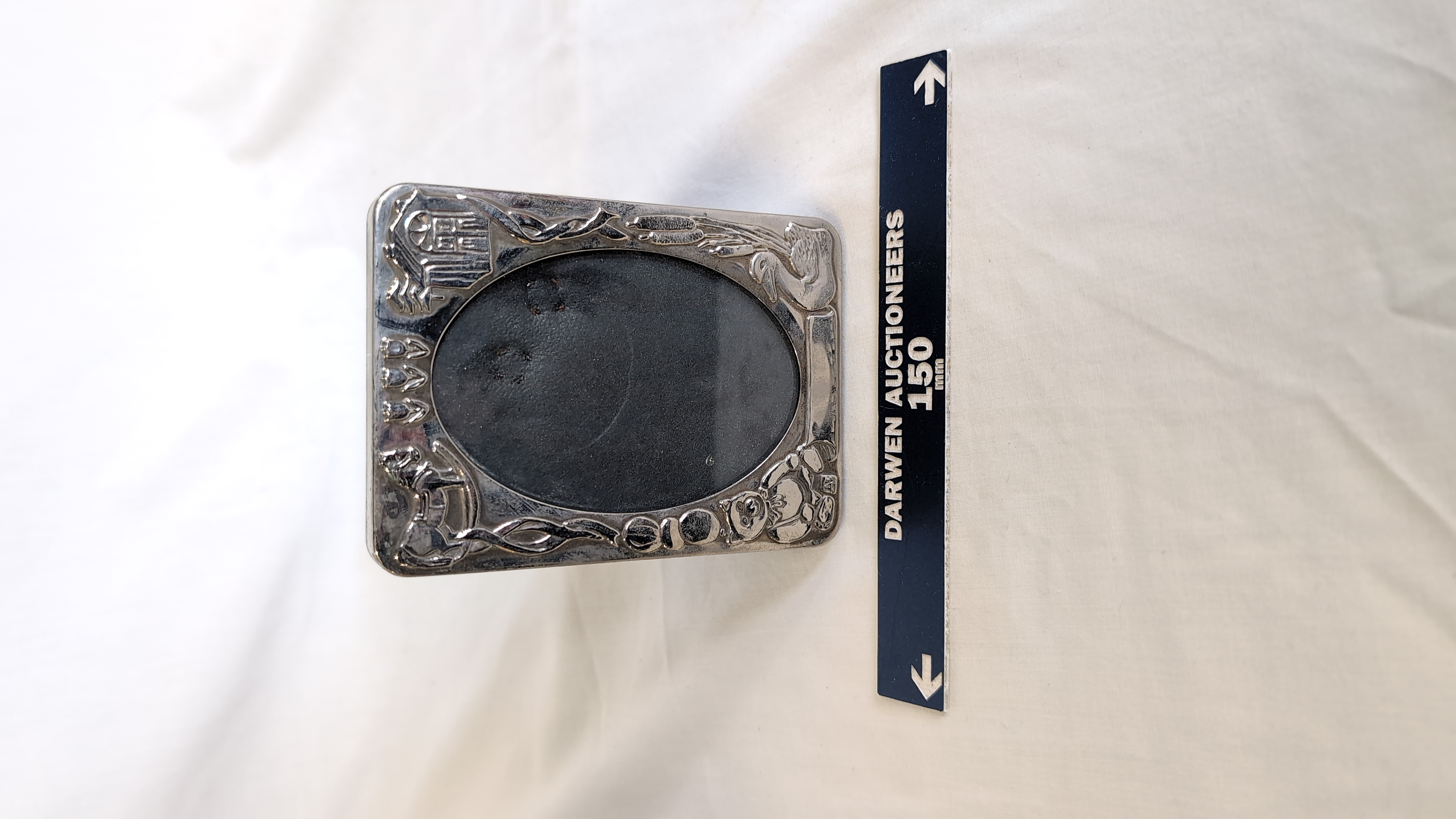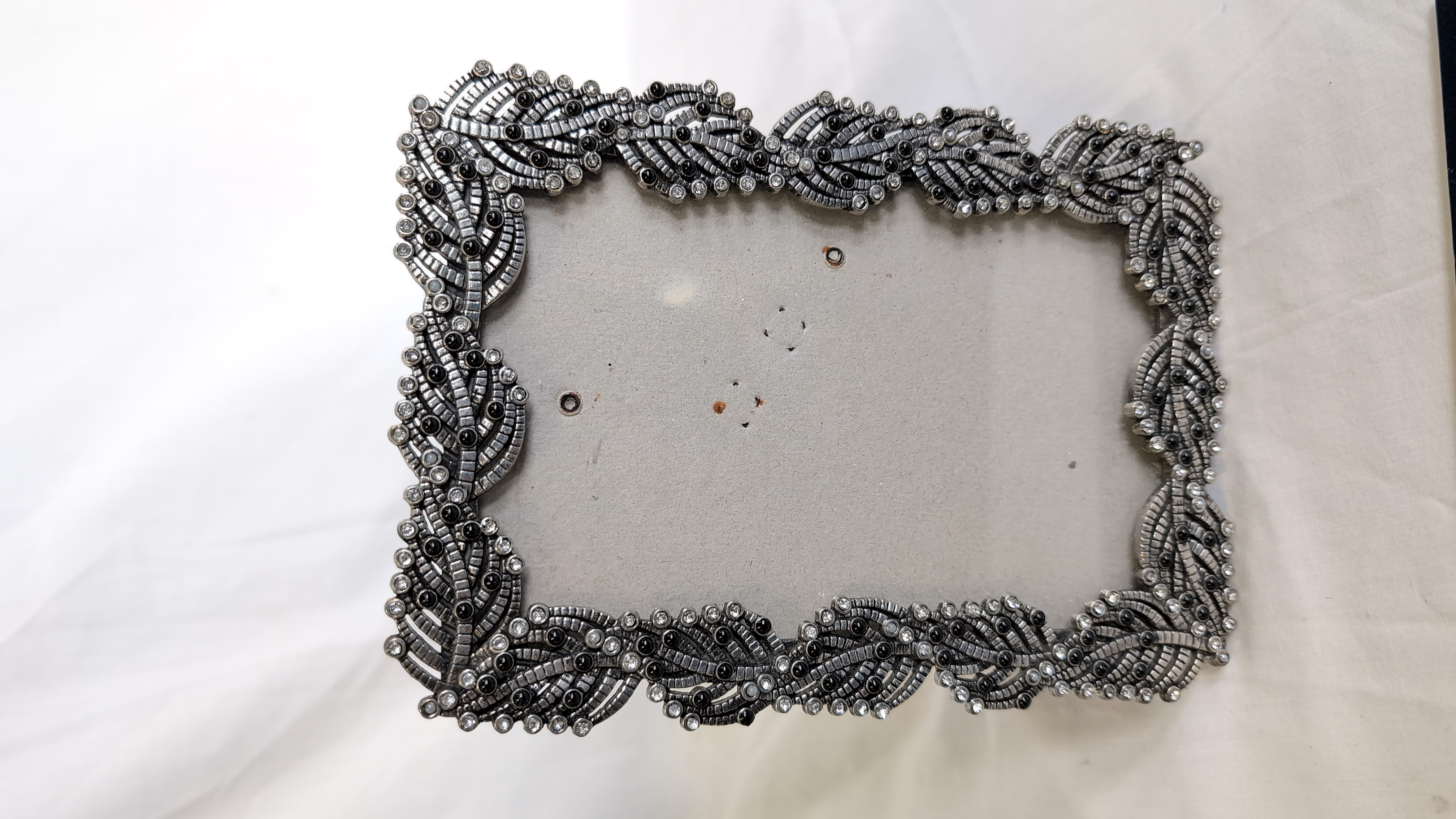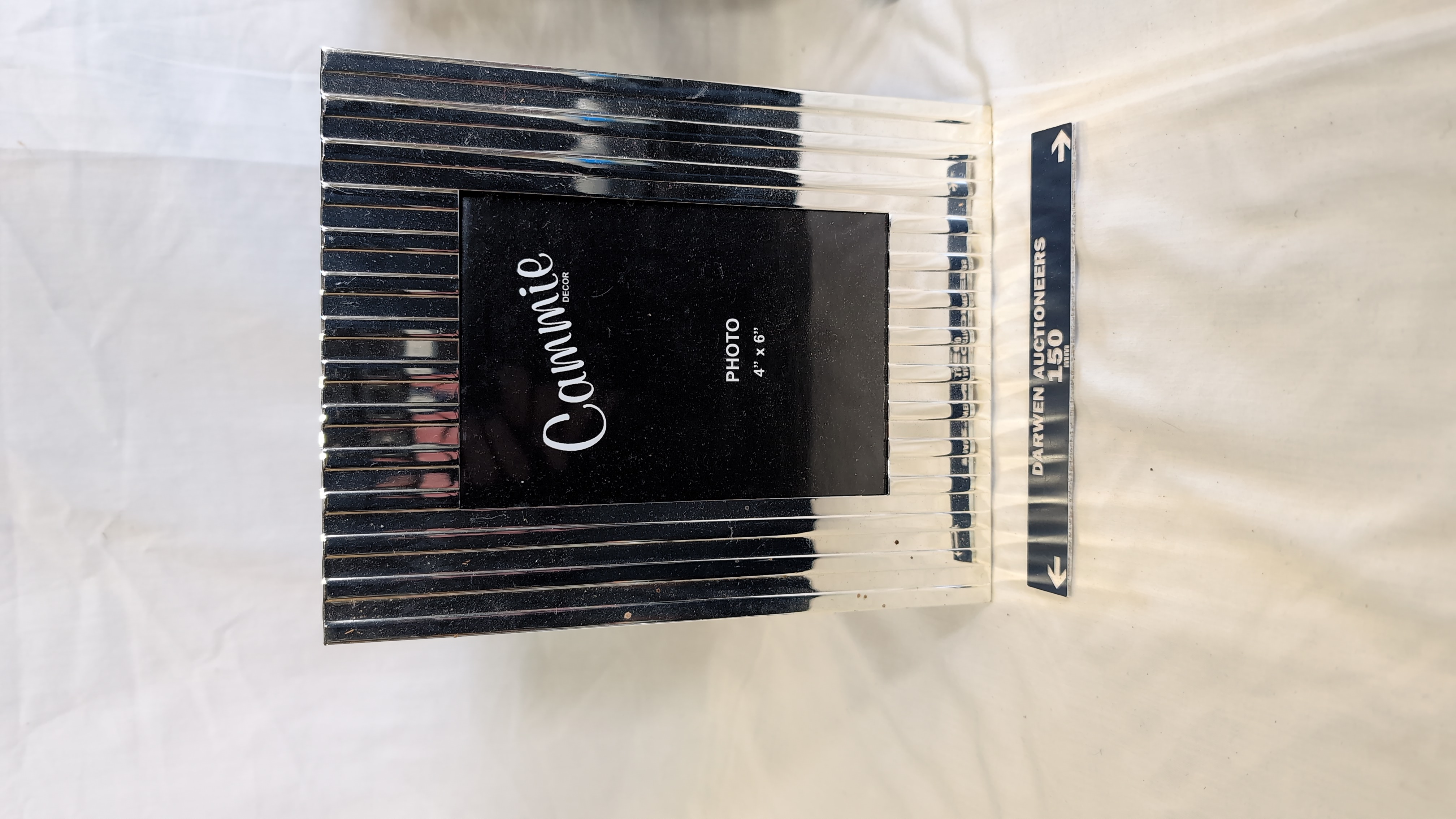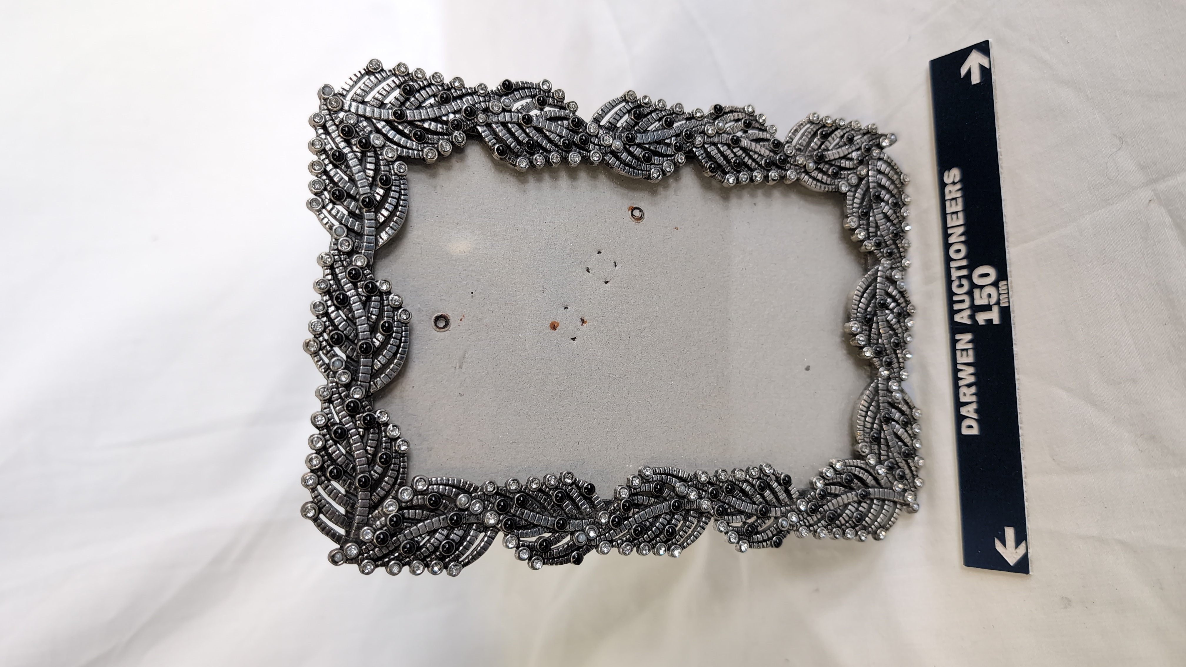 An assortment of silver-toned photo frames in various sizes and decorative styles. The collection includes a modern rectangular frame with a vertically reeded polished border, containing an insert for a 4 inch by 6 inch photograph branded Cammie Decor. A large portrait frame in the Rococo style features a pierced border with scrolling acanthus leaves and a central shell motif. An openwork frame in the Edwardian style is decorated with stylized foliate motifs and inset with faux pearls and clear stones. A Celtic Revival style frame has a continuous knotwork border set with four oval amber-coloured glass cabochons. A small rectangular nursery-themed frame with an oval aperture is embossed with child-related motifs including a teddy bear, rocking horse, swan, and a house. A Children’s Decorated Metal Frame Finally, a heavily textured frame features overlapping foliate motifs set with clear and black rhinestones.